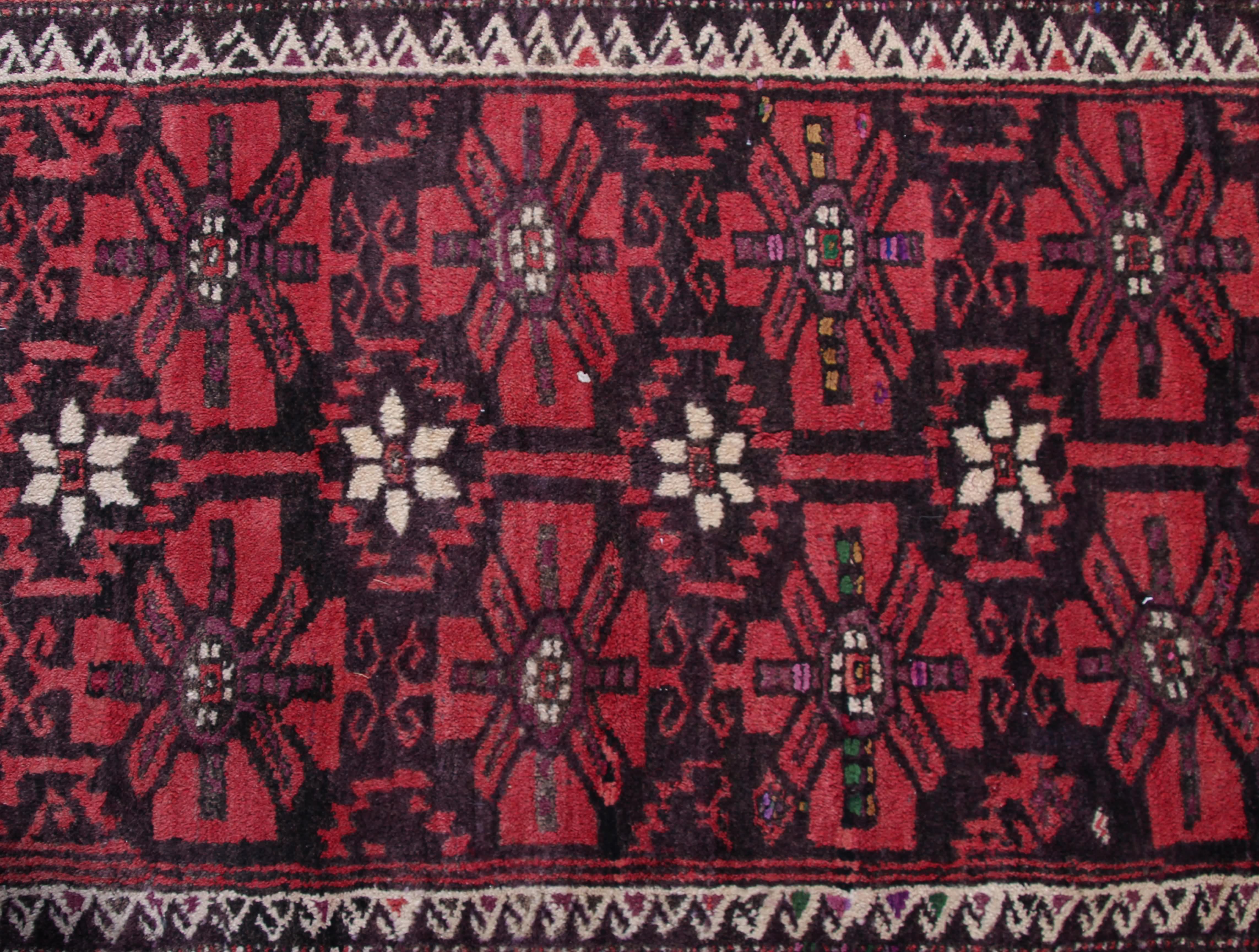 About Persian Baluchi Rug: Baluchi carpets (also called Baluch or Beluchi carpets) are handmade carpets originally made by Baluch nomads, living near the border between Iran, Pakistan and Afghanistan. The carpets are often small with lively patterns, and praying carpets are common. The dominating colors are red, brown, and dark blue. The warp is made of wool or a mixture of wool and goat hair which makes them extremely hard wearing rugs.