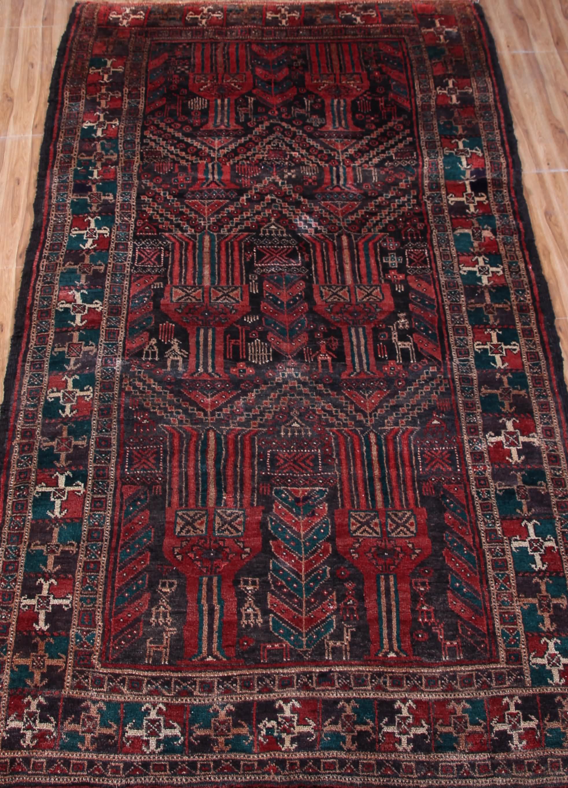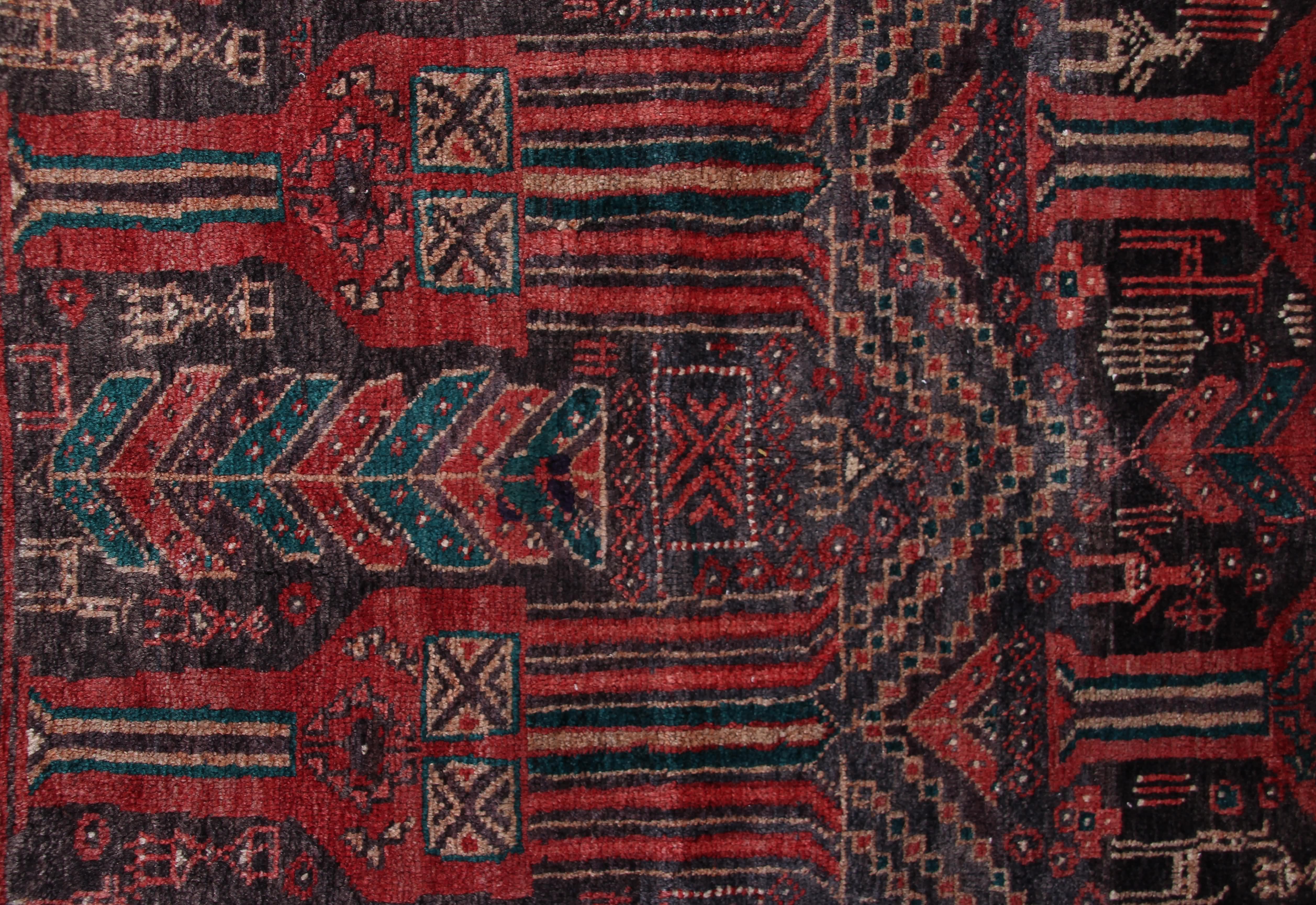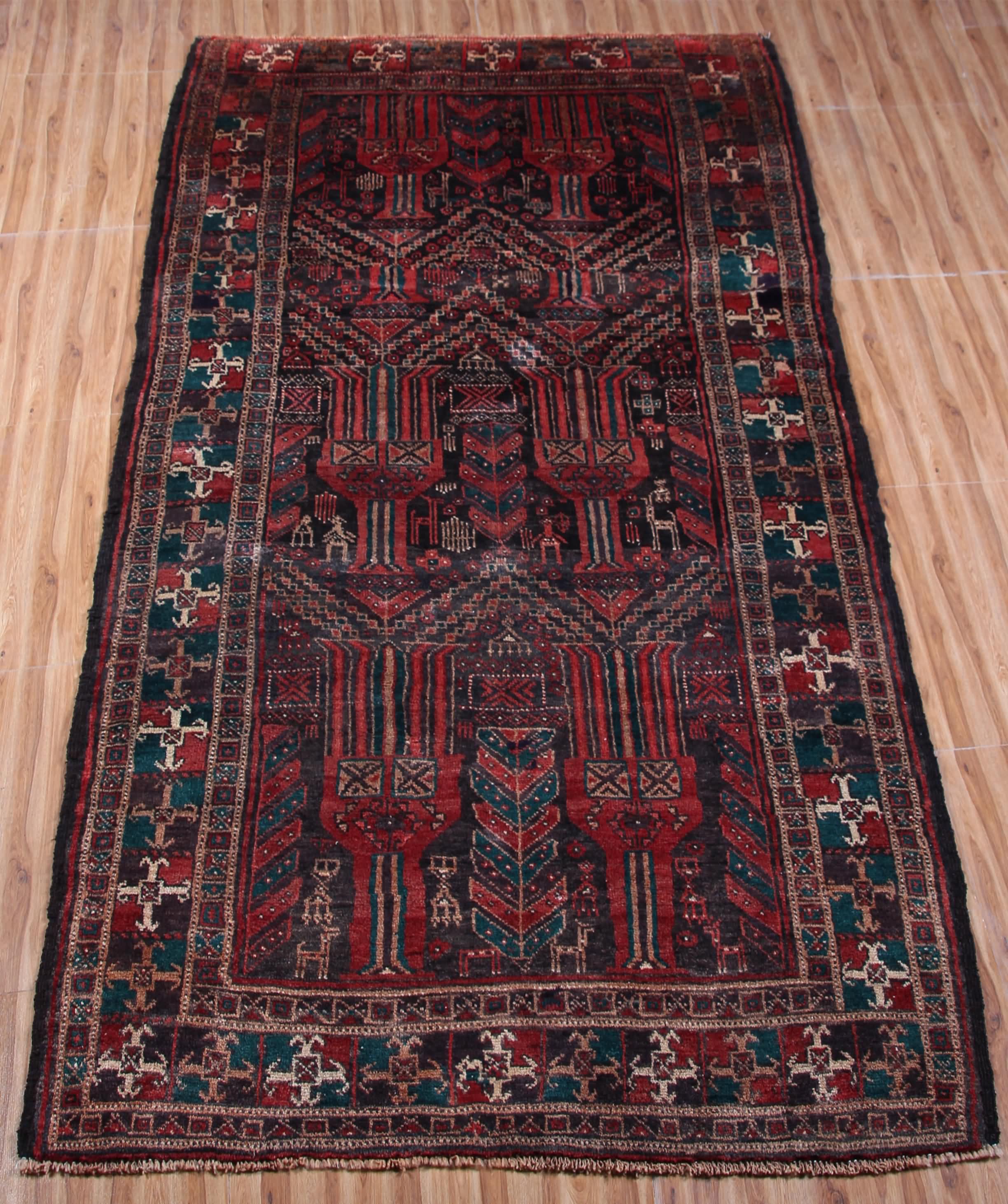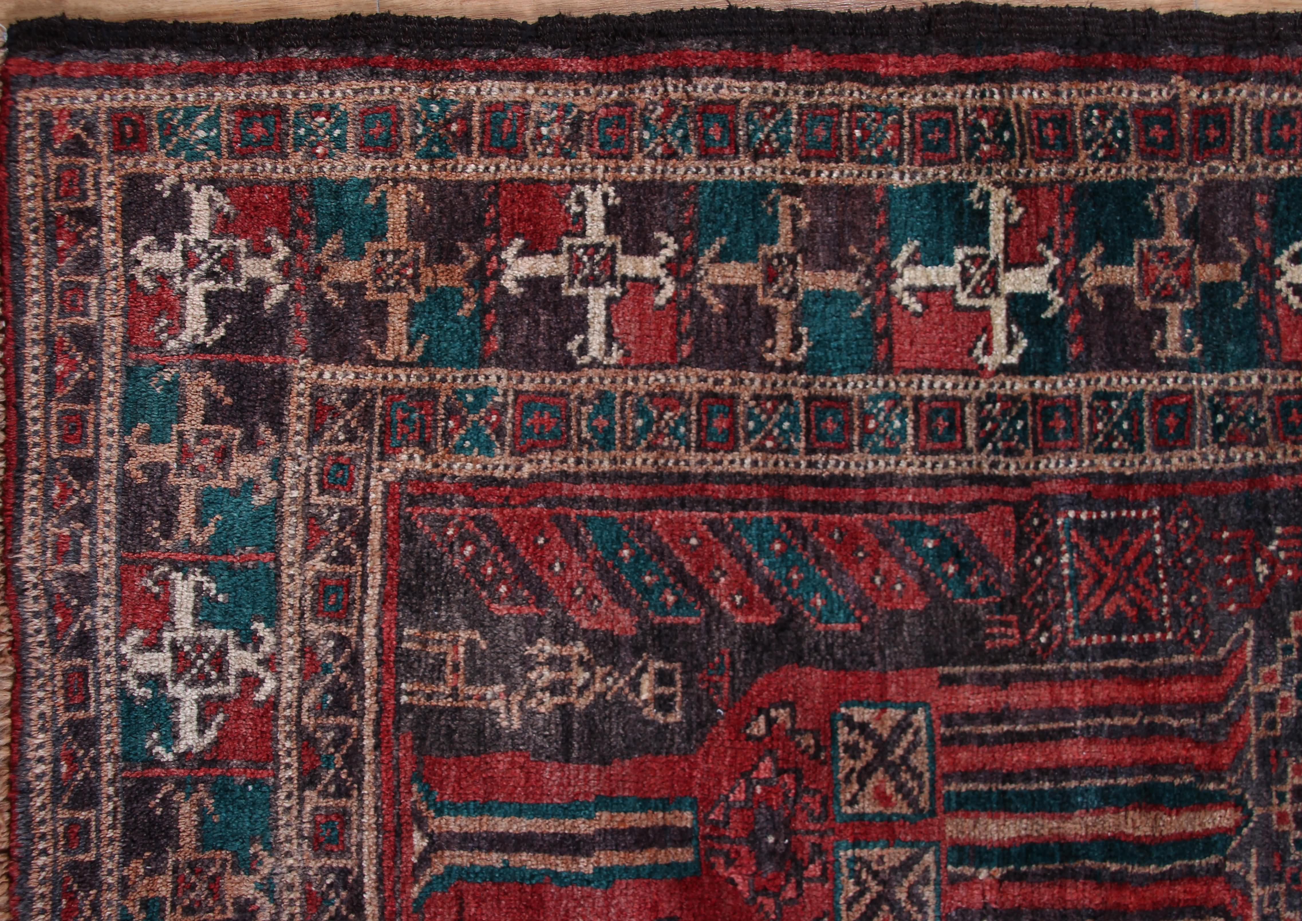 About Persian Baluchi Rug: Baluchi carpets (also called Baluch or Beluchi carpets) are handmade carpets originally made by Baluch nomads, living near the border between Iran, Pakistan and Afghanistan. The carpets are often small with lively patterns, and praying carpets are common. The dominating colors are red, brown, and dark blue. The warp is made of wool or a mixture of wool and goat hair which makes them extremely hard wearing rugs.