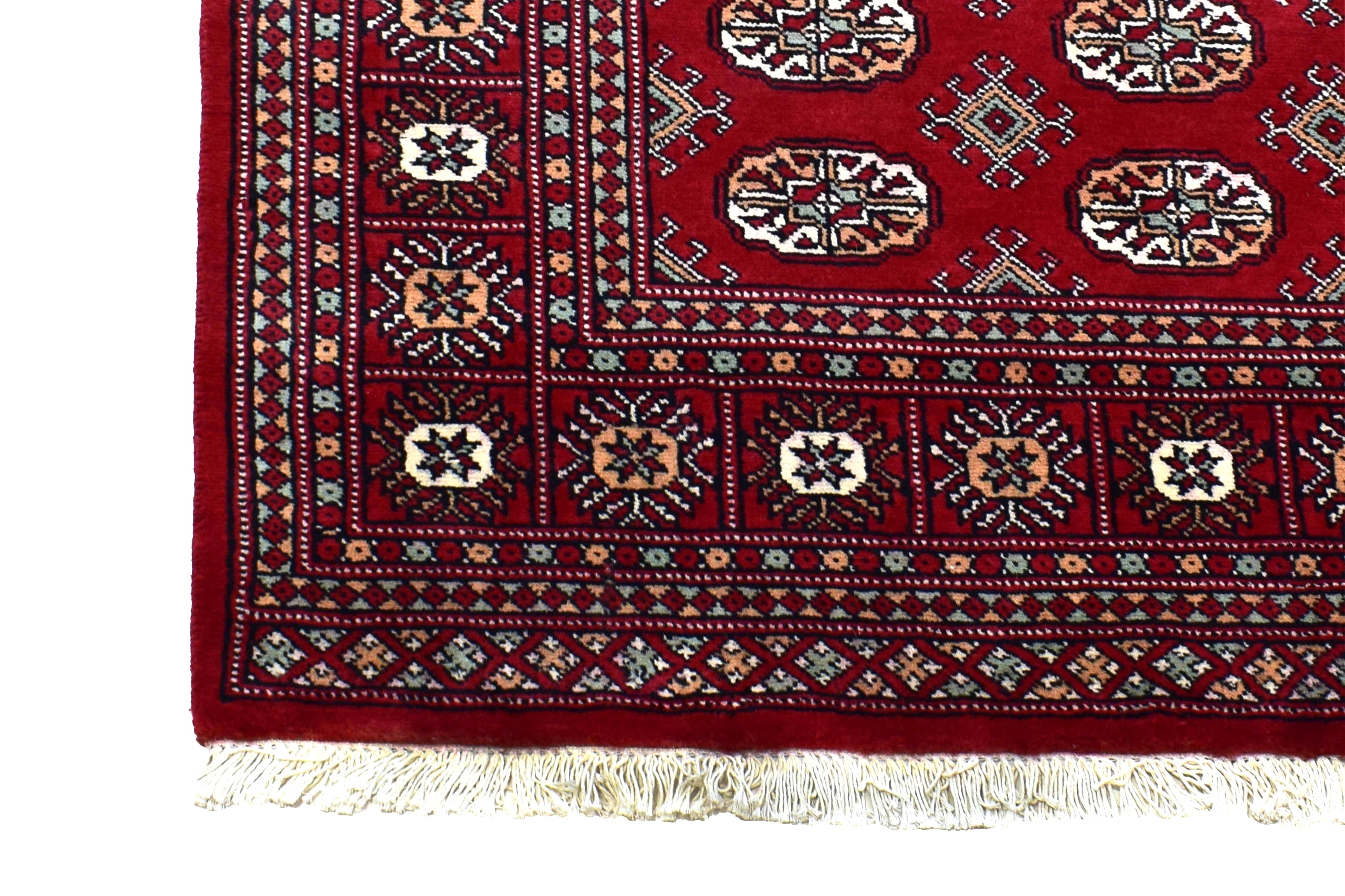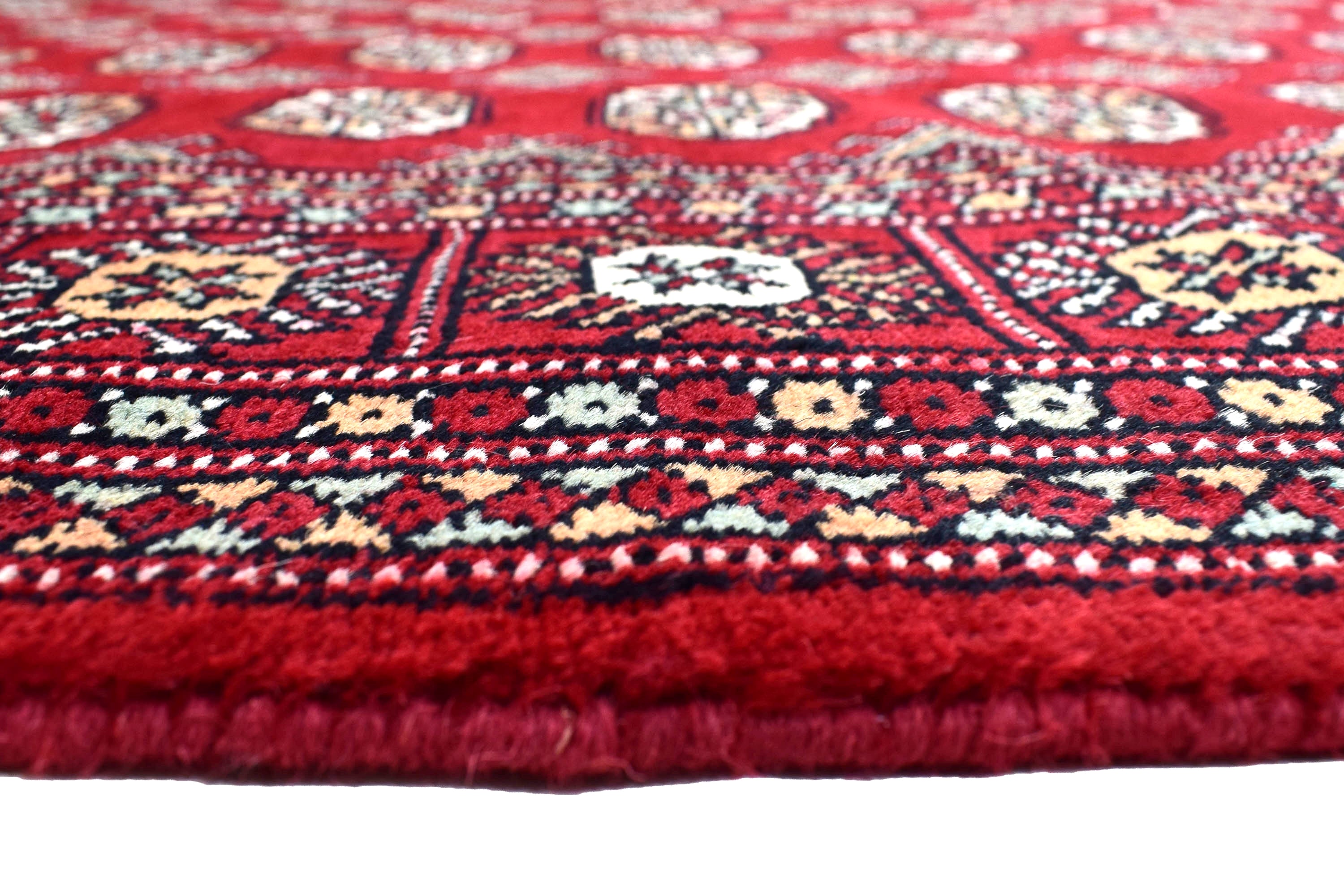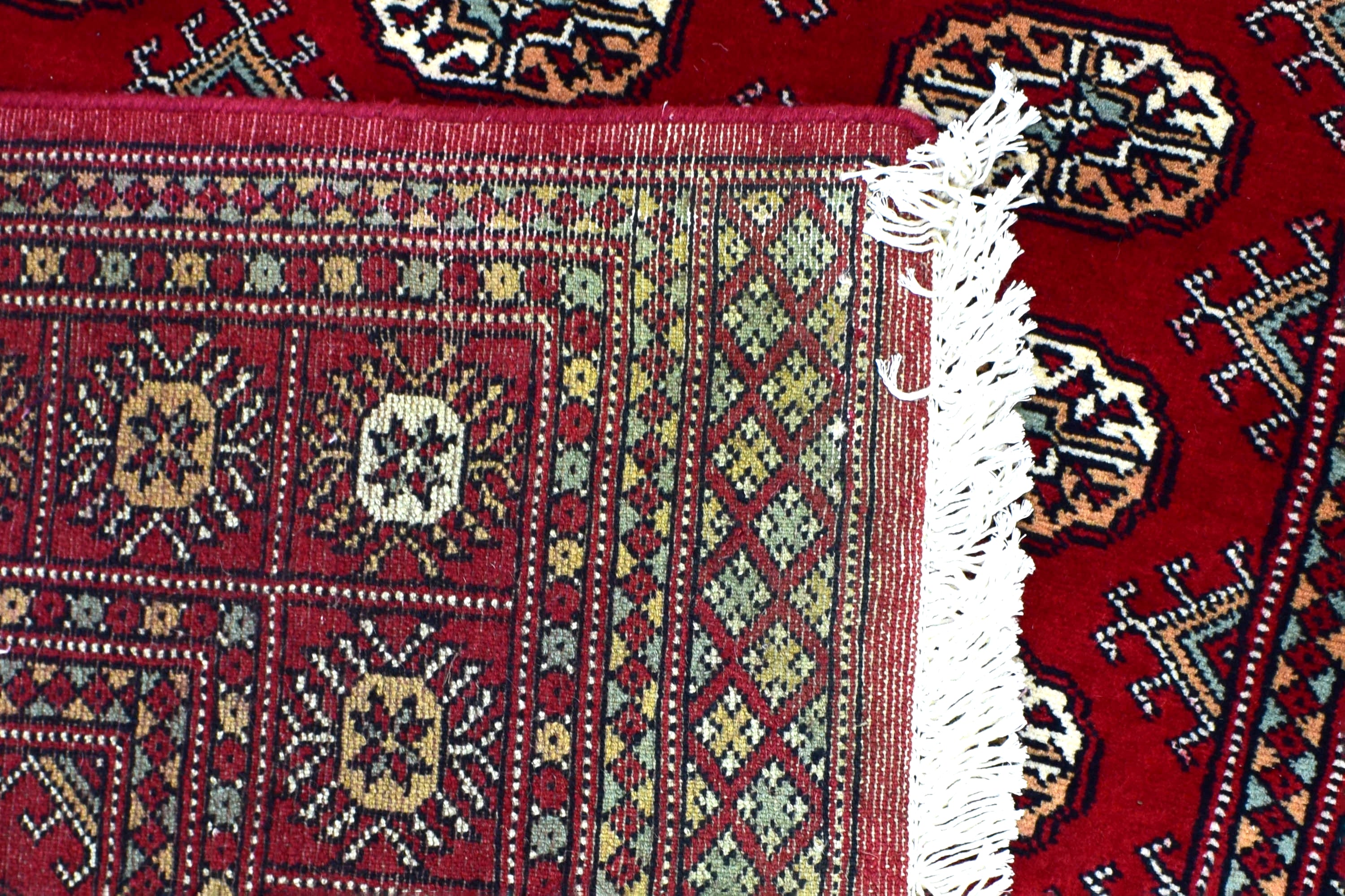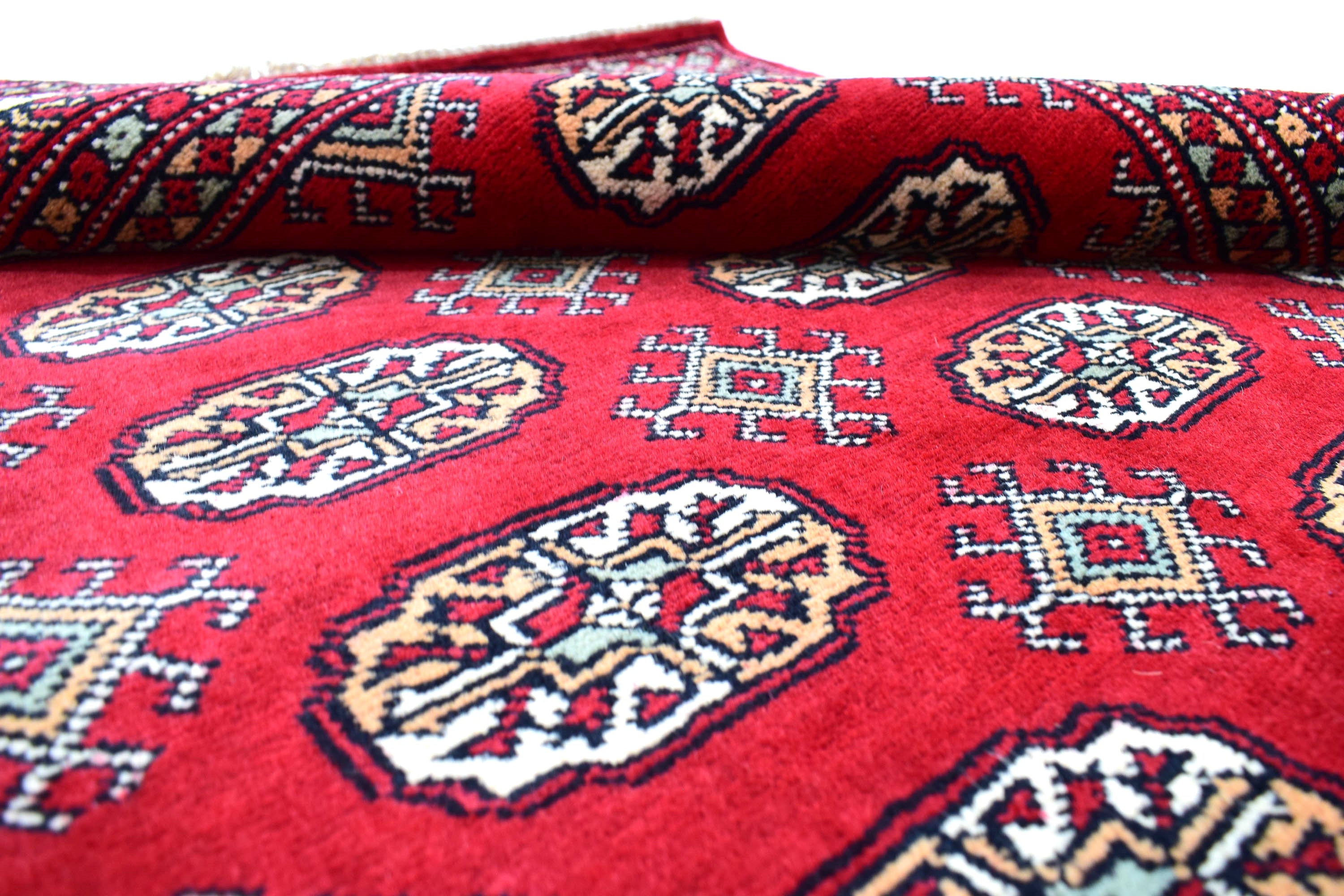 About Bukhara Rug: This beautiful rug has been hand-knotted in the Kashmir/Peshawar region by skilled artisan weavers. Bokhara rugs are some of the finest rugs manufactured in Pakistan. Using a combination of NZ and local Pakistani wool on a cotton base, the Pakistani Bokhara has an incredibly soft and thick pile with average high knot count (approx. 150~200 KPSI). These stunning Bokhara rugs have small, repeating geometric designs