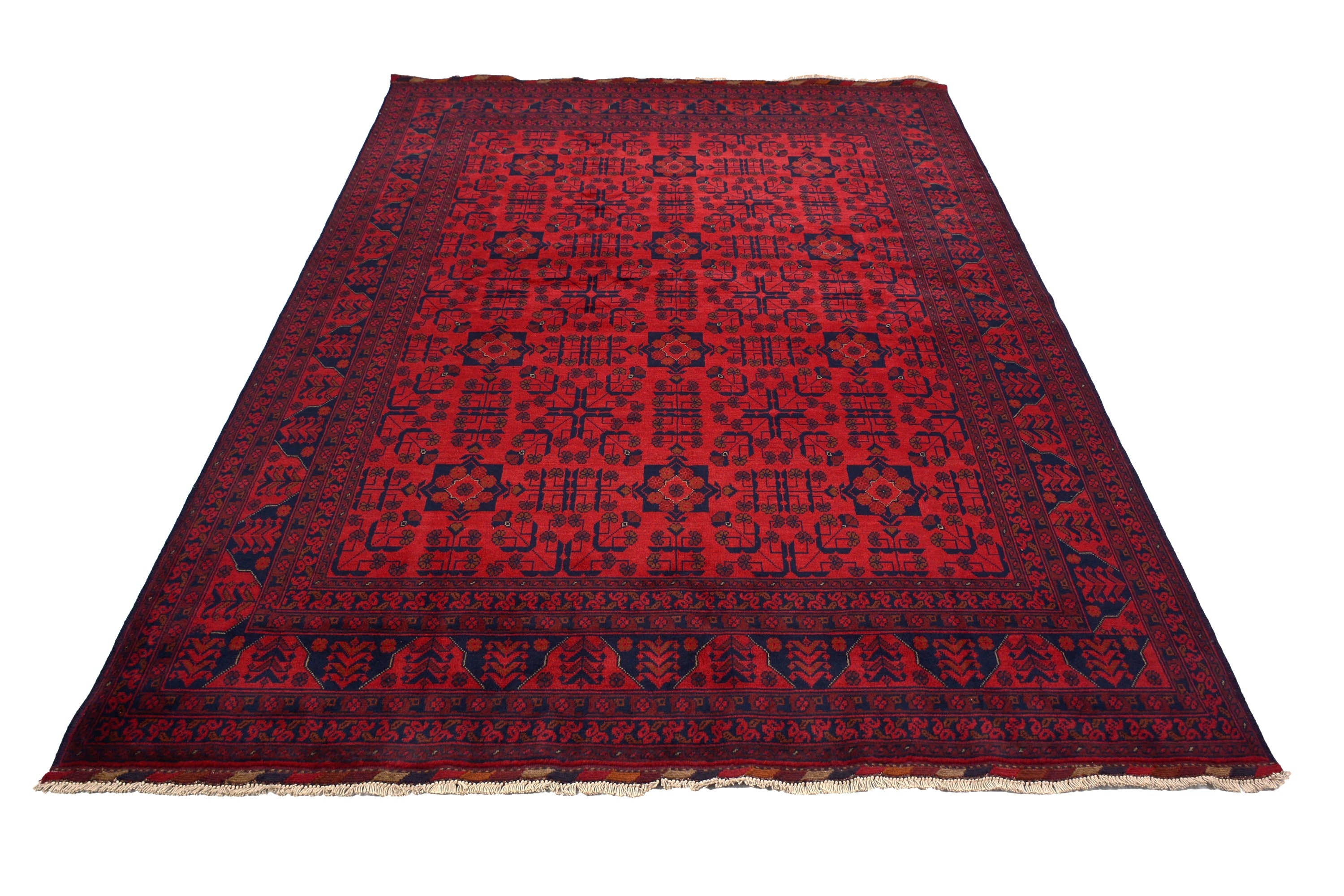 About Khal Mohammadi Rug: This beautiful rug has been hand-knotted in or around the town of Kunduz in the north of Afghanistan. Khal Mohammadi rugs are named after their creator, who developed the deep red tones that characterise this style. This rug is made using high-quality wool sourced from local Afghan sheep, known for its durability and natural sheen. This wool is hand-spun, adding a distinctive texture and character to each rug. Khal Mohammadi rugs often feature geometric patterns, stylised floral motifs, and elements inspired by nature.