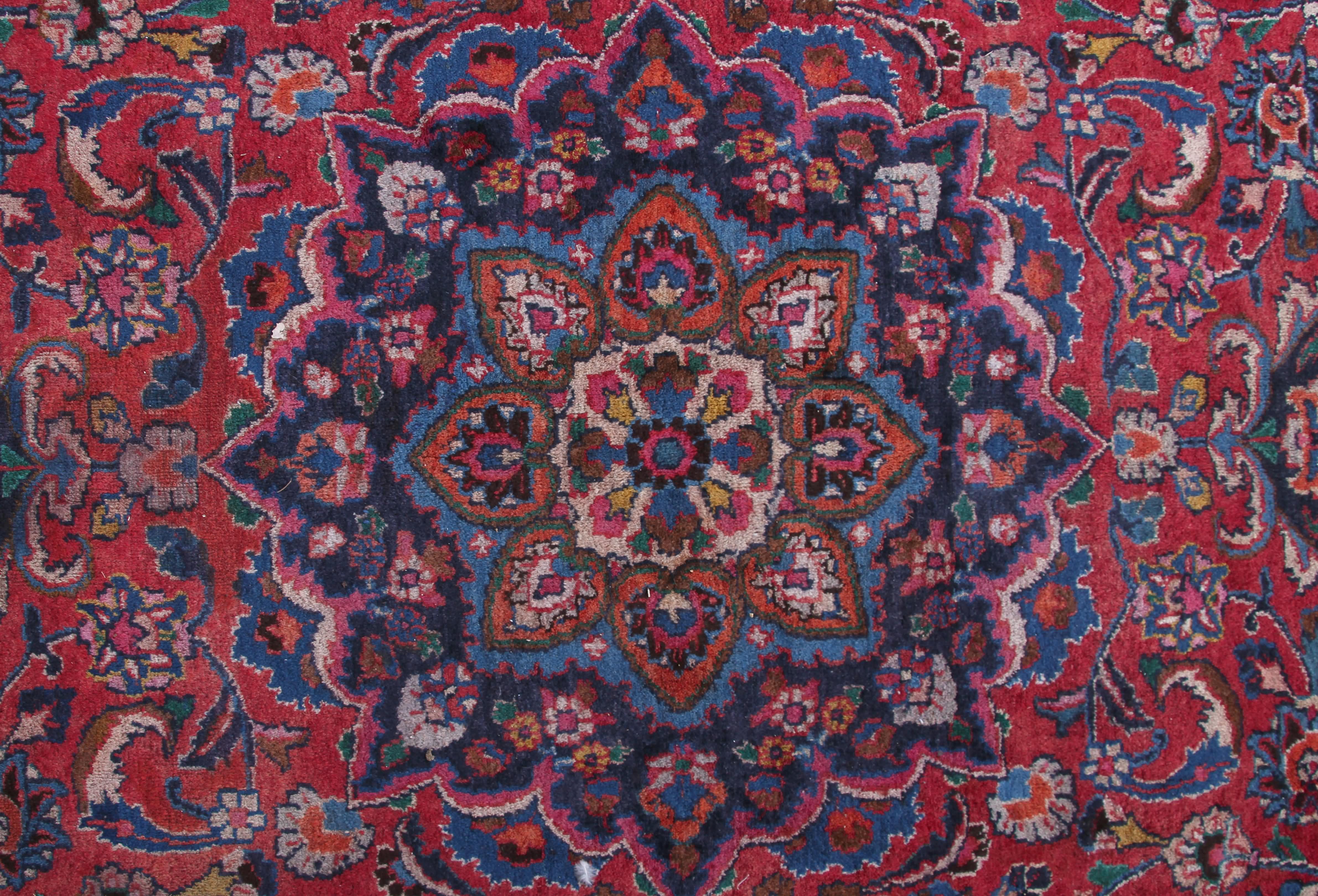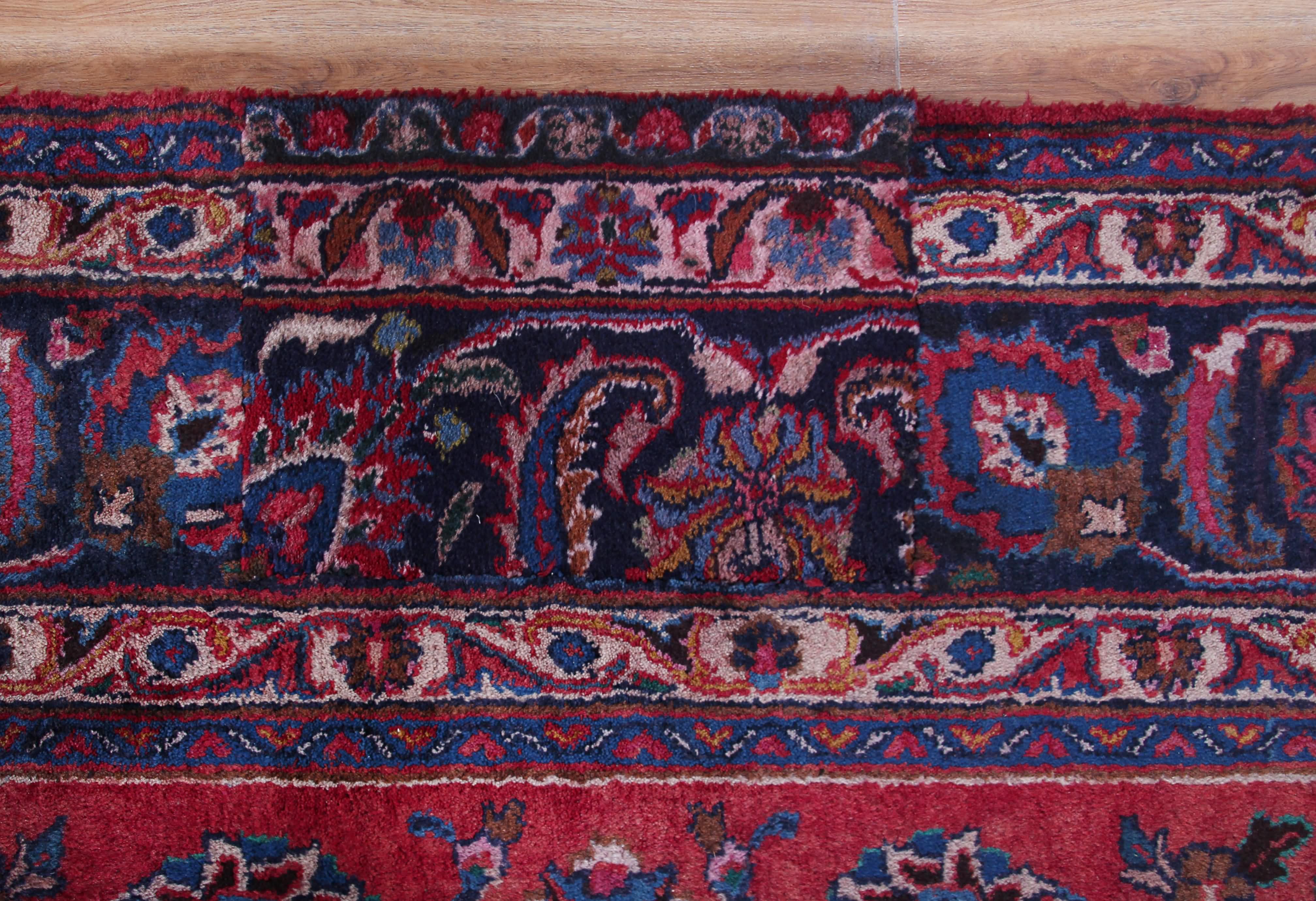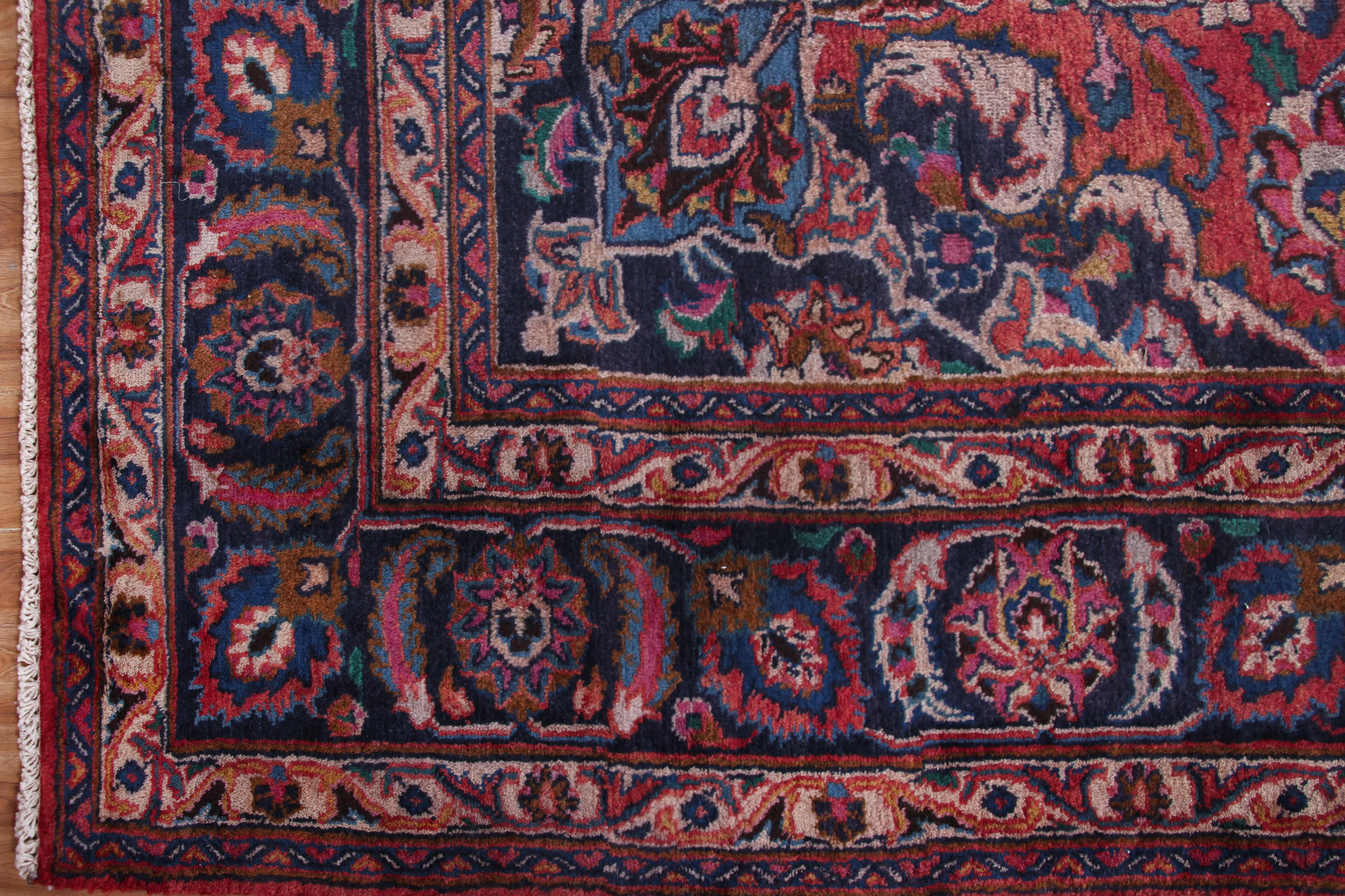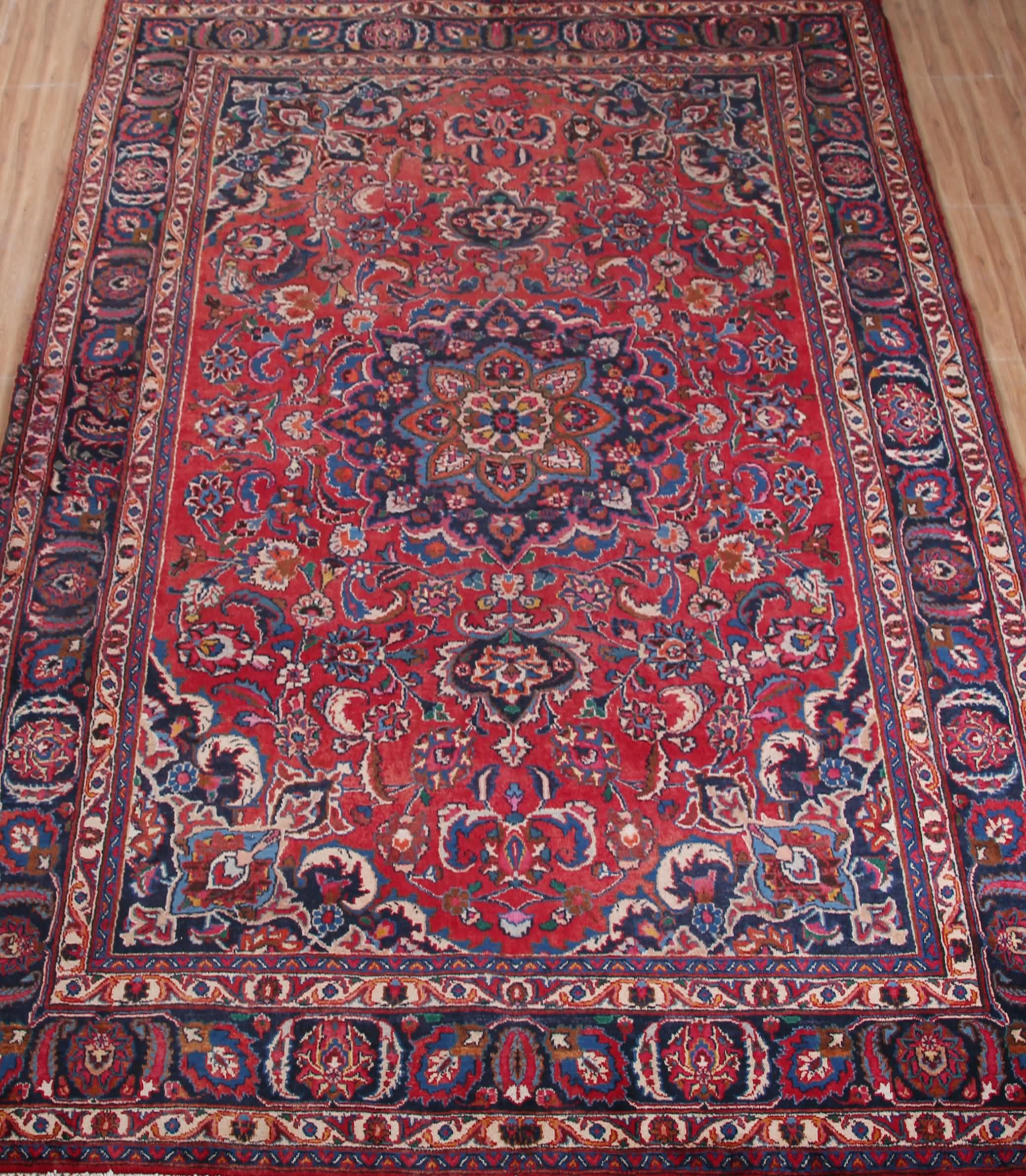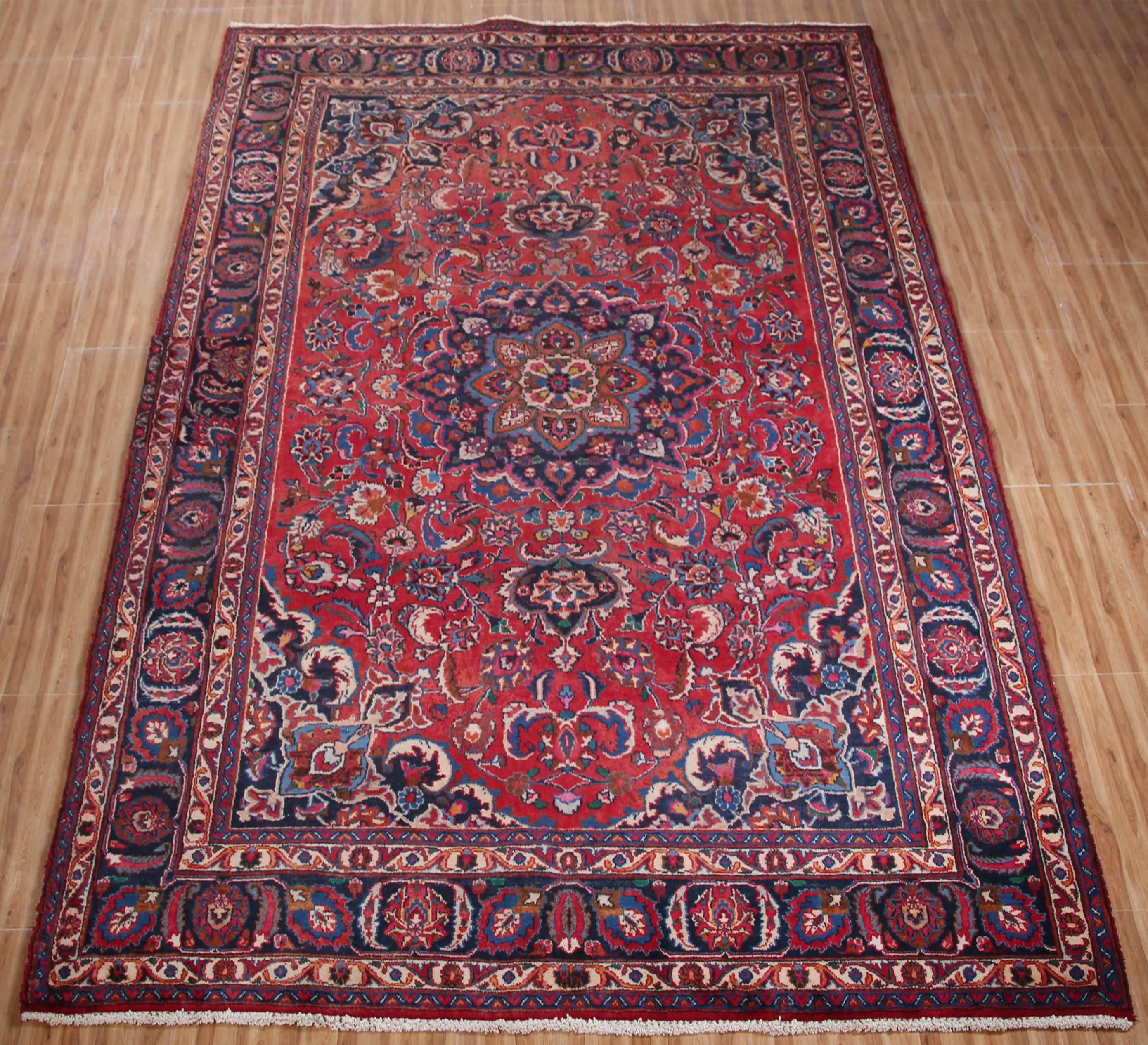 About Persian Mashad Rug: This beautiful rug was hand-woven in Mashad, Iran. Mashad carpets are authentic Oriental carpets which are easy to recognize with their famous medallions surrounded by floral motifs. They are often dominated by red tones, with blue tones in the border. High-quality wool is used, giving a hardwearing carpet. Typical knot density of Mashad rug can be 160,000 – 260,000 knots sqm.