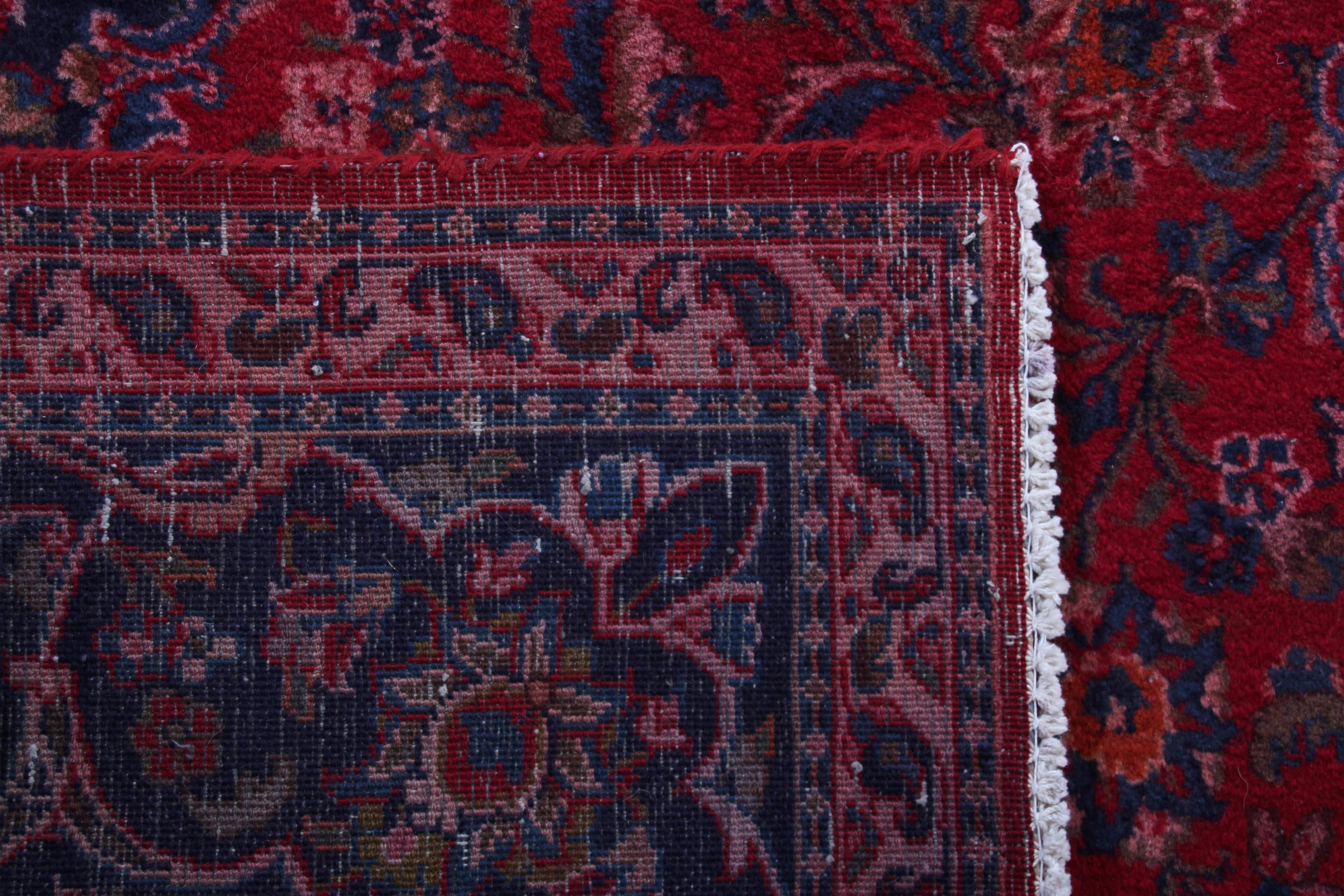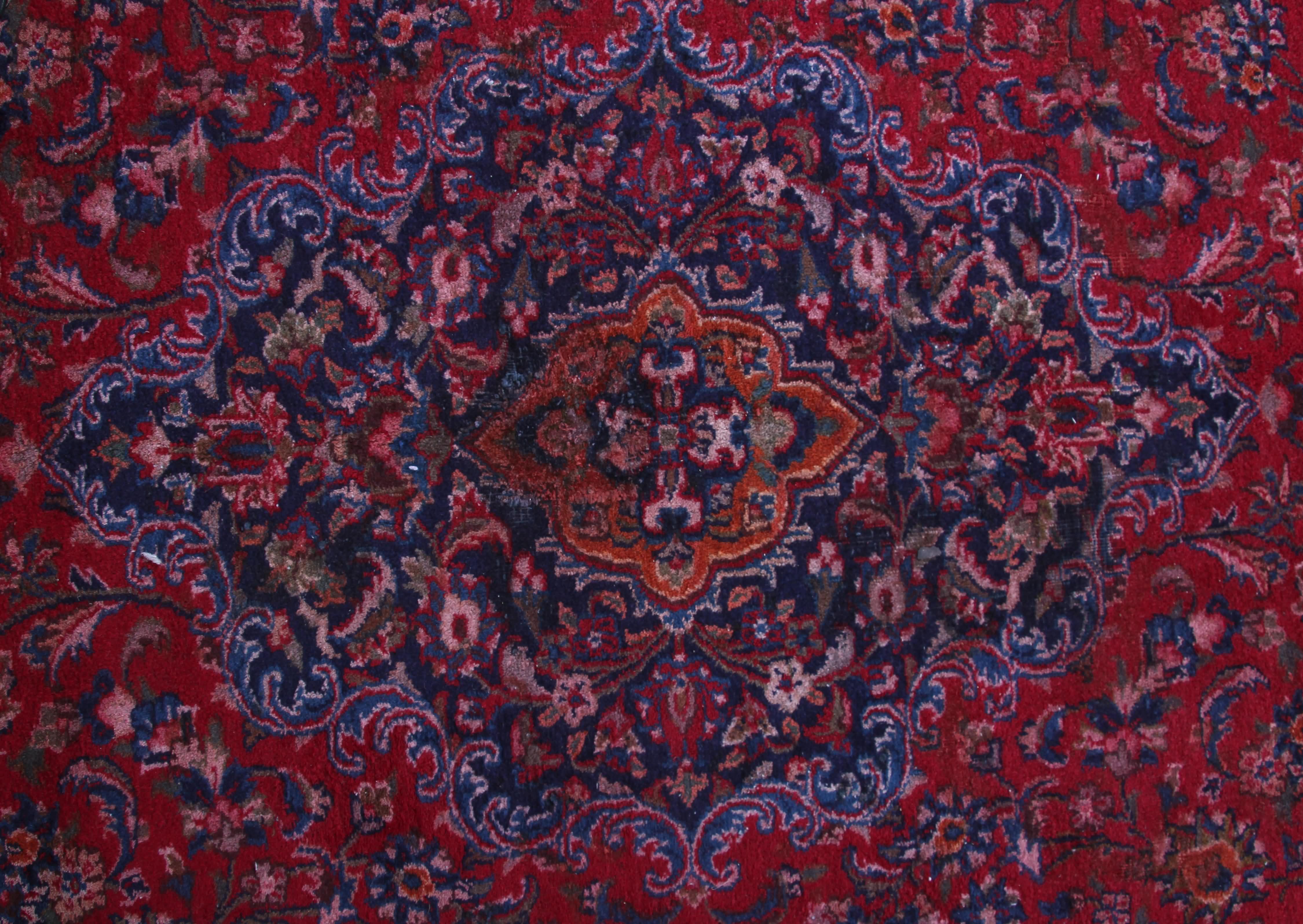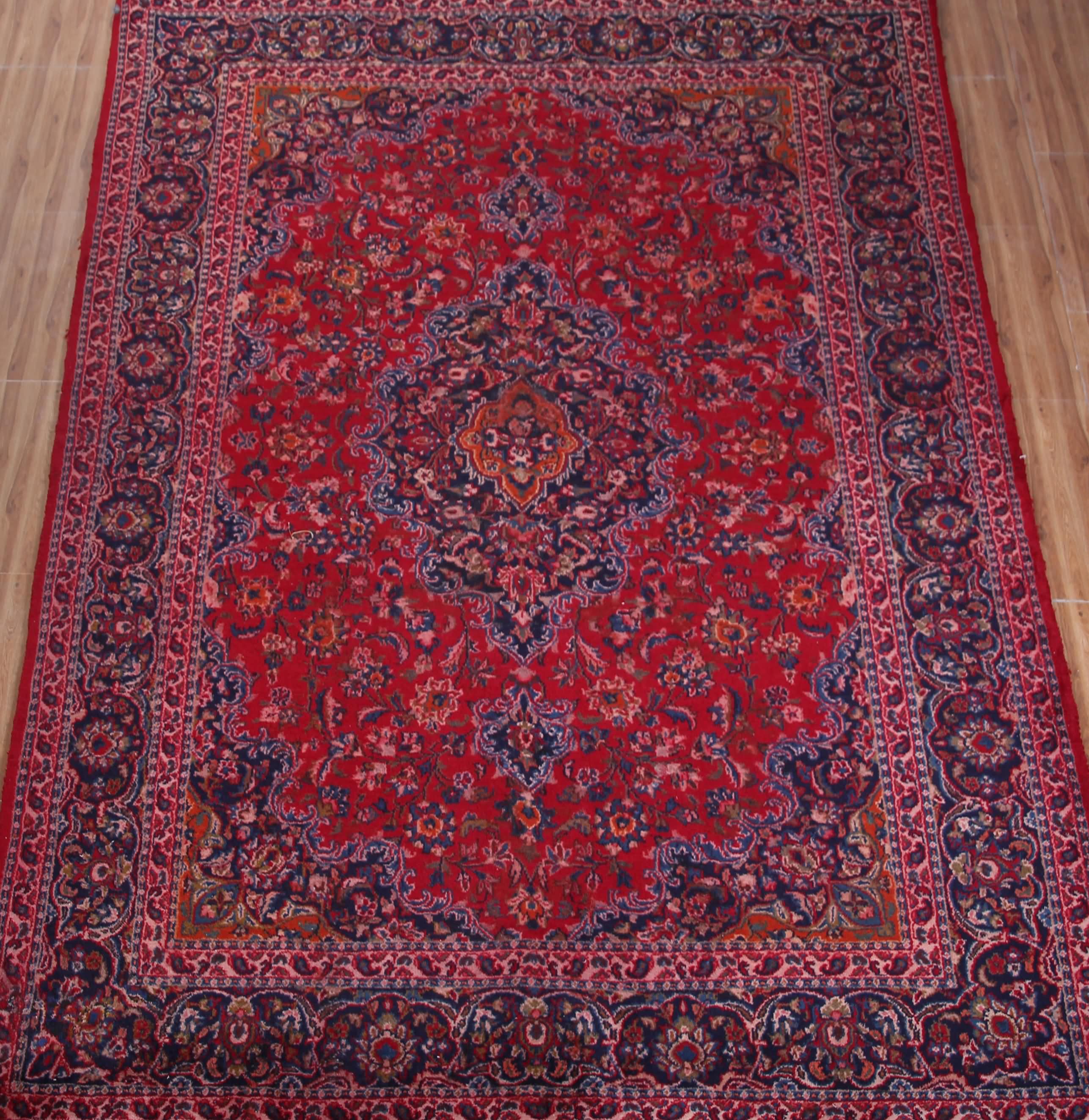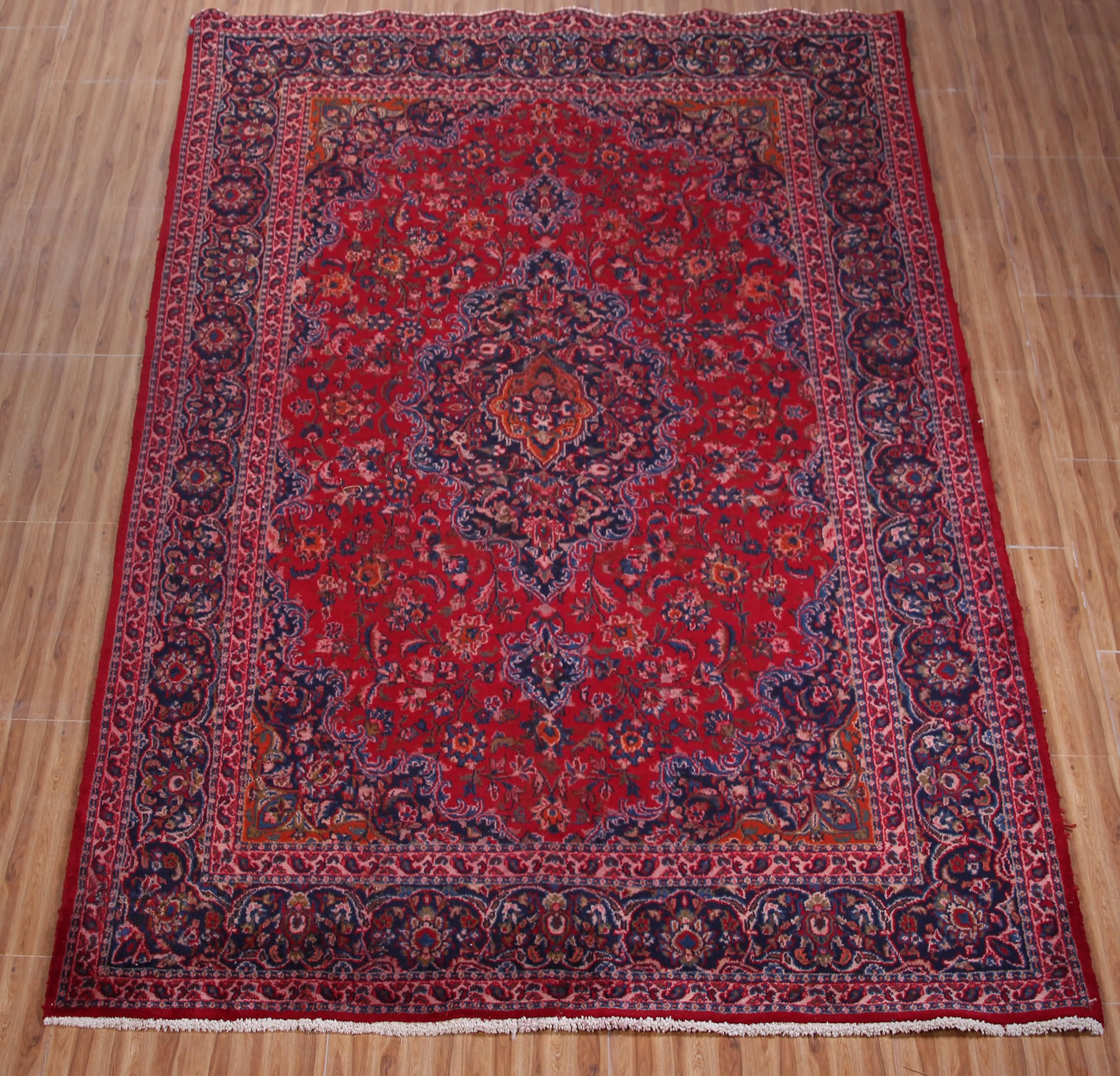 About Persian Mashad Rug: This beautiful rug was hand-woven in Mashad, Iran. Mashad carpets are authentic Oriental carpets which are easy to recognize with their famous medallions surrounded by floral motifs. They are often dominated by red tones, with blue tones in the border. High-quality wool is used, giving a hardwearing carpet. Typical knot density of Mashad rug can be 160,000 – 260,000 knots sqm.
