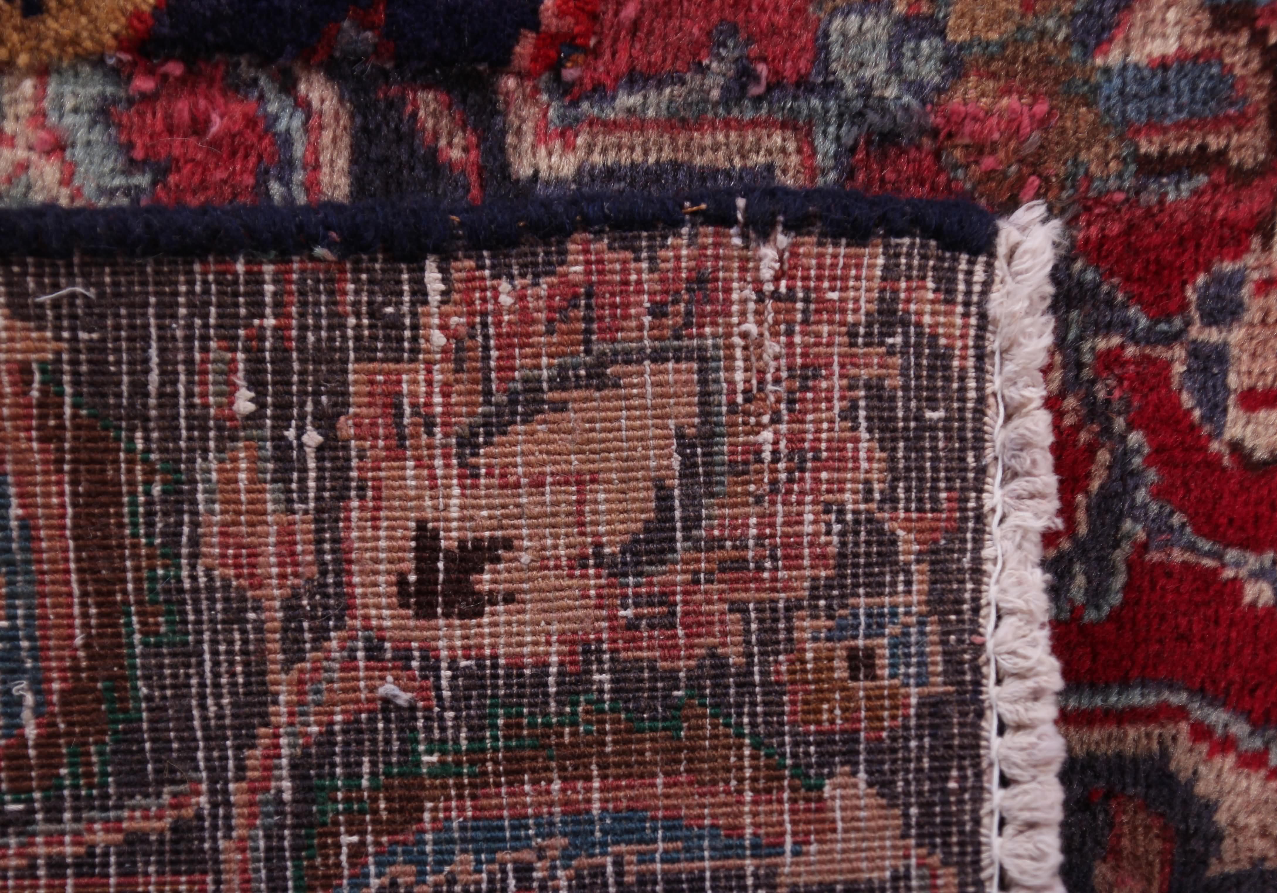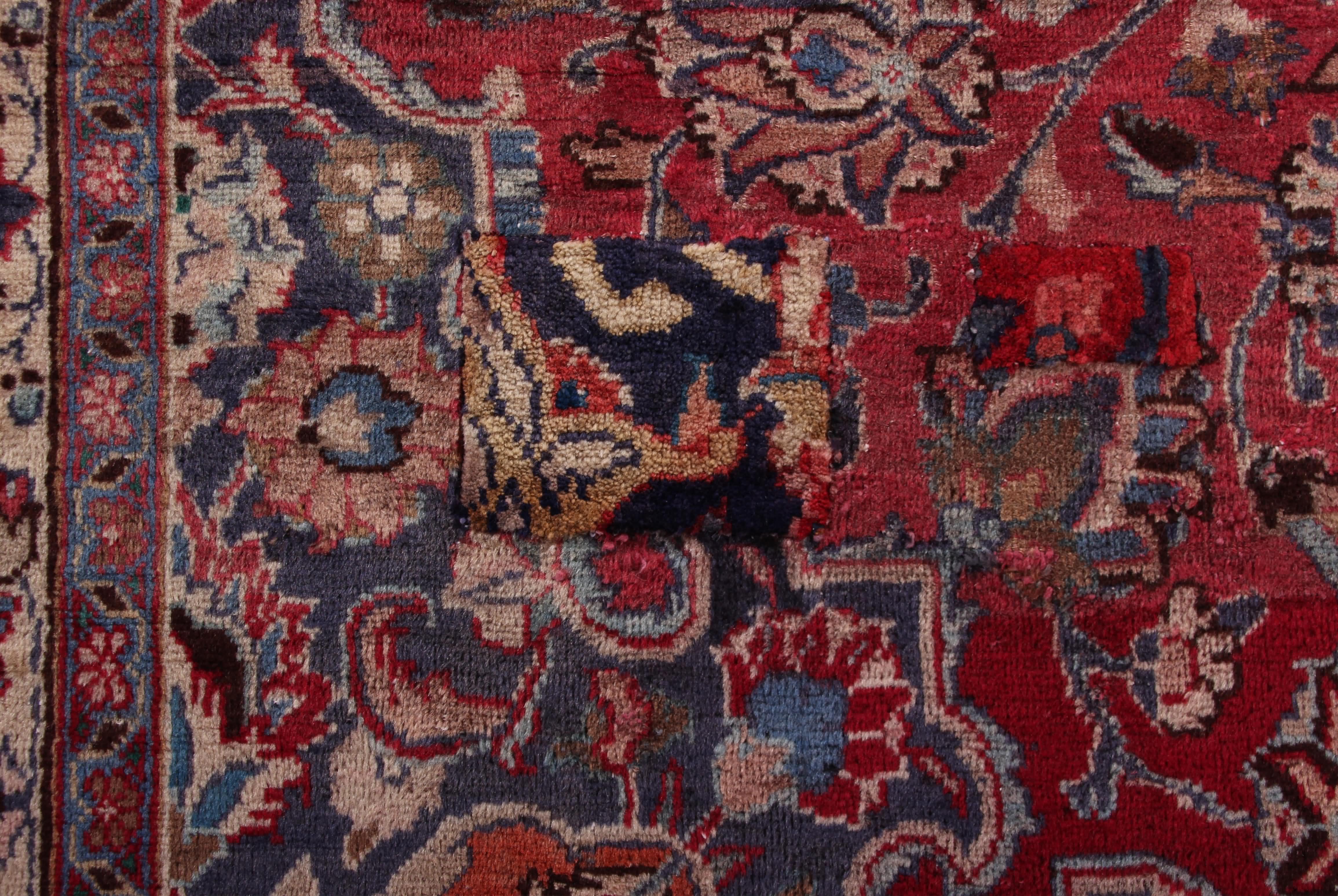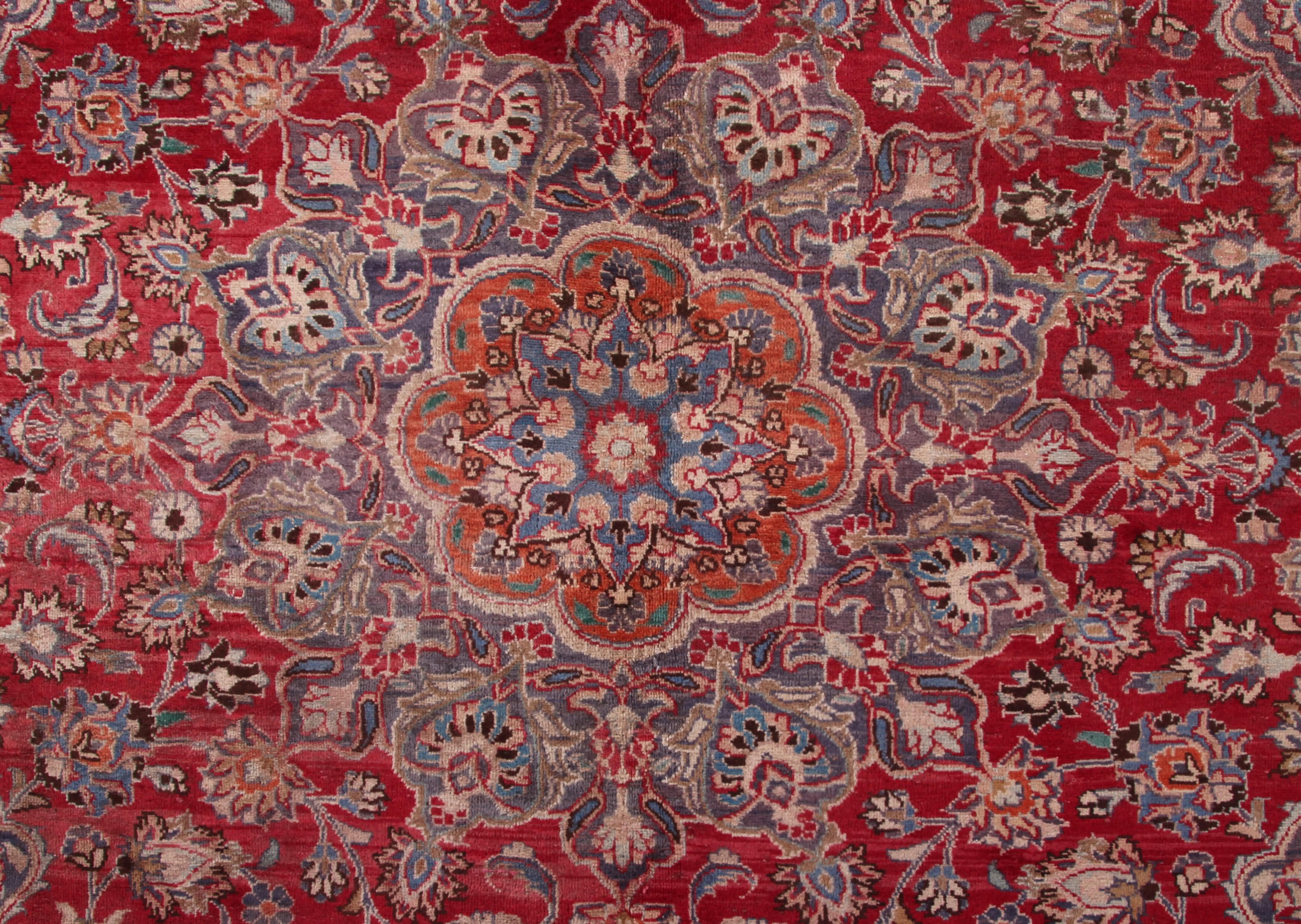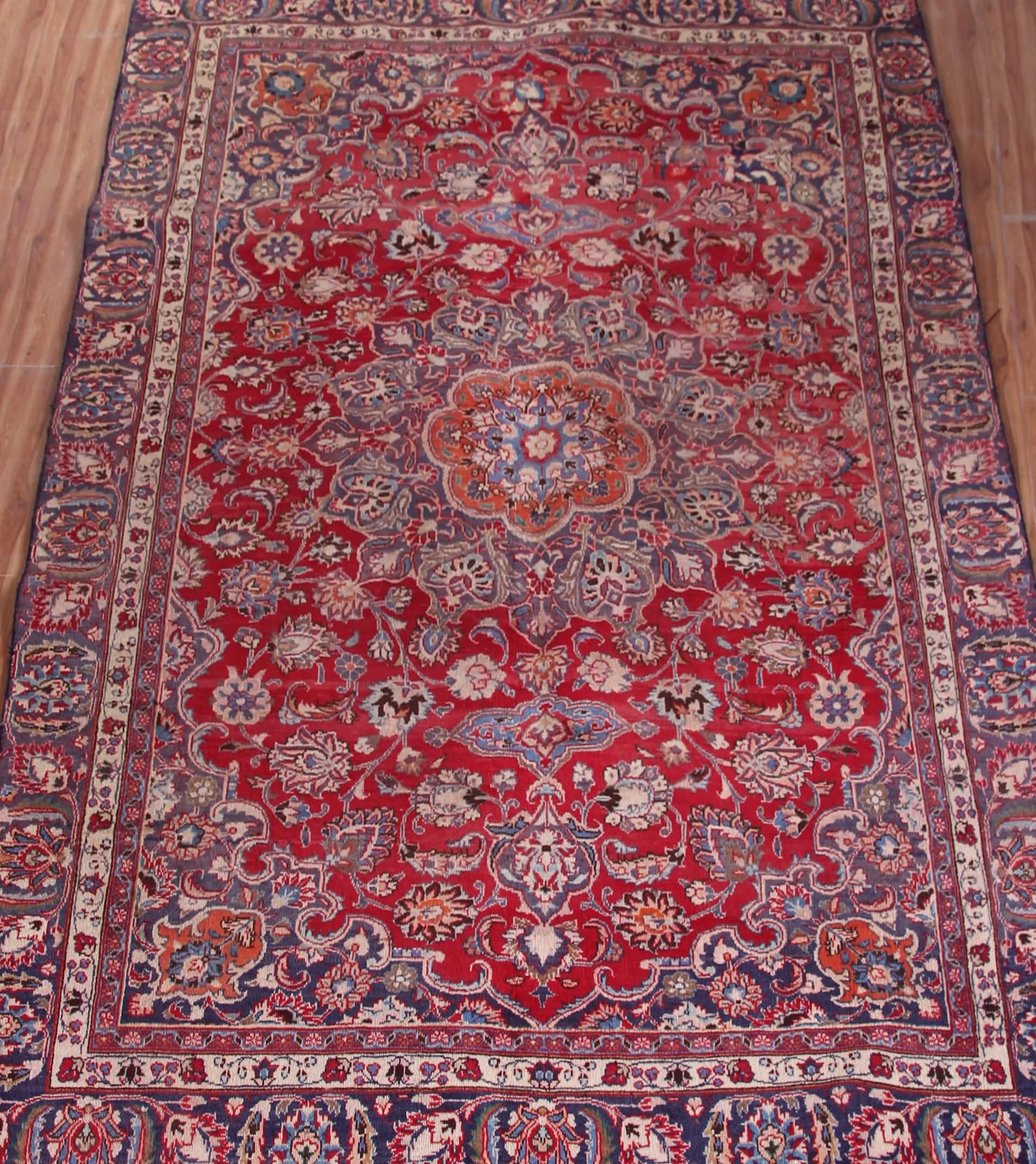About Persian Mashad Rug: This beautiful rug was hand-woven in Mashad, Iran. Mashad carpets are authentic Oriental carpets which are easy to recognize with their famous medallions surrounded by floral motifs. They are often dominated by red tones, with blue tones in the border. High-quality wool is used, giving a hardwearing carpet. Typical knot density of Mashad rug can be 160,000 – 260,000 knots sqm.