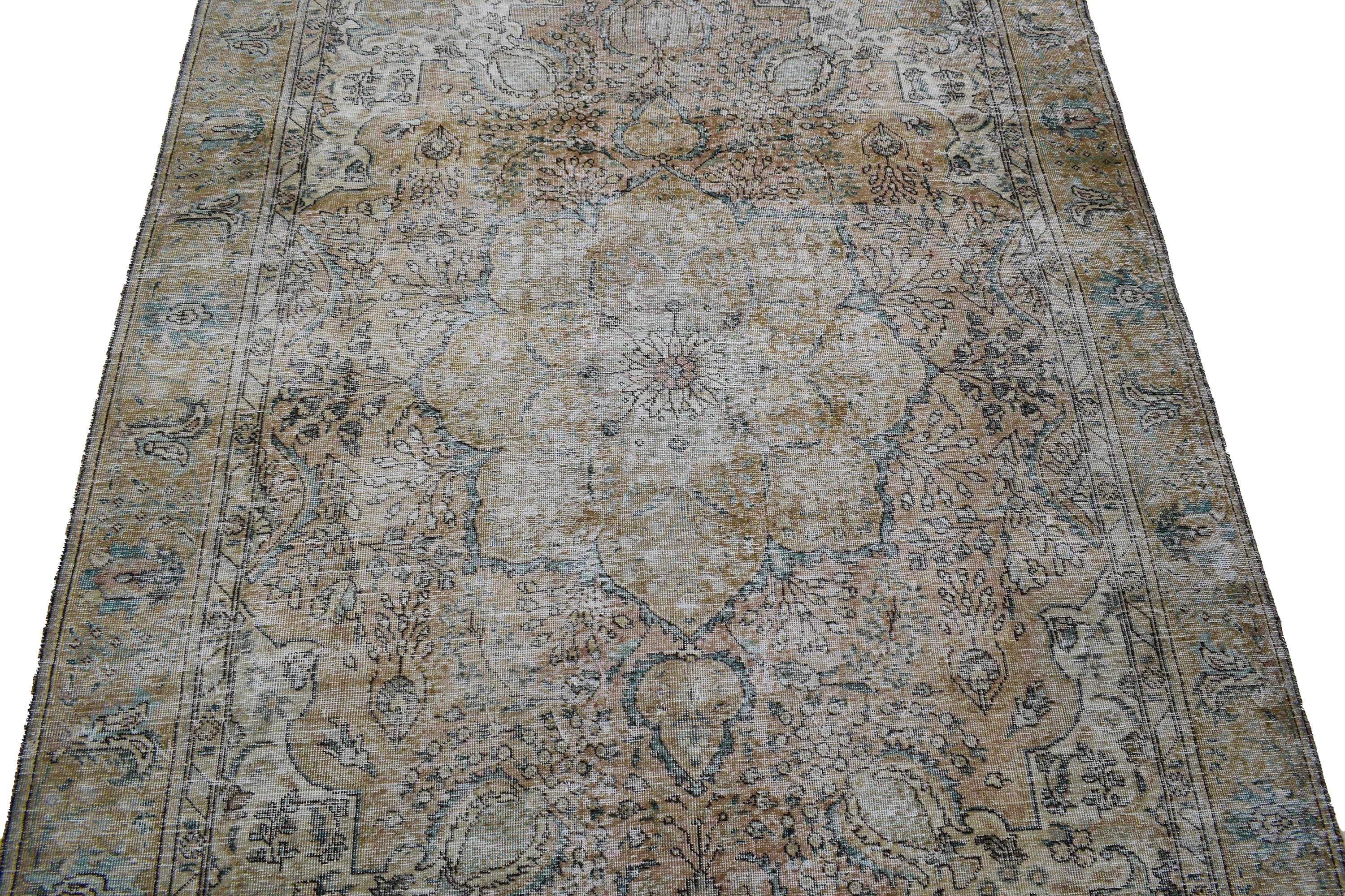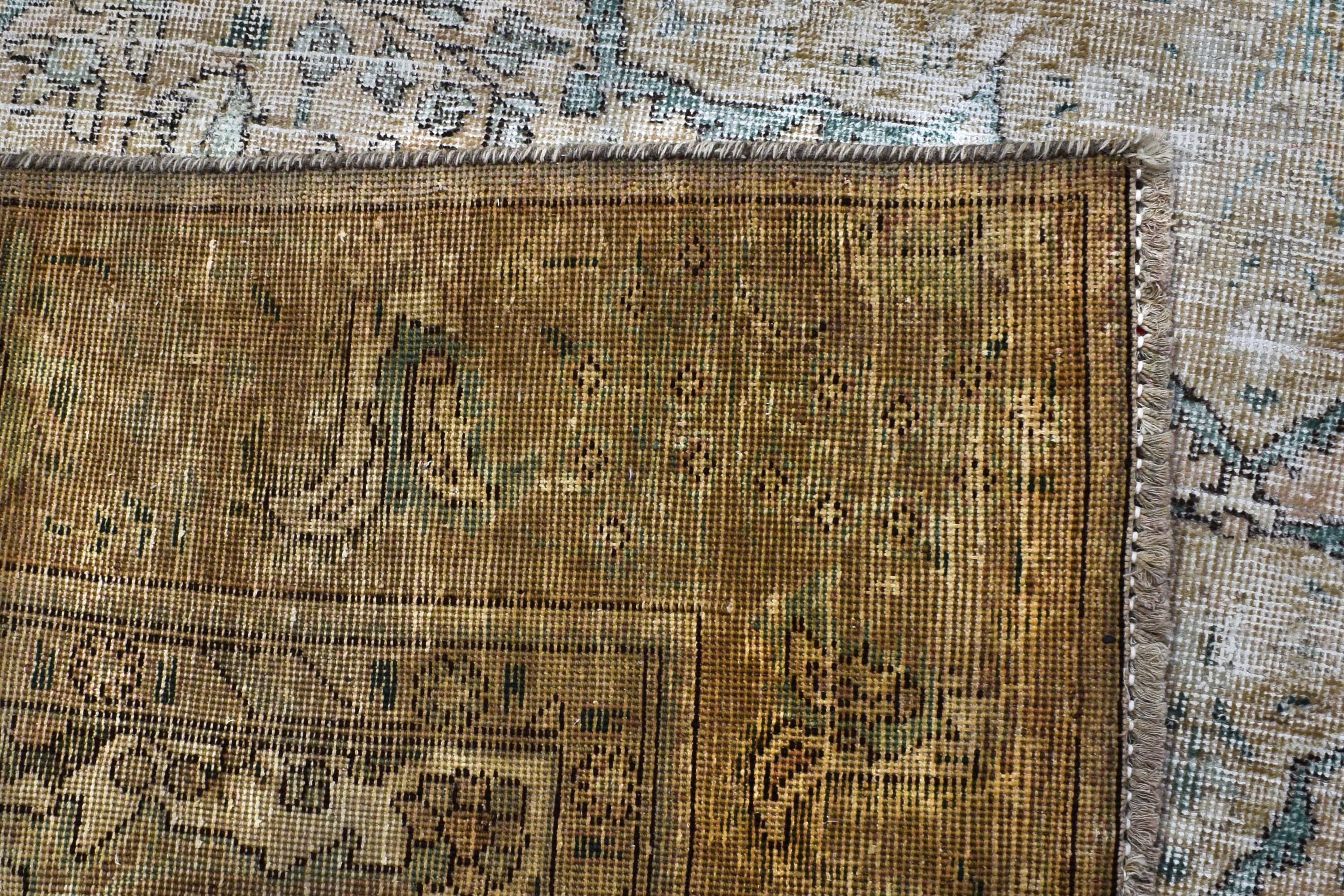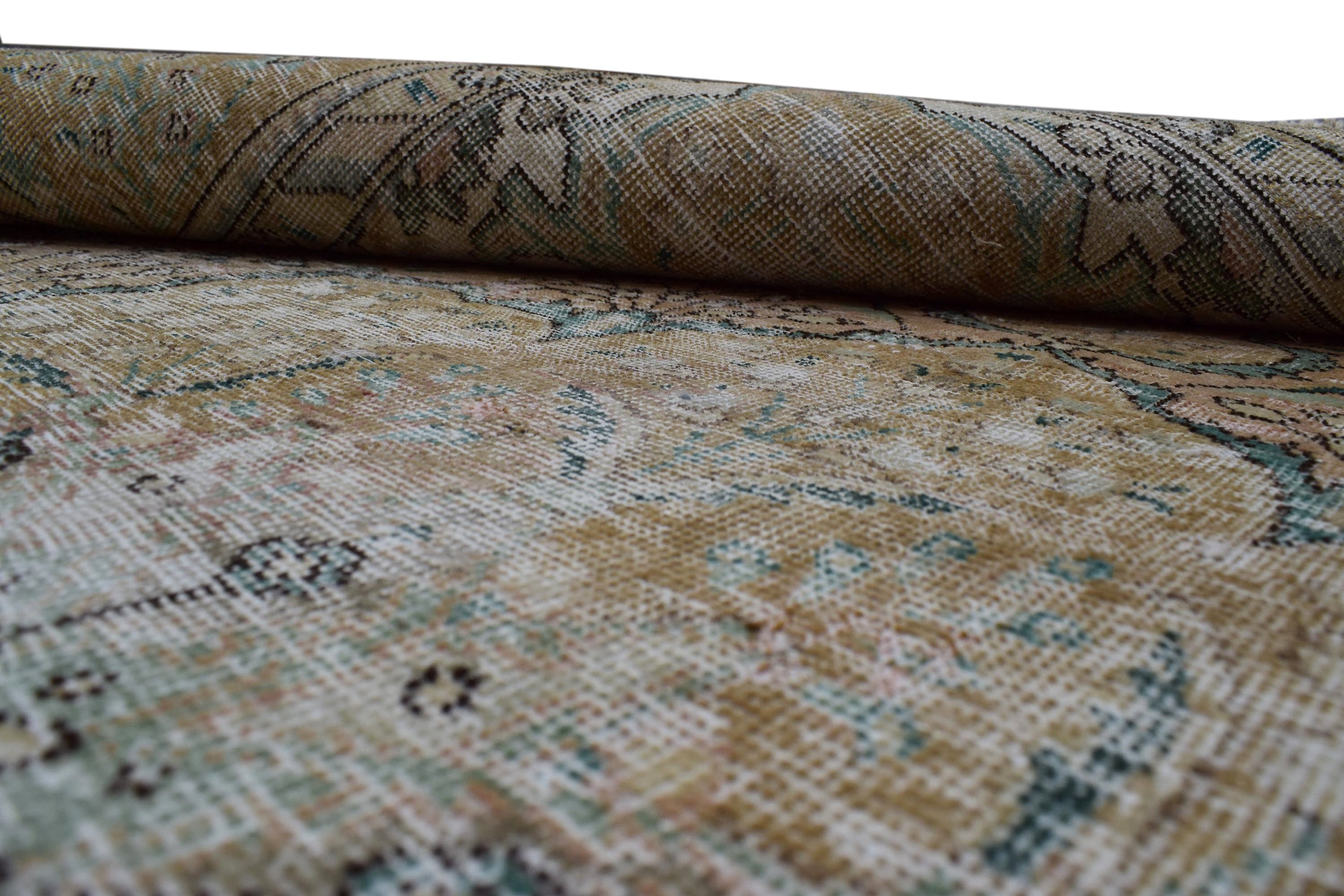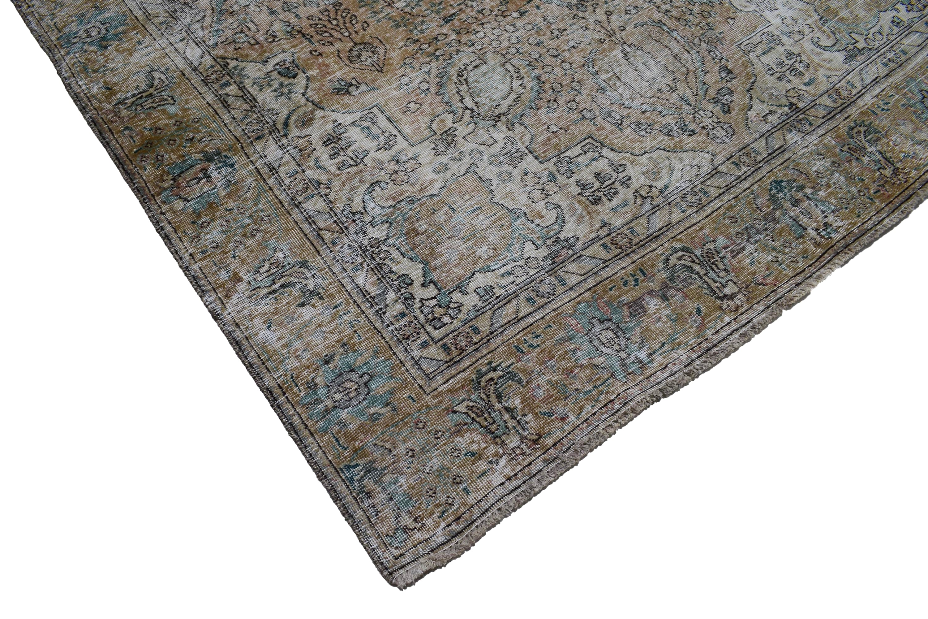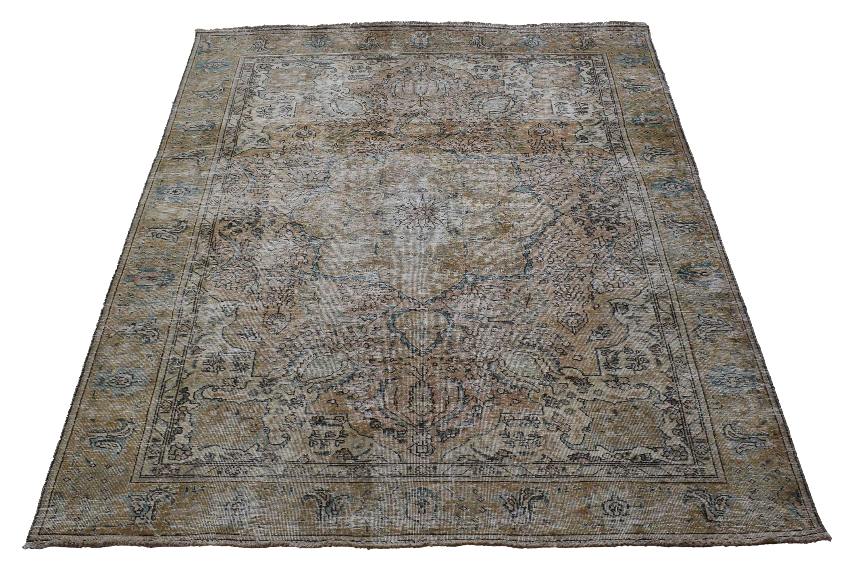 About Distressed Rug: This beautiful rug was hand-woven in 1970's in Tabriz, Iran. Later, this vintage rug has been shaved down to a lower pile to make it a faded rug on purpose. Distressed Rugs represent a trend that has achieved a crossover between fashion and home décor. This new look celebrates rugs that are faded, and worn over time; rugs that nestle into homes as if they’ve always been there. Distressed rugs are shaved rugs so they do not have a soft pile.