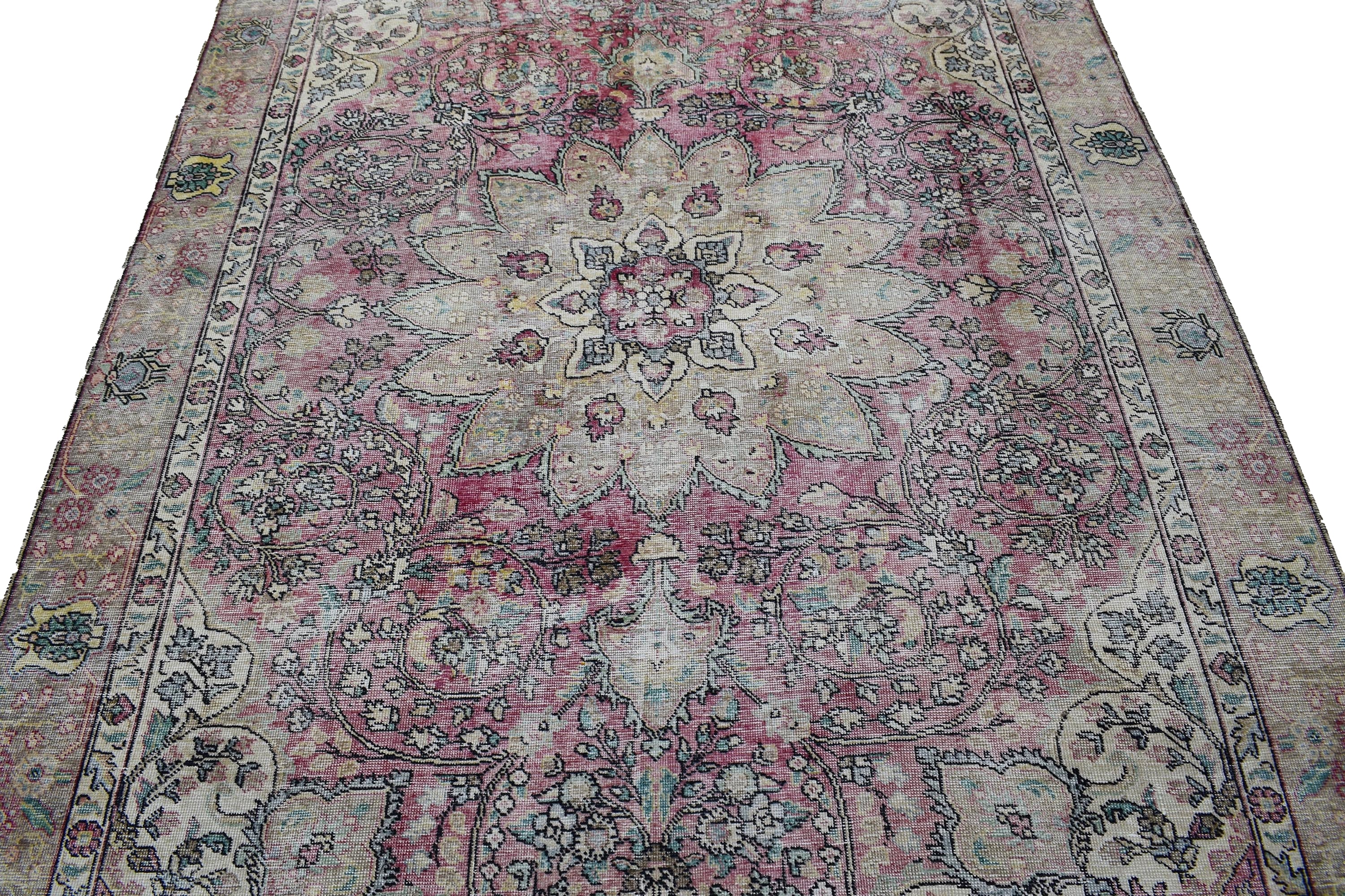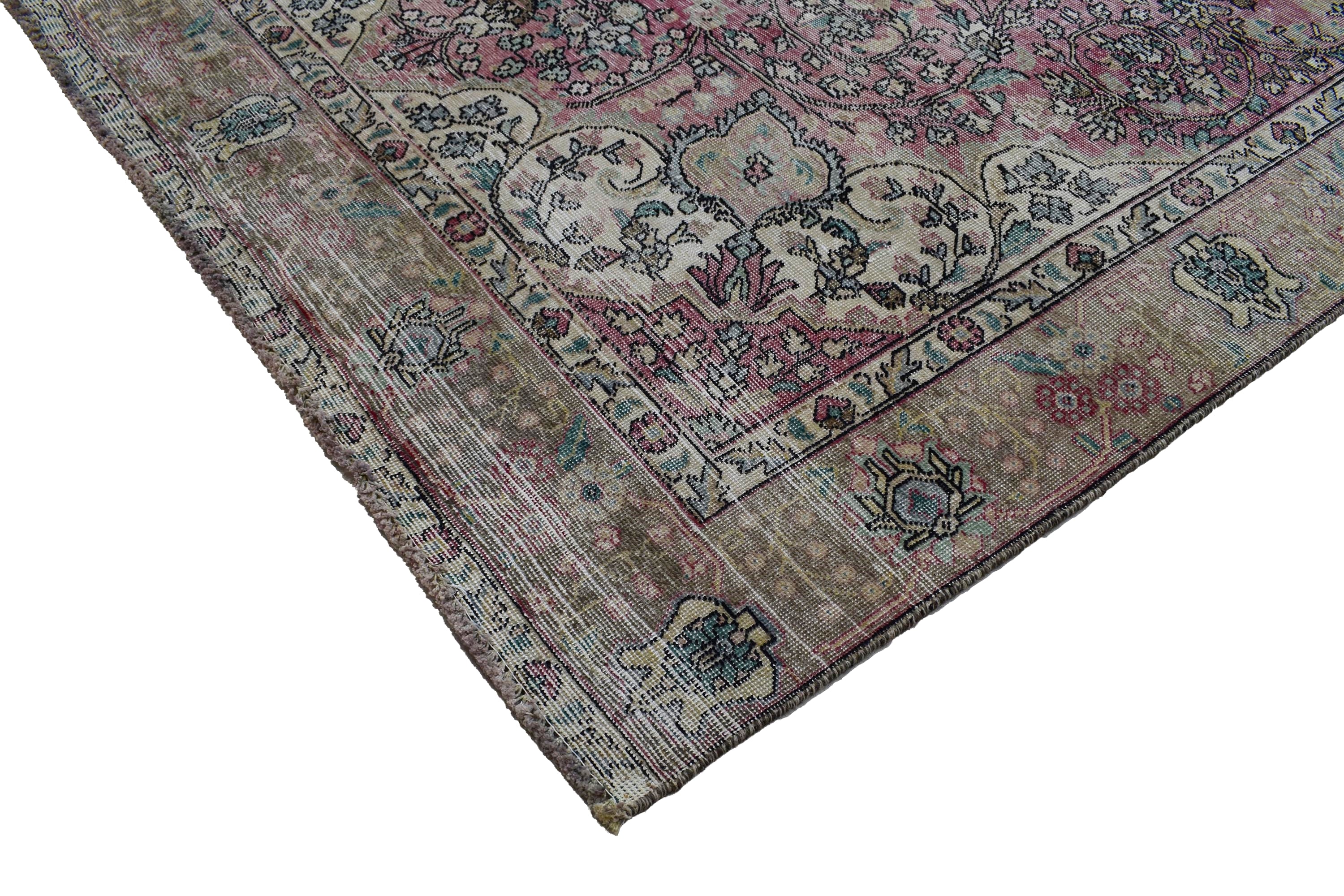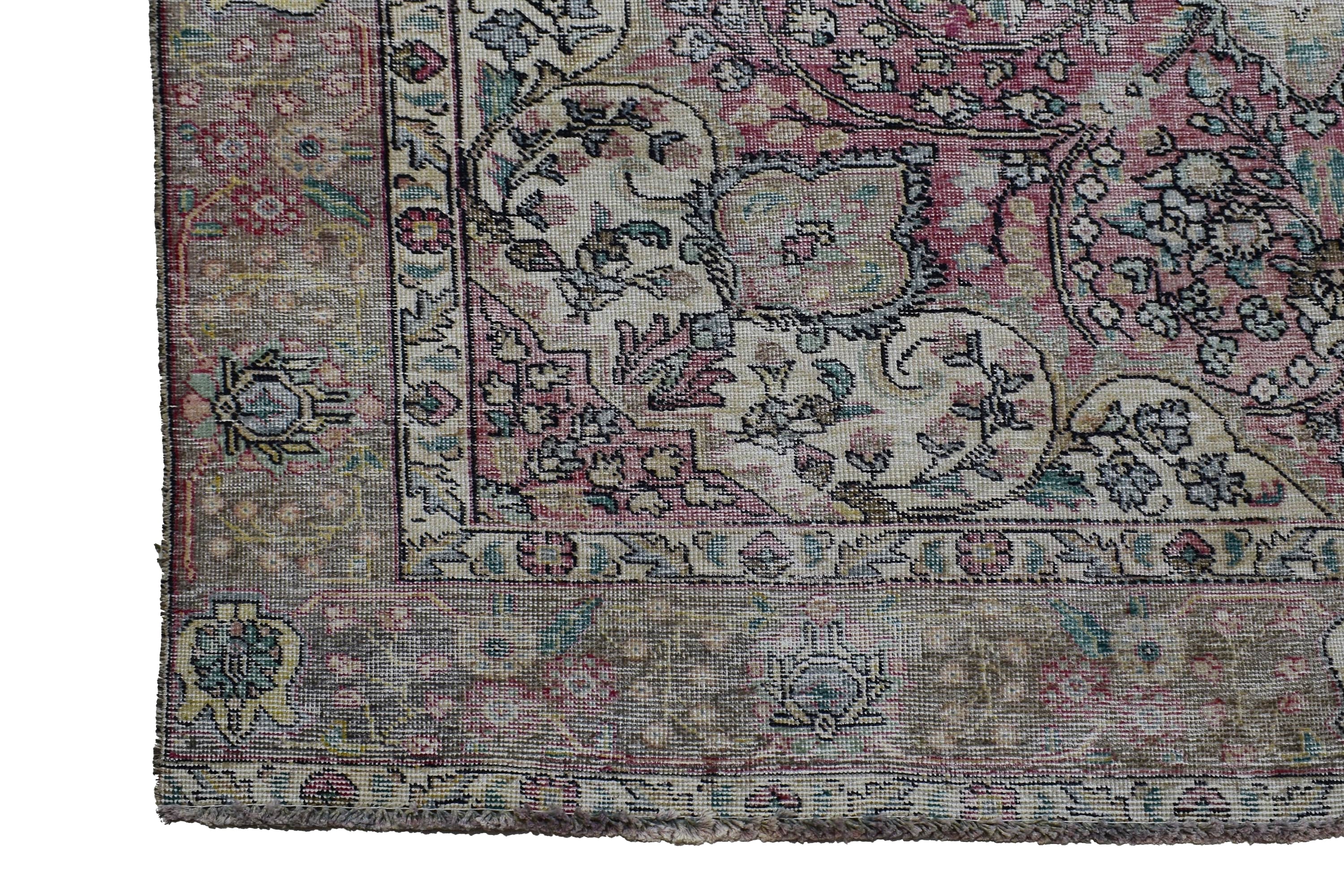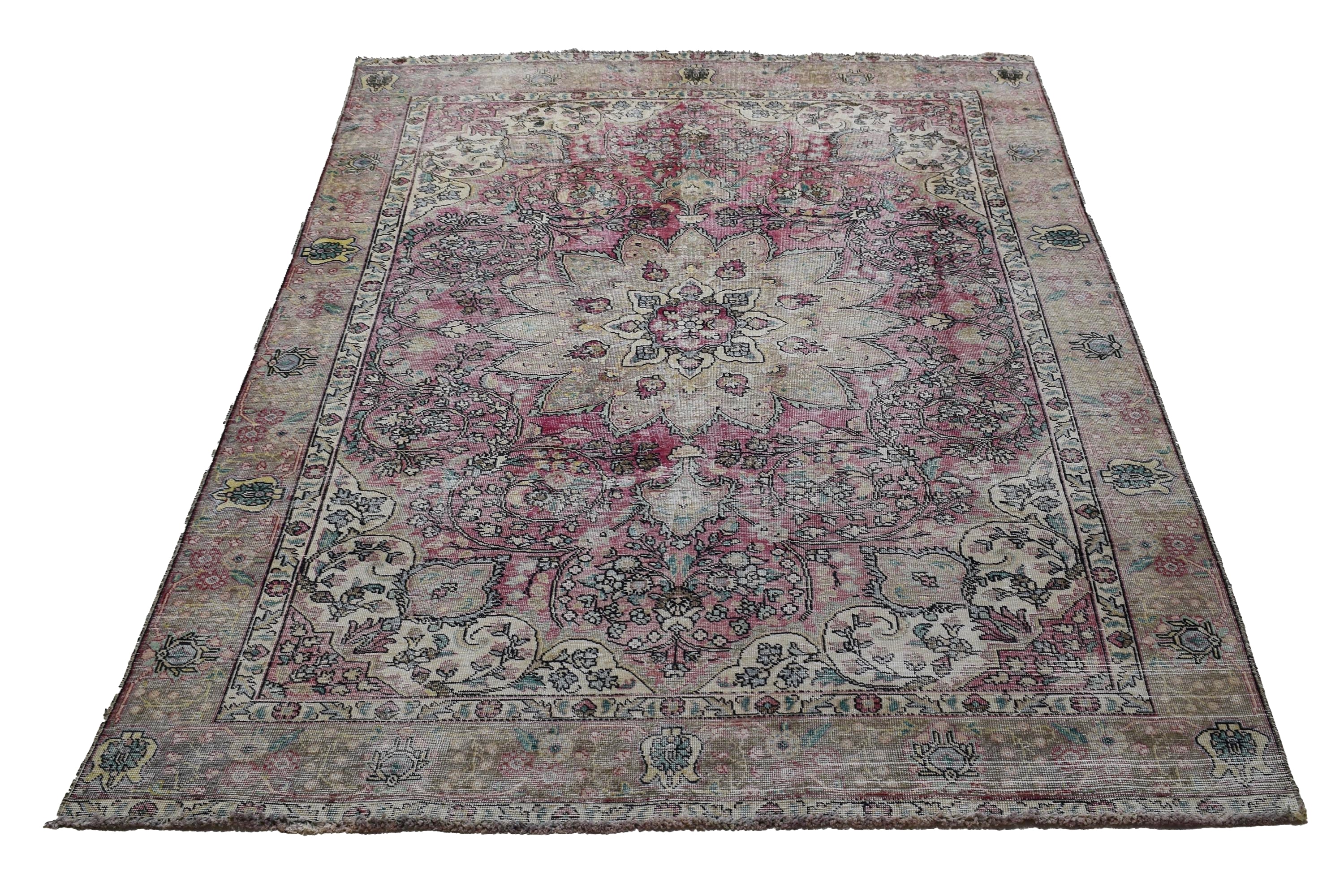 About Distressed Rug: This beautiful rug was hand-woven in 1970's in Tabriz, Iran. Later, this vintage rug has been shaved down to a lower pile to make it a faded rug on purpose. Distressed Rugs represent a trend that has achieved a crossover between fashion and home décor. This new look celebrates rugs that are faded, and worn over time; rugs that nestle into homes as if they’ve always been there. Distressed rugs are shaved rugs so they do not have a soft pile.