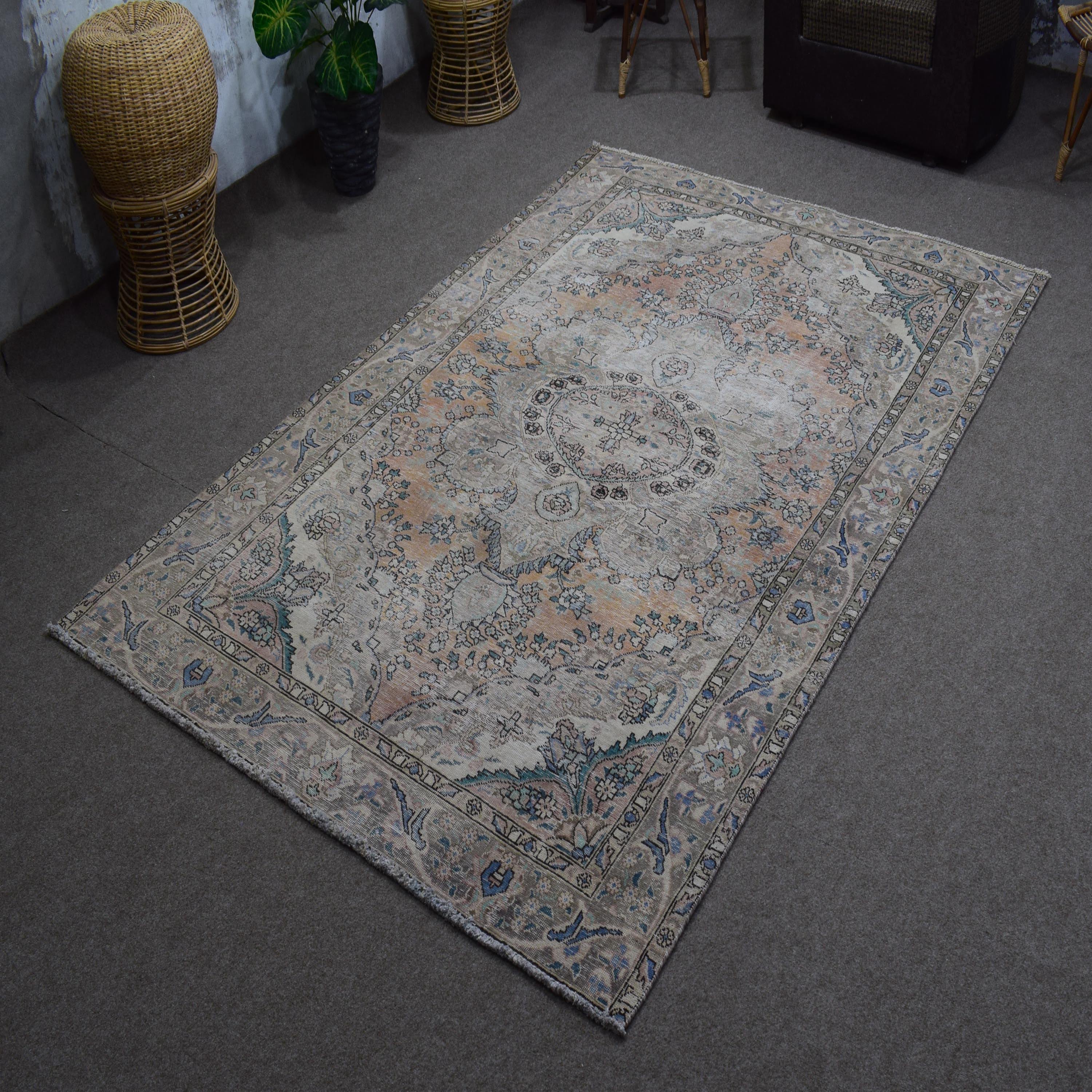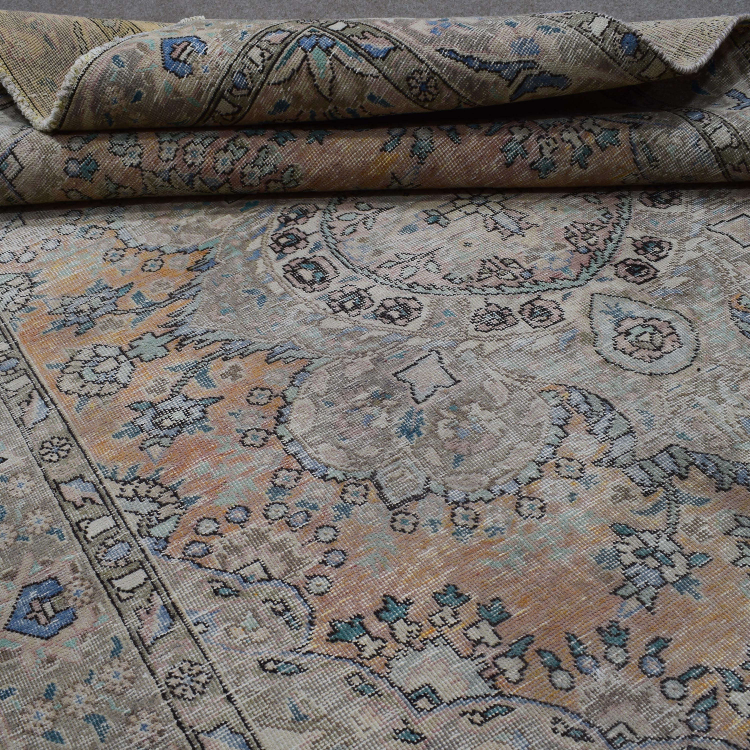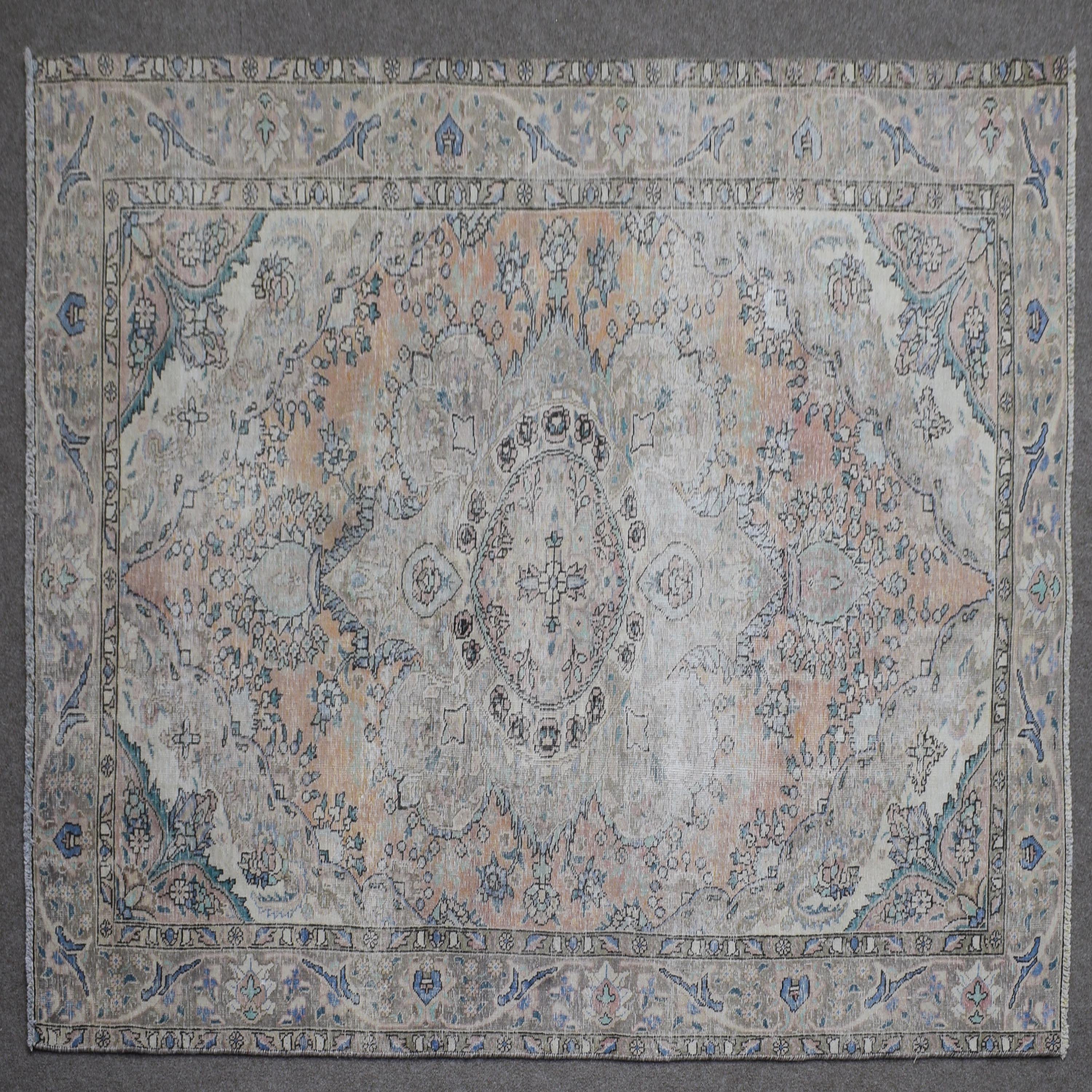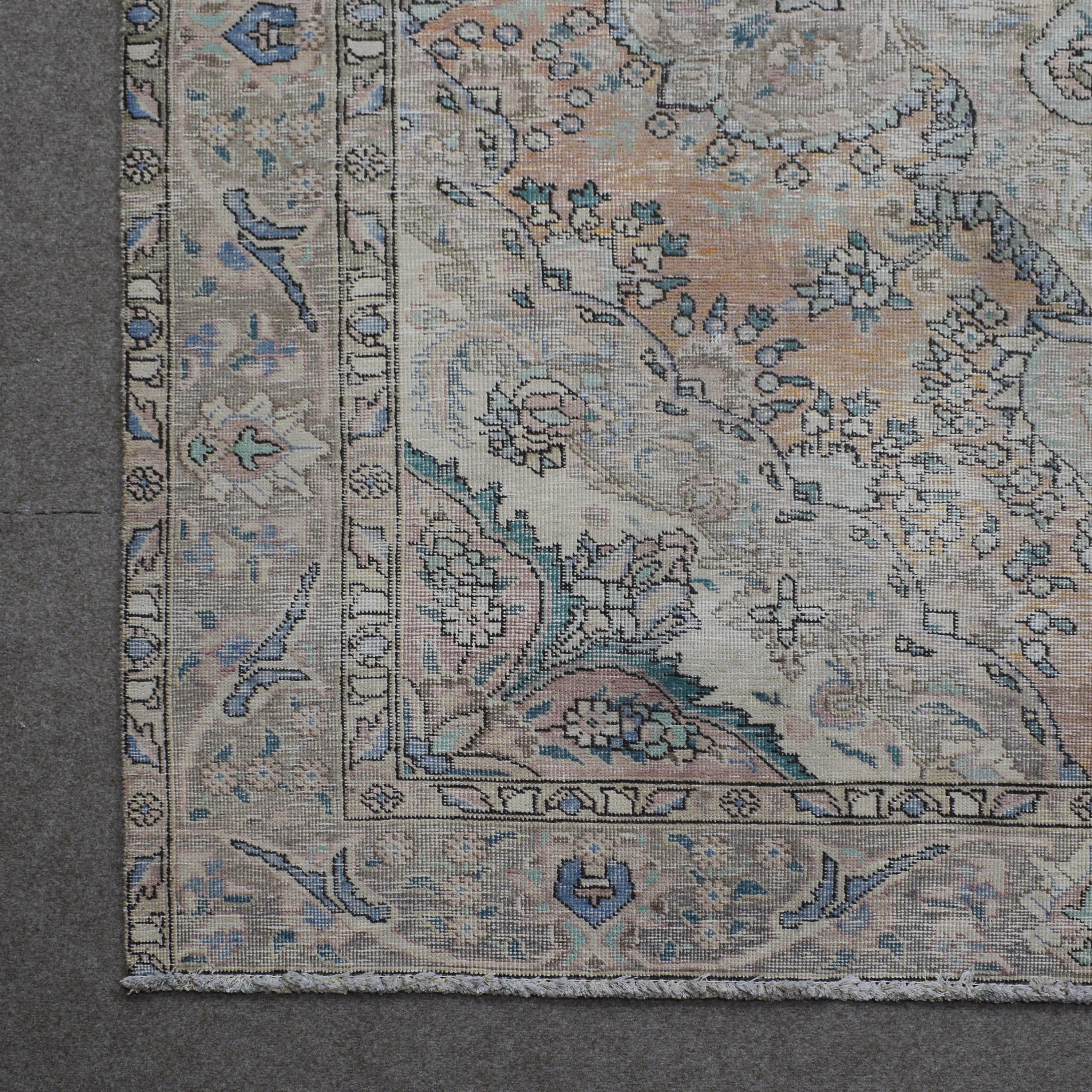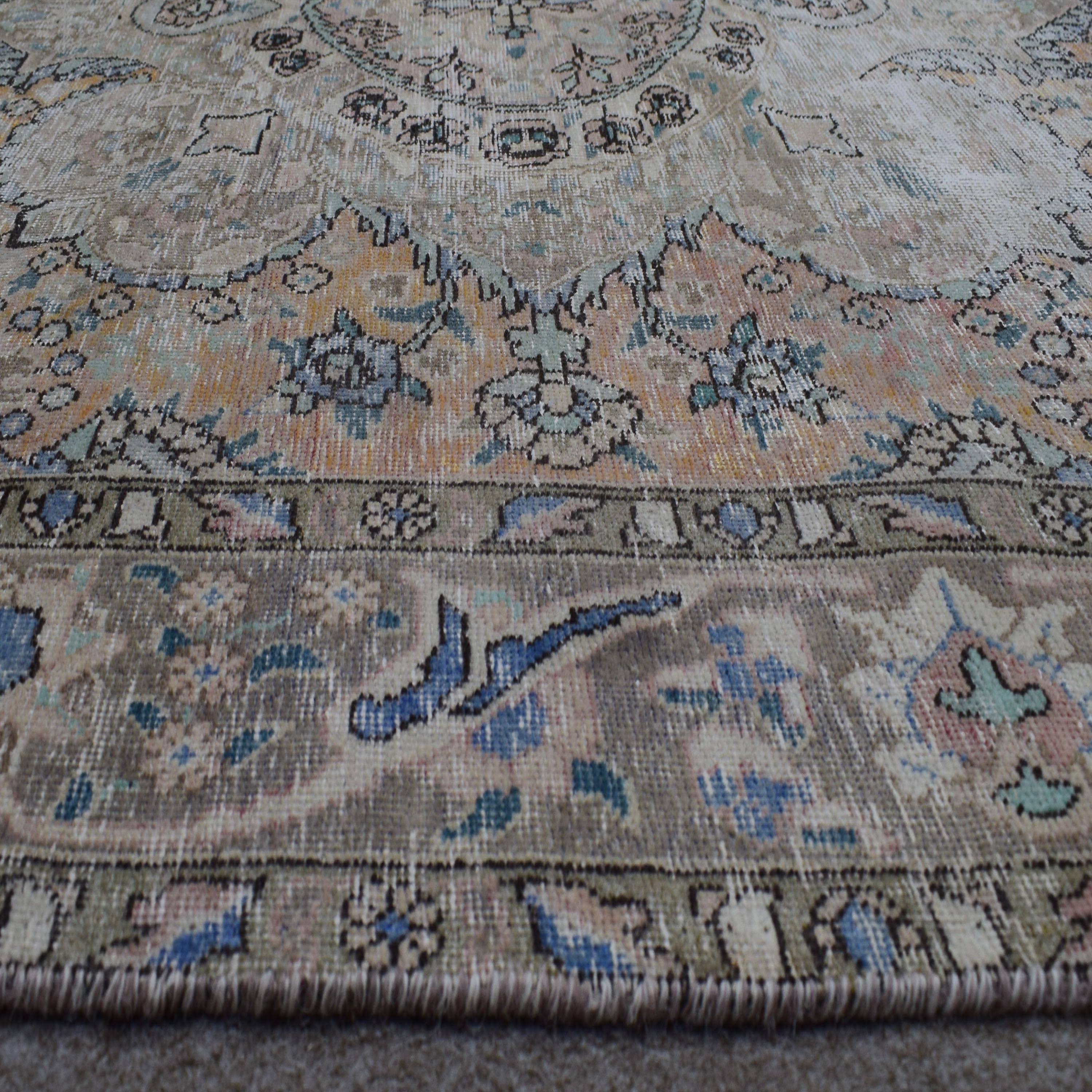 About Distressed Rug: This beautiful rug was hand-woven in 1970's in Tabriz, Iran. Later, this vintage rug has been shaved down to a lower pile to make it a faded rug on purpose. Distressed Rugs represent a trend that has achieved a crossover between fashion and home décor. This new look celebrates rugs that are faded, and worn over time; rugs that nestle into homes as if they’ve always been there. Distressed rugs are shaved rugs so they do not have a soft pile.