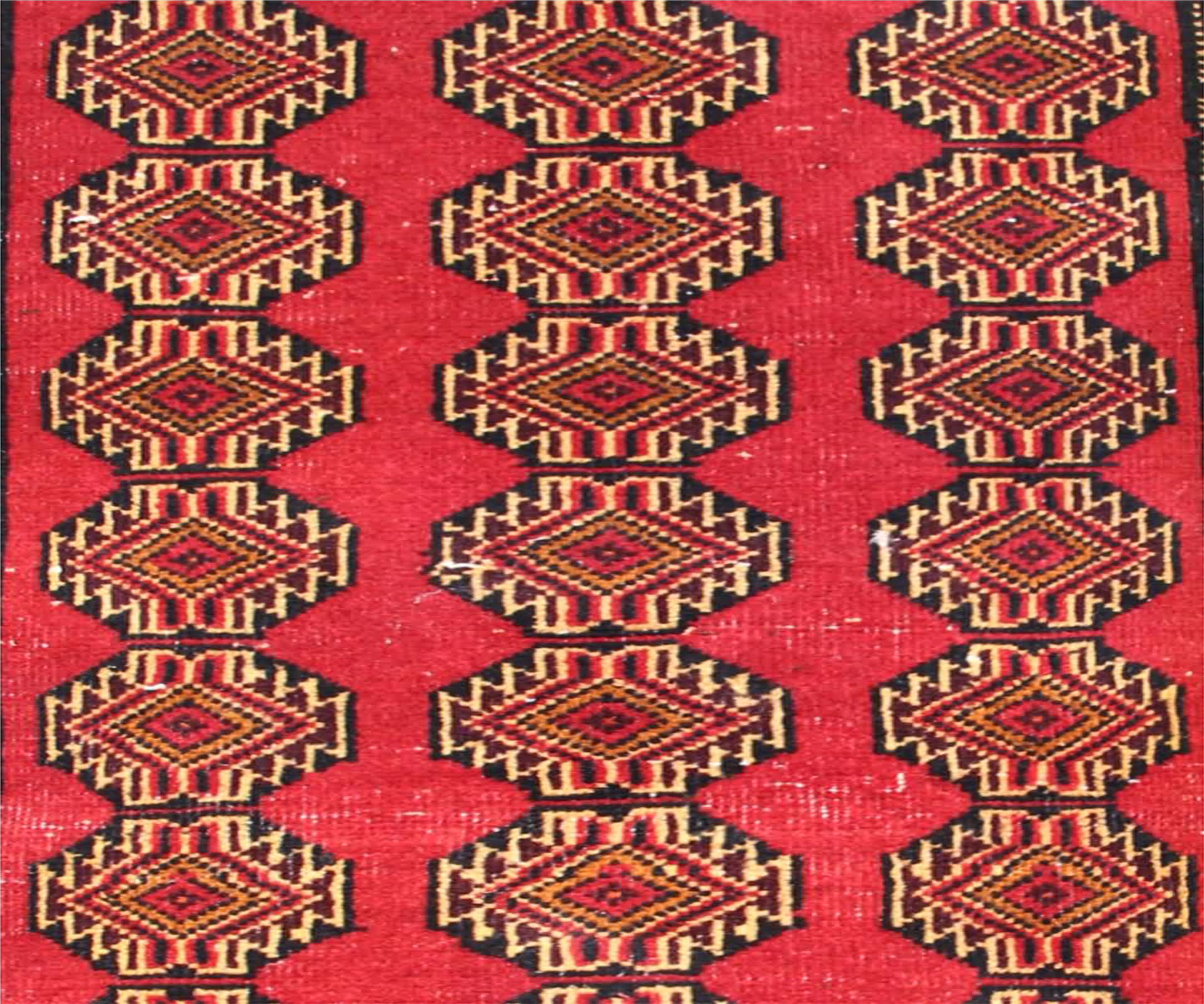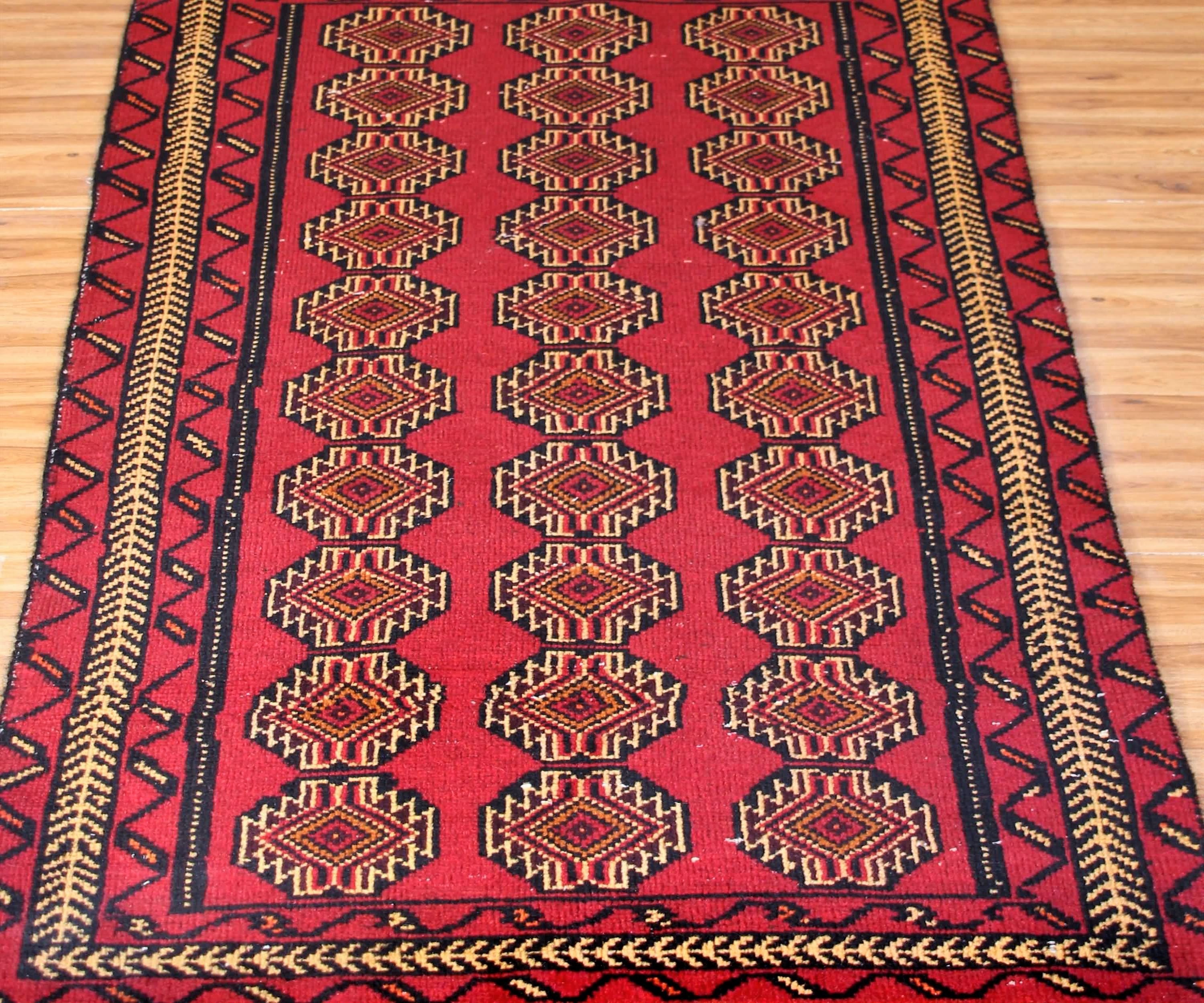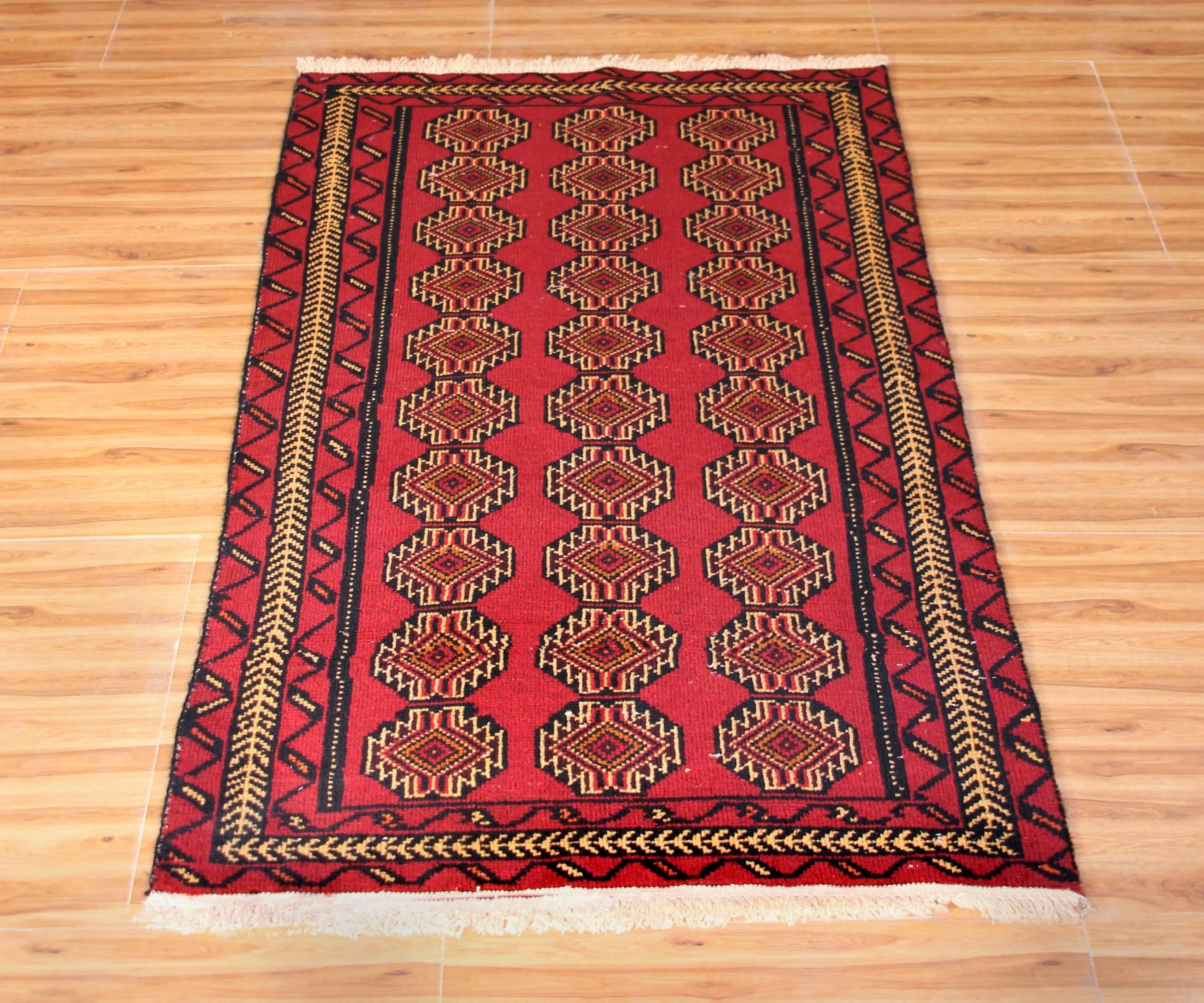 About Persian Baluchi Rug: Baluchi carpets (also called Baluch or Beluchi carpets) are handmade carpets originally made by Baluch nomads, living near the border between Iran, Pakistan and Afghanistan. The carpets are often small with lively patterns, and praying carpets are common. The dominating colors are red, brown, and dark blue. The warp is made of wool or a mixture of wool and goat hair which makes them extremely hard wearing rugs.