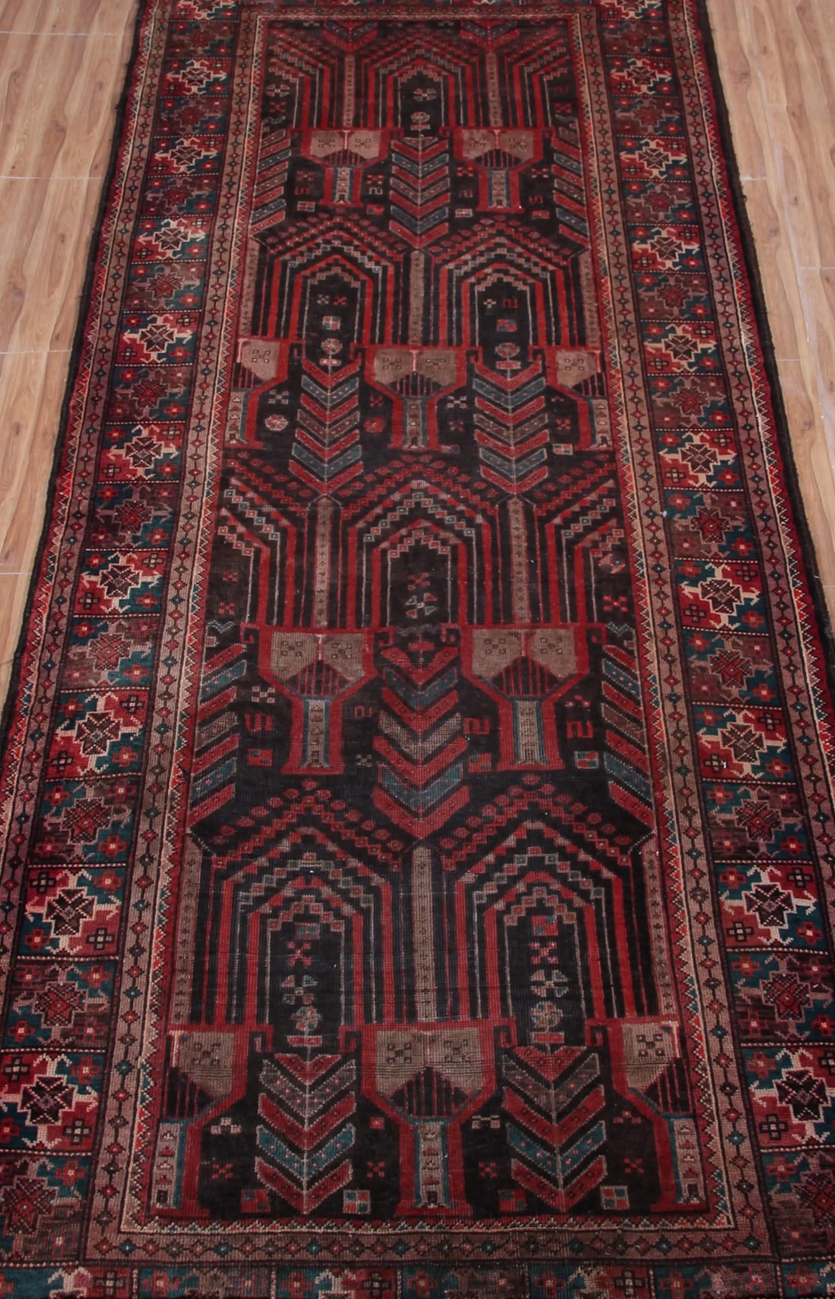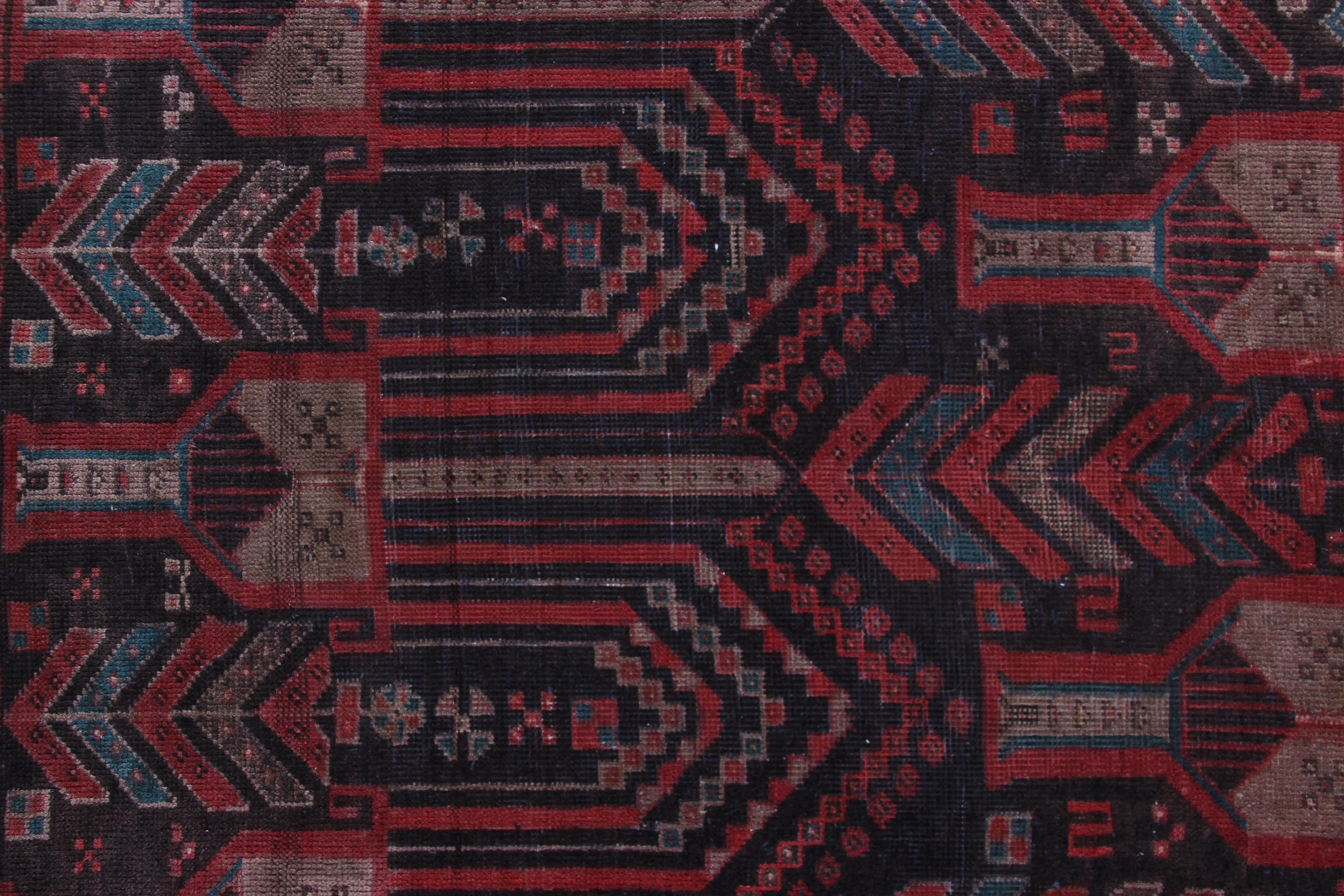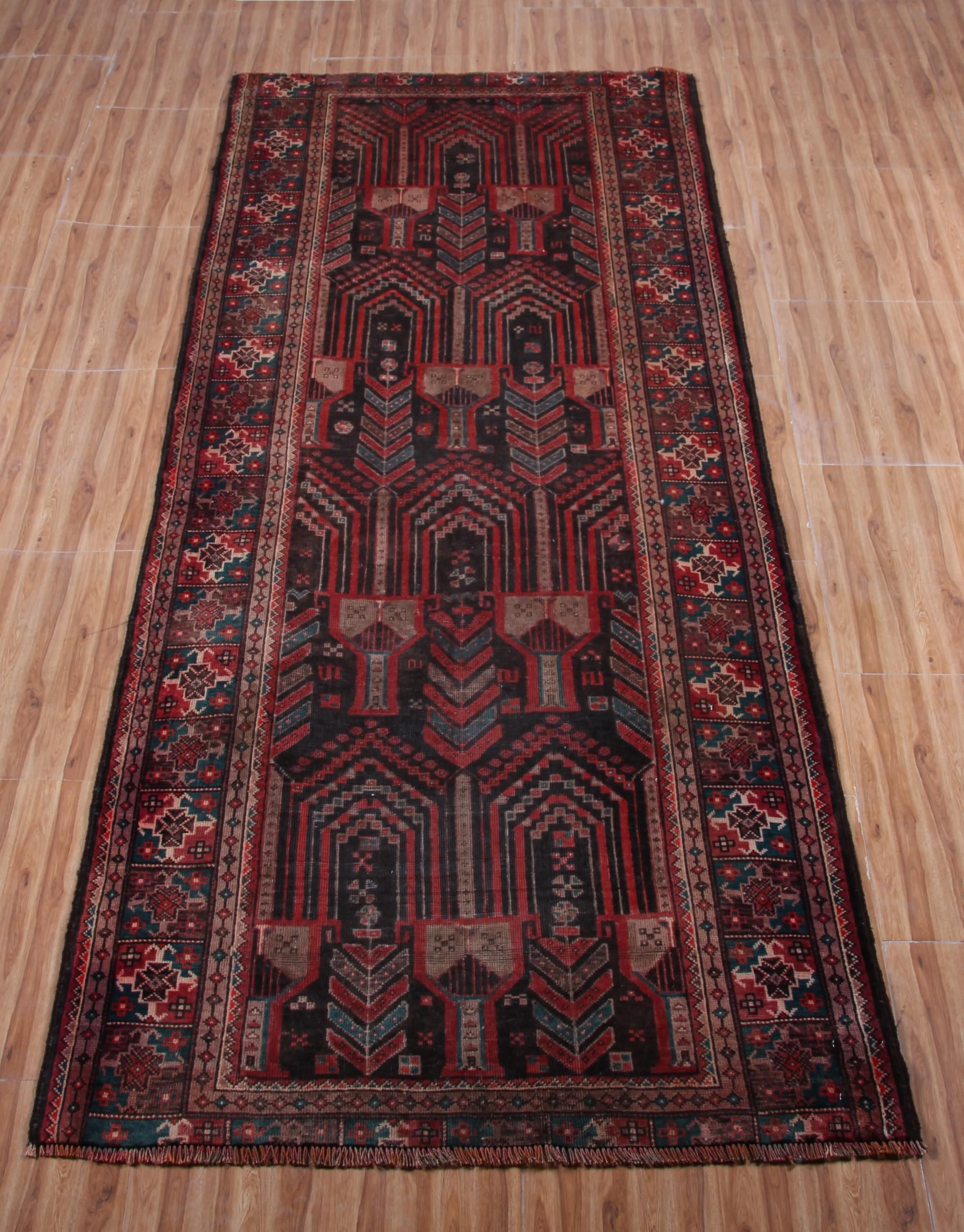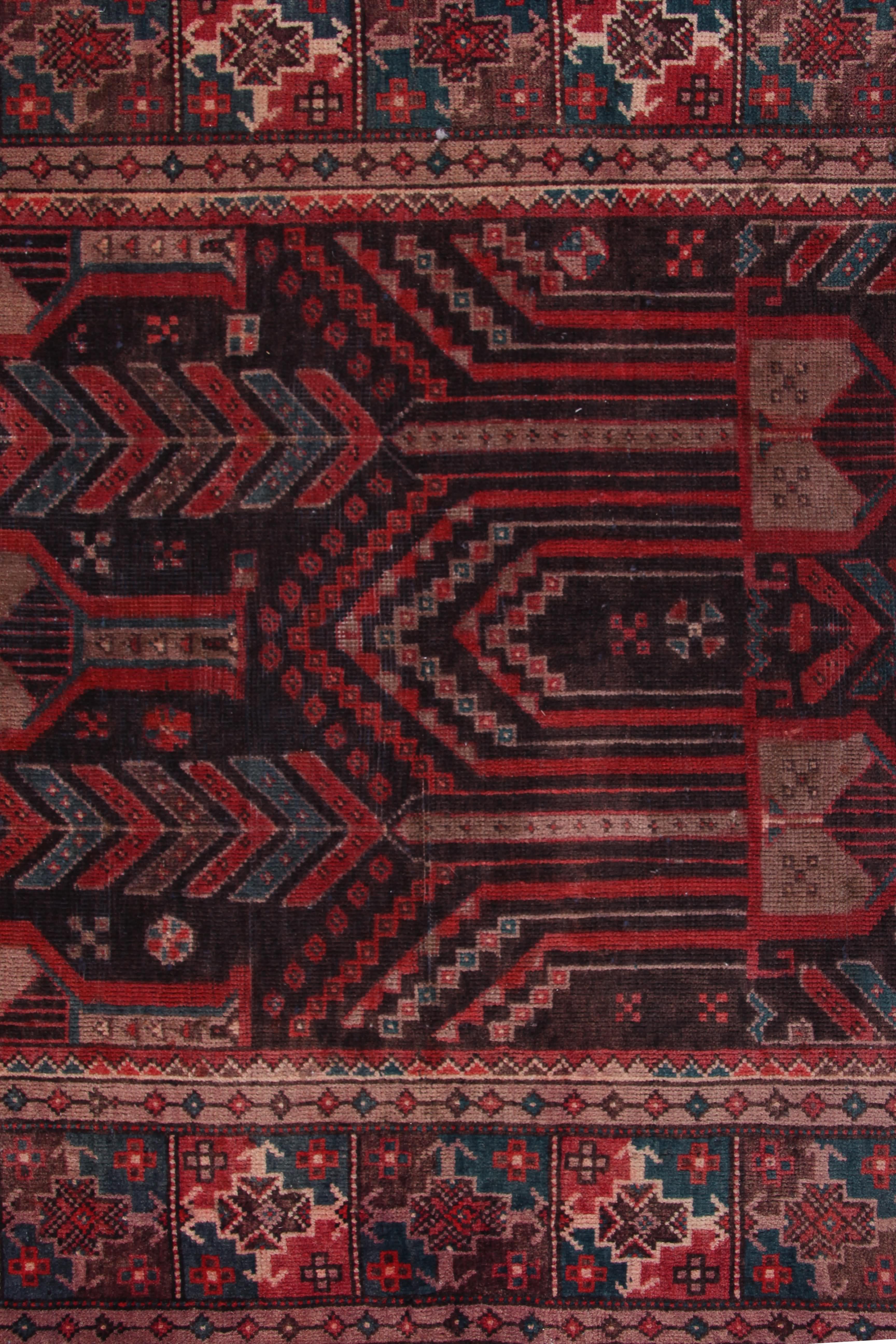 About Persian Baluchi Rug: Baluchi carpets (also called Baluch or Beluchi carpets) are handmade carpets originally made by Baluch nomads, living near the border between Iran, Pakistan and Afghanistan. The carpets are often small with lively patterns, and praying carpets are common. The dominating colors are red, brown, and dark blue. The warp is made of wool or a mixture of wool and goat hair which makes them extremely hard wearing rugs.