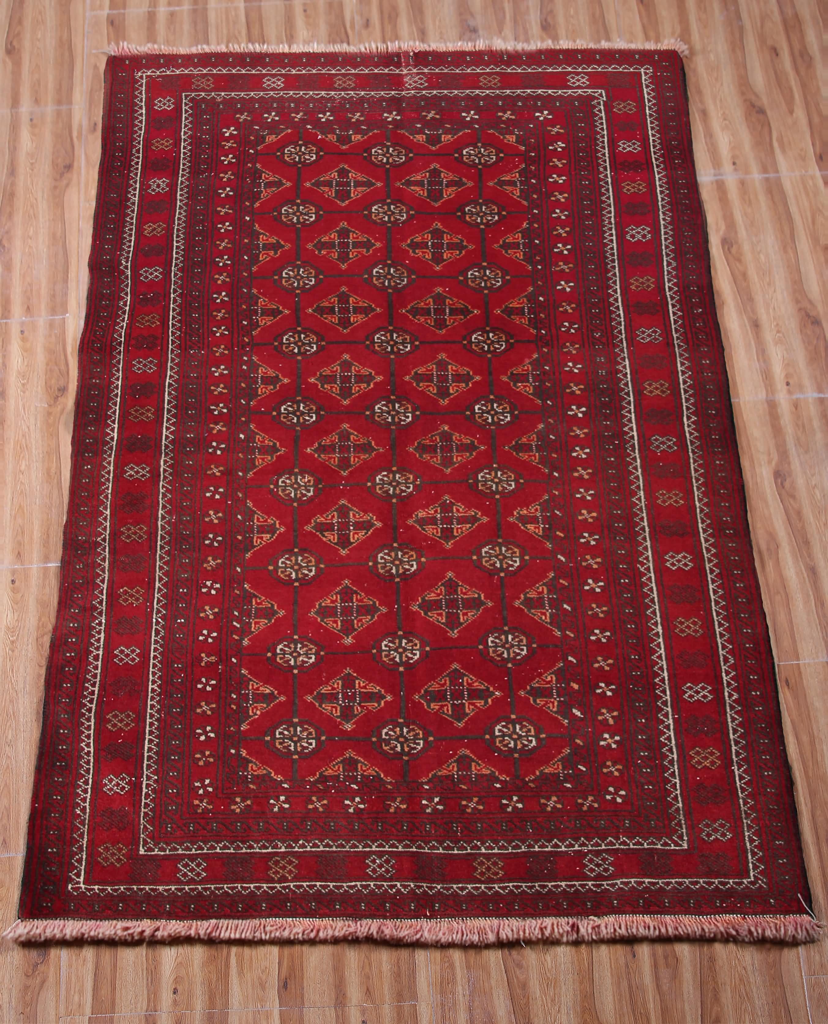 About Persian Baluchi Rug: Baluchi carpets (also called Baluch or Beluchi carpets) are handmade carpets originally made by Baluch nomads, living near the border between Iran, Pakistan and Afghanistan. The carpets are often small with lively patterns, and praying carpets are common. The dominating colors are red, brown, and dark blue. The warp is made of wool or a mixture of wool and goat hair which makes them extremely hard wearing rugs.
