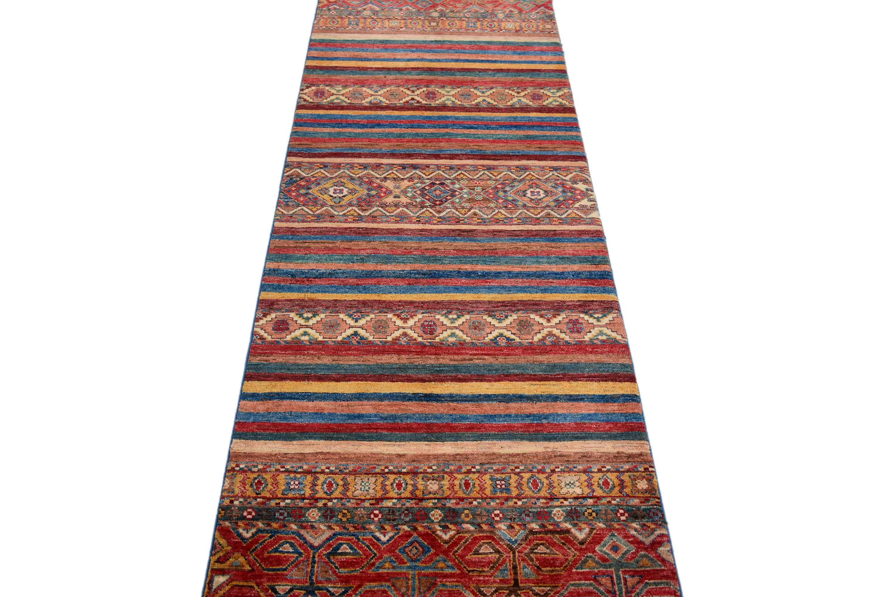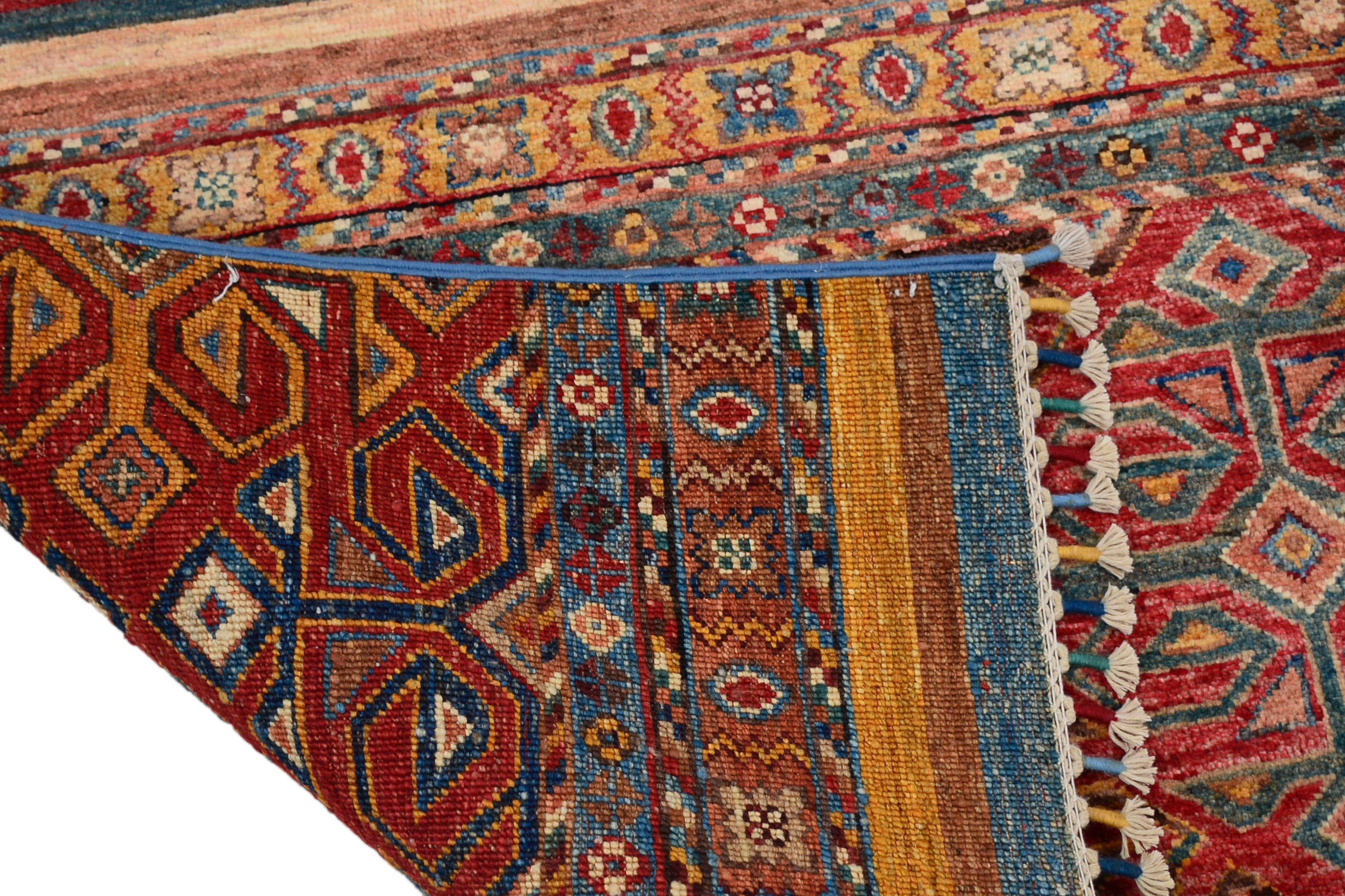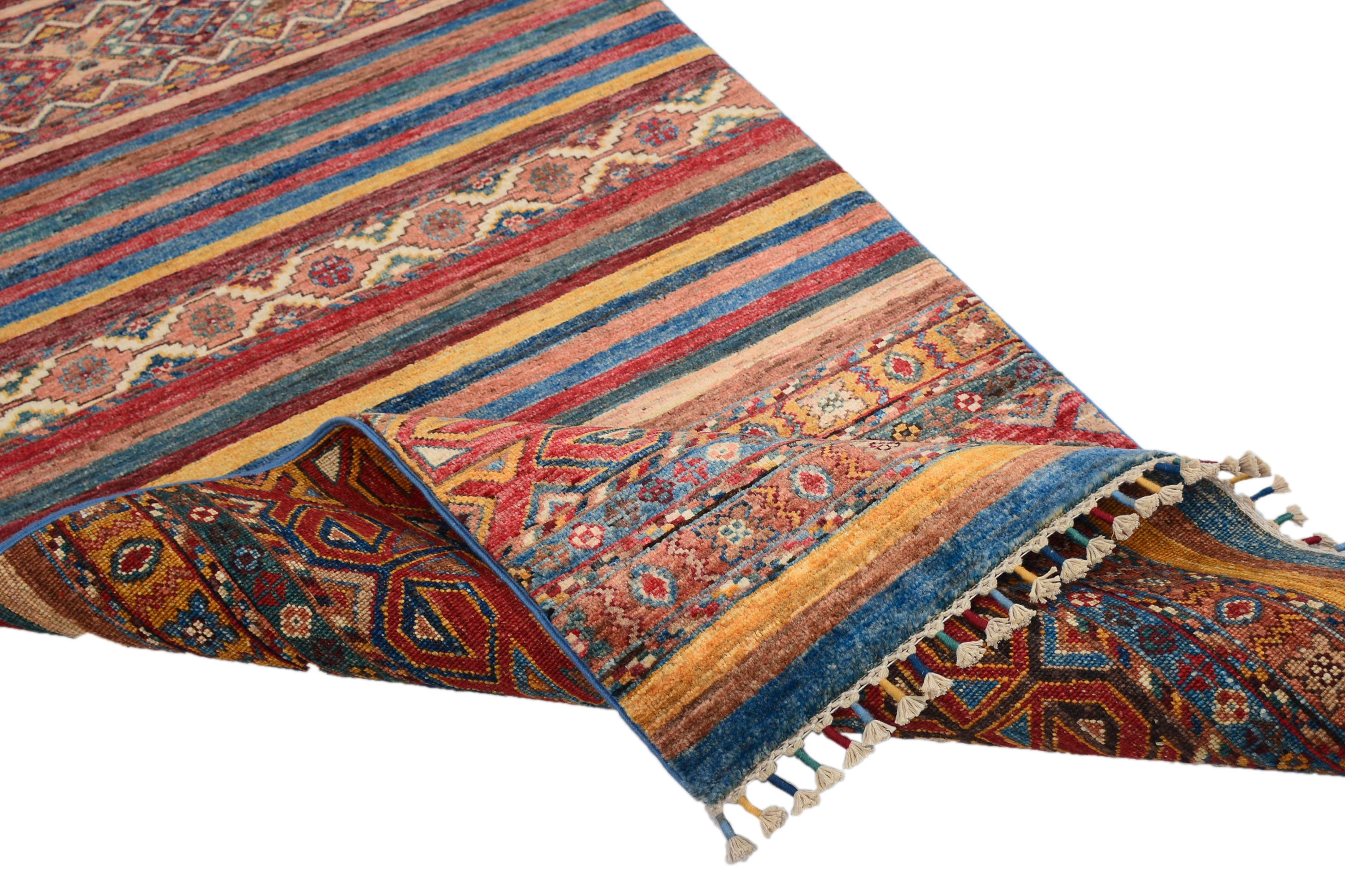 About Khorjin Rug: This elegant rug has been hand-knotted in the Northern mountainous regions of Afghanistan. Skilled Afghan weavers produce these colourful hand-knotted pile carpets with hand-spun wool. The designs are modelled on antique tribal camel bags or “Khorjin” from Anatolian villages. This beautiful rug is woven on a strong cotton warp and weft. These rugs are multi-coloured in warm, bright, and happy tones these rugs bring life to any interior and are particularly popular in modern settings.