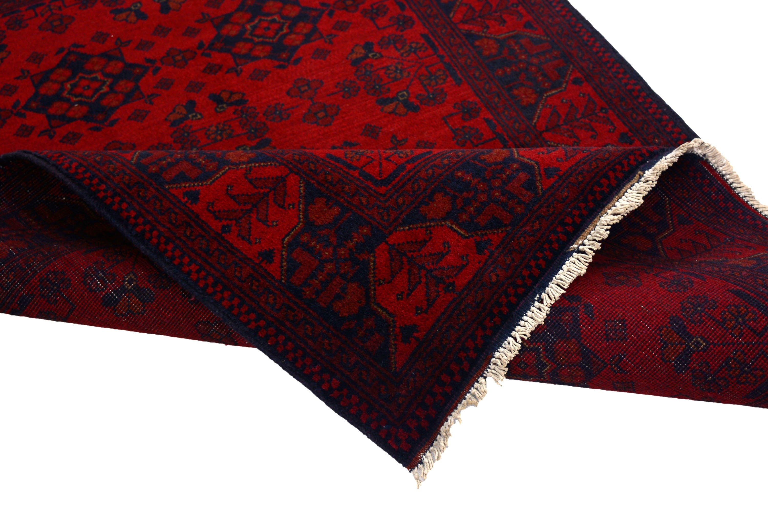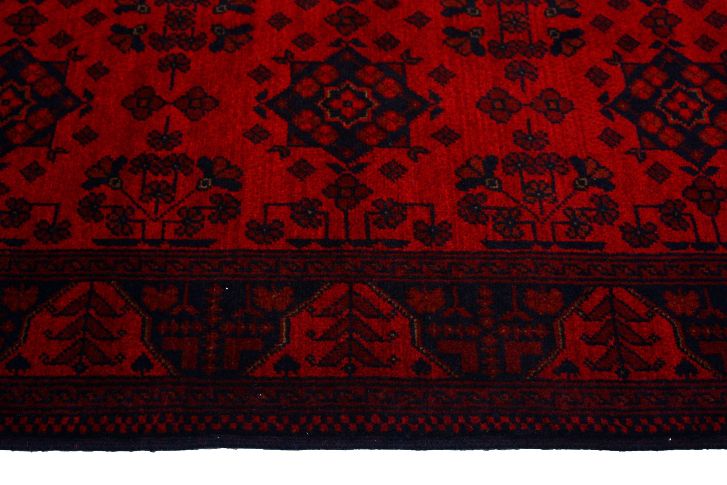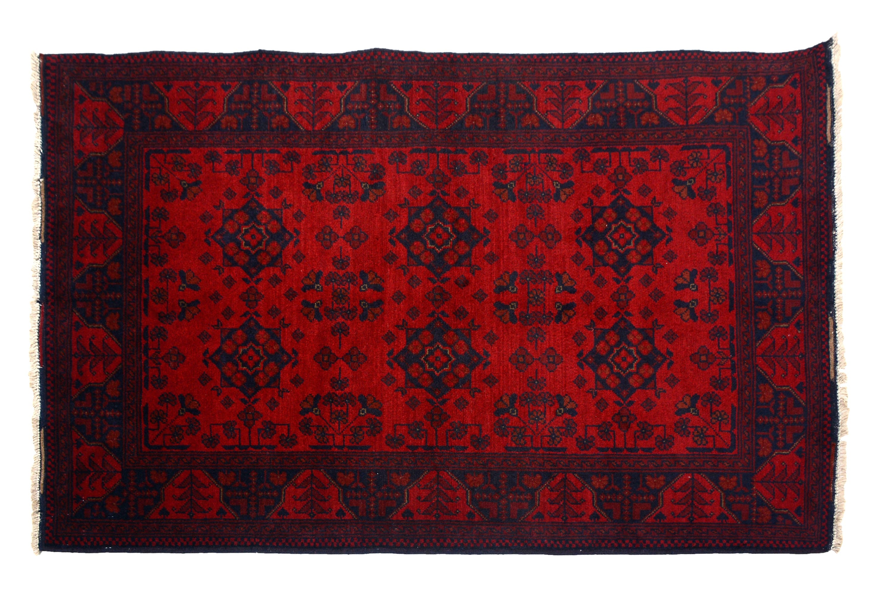 About Khal Mohammadi Rug: This beautiful rug has been hand-knotted in or around the town of Kunduz in the north of Afghanistan. Khal Mohammadi rugs are named after their creator, who developed the deep red tones that characterise this style. This rug is made using high-quality wool sourced from local Afghan sheep, known for its durability and natural sheen. This wool is hand-spun, adding a distinctive texture and character to each rug. Khal Mohammadi rugs often feature geometric patterns, stylised floral motifs, and elements inspired by nature.