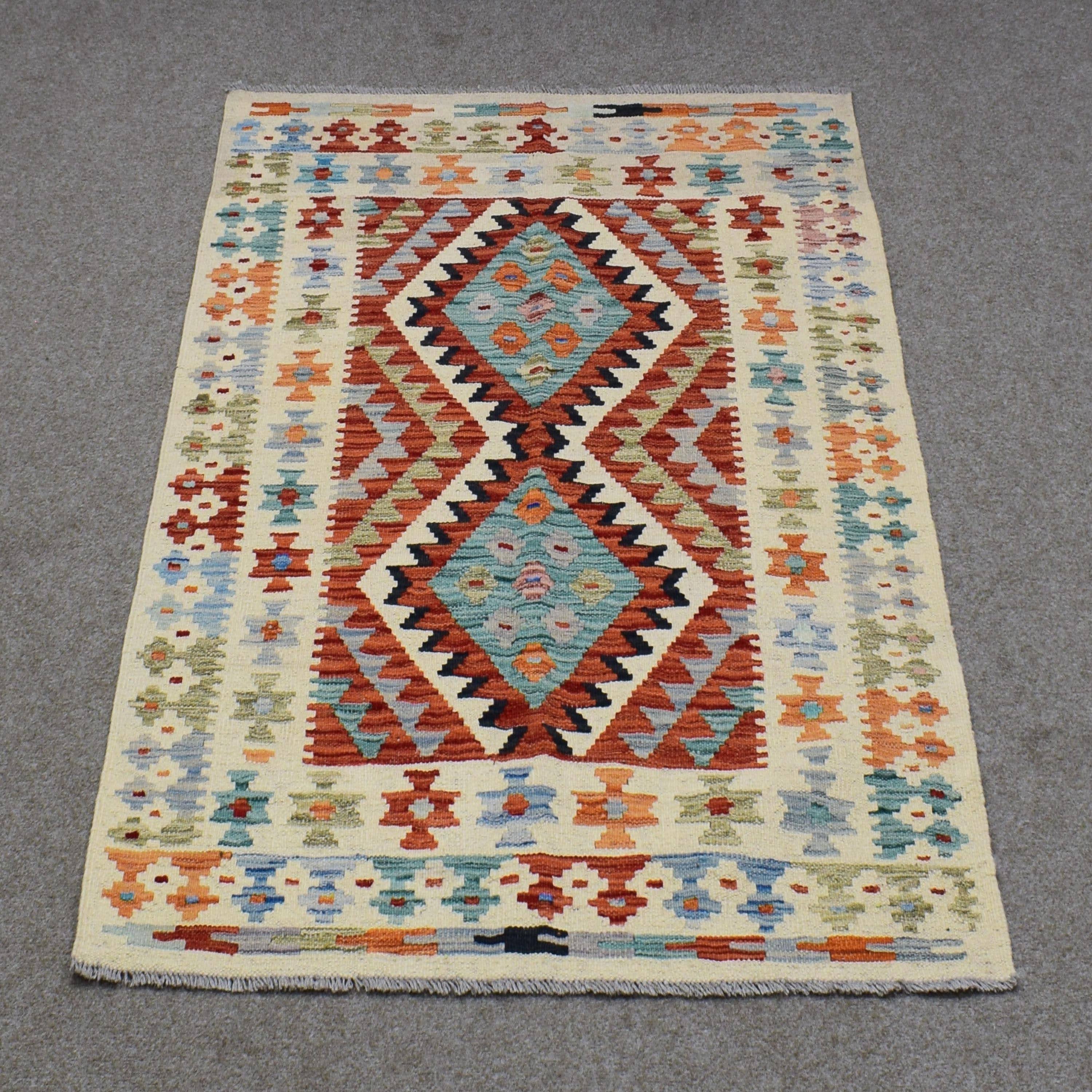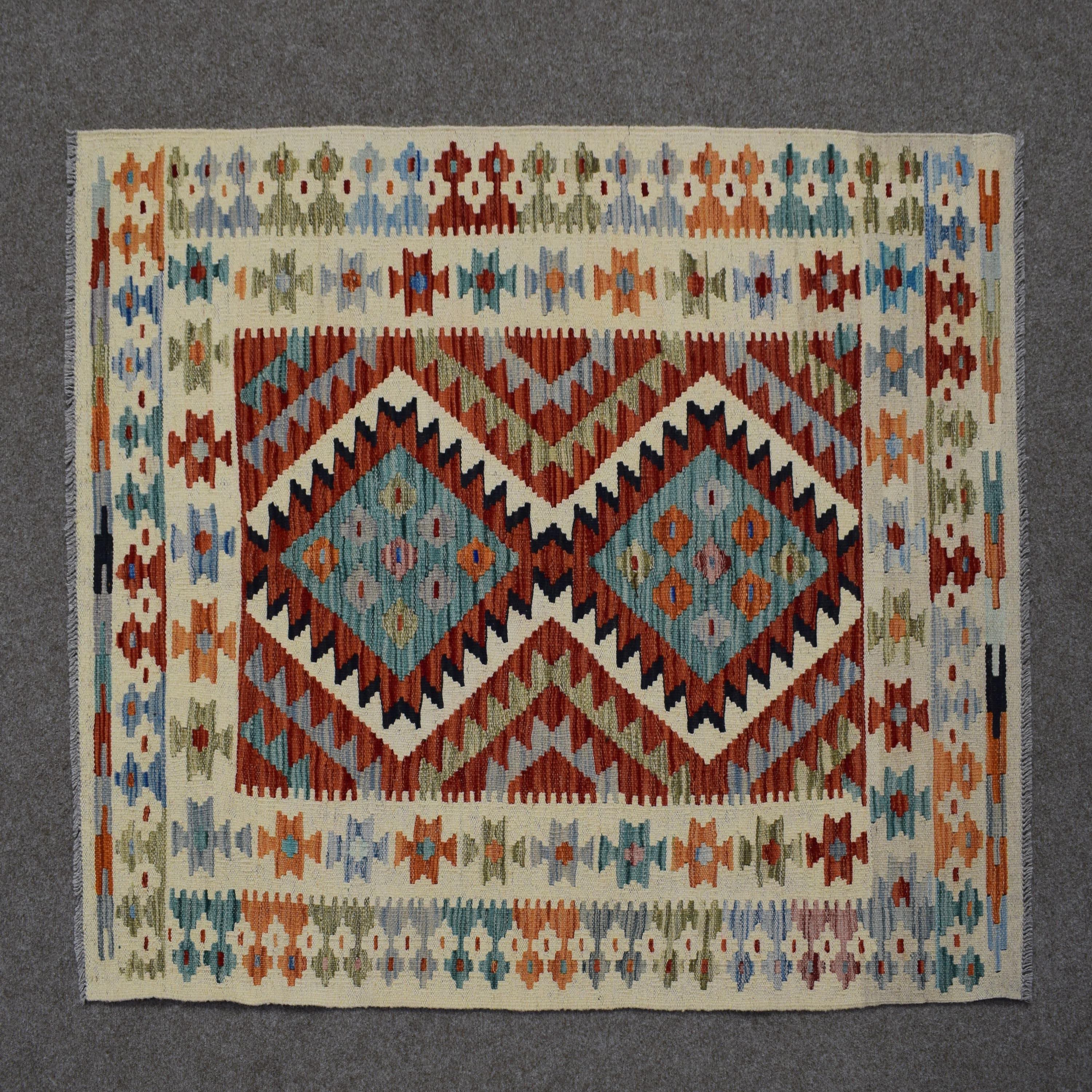 This is a highly popular, intricately-flat woven Kilim from the Turkoman tribes of Maimana region of Faryab, Afghanistan, known for their design, quality and workmanship. This Kilim is woven from 100% wool incorporating vegetable dyes.