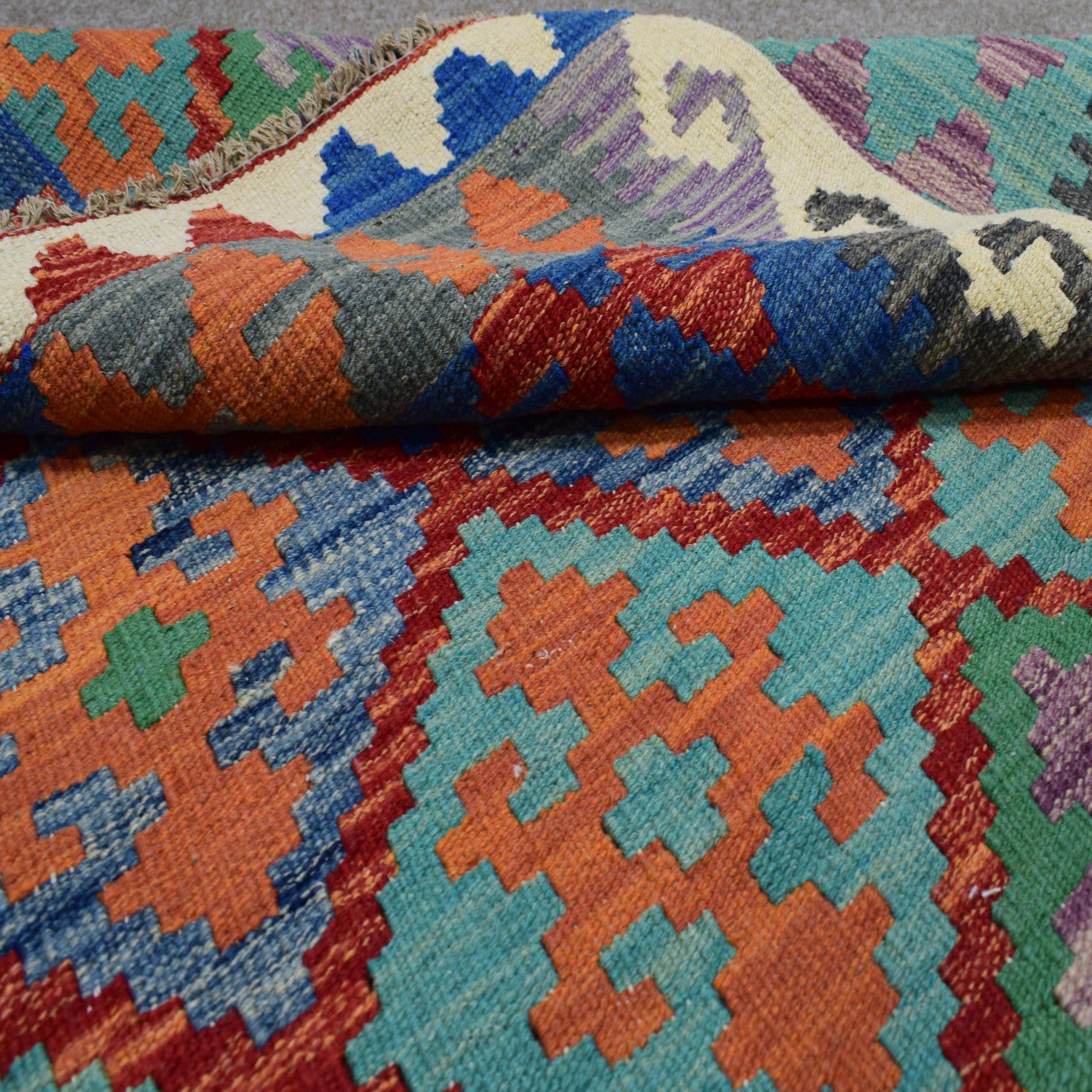 About Chobi Kilim: The word kilim simply means a flat woven rug, or rug without a knotted pile. Kilims are not knotted, instead the thread or yarn is woven in a flat manner on the warp strings, so they don’t have a pile which means you can use both sides.
