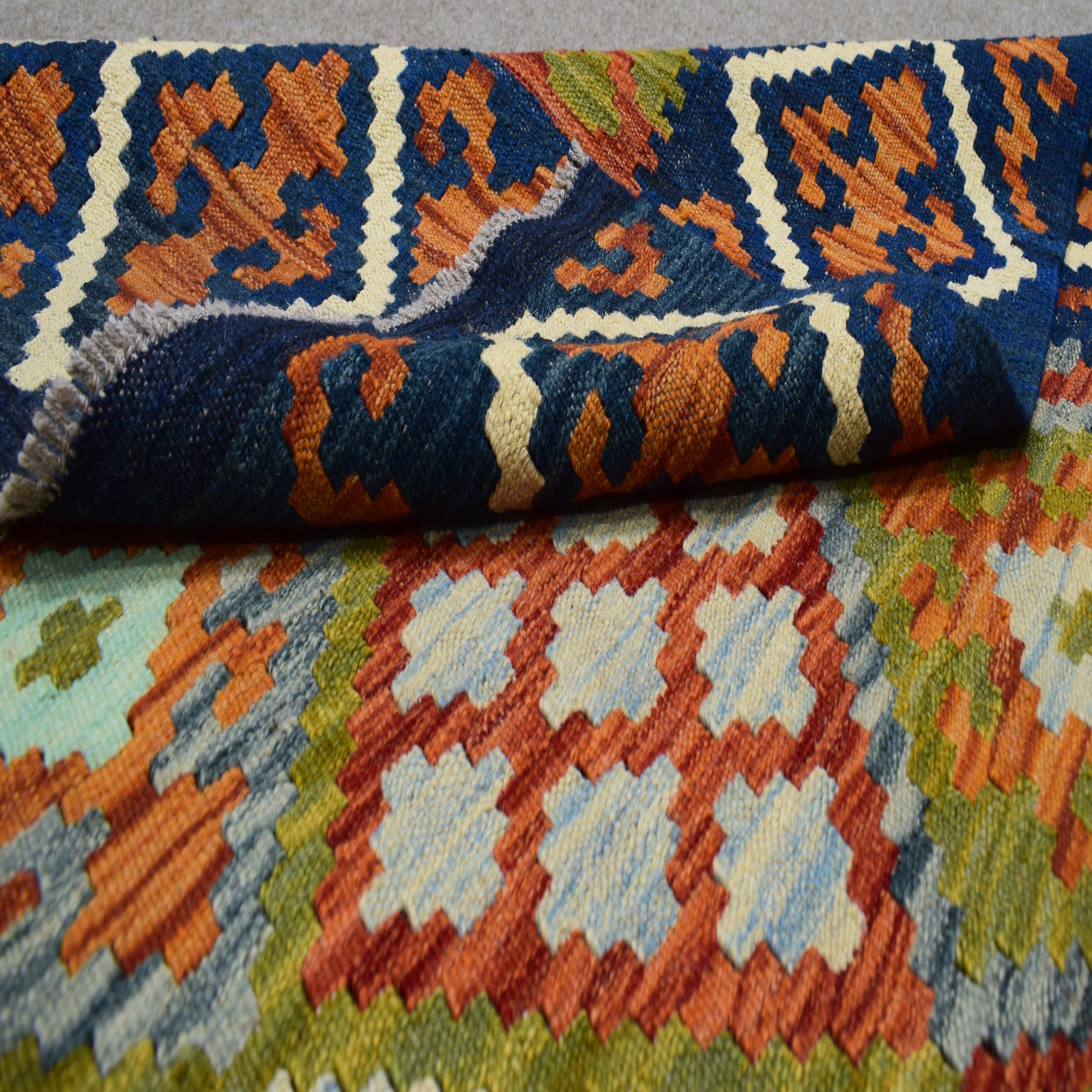 About Chobi Kilim: The word kilim simply means a flat woven rug, or rug without a knotted pile. Kilims are not knotted, instead the thread or yarn is woven in a flat manner on the warp strings, so they don’t have a pile which means you can use both sides.