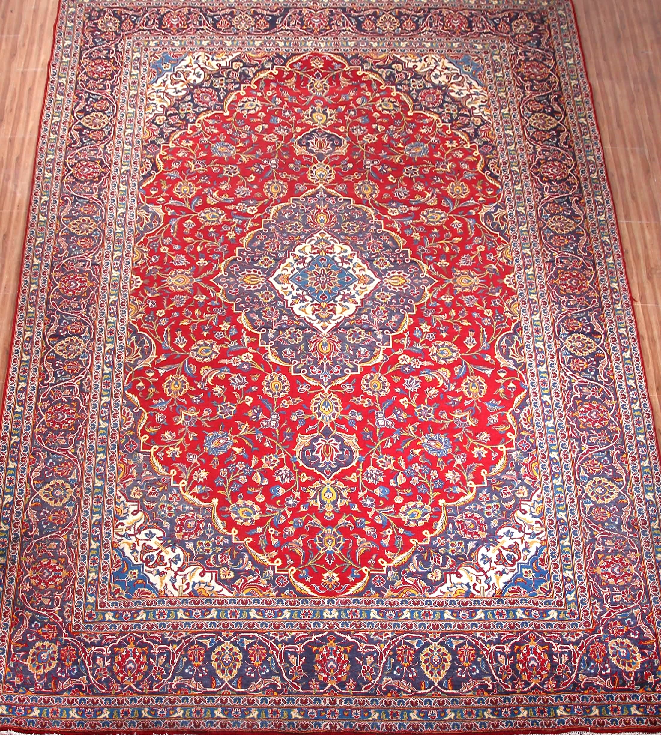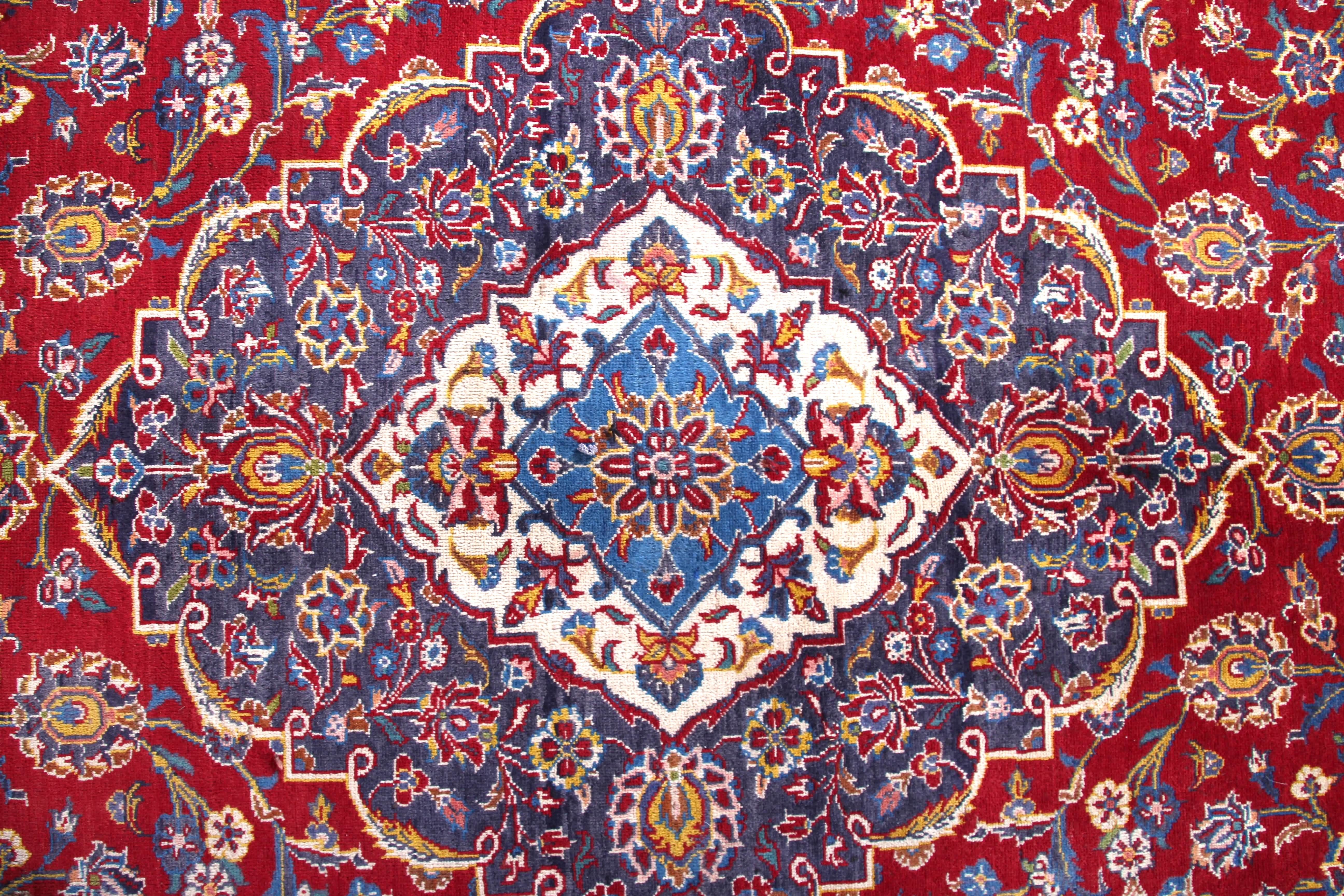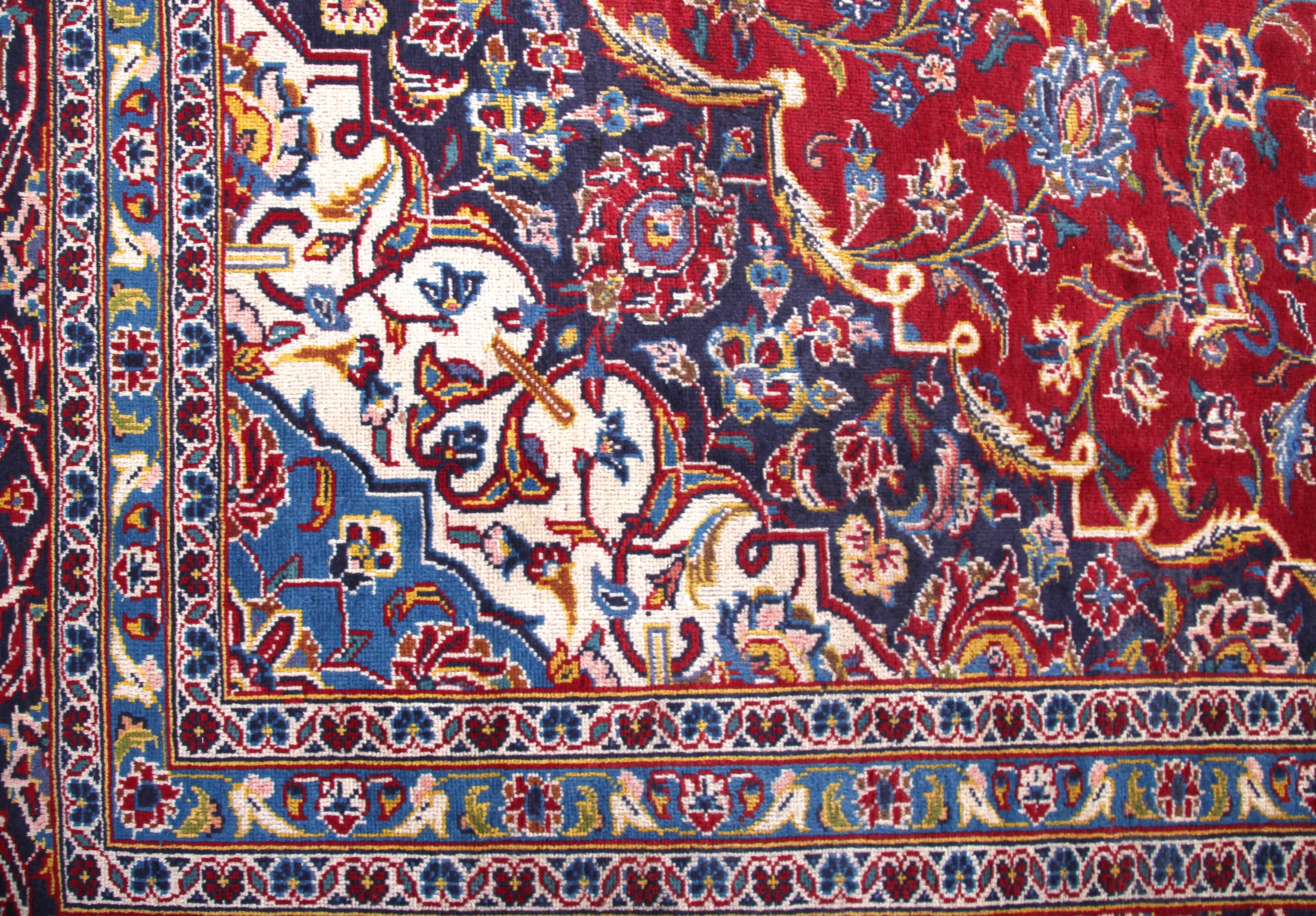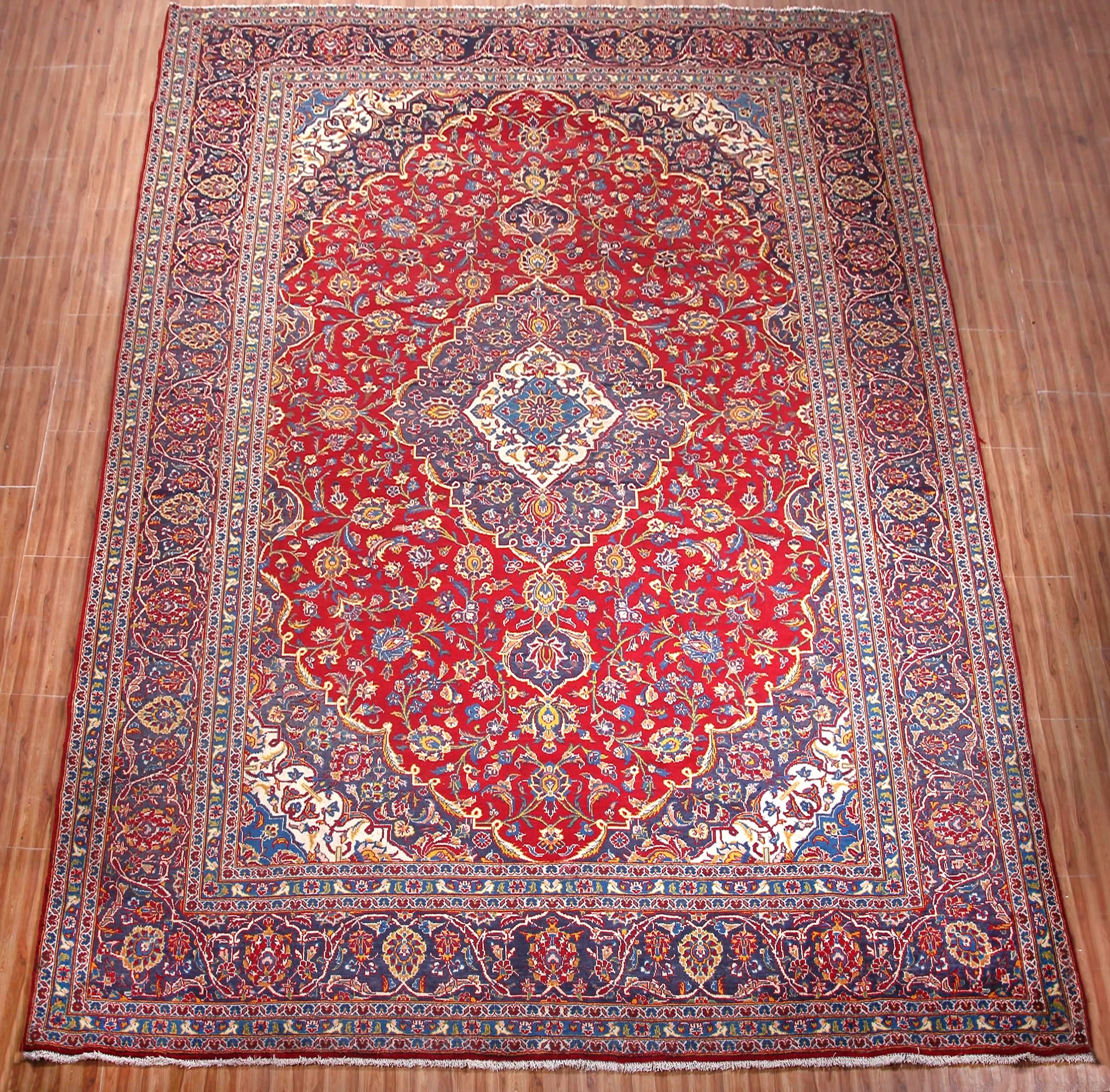 About Persian Kashan Rug: This beautiful rug was hand-woven in Kashan, Iran. Kashan carpets are mostly knotted from incredibly good wool. Warp and weft are usually made of cotton and the pile is made of high-quality sheep's wool. The dense knotting with Persian knots creates carpets that owners will enjoy for a long time. Typical knot density of Kashan rug can be 100,000 – 400,000 sqm.