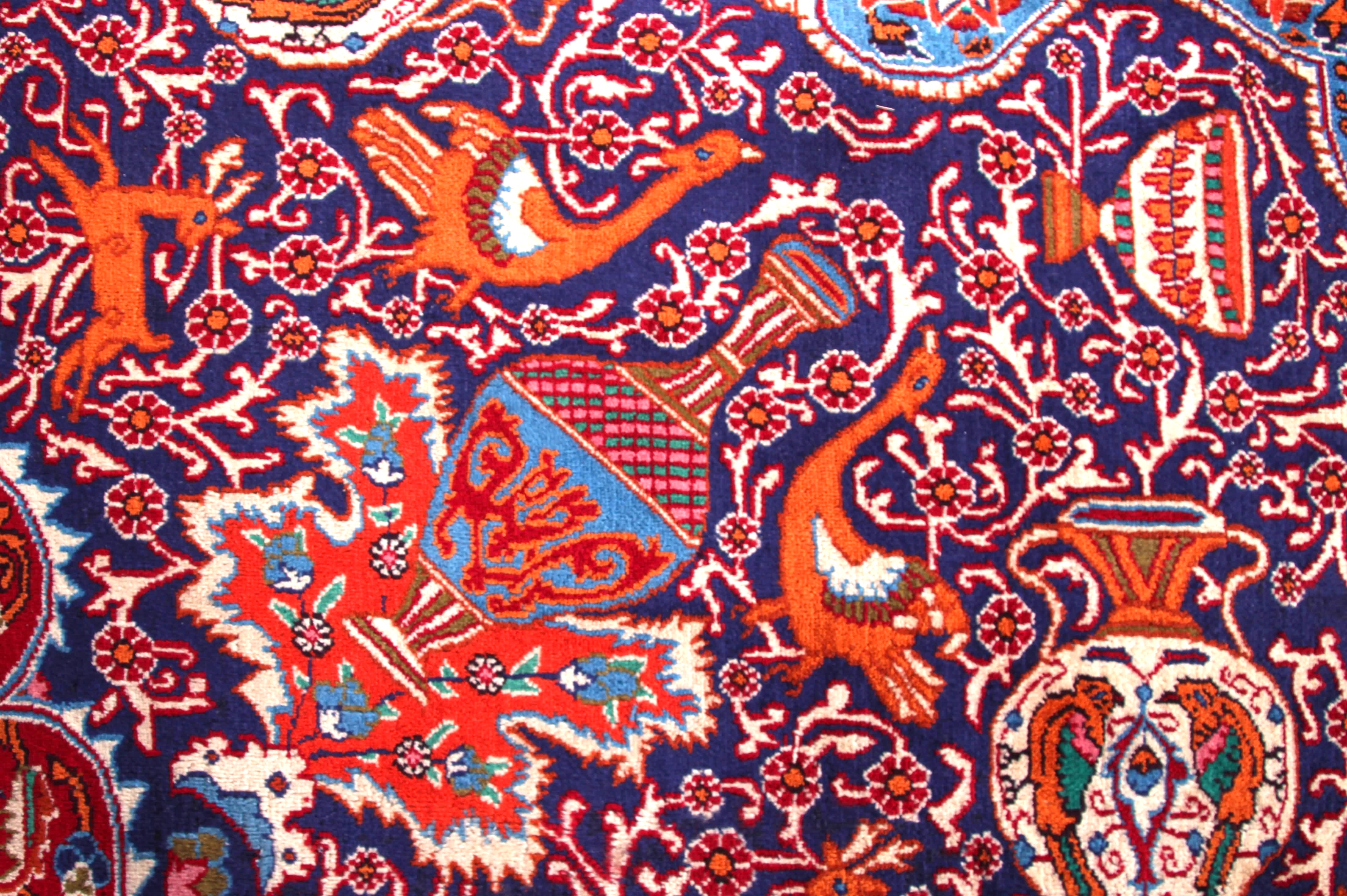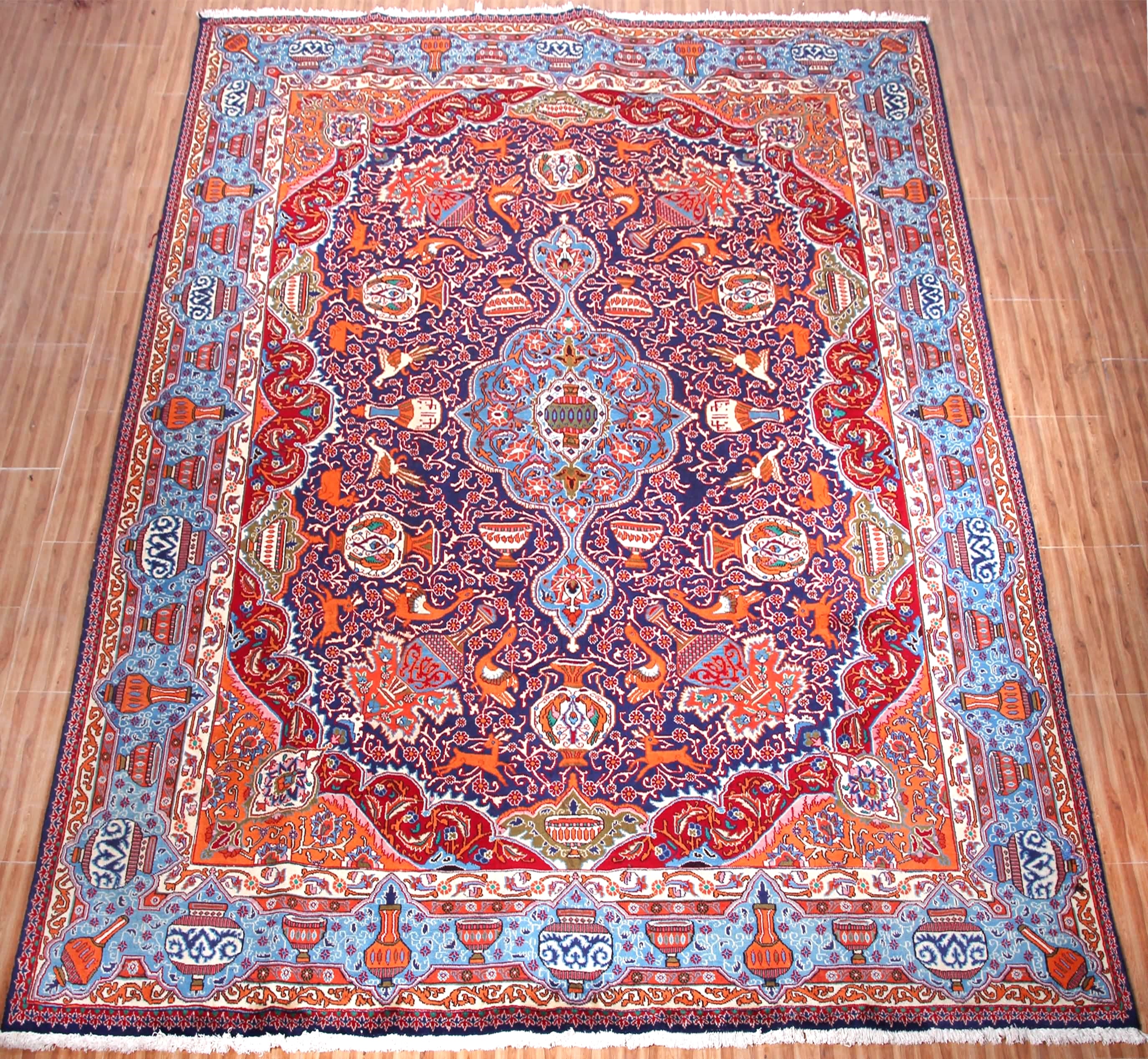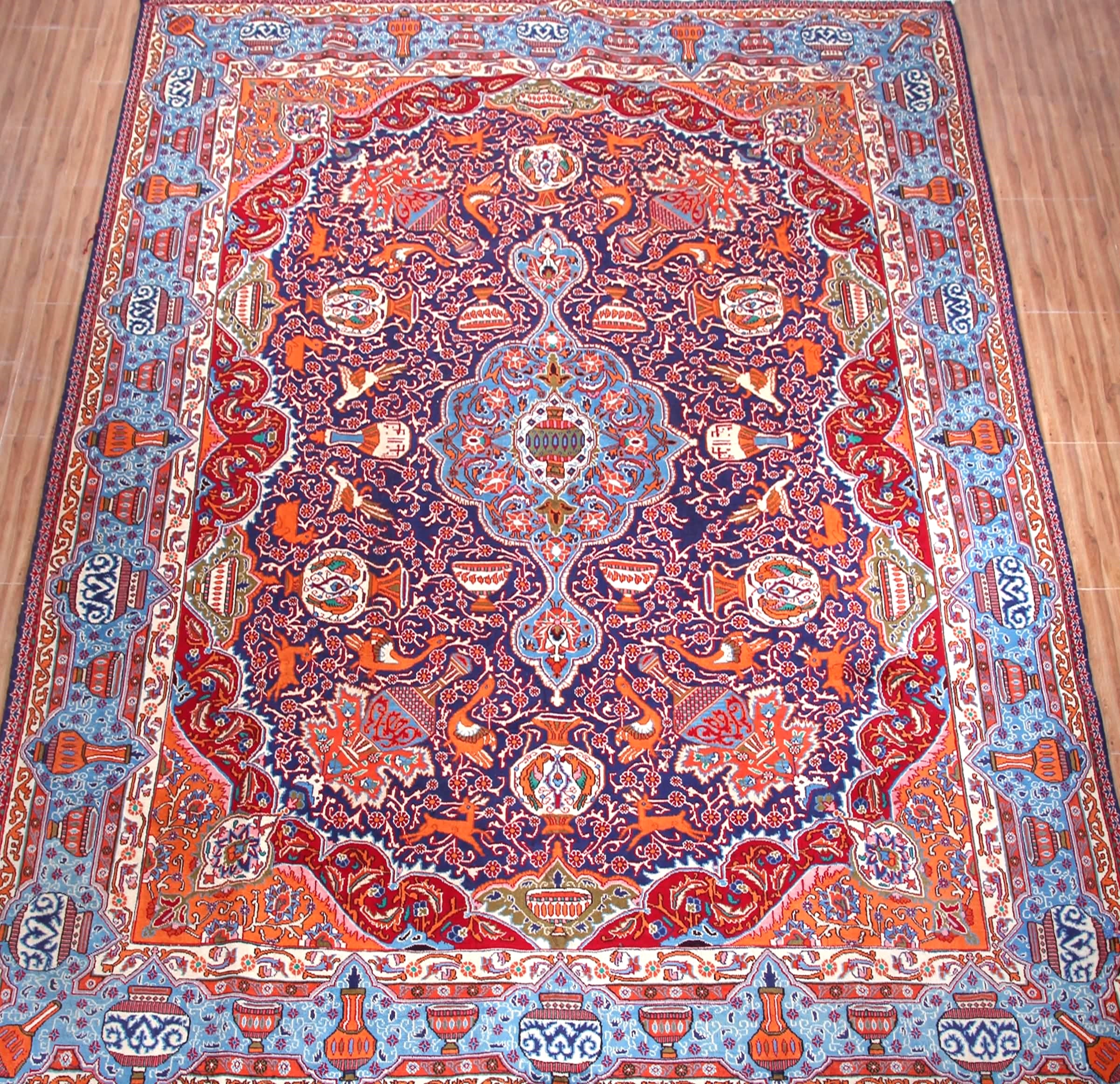 About Persian Kashmar Rug: Kashmar rugs are highly detailed, many are very rare and valuable pieces, woven in the Khorosan province in the east of Iran. Kashmar rugs are very durable, composed mostly of wool and cotton. The wool is very soft and therefore the rug is very velvety to the touch. Kashmars usually depict the stories of important events in the Persian history.