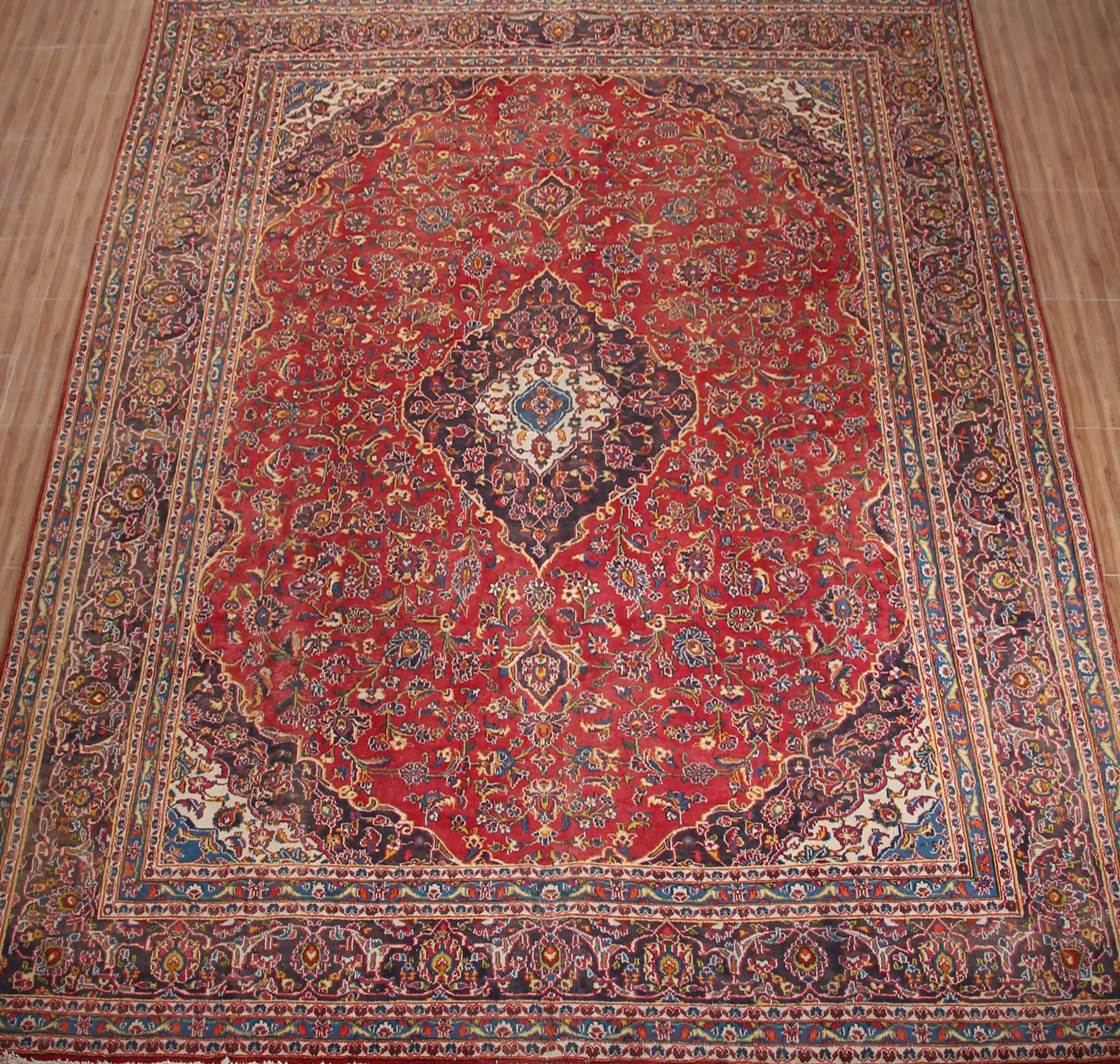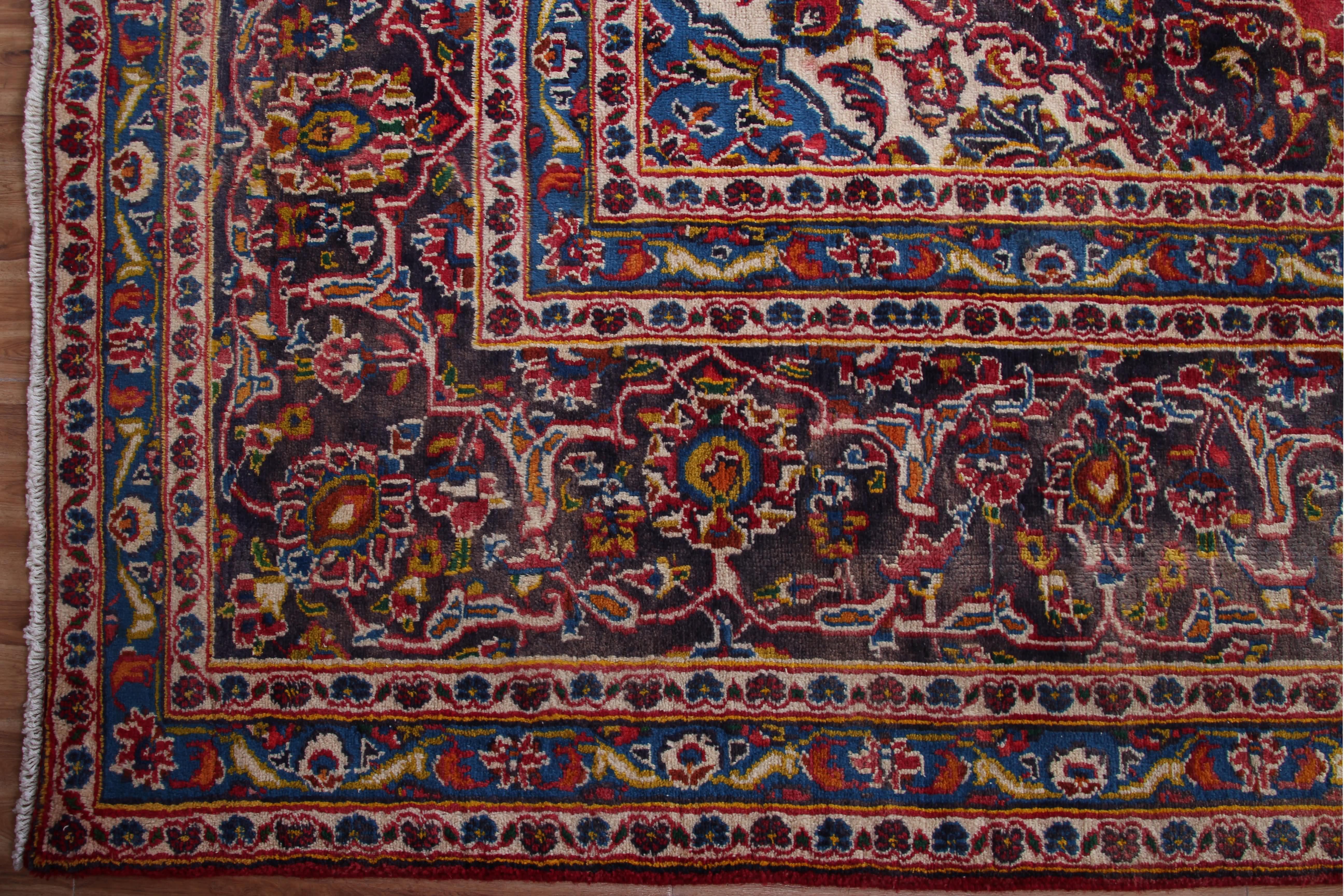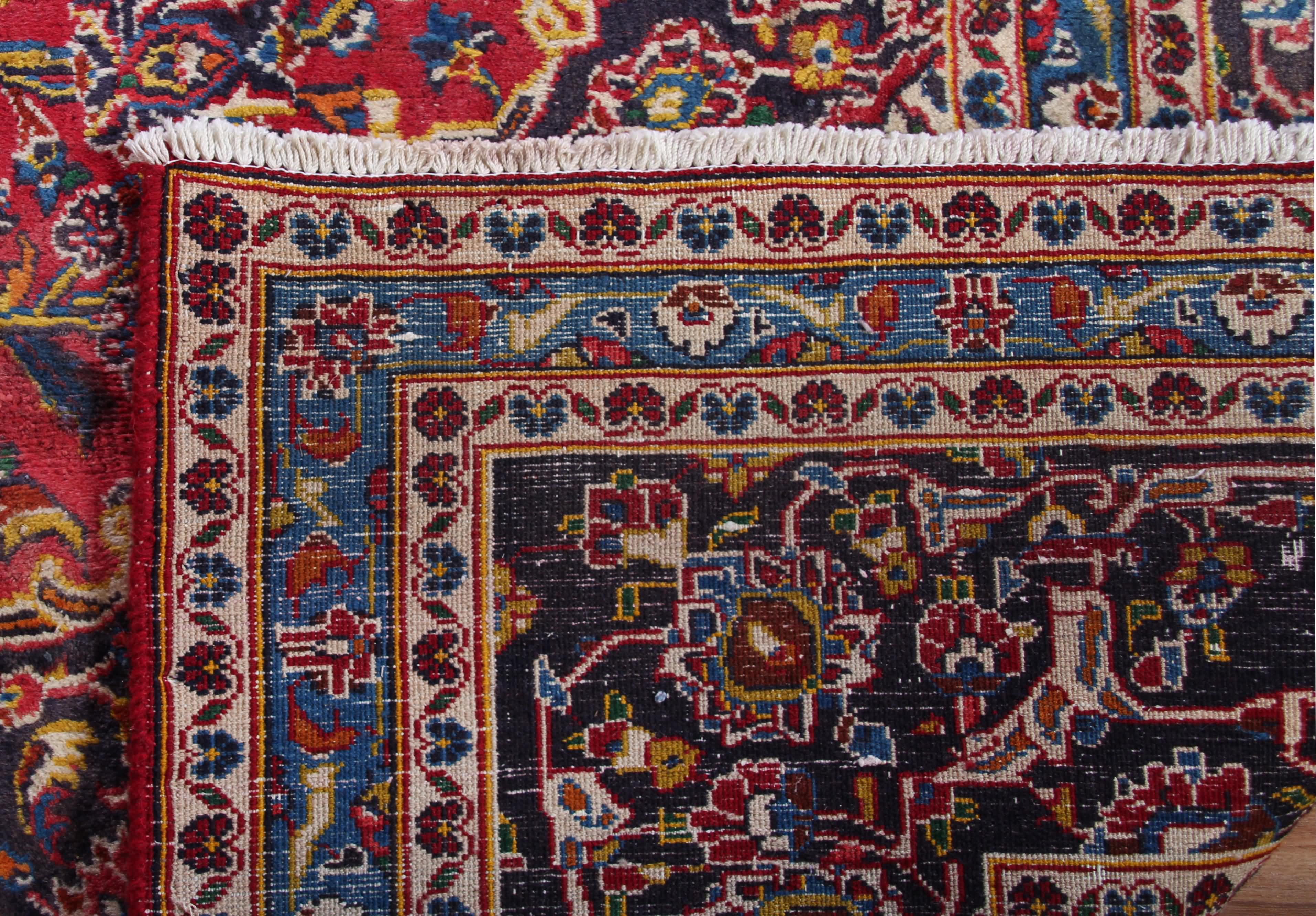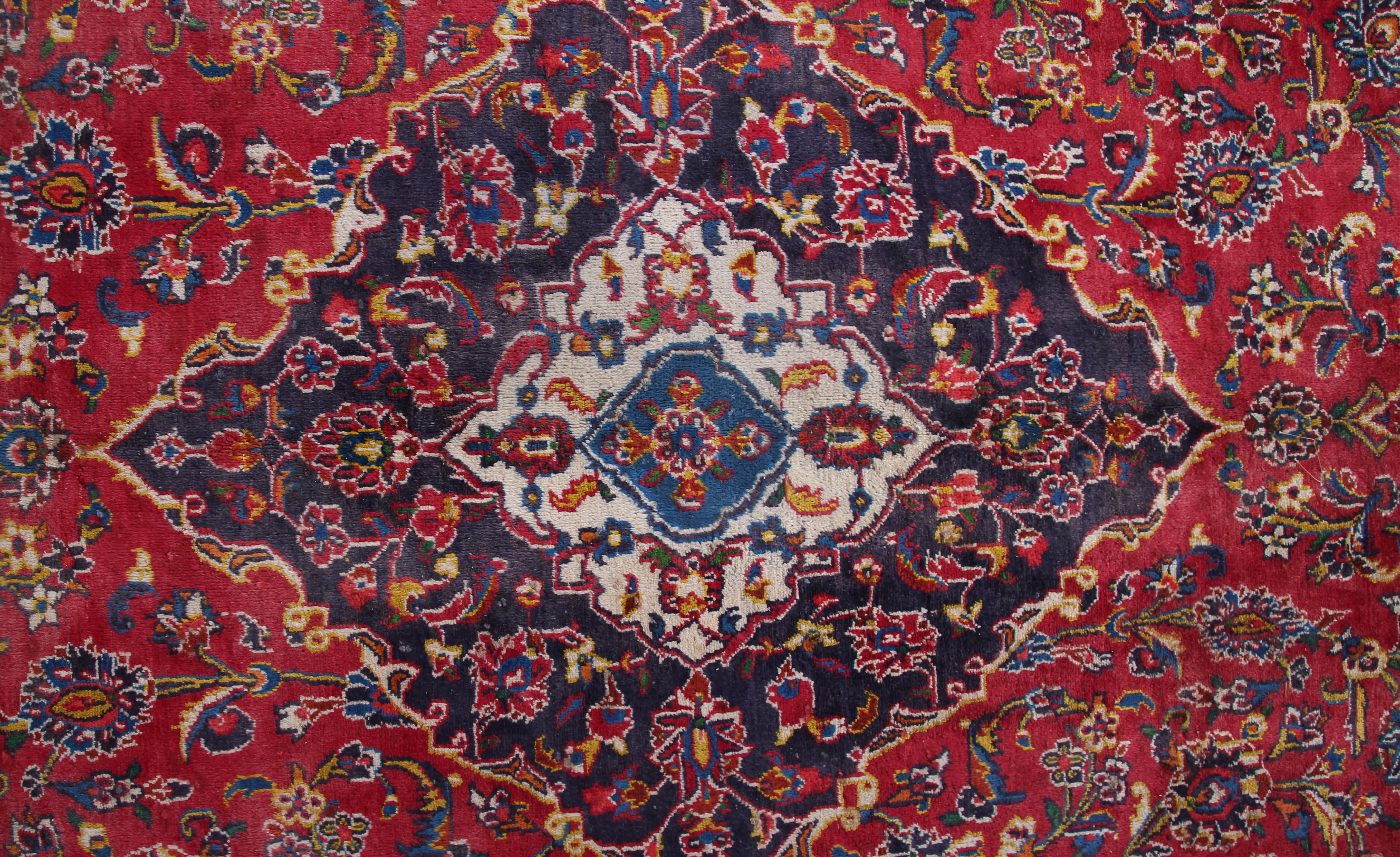 About Persian Mashad Rug: This beautiful rug was hand-woven in Mashad, Iran. Mashad carpets are authentic Oriental carpets which are easy to recognize with their famous medallions surrounded by floral motifs. They are often dominated by red tones, with blue tones in the border. High-quality wool is used, giving a hardwearing carpet. Typical knot density of Mashad rug can be 160,000 – 260,000 knots sqm.