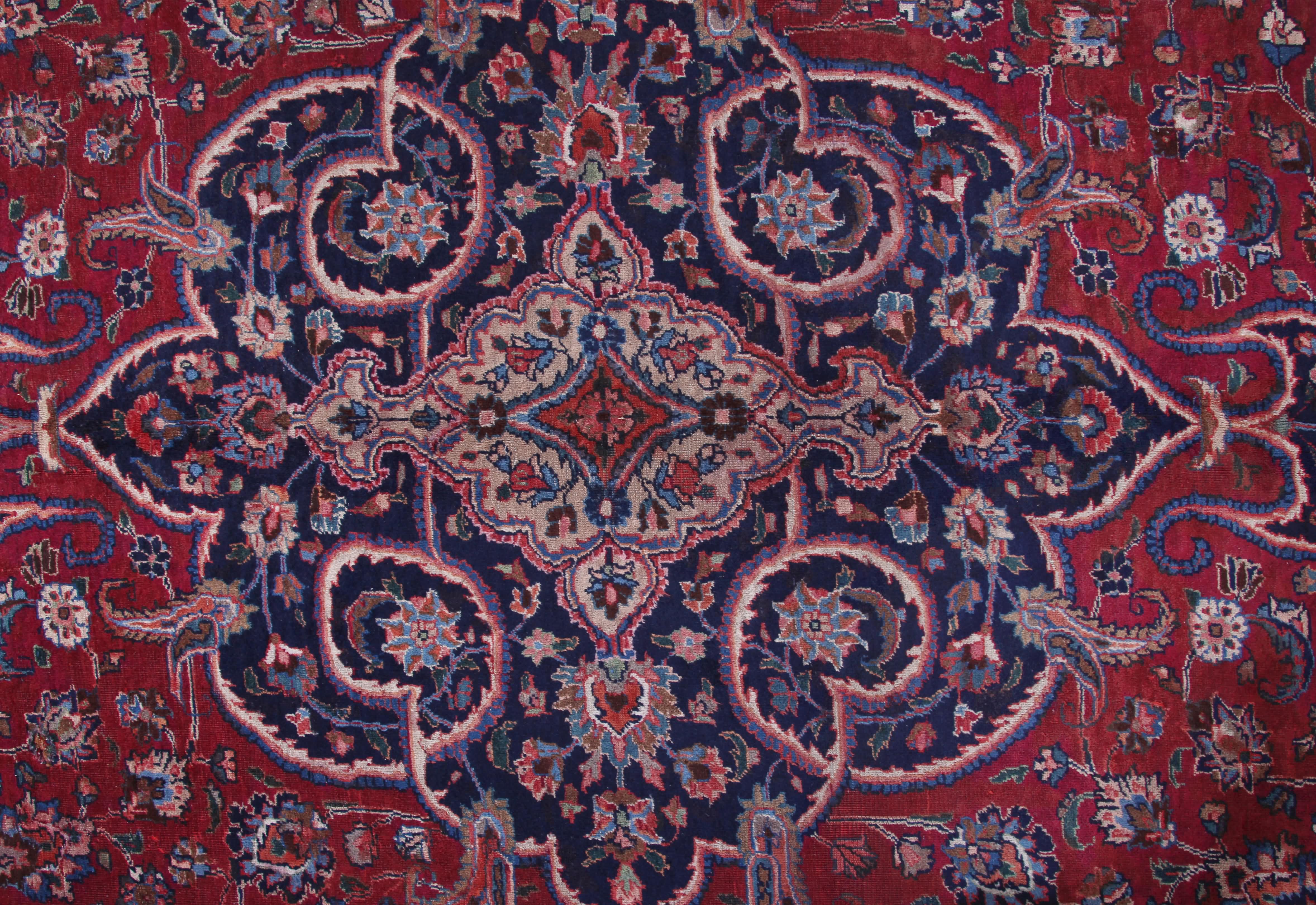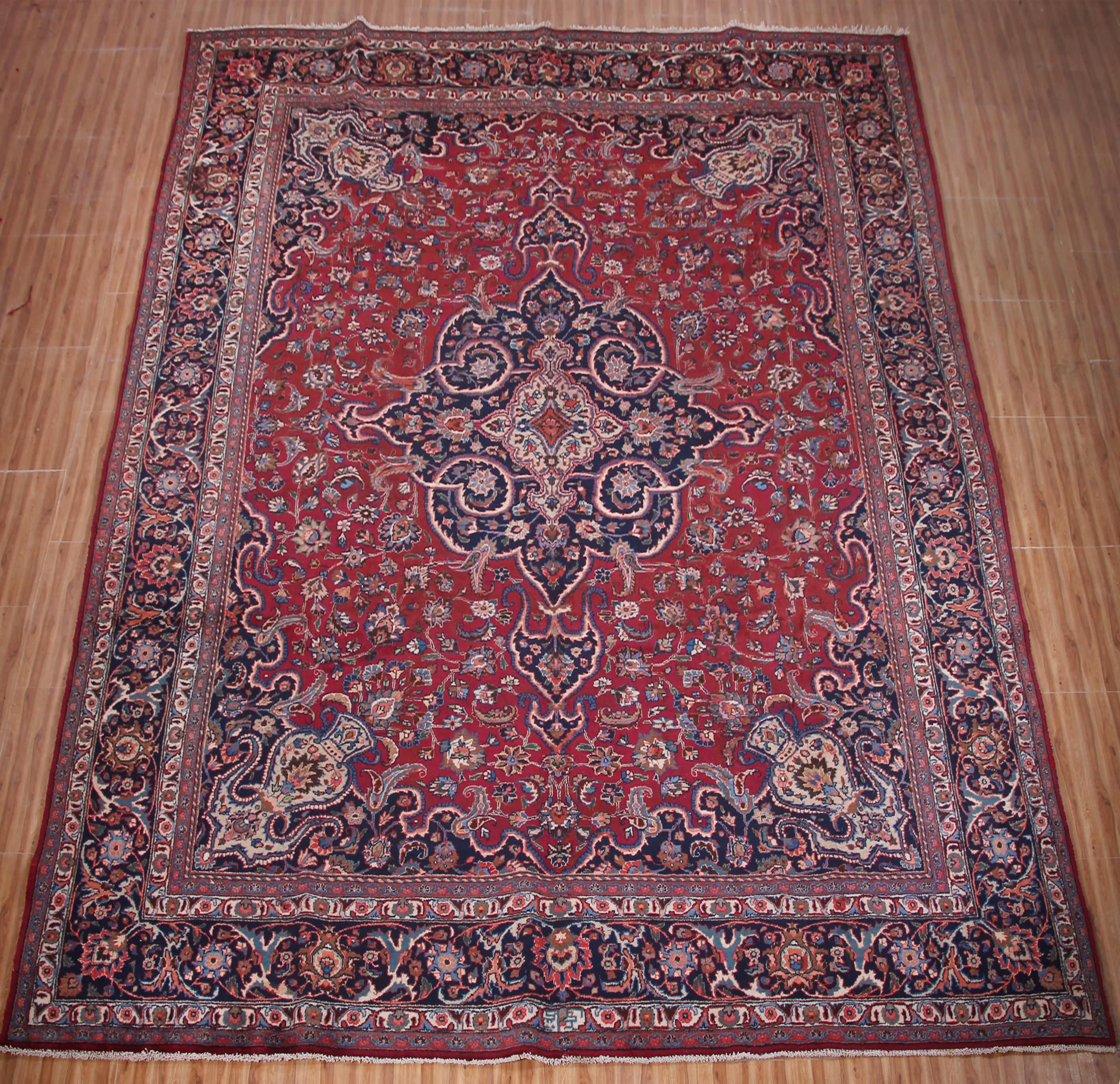 About Persian Mashad Rug: This beautiful rug was hand-woven in Mashad, Iran. Mashad carpets are authentic Oriental carpets which are easy to recognize with their famous medallions surrounded by floral motifs. They are often dominated by red tones, with blue tones in the border. High-quality wool is used, giving a hardwearing carpet. Typical knot density of Mashad rug can be 160,000 – 260,000 knots sqm.