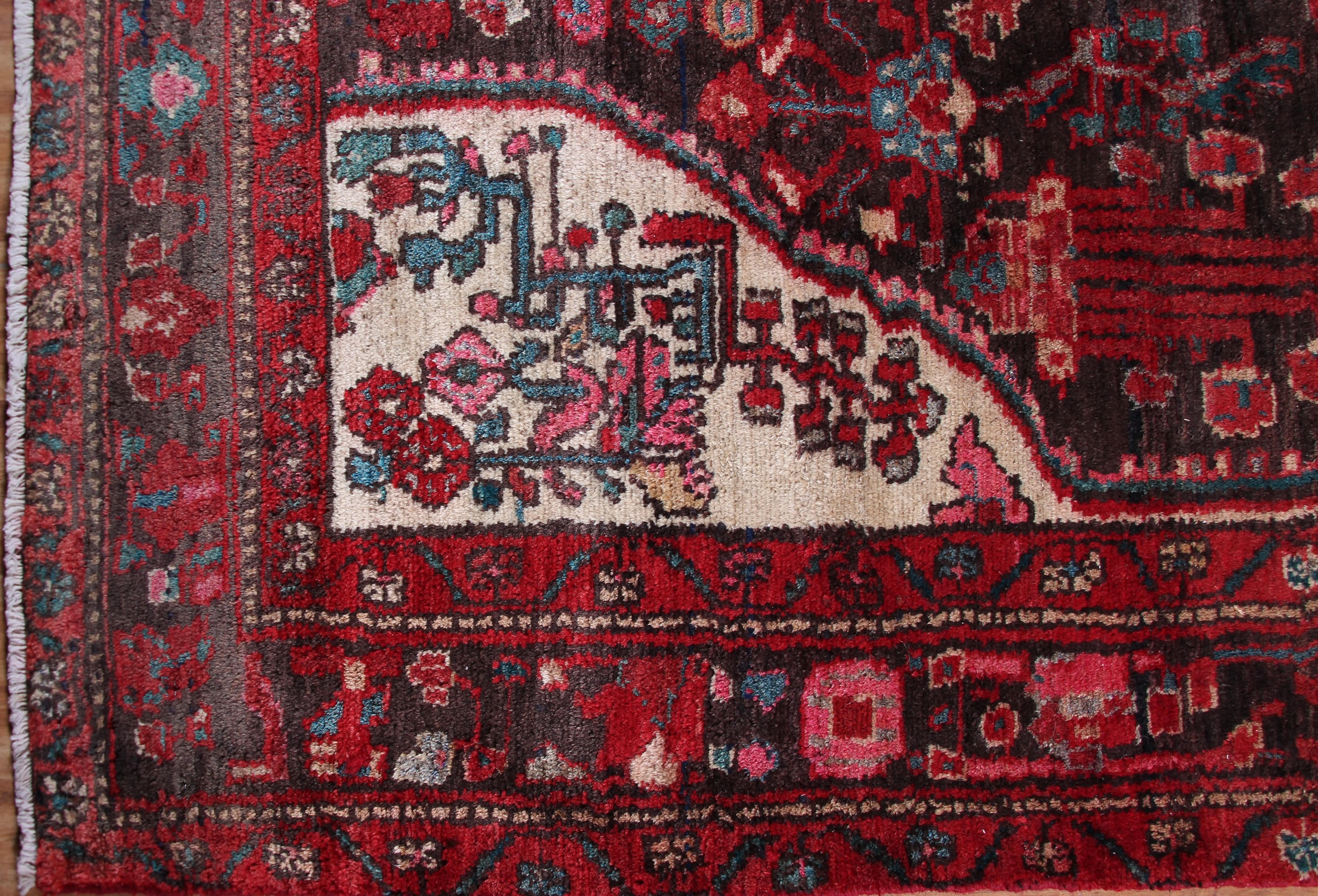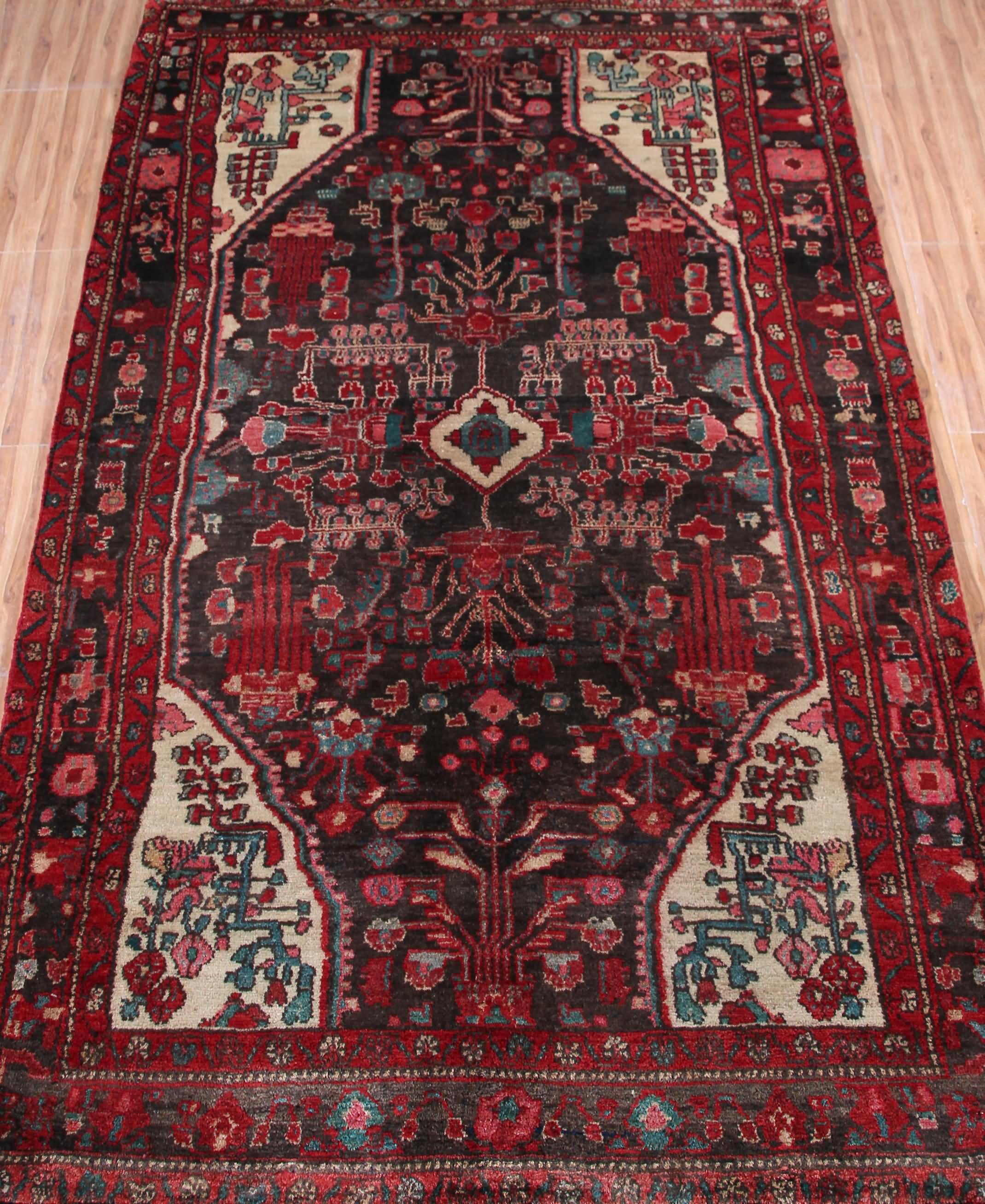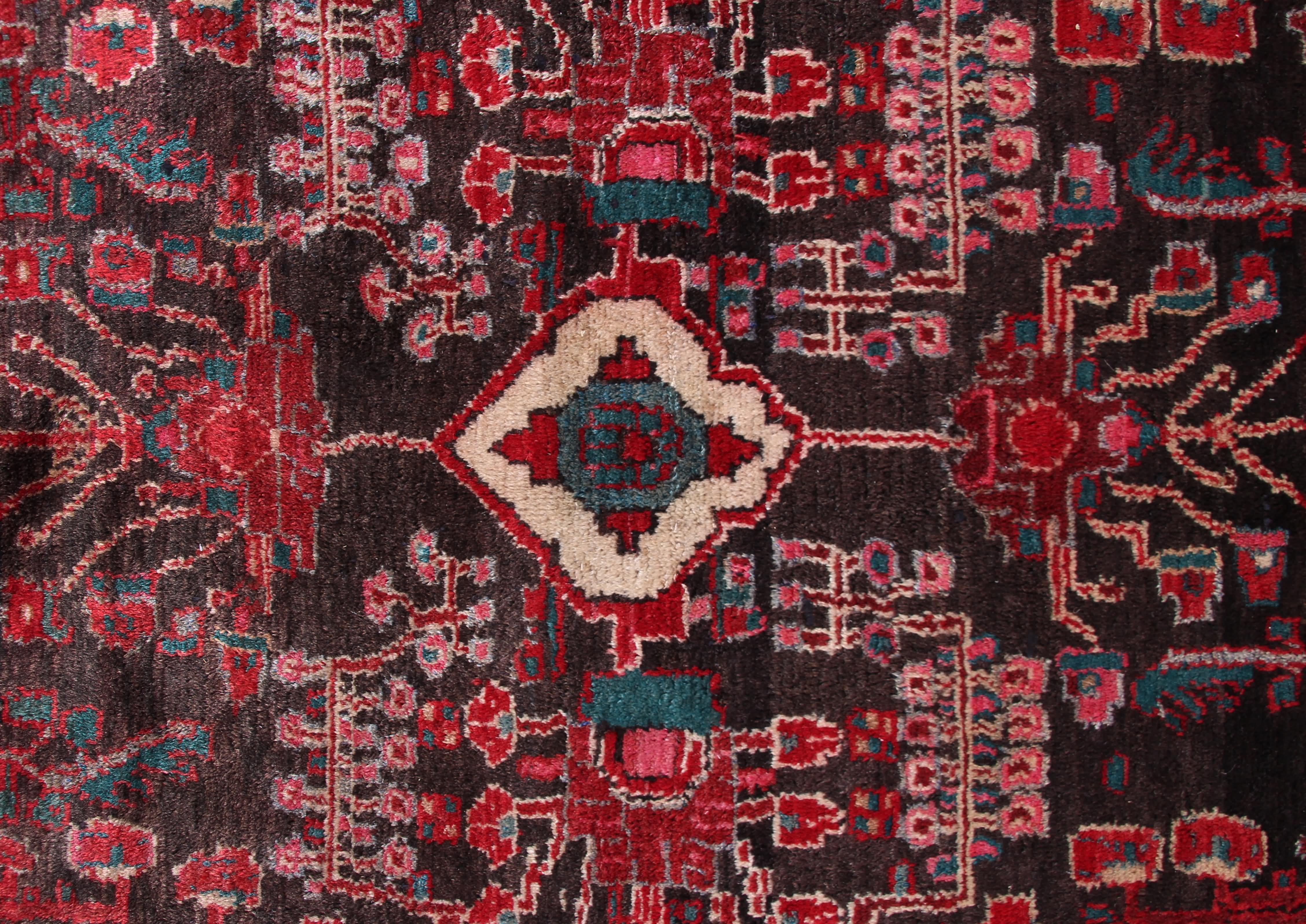 About Persian Nahavand Rug: This beautiful rug was hand knotted in Nahavand, Iran. It produces high quality Persian rugs, which have a very good reputation. Nahavand rugs are noticeable due to the softness but more importantly, the sheen, from their wool. The pattern usually encapsulates a large single central medallion with smaller nomadic motifs surrounding it. The colours used are a beautiful blend, normally utilising rusty reds and khakis on a dark blue background but may vary from rug to rug. These are beautiful rugs of high quality and are well sought after. Typical knot density of Nahavand rugs is 90,000 – 170,000 knots / sqm.