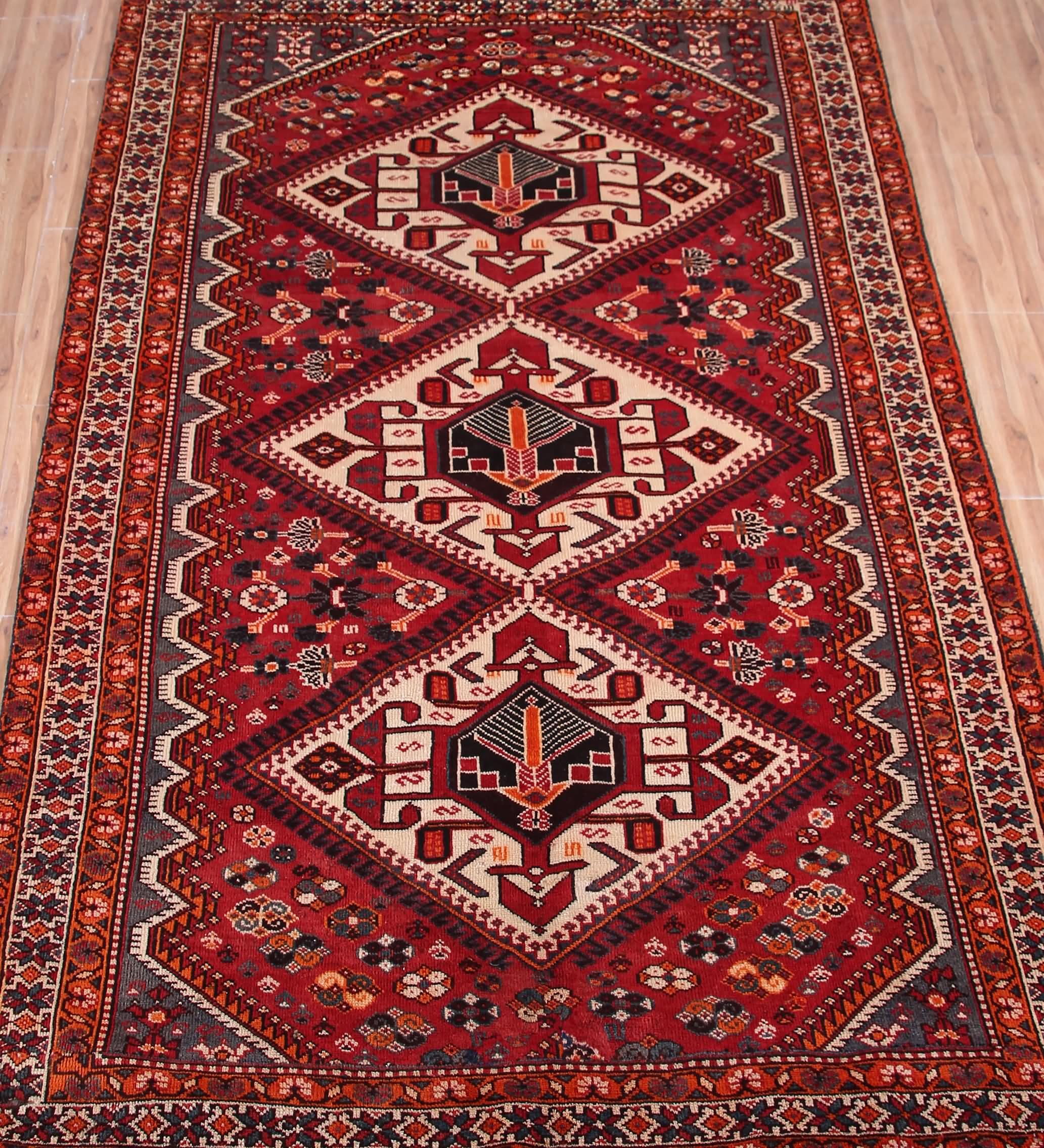 About Persian Shiraz Rug: This beautiful rug was hand-woven in Shiraz, located in the southern part of Iran. Shiraz rugs are woven on a cotton or wool foundation with a woollen pile. These nomadic rugs are geometrical in style, and extremely hard wearing with average knot count around 120 KPSI.