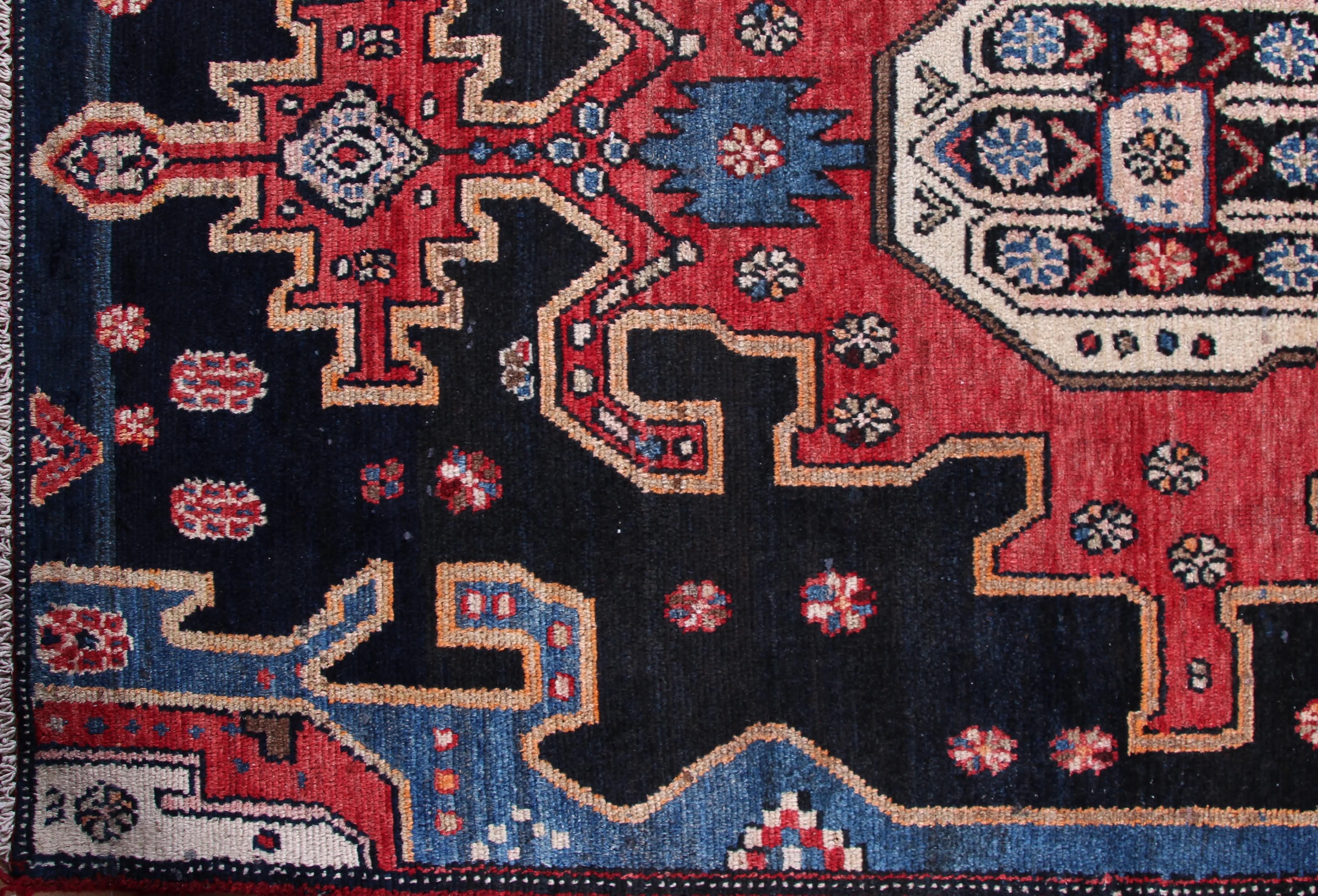 About Persian Saveh Rug: Saveh is a city in the Markazi Province of Iran. It is located about 100 km southwest of Tehran. Saveh rugs are known in the antique market from the late nineteenth century. Older weavings from Saveh are categorized as Hamadan Mosul rugs. Early Saveh rugs are geometric, with tribal designs in either an allover or medallion style.