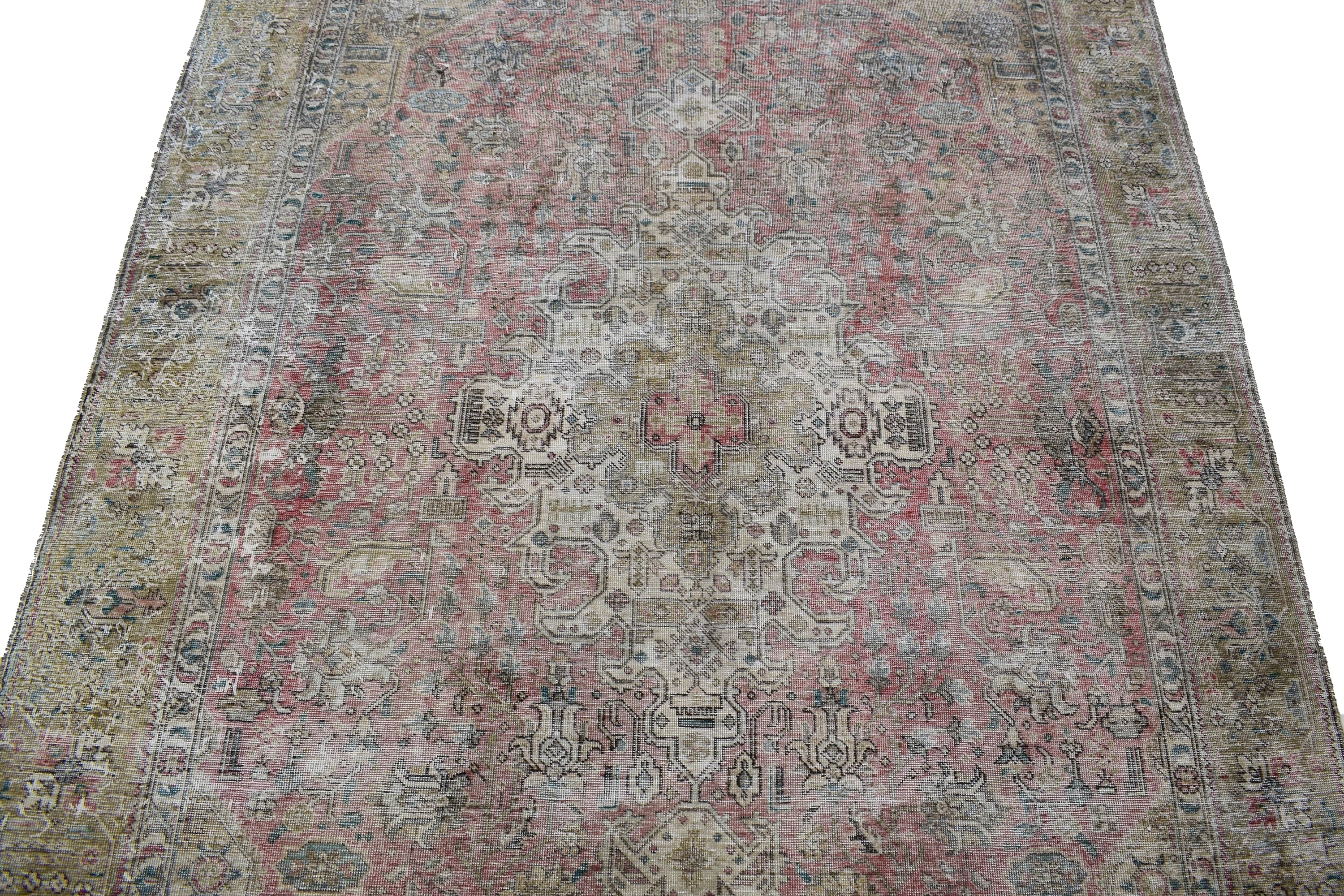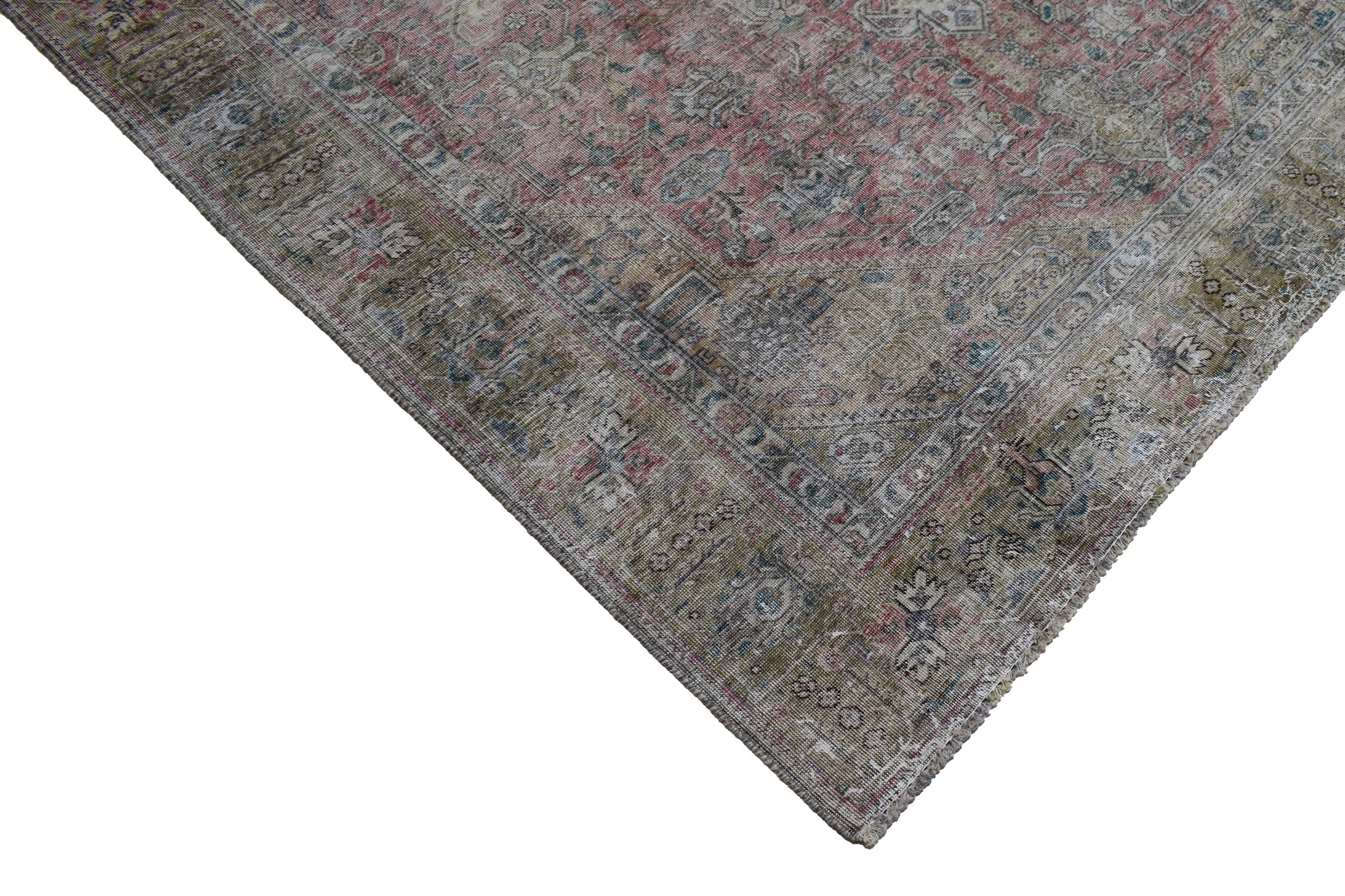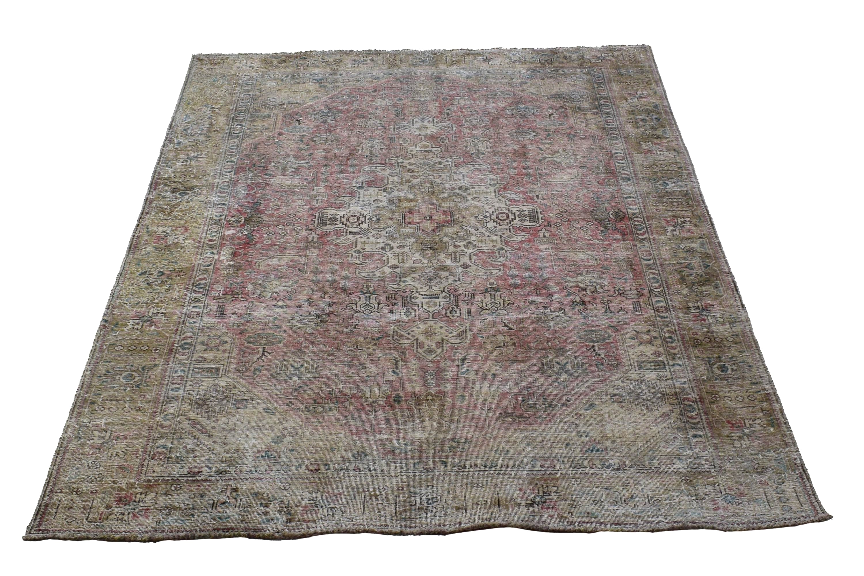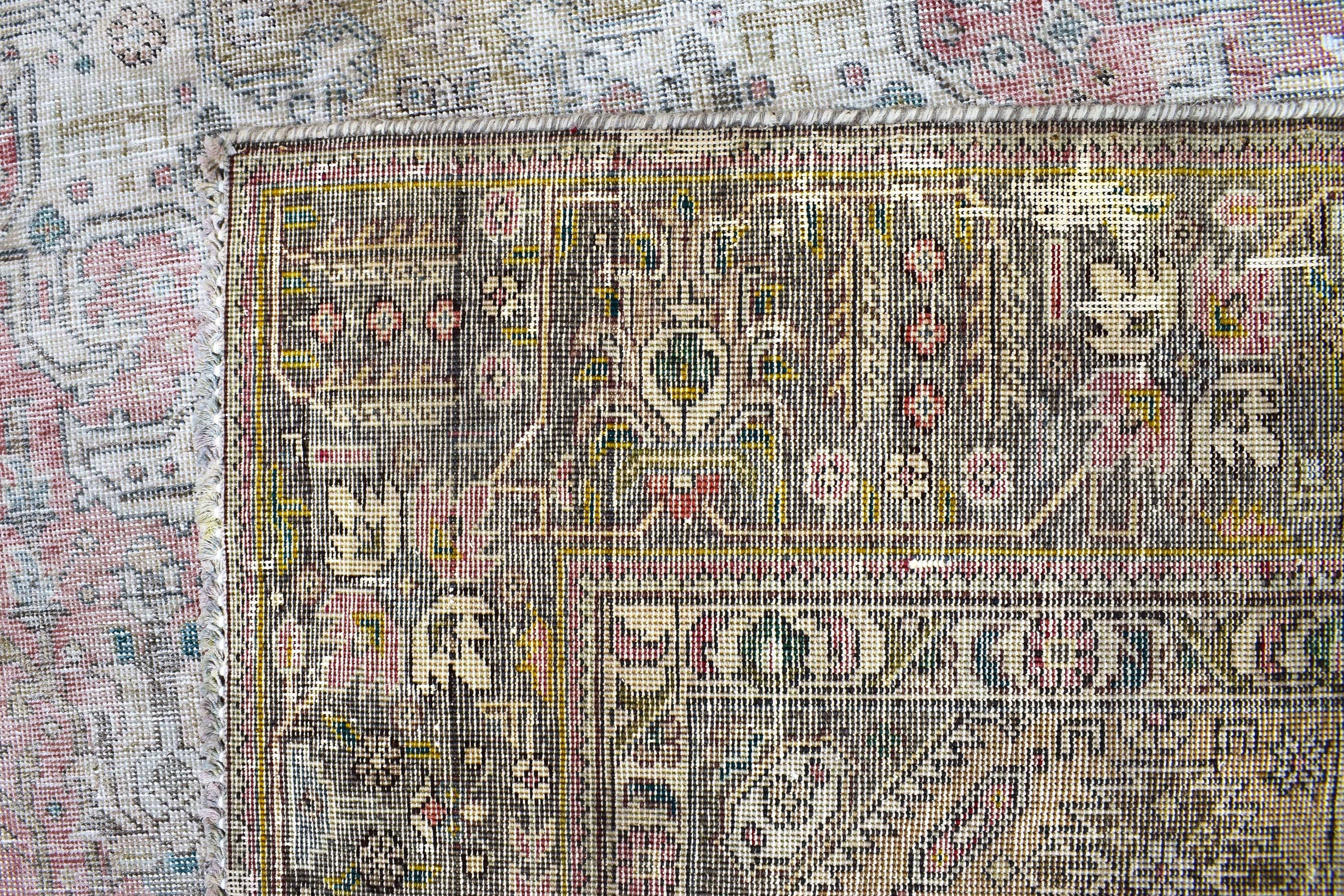 About Distressed Rug: This beautiful rug was hand-woven in 1970's in Tabriz, Iran. Later, this vintage rug has been shaved down to a lower pile to make it a faded rug on purpose. Distressed Rugs represent a trend that has achieved a crossover between fashion and home décor. This new look celebrates rugs that are faded, and worn over time; rugs that nestle into homes as if they’ve always been there. Distressed rugs are shaved rugs so they do not have a soft pile.