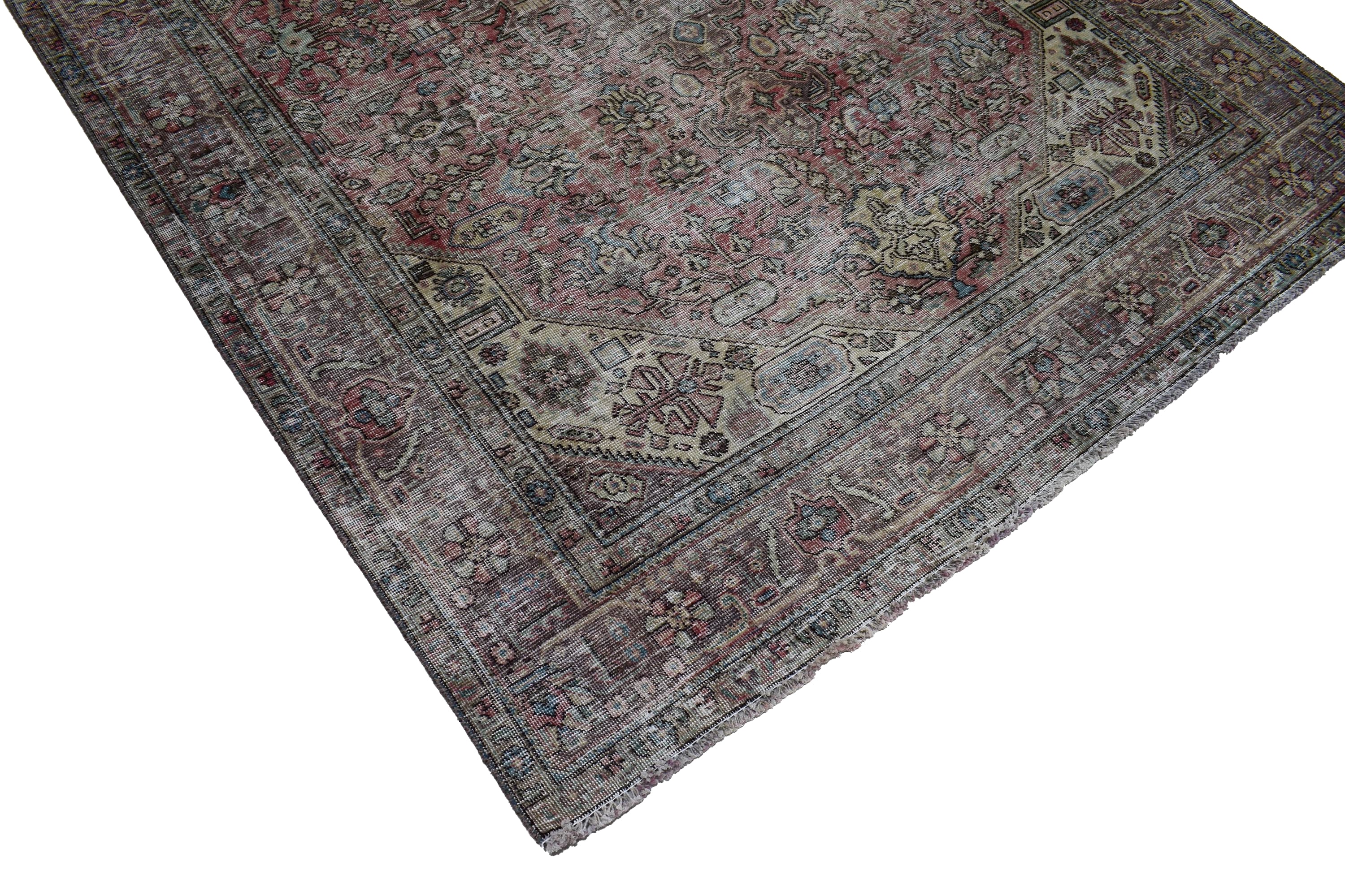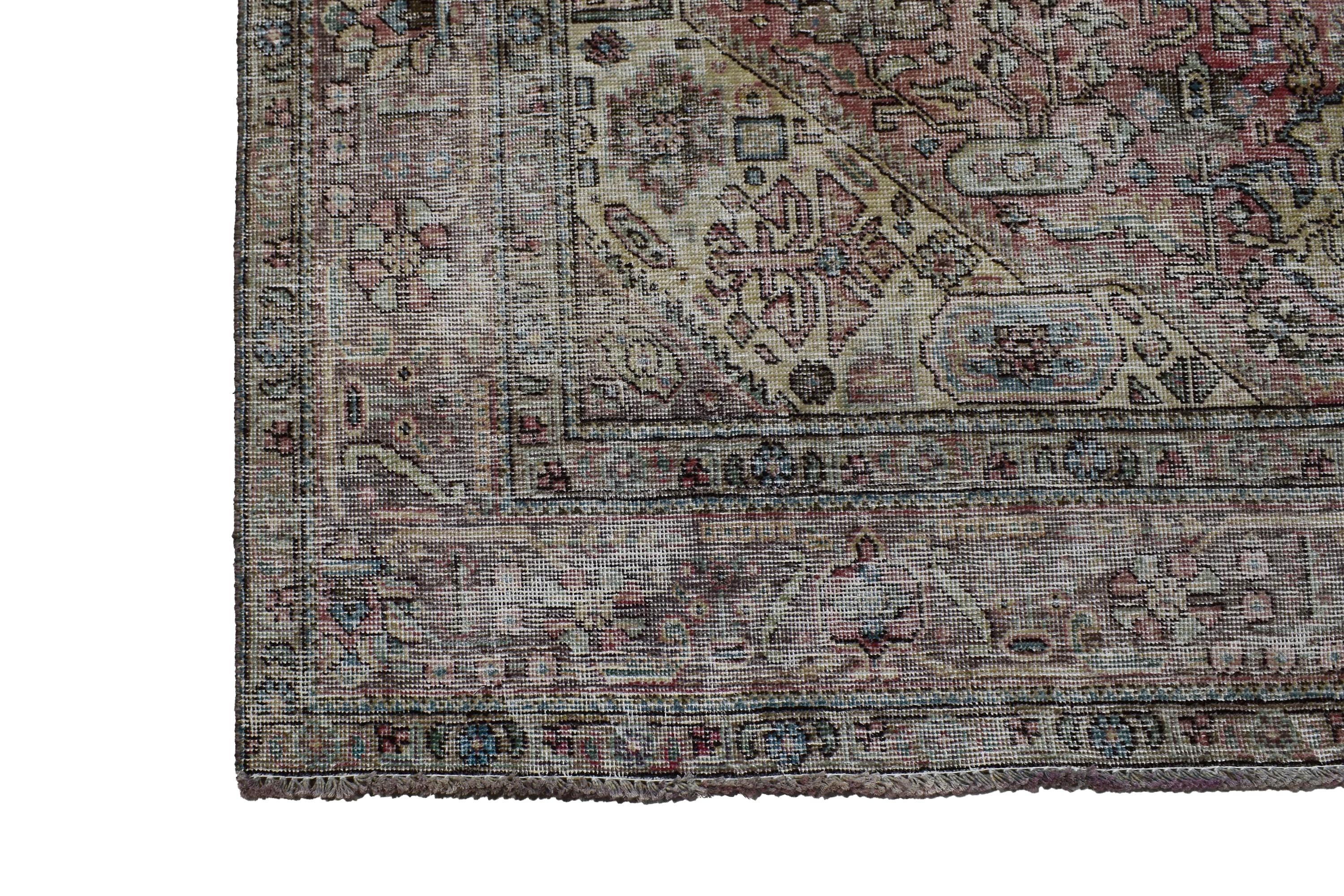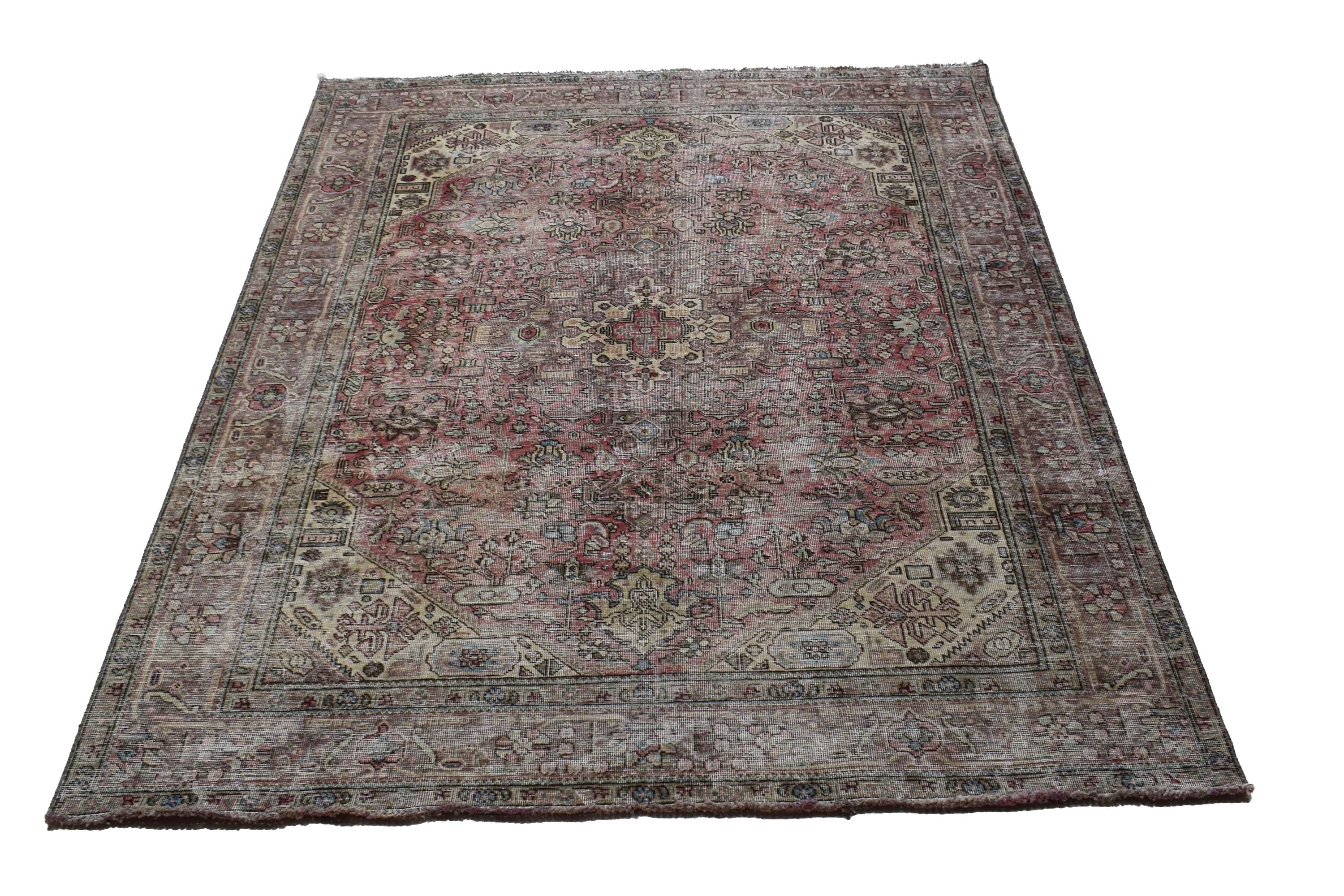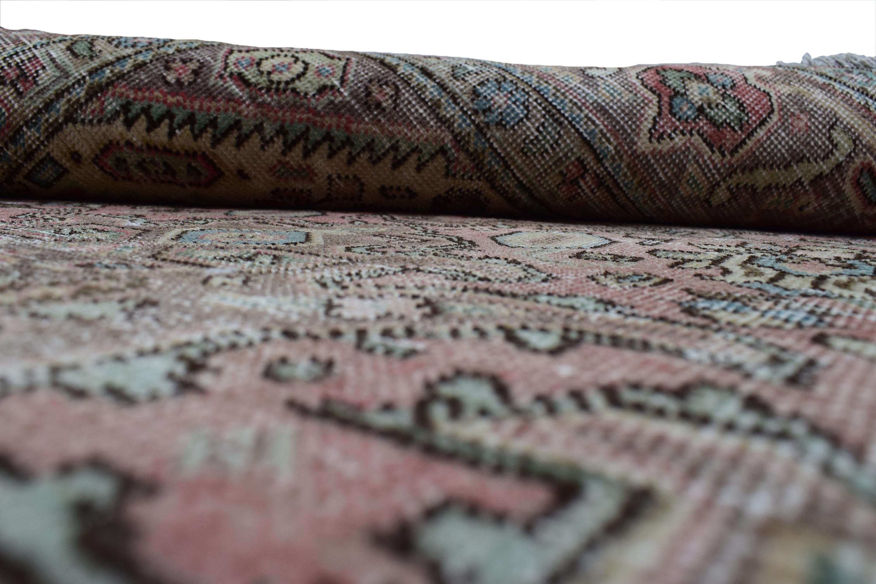 About Distressed Rug: This beautiful rug was hand-woven in 1970's in Tabriz, Iran. Later, this vintage rug has been shaved down to a lower pile to make it a faded rug on purpose. Distressed Rugs represent a trend that has achieved a crossover between fashion and home décor. This new look celebrates rugs that are faded, and worn over time; rugs that nestle into homes as if they’ve always been there. Distressed rugs are shaved rugs so they do not have a soft pile.