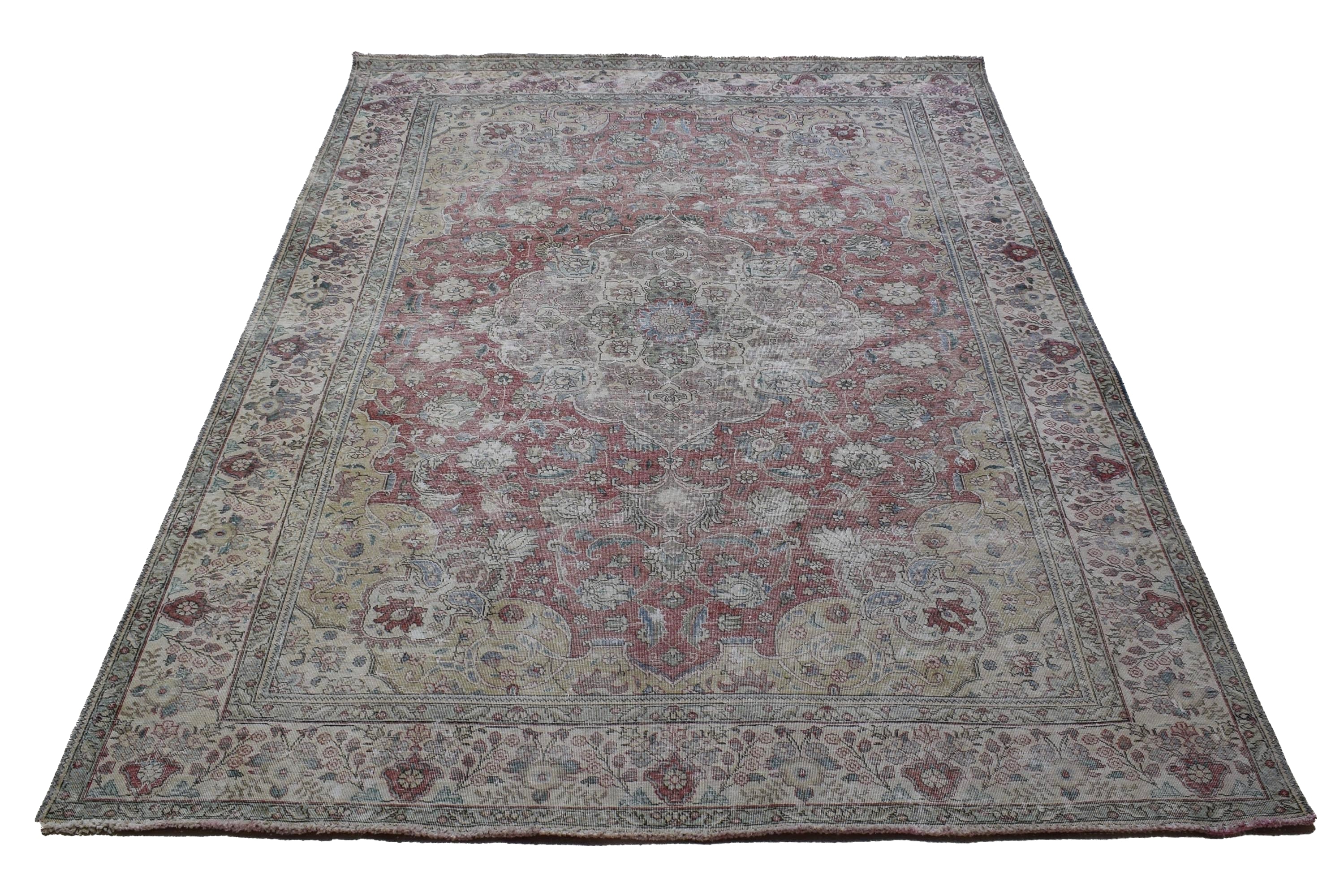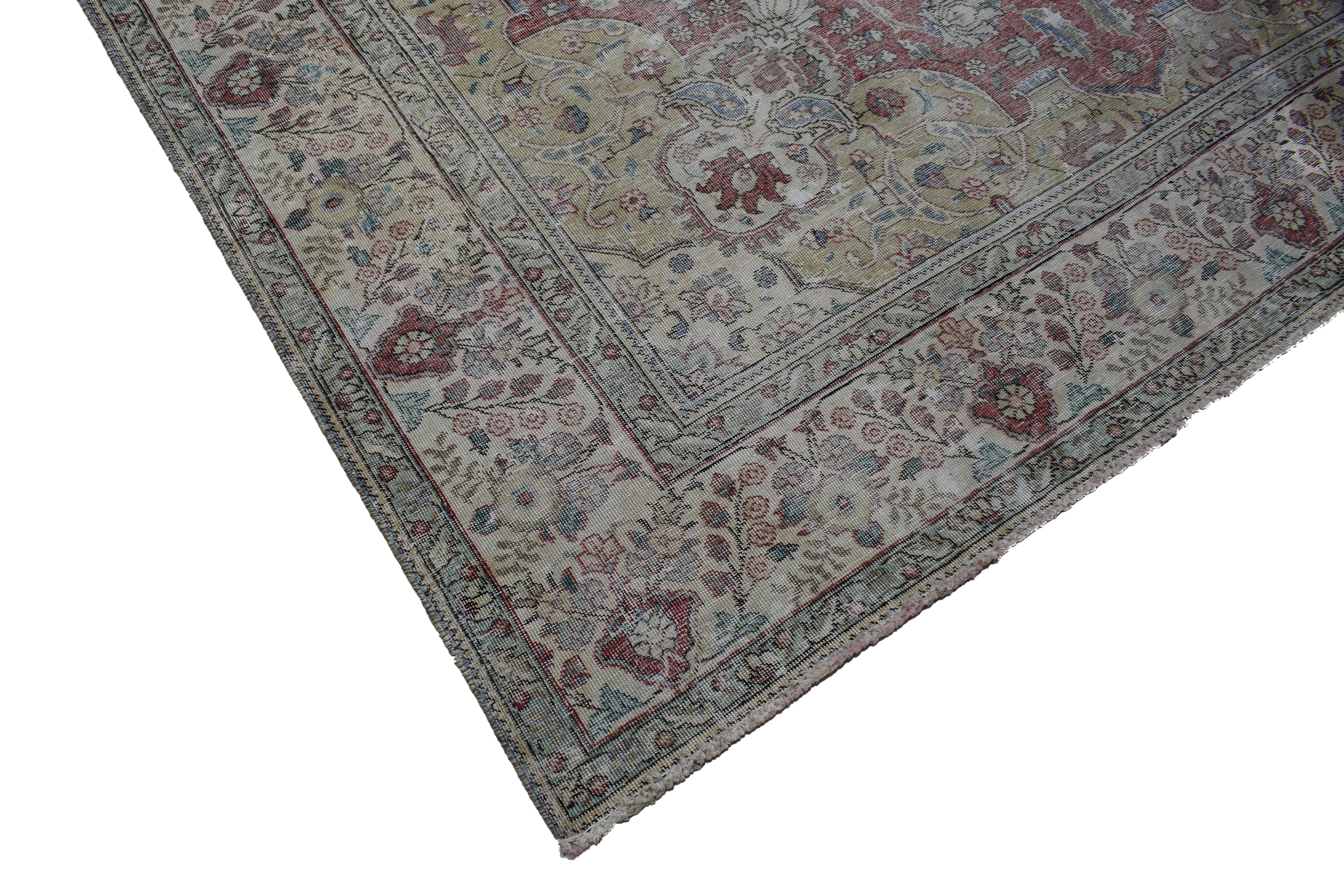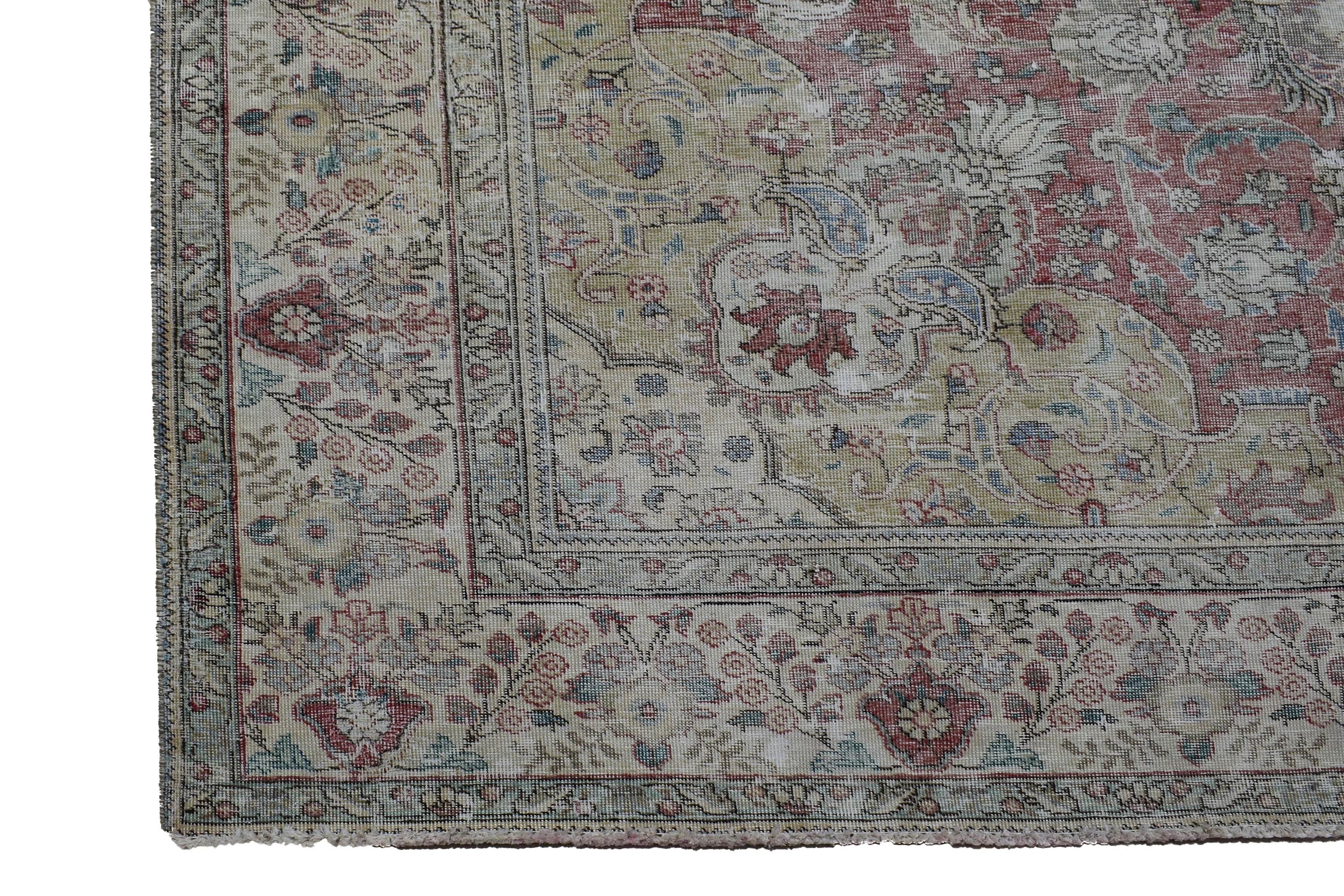 About Distressed Rug: This beautiful rug was hand-woven in 1970's in Tabriz, Iran. Later, this vintage rug has been shaved down to a lower pile to make it a faded rug on purpose. Distressed Rugs represent a trend that has achieved a crossover between fashion and home décor. This new look celebrates rugs that are faded, and worn over time; rugs that nestle into homes as if they’ve always been there. Distressed rugs are shaved rugs so they do not have a soft pile.