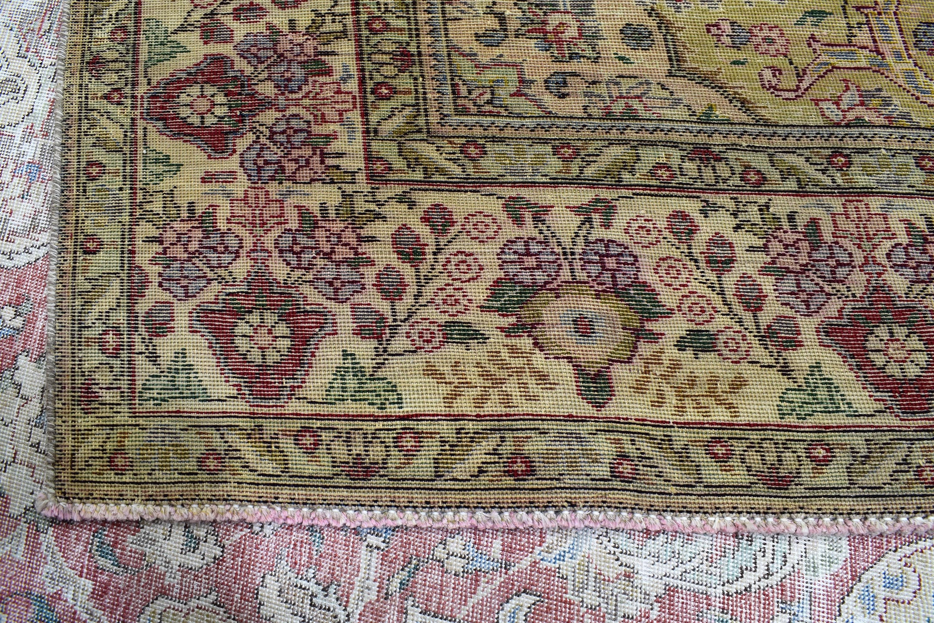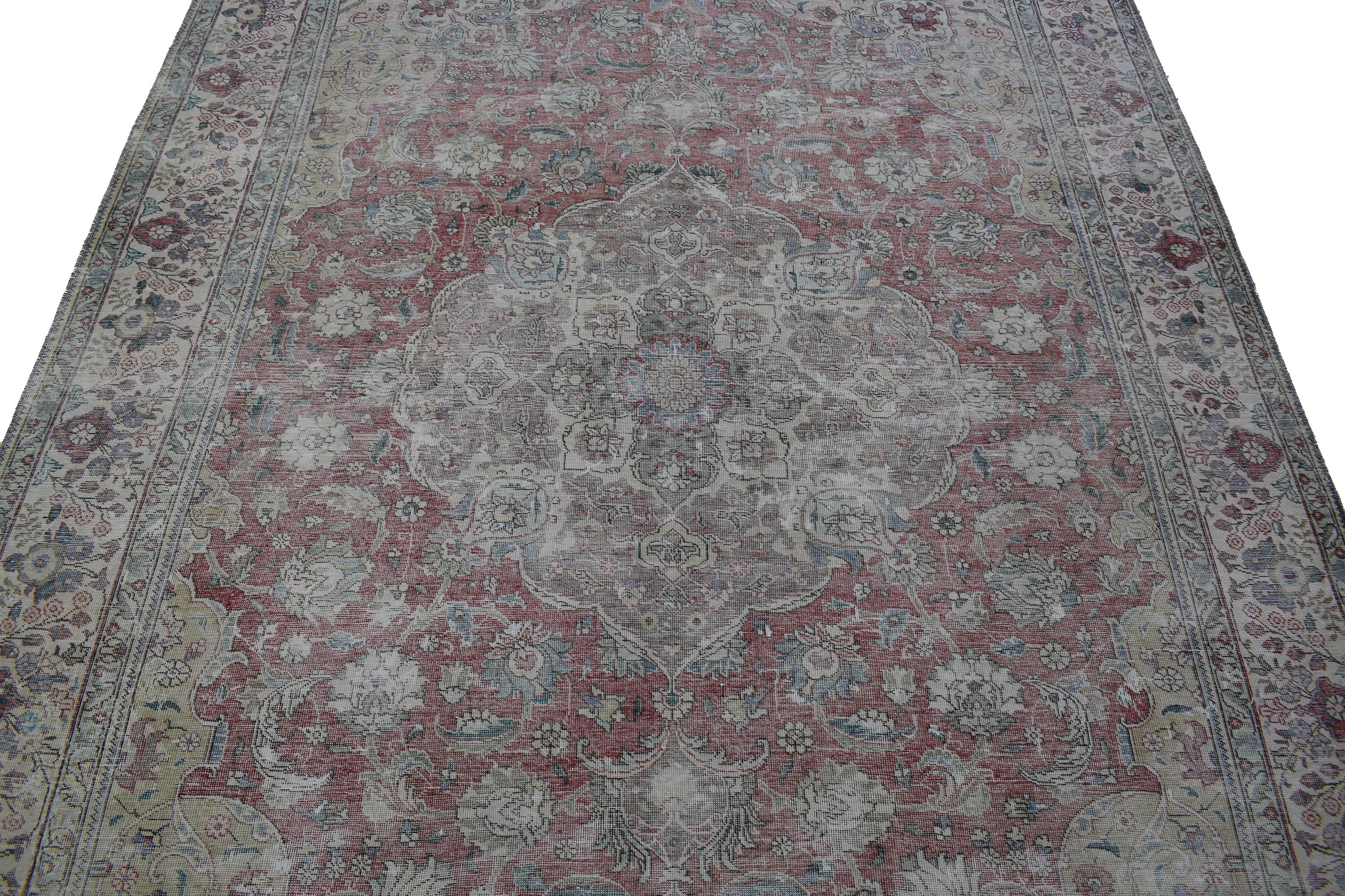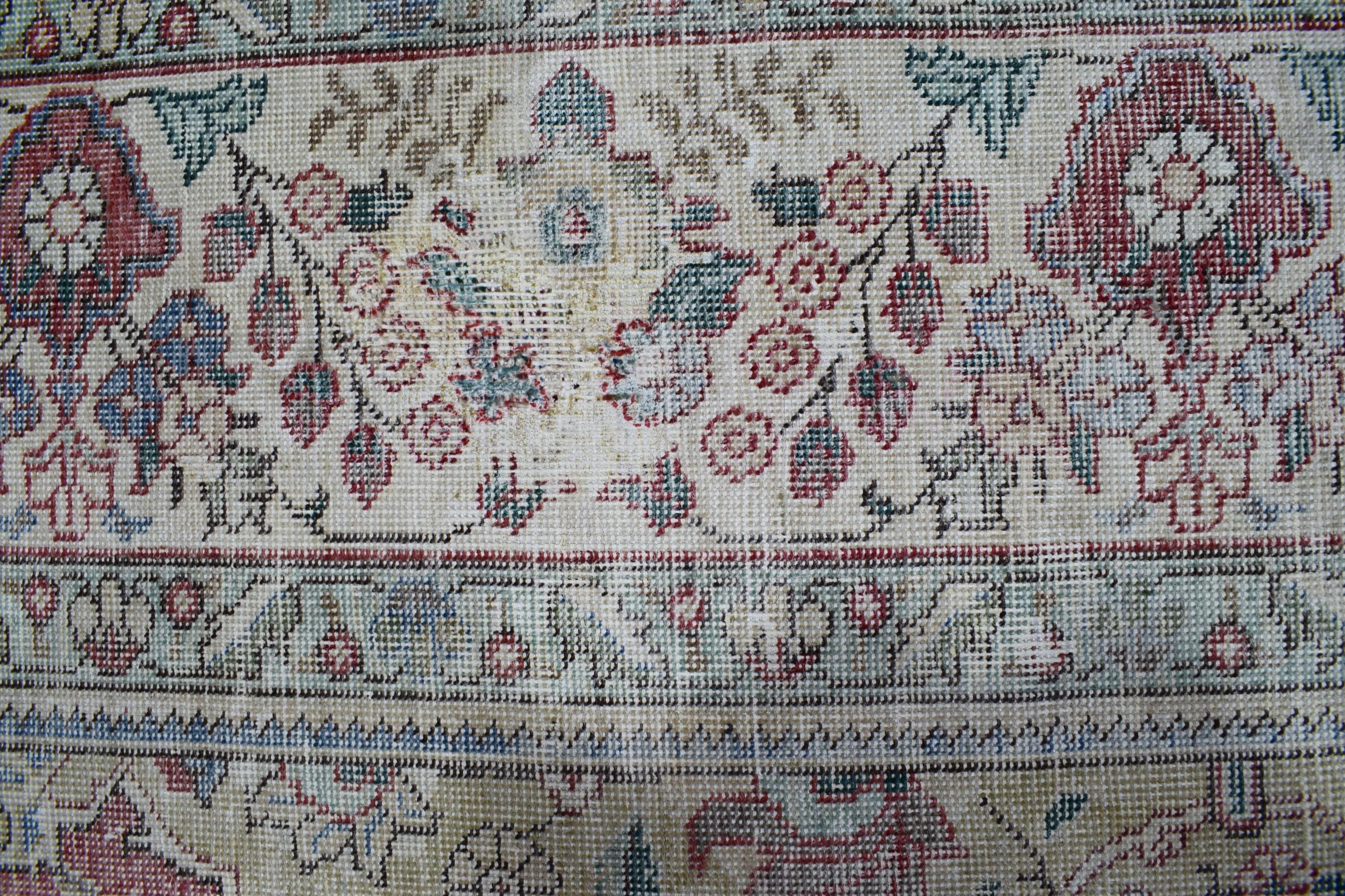 About Distressed Rug: This beautiful rug was hand-woven in 1970's in Tabriz, Iran. Later, this vintage rug has been shaved down to a lower pile to make it a faded rug on purpose. Distressed Rugs represent a trend that has achieved a crossover between fashion and home décor. This new look celebrates rugs that are faded, and worn over time; rugs that nestle into homes as if they’ve always been there. Distressed rugs are shaved rugs so they do not have a soft pile.