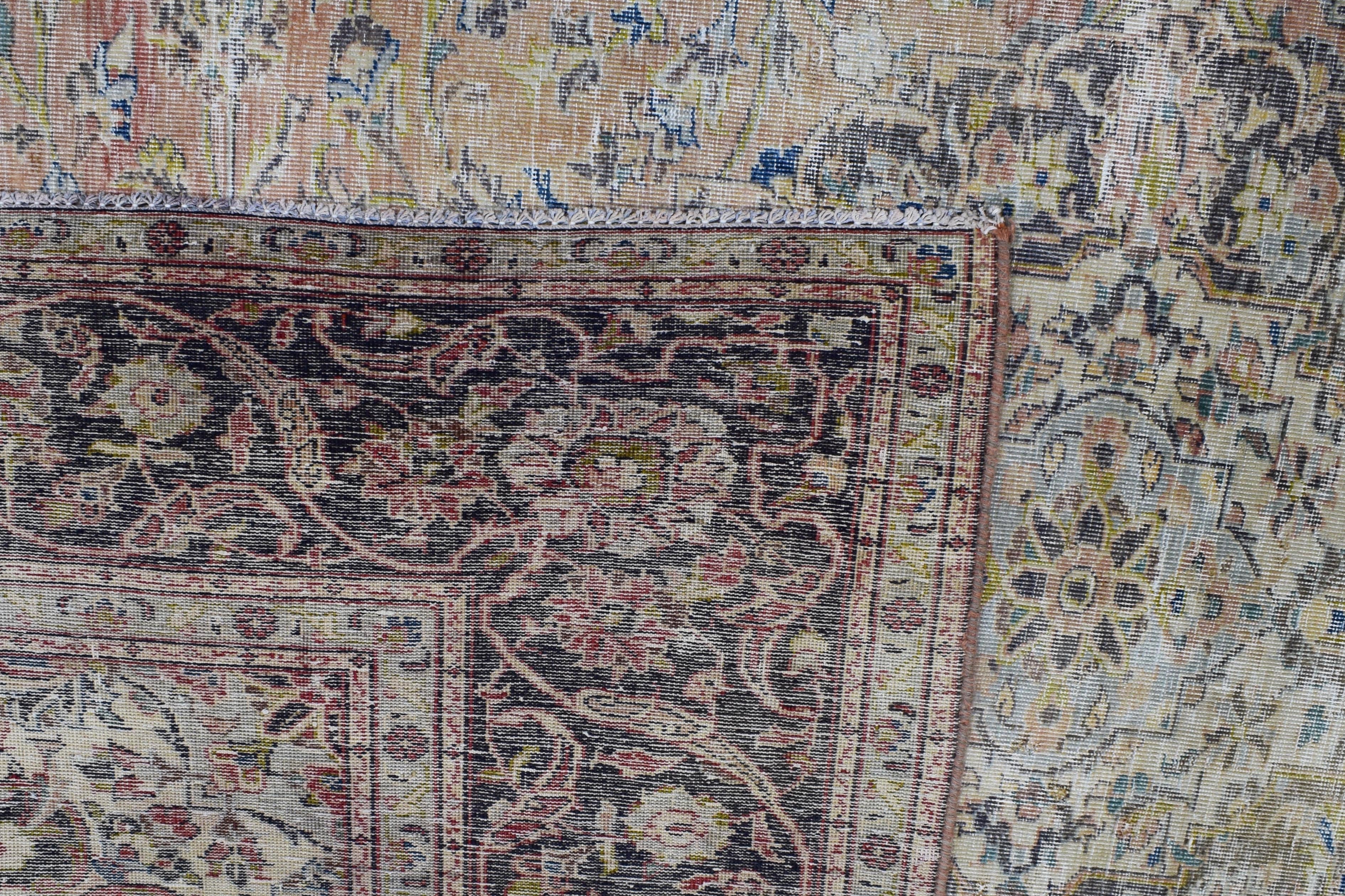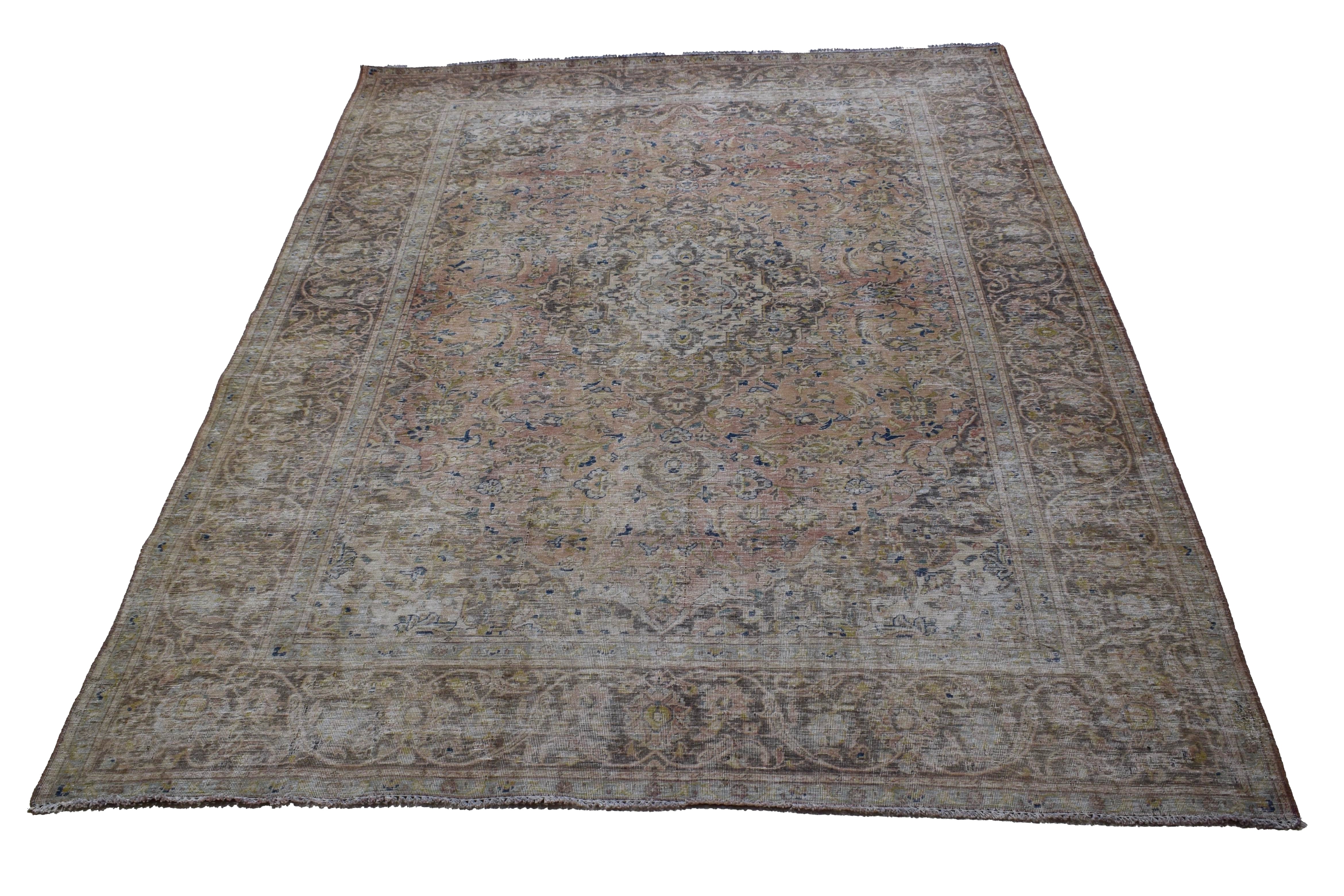 About Distressed Rug: This beautiful rug was hand-woven in 1970's in Tabriz, Iran. Later, this vintage rug has been shaved down to a lower pile to make it a faded rug on purpose. Distressed Rugs represent a trend that has achieved a crossover between fashion and home décor. This new look celebrates rugs that are faded, and worn over time; rugs that nestle into homes as if they’ve always been there. Distressed rugs are shaved rugs so they do not have a soft pile.