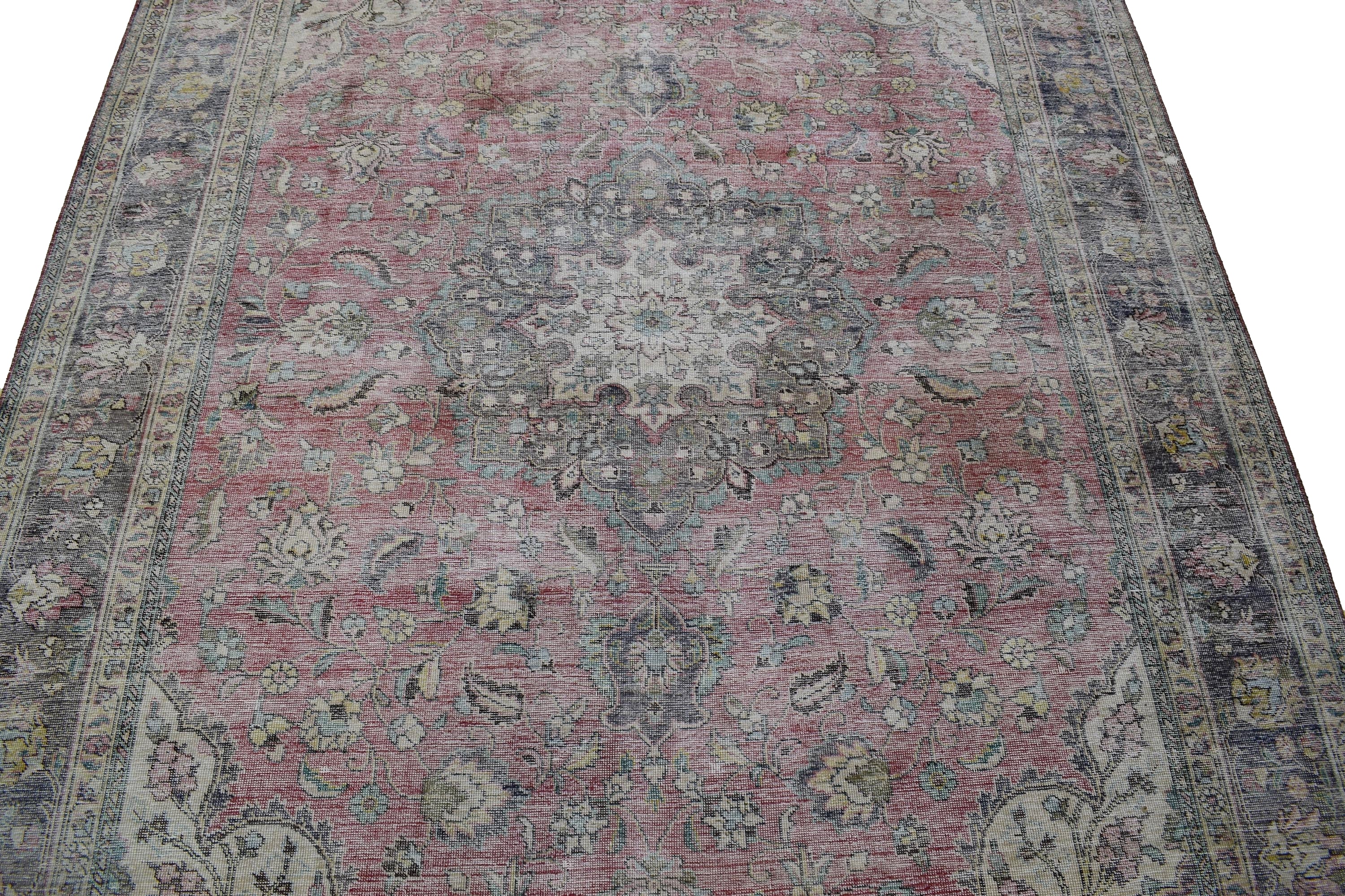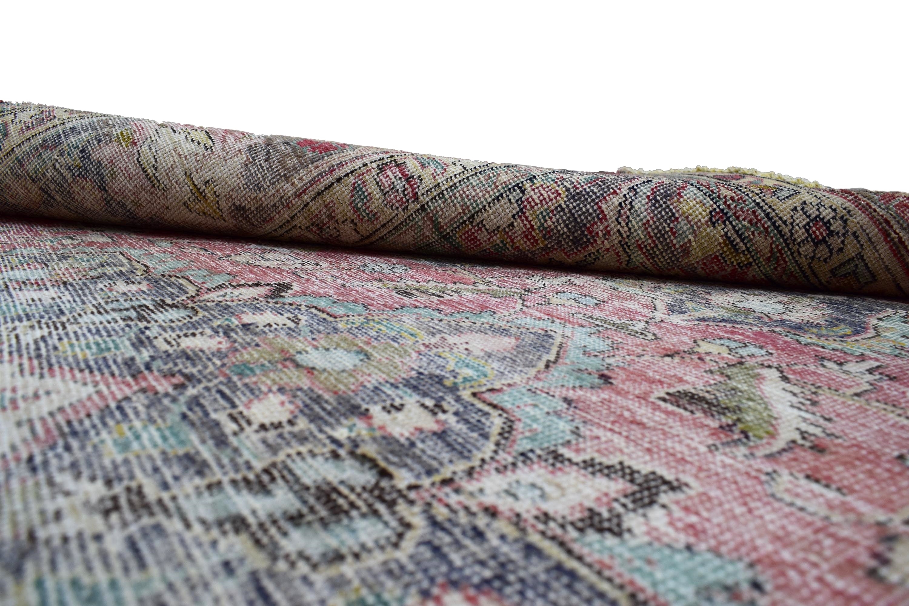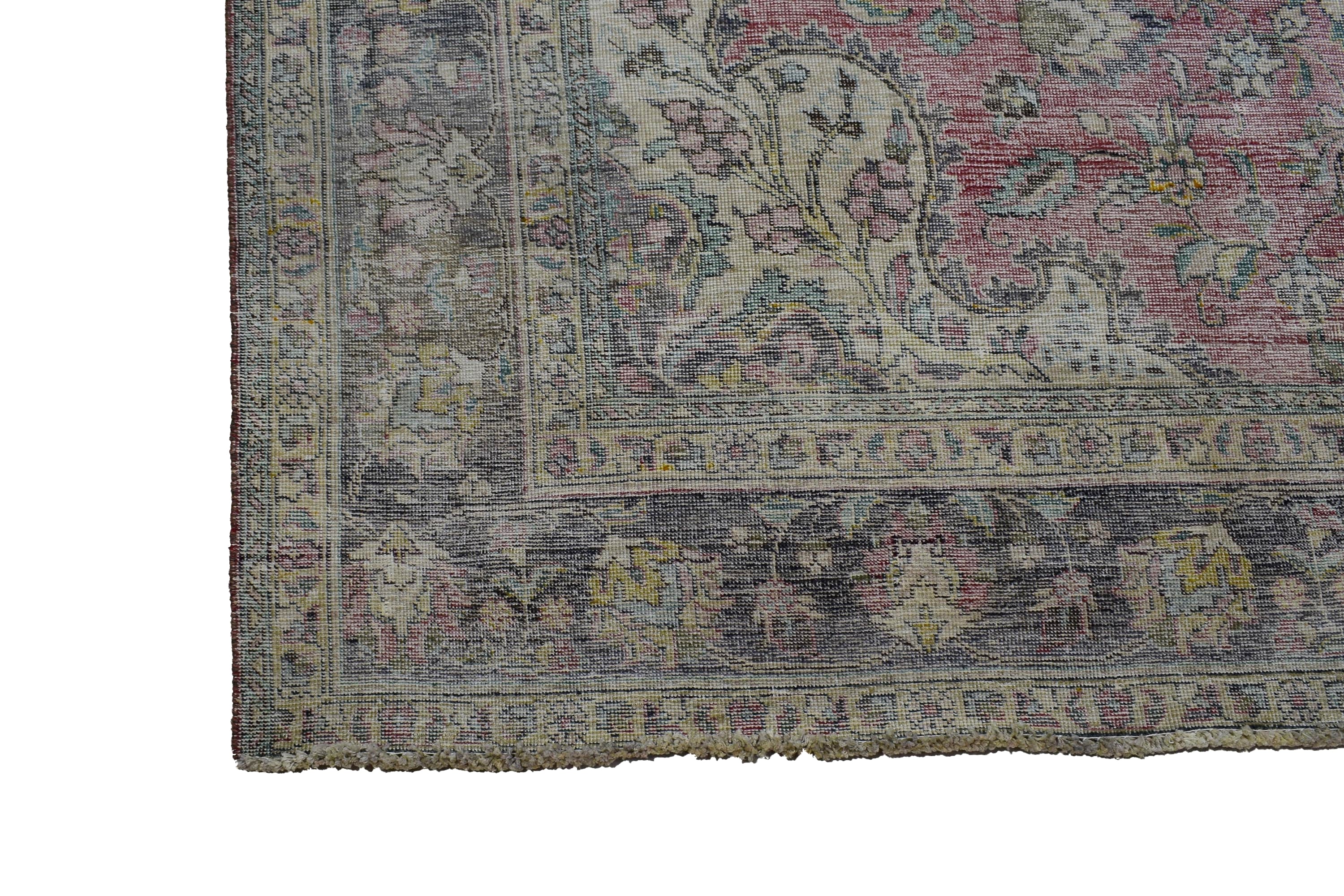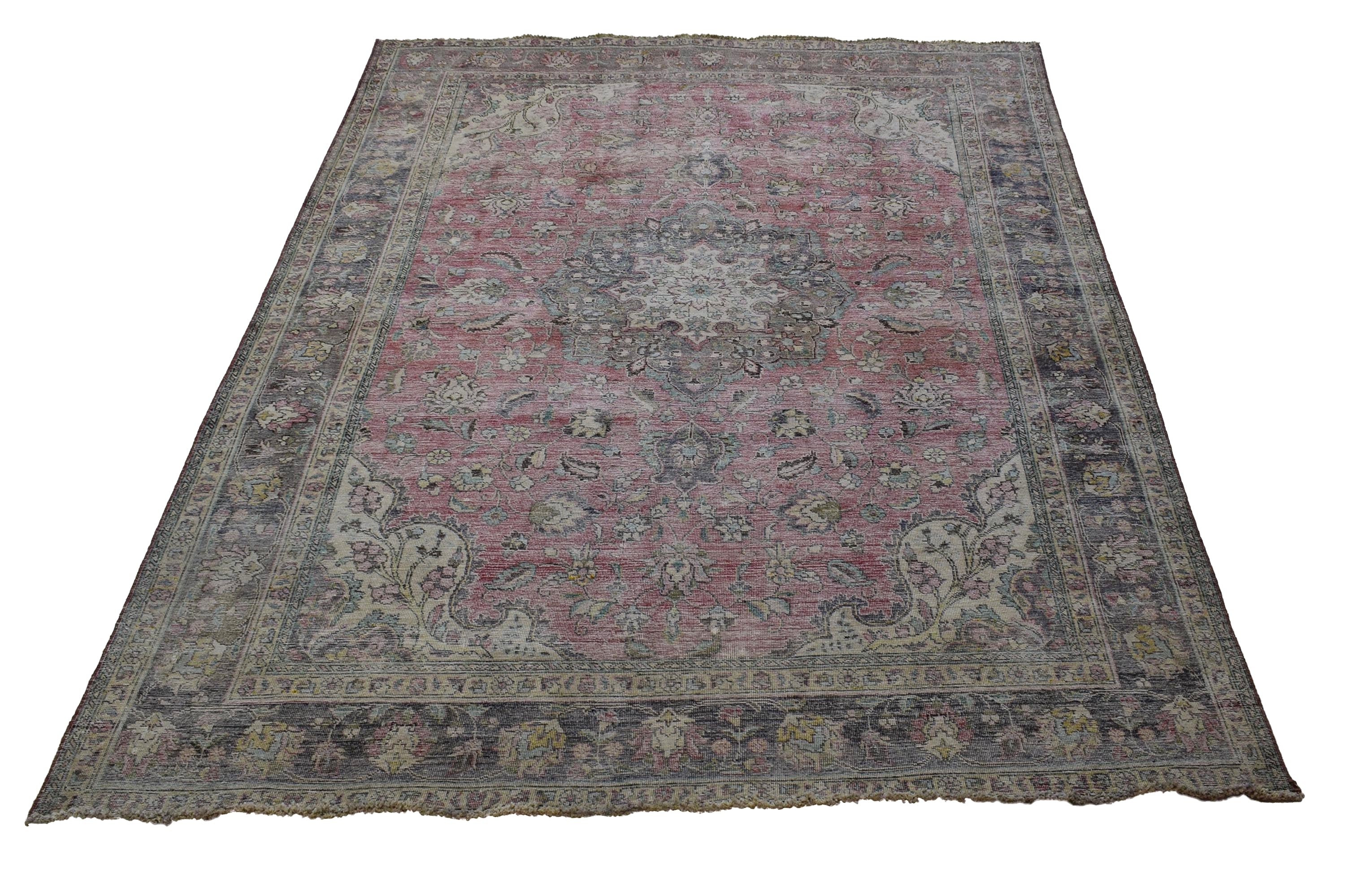 About Distressed Rug: This beautiful rug was hand-woven in 1970's in Tabriz, Iran. Later, this vintage rug has been shaved down to a lower pile to make it a faded rug on purpose. Distressed Rugs represent a trend that has achieved a crossover between fashion and home décor. This new look celebrates rugs that are faded, and worn over time; rugs that nestle into homes as if they’ve always been there. Distressed rugs are shaved rugs so they do not have a soft pile.