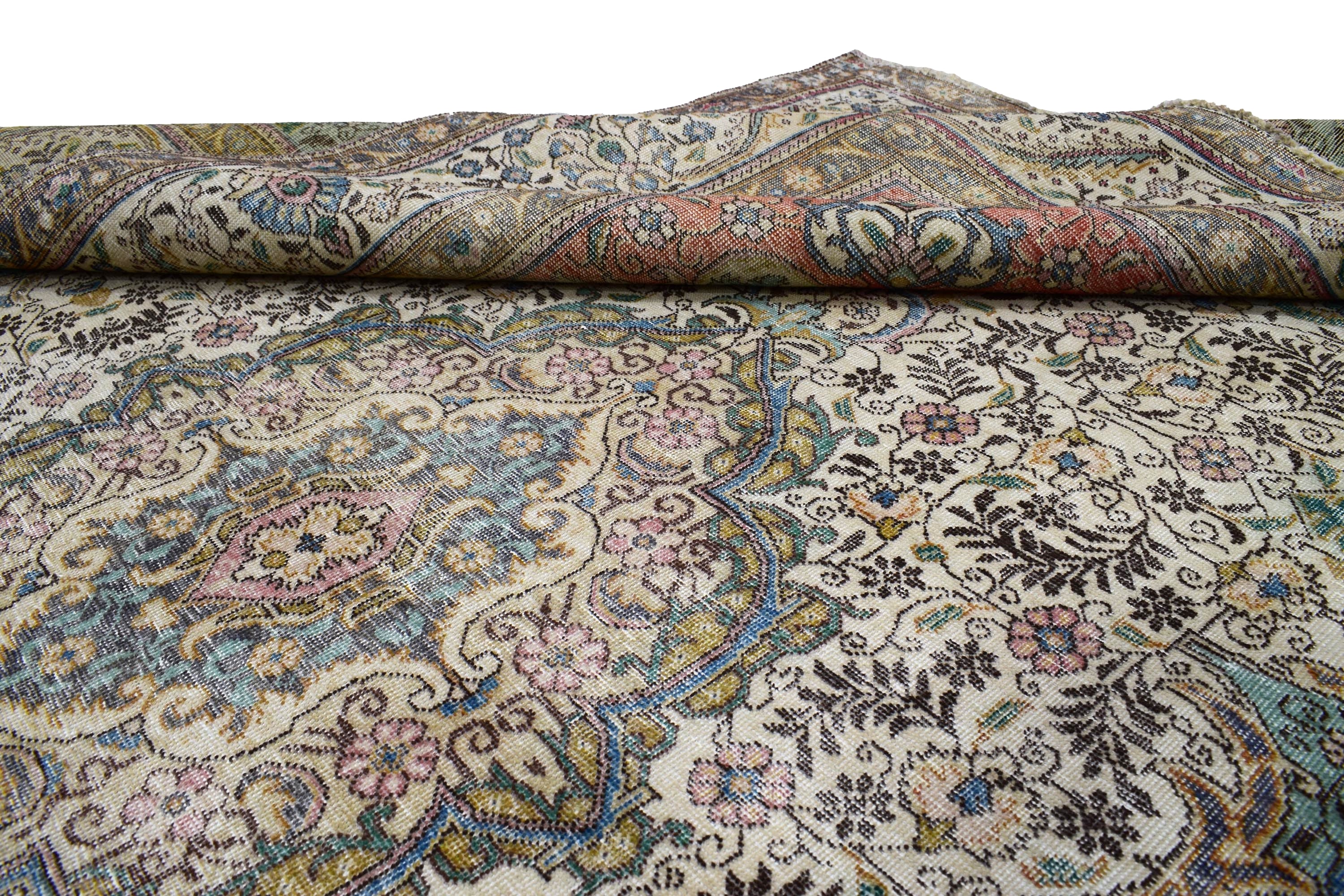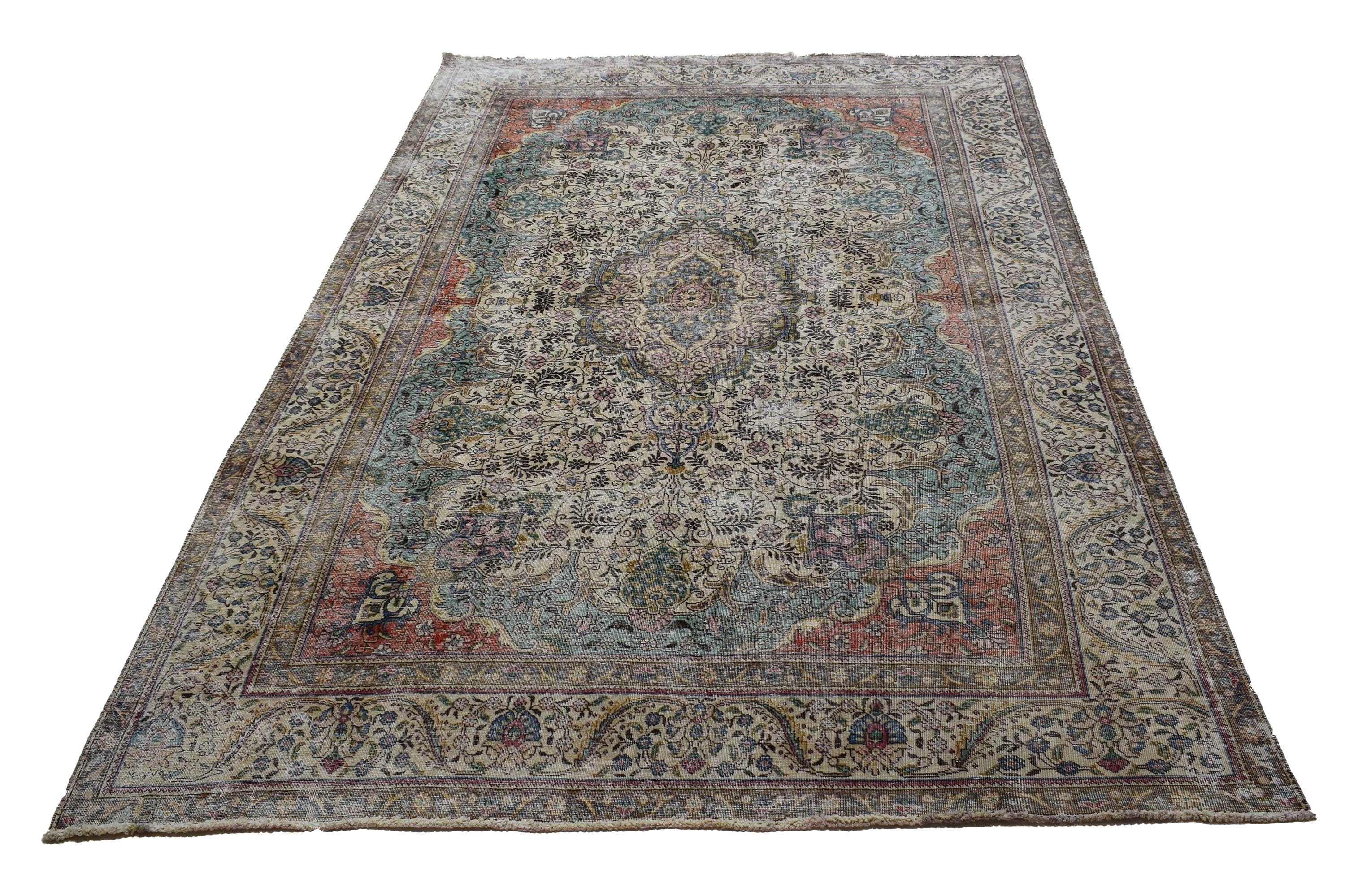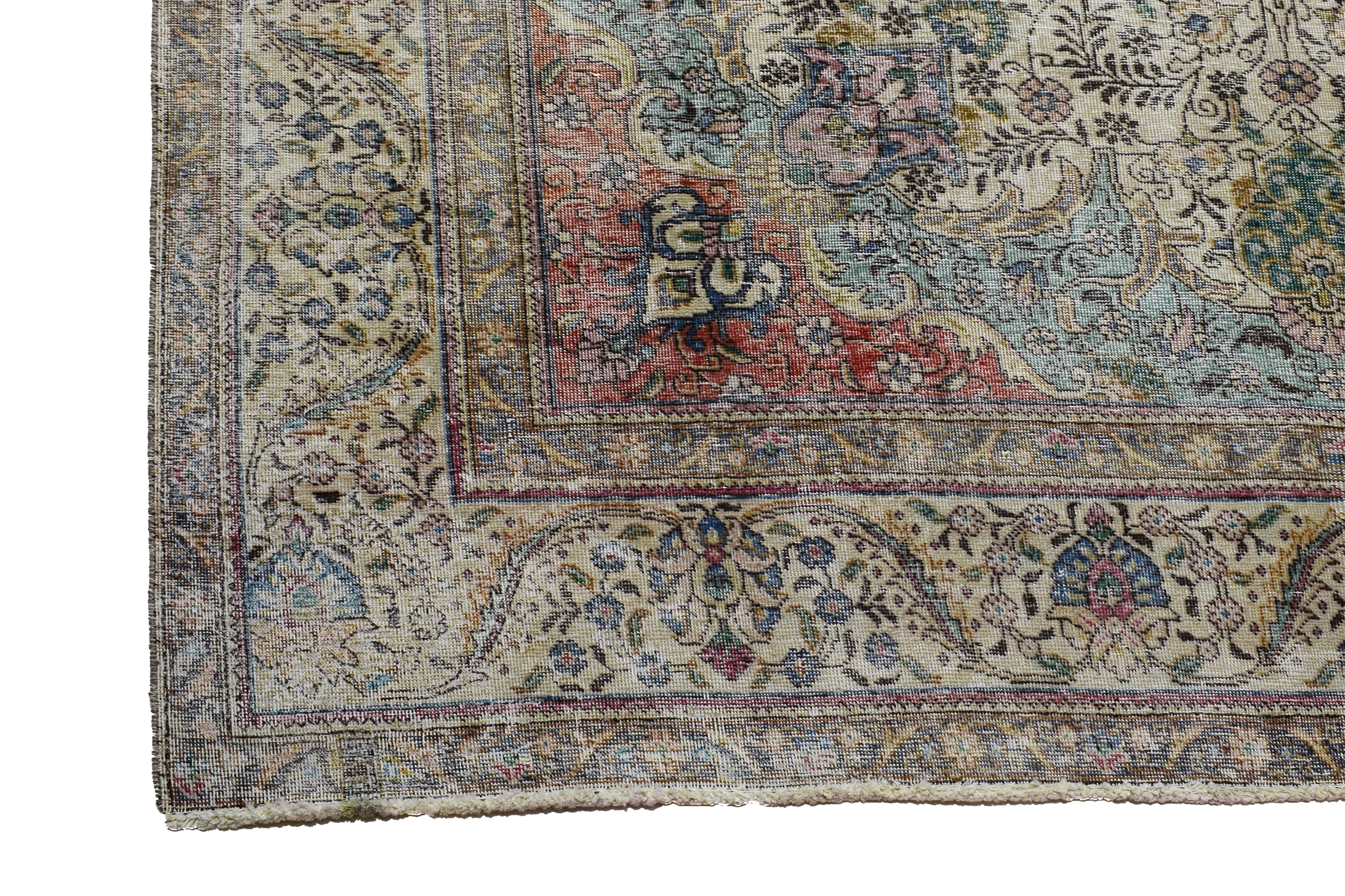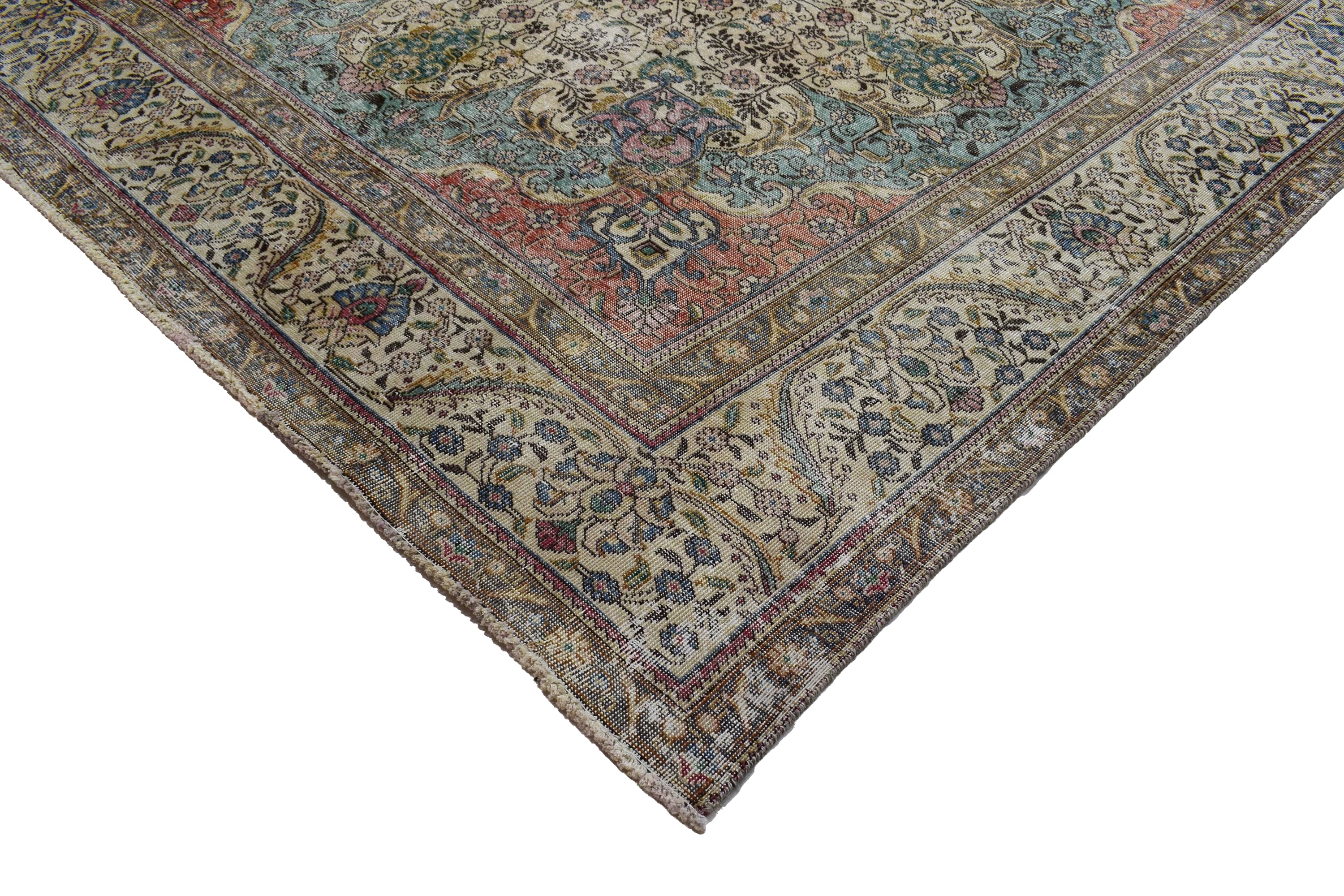 About Distressed Rug: This beautiful rug was hand-woven in 1970's in Tabriz, Iran. Later, this vintage rug has been shaved down to a lower pile to make it a faded rug on purpose. Distressed Rugs represent a trend that has achieved a crossover between fashion and home décor. This new look celebrates rugs that are faded, and worn over time; rugs that nestle into homes as if they’ve always been there. Distressed rugs are shaved rugs so they do not have a soft pile.
