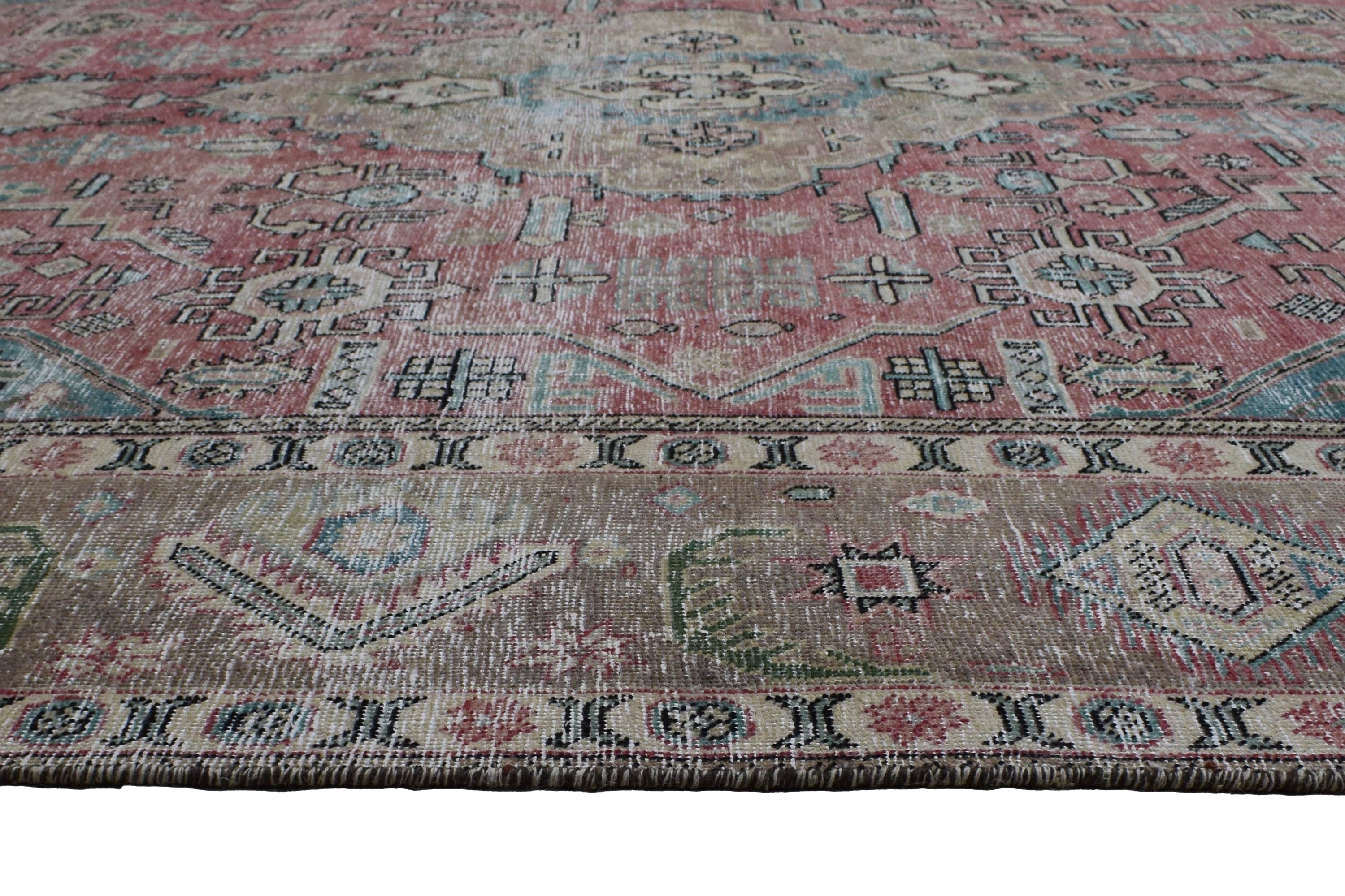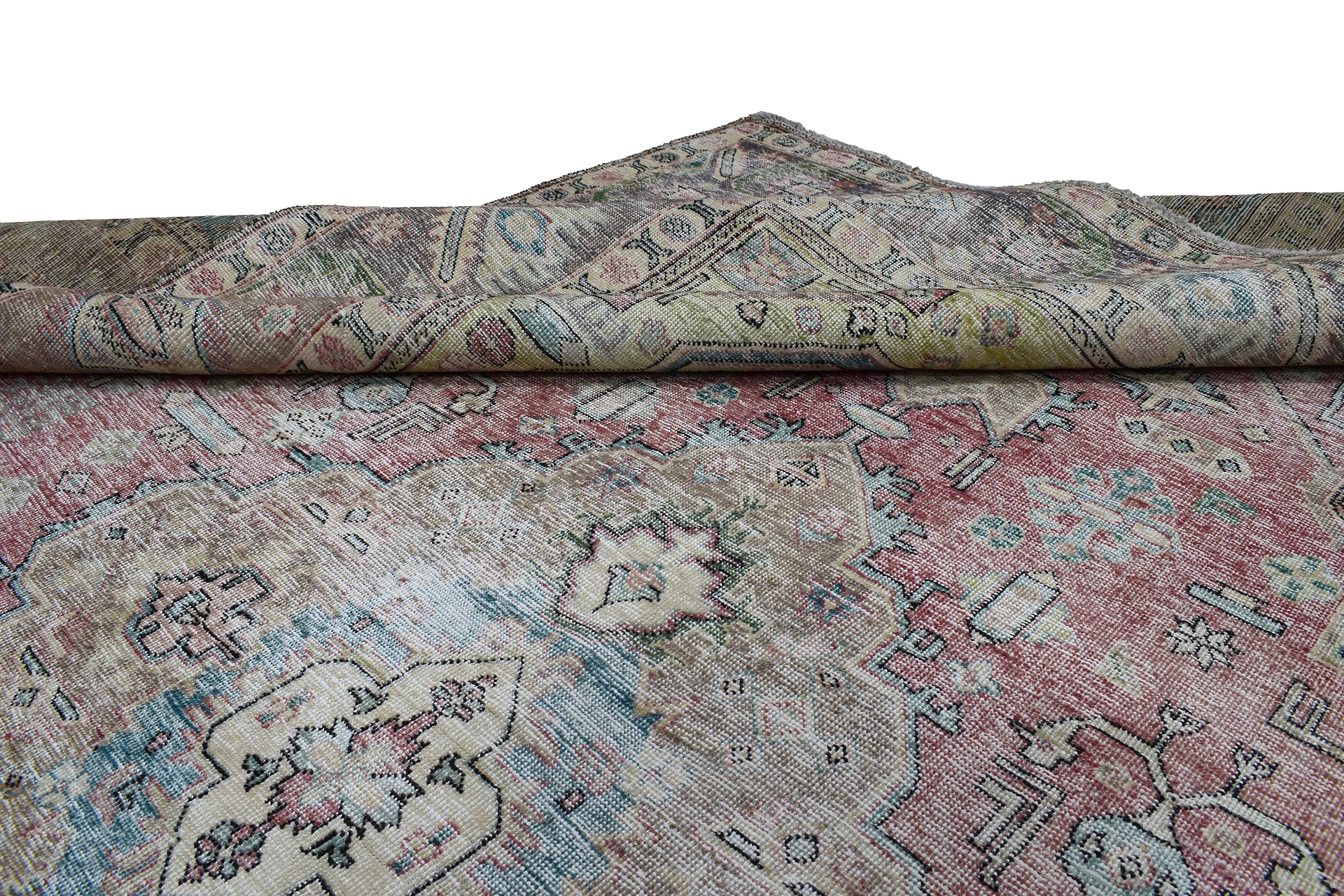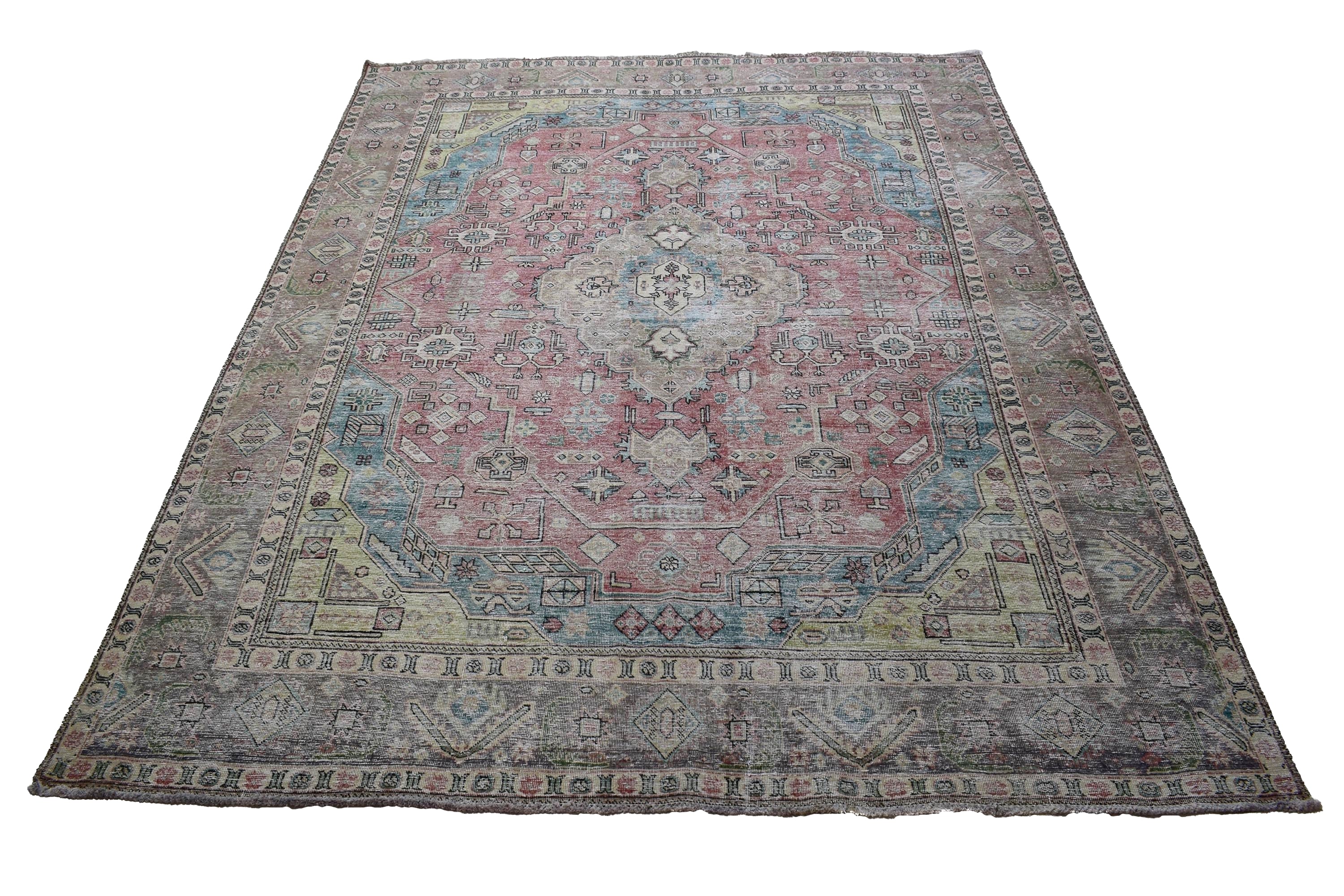 About Distressed Rug: This beautiful rug was hand-woven in 1970's in Tabriz, Iran. Later, this vintage rug has been shaved down to a lower pile to make it a faded rug on purpose. Distressed Rugs represent a trend that has achieved a crossover between fashion and home décor. This new look celebrates rugs that are faded, and worn over time; rugs that nestle into homes as if they’ve always been there. Distressed rugs are shaved rugs so they do not have a soft pile.
