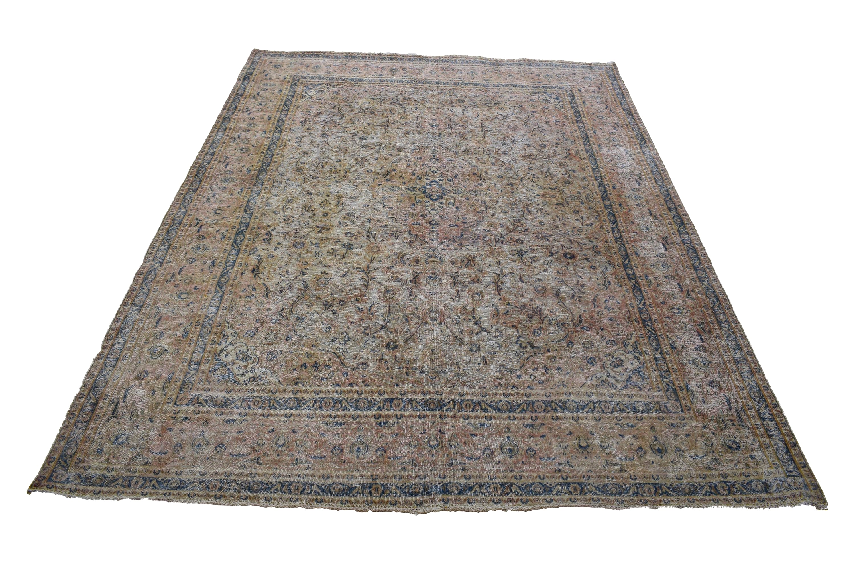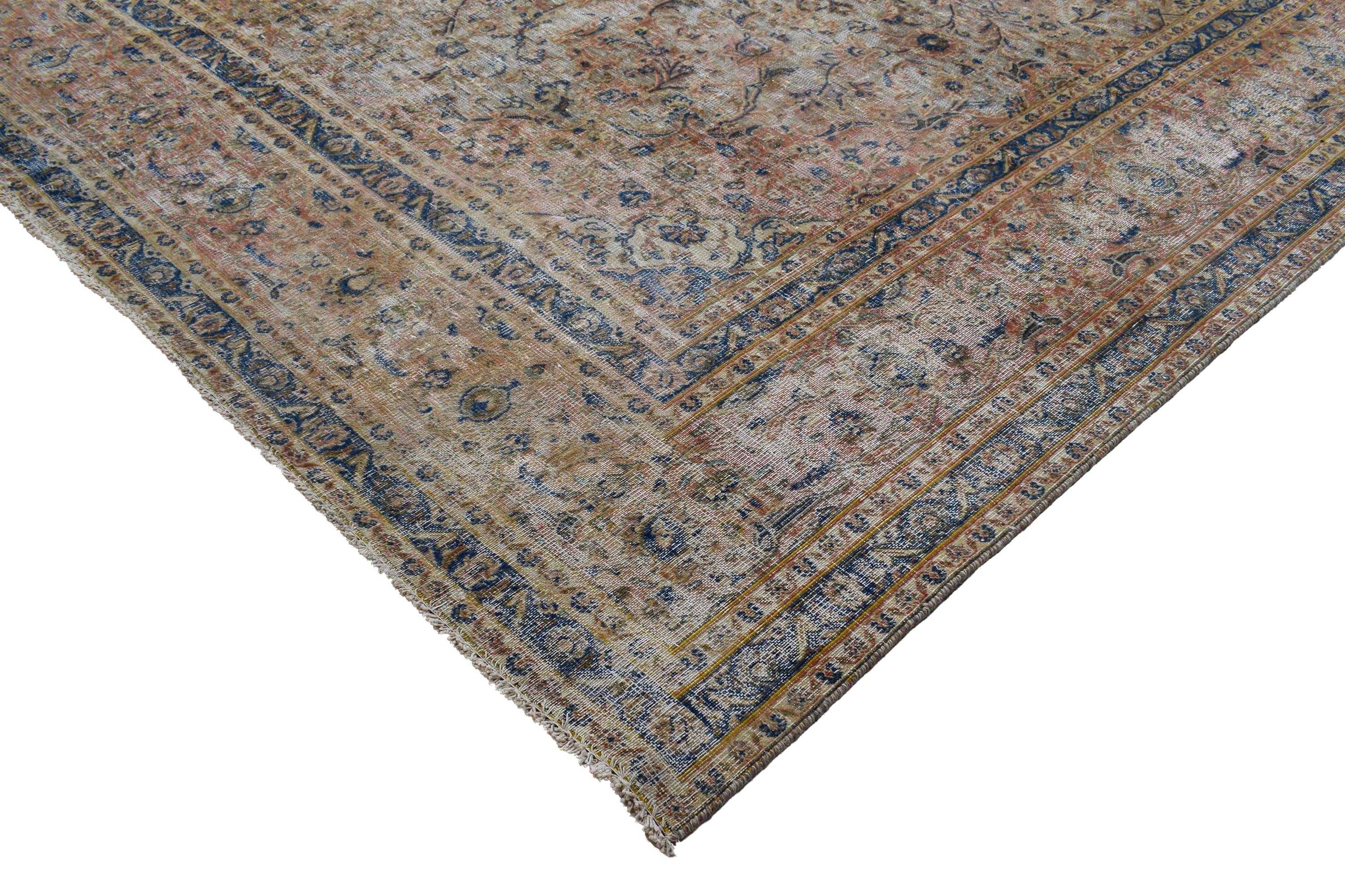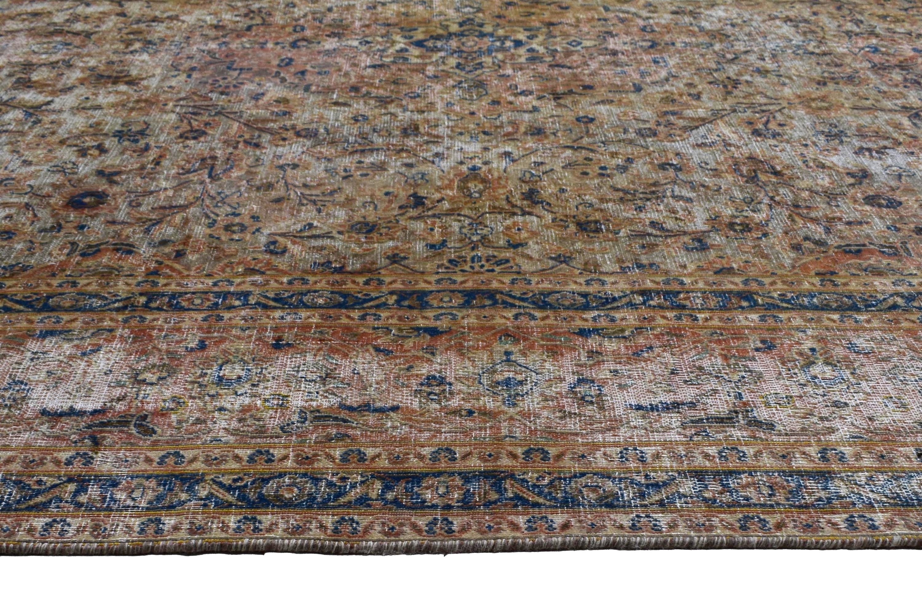 About Distressed Rug: This beautiful rug was hand-woven in 1970's in Tabriz, Iran. Later, this vintage rug has been shaved down to a lower pile to make it a faded rug on purpose. Distressed Rugs represent a trend that has achieved a crossover between fashion and home décor. This new look celebrates rugs that are faded, and worn over time; rugs that nestle into homes as if they’ve always been there. Distressed rugs are shaved rugs so they do not have a soft pile.