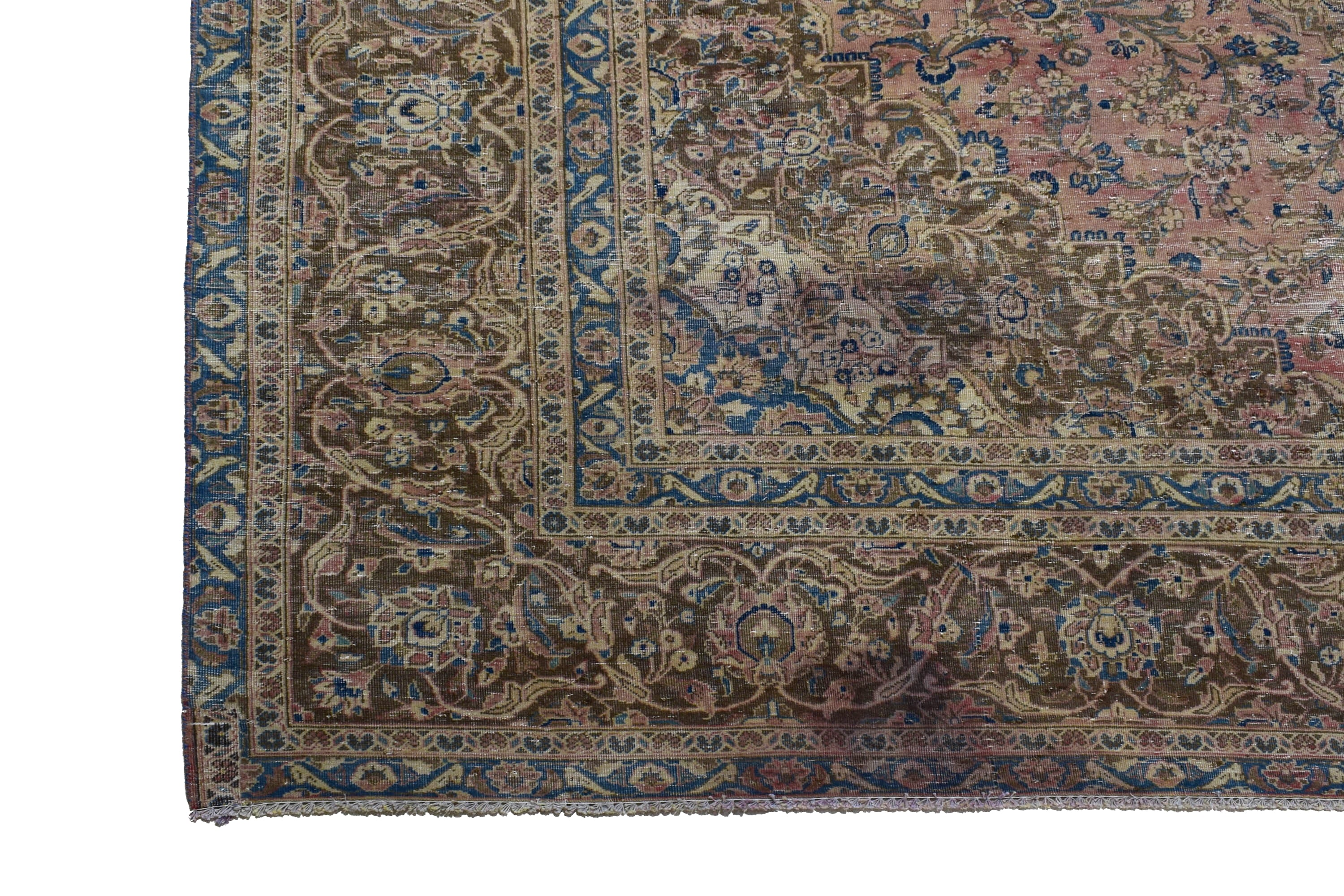About Distressed Rug: This beautiful rug was hand-woven in 1970's in Tabriz, Iran. Later, this vintage rug has been shaved down to a lower pile to make it a faded rug on purpose. Distressed Rugs represent a trend that has achieved a crossover between fashion and home décor. This new look celebrates rugs that are faded, and worn over time; rugs that nestle into homes as if they’ve always been there. Distressed rugs are shaved rugs so they do not have a soft pile.