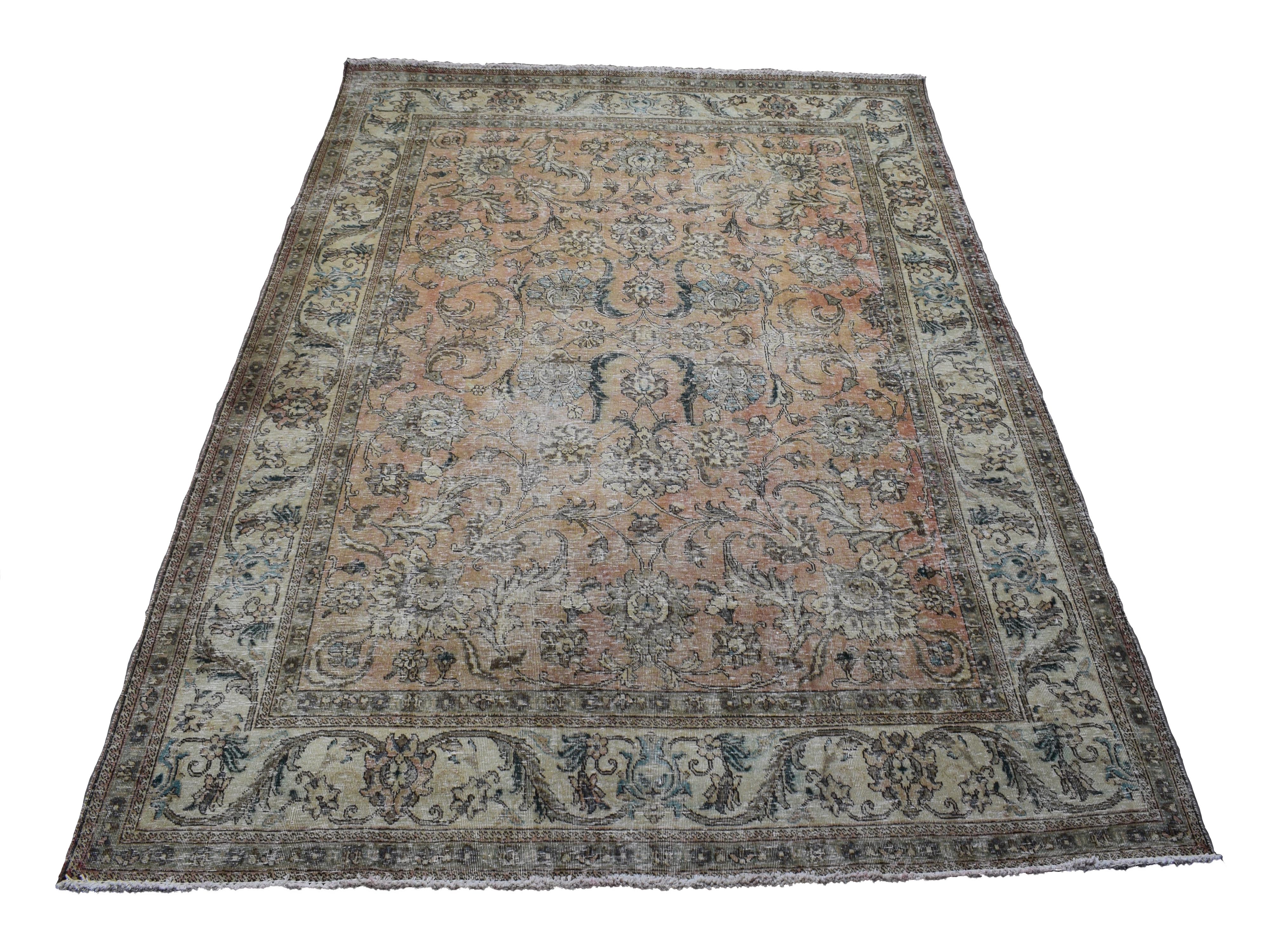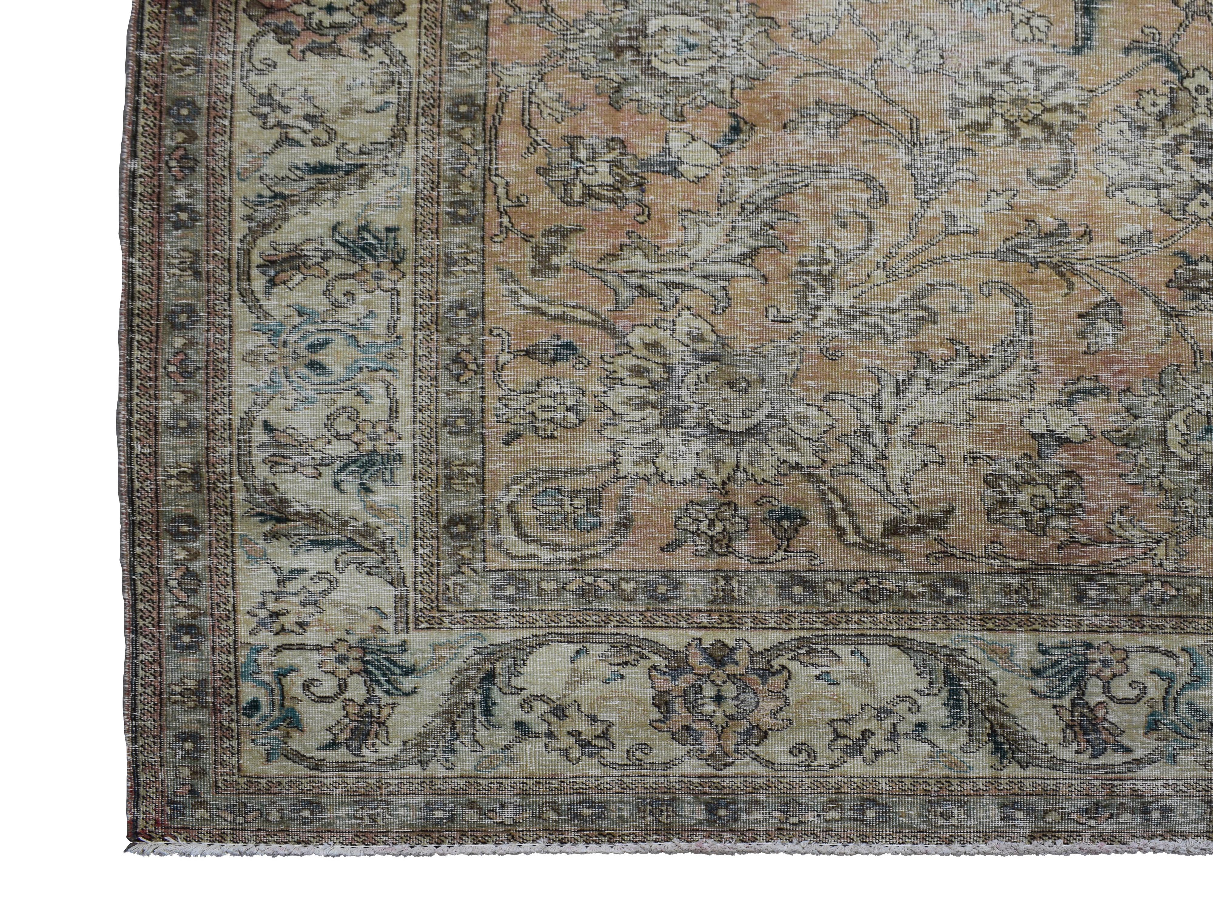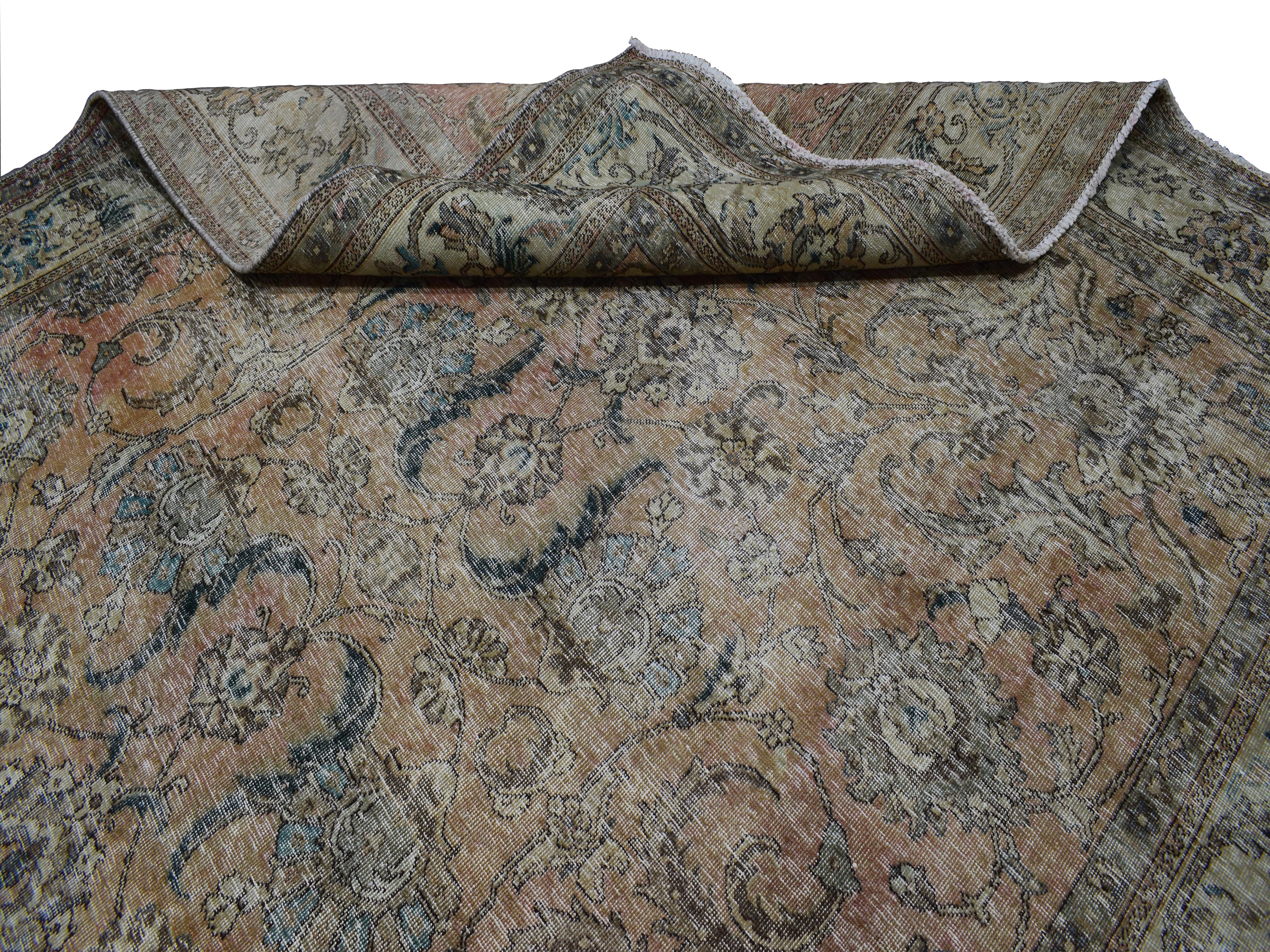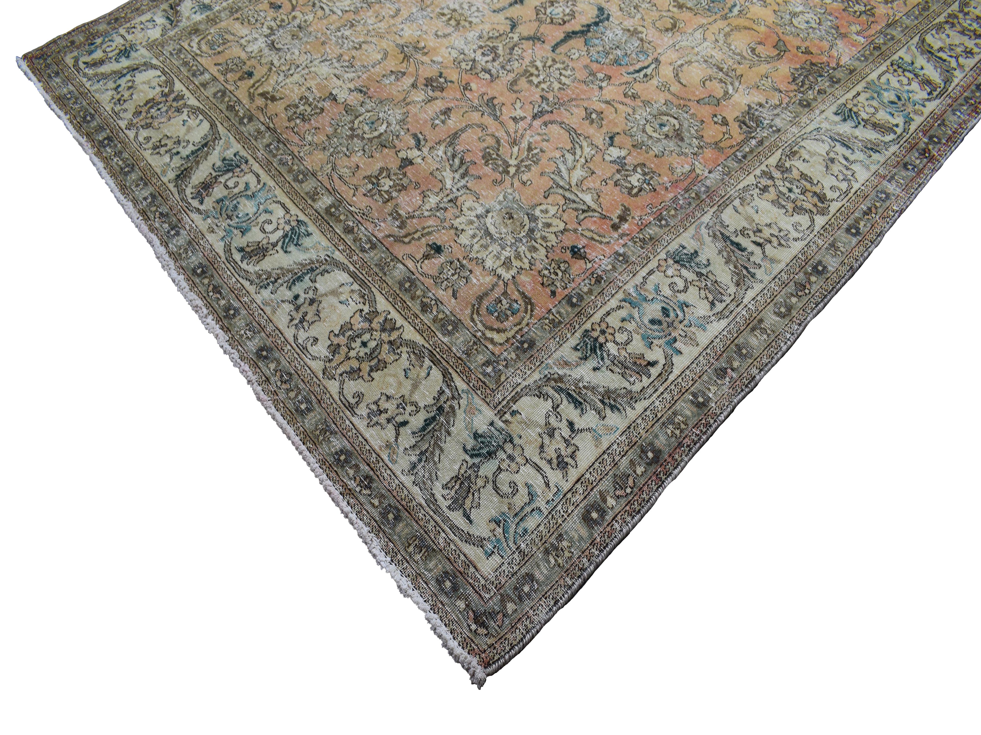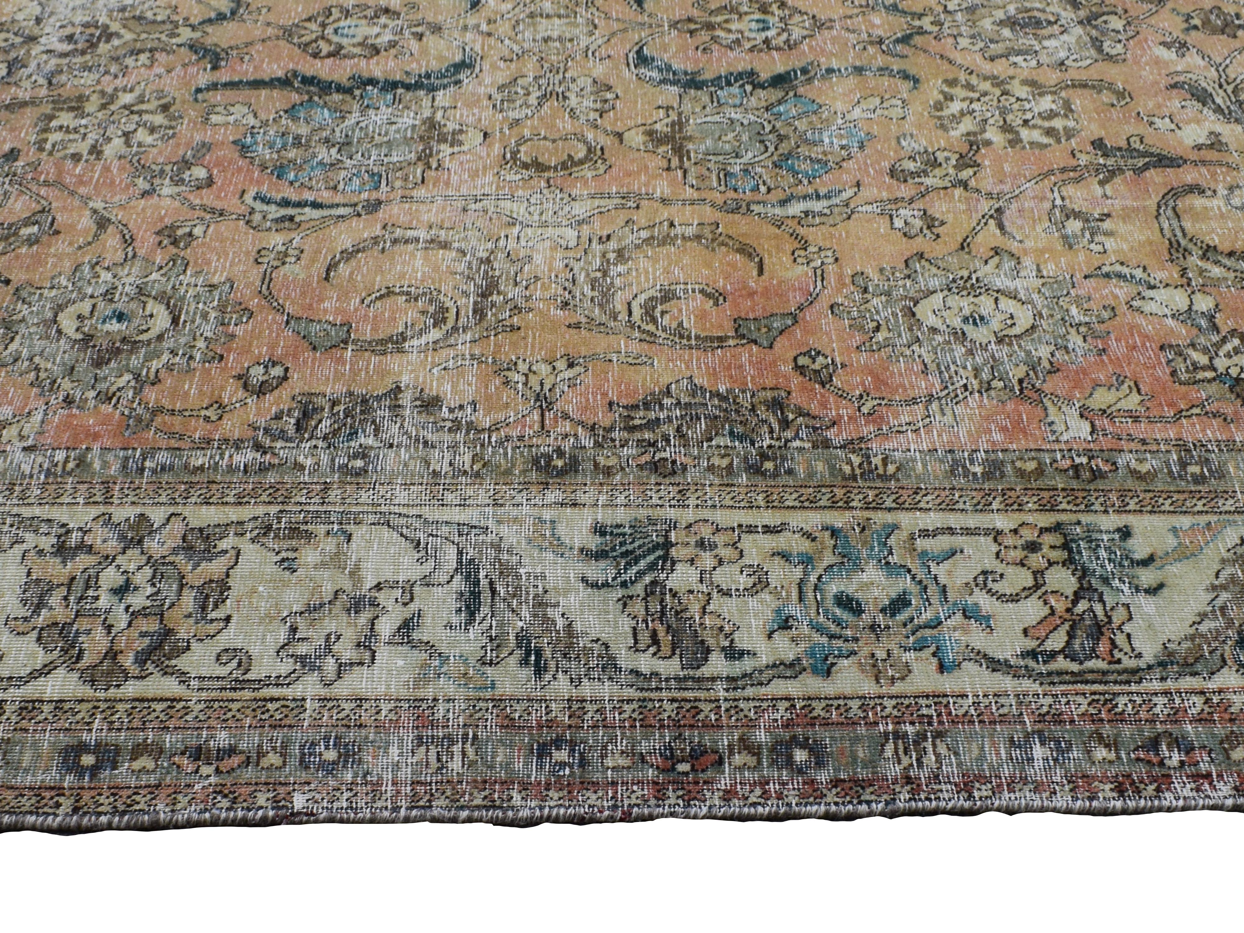 About Distressed Rug: This beautiful rug was hand-woven in 1970's in Tabriz, Iran. Later, this vintage rug has been shaved down to a lower pile to make it a faded rug on purpose. Distressed Rugs represent a trend that has achieved a crossover between fashion and home décor. This new look celebrates rugs that are faded, and worn over time; rugs that nestle into homes as if they’ve always been there. Distressed rugs are shaved rugs so they do not have a soft pile.