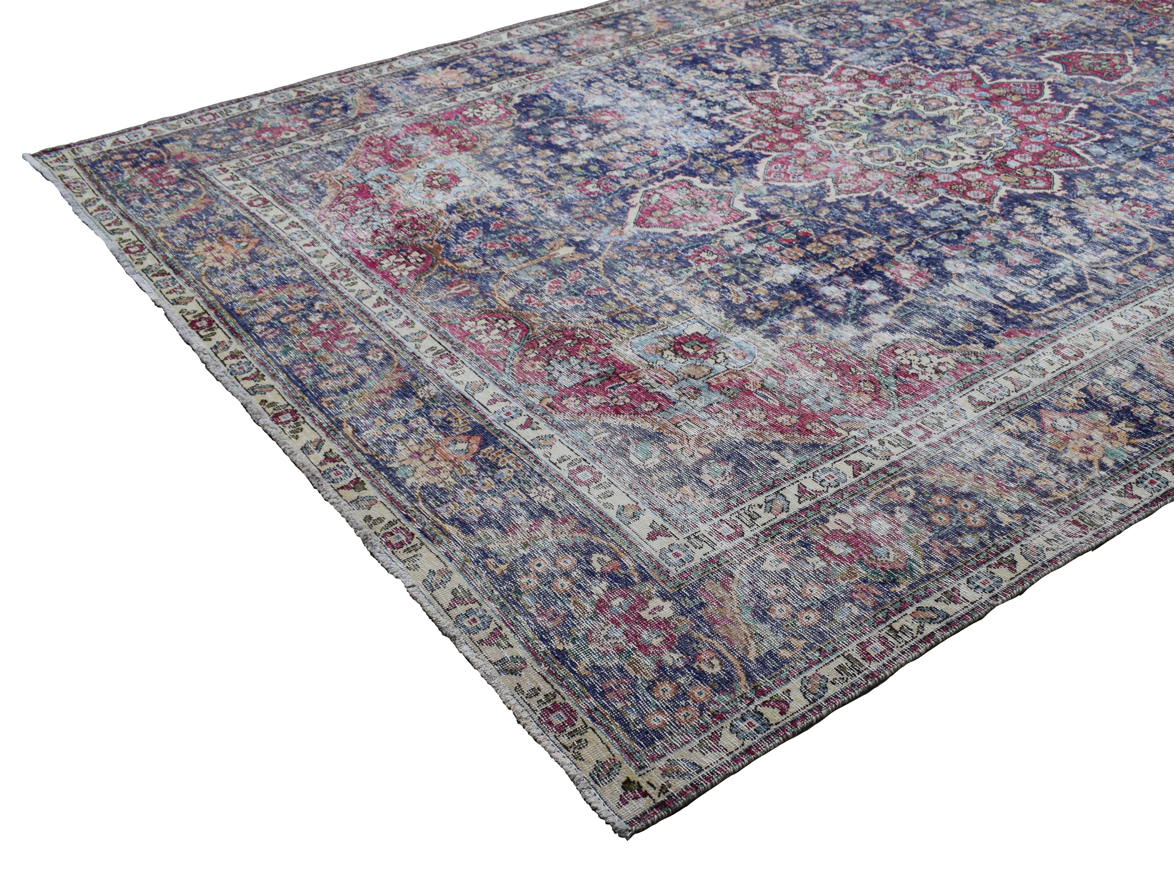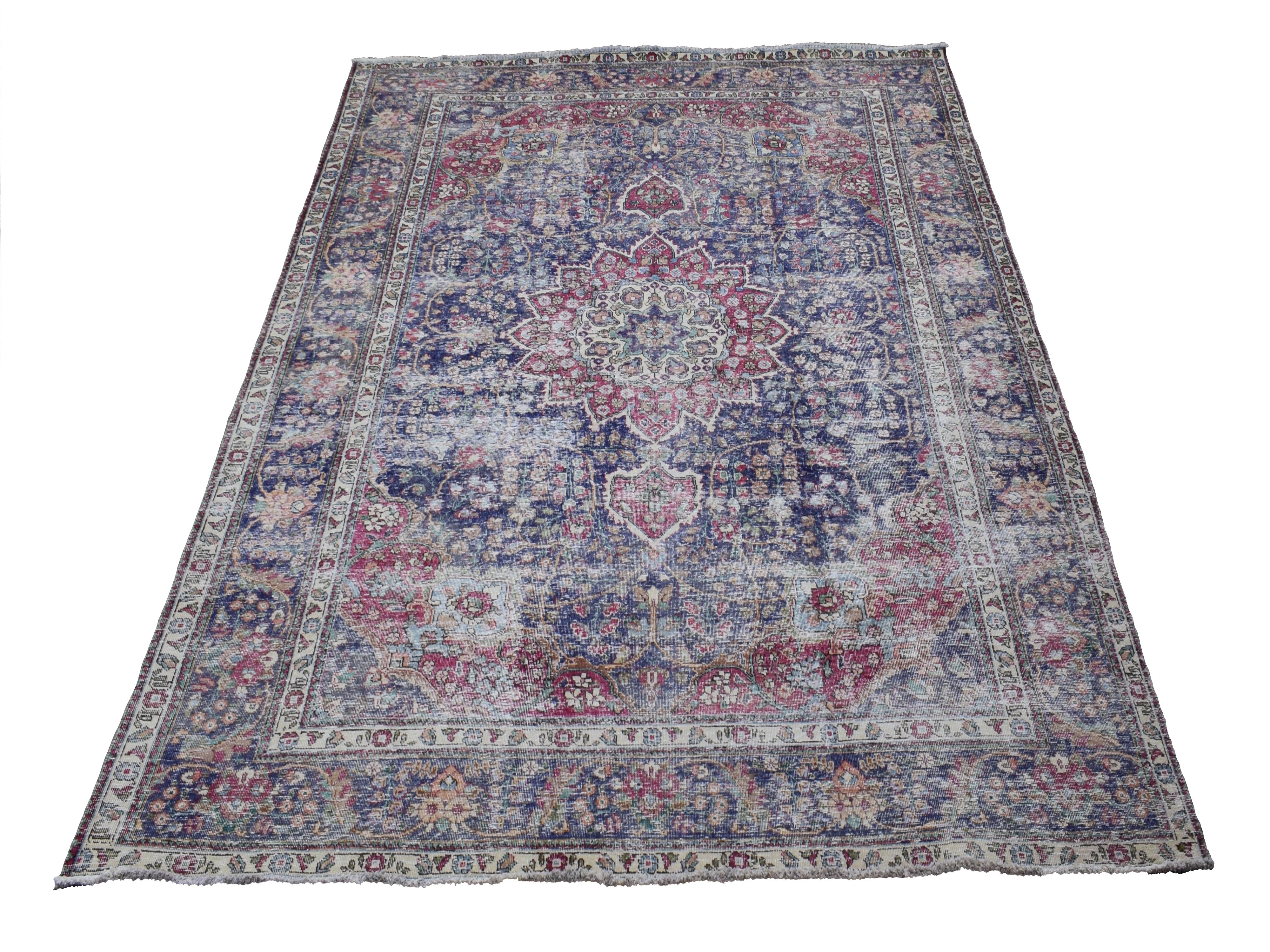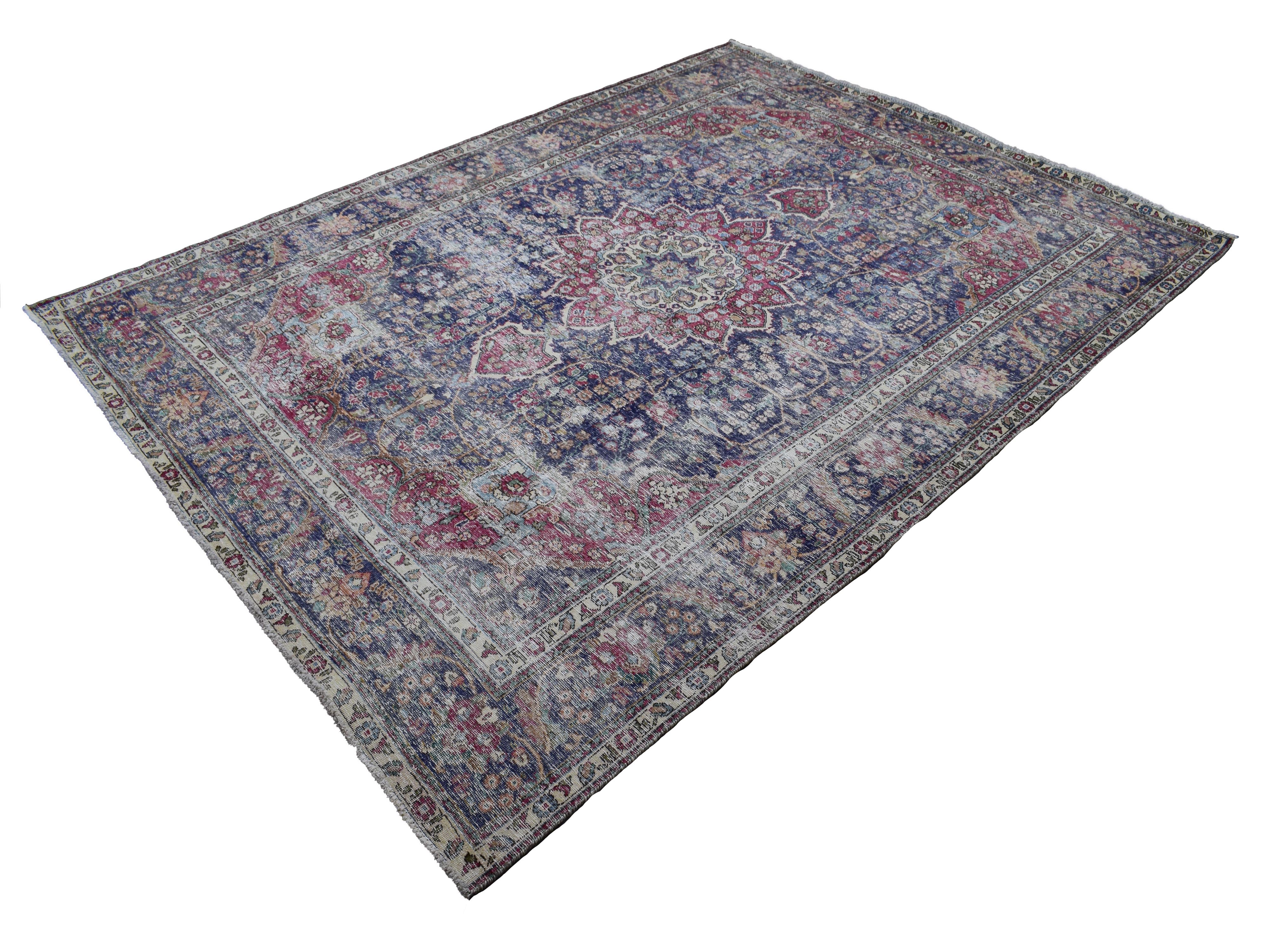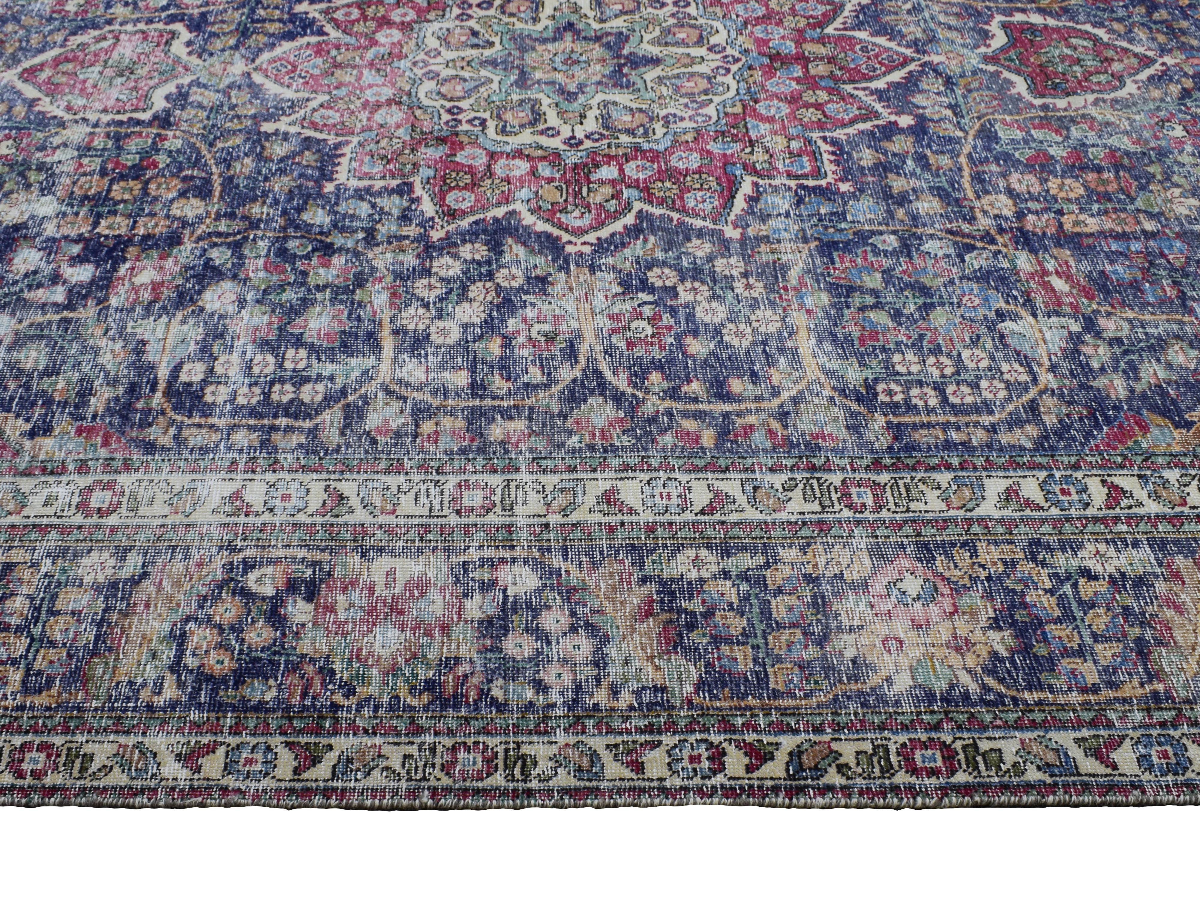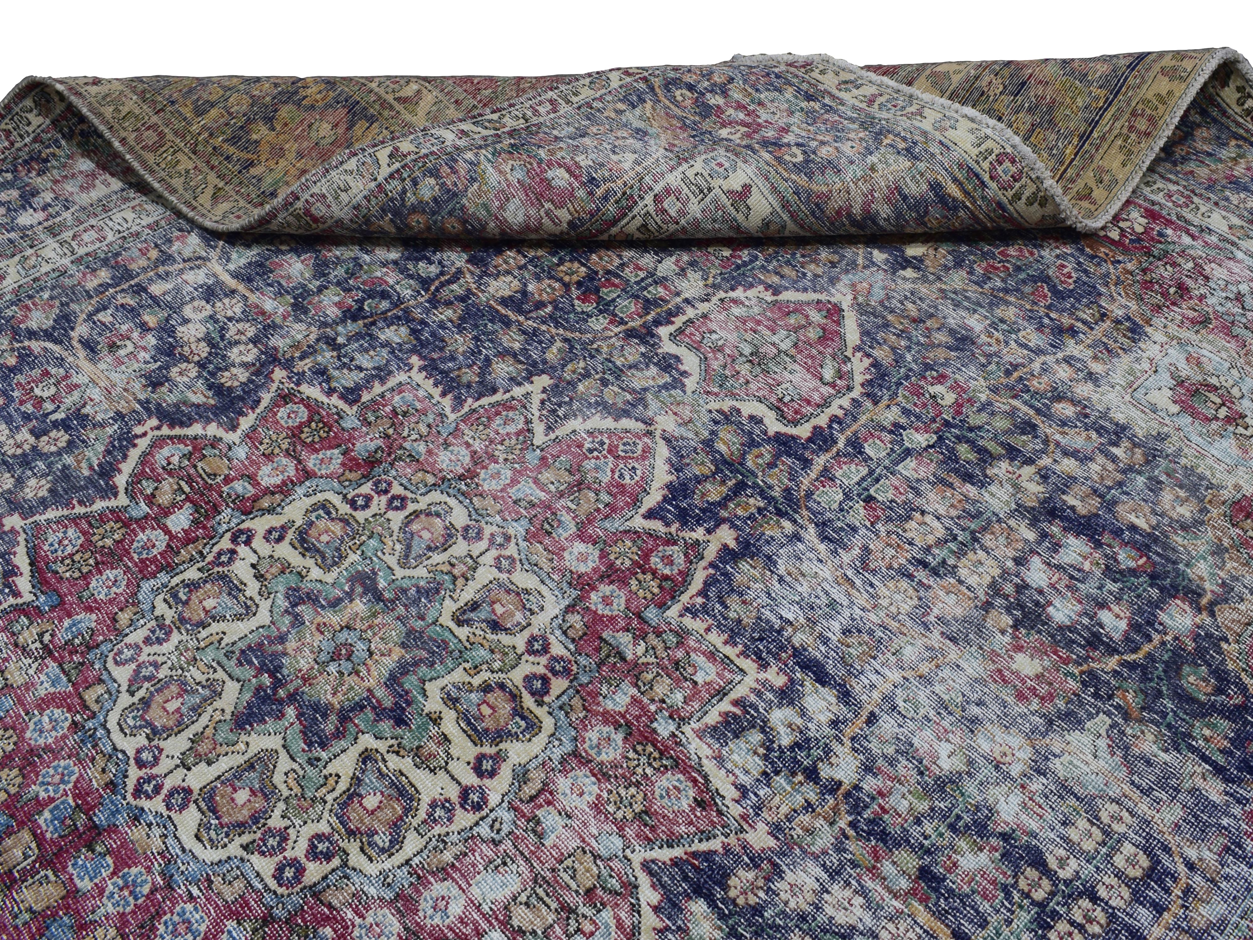 About Distressed Rug: This beautiful rug was hand-woven in 1970's in Tabriz, Iran. Later, this vintage rug has been shaved down to a lower pile to make it a faded rug on purpose. Distressed Rugs represent a trend that has achieved a crossover between fashion and home décor. This new look celebrates rugs that are faded, and worn over time; rugs that nestle into homes as if they’ve always been there. Distressed rugs are shaved rugs so they do not have a soft pile.