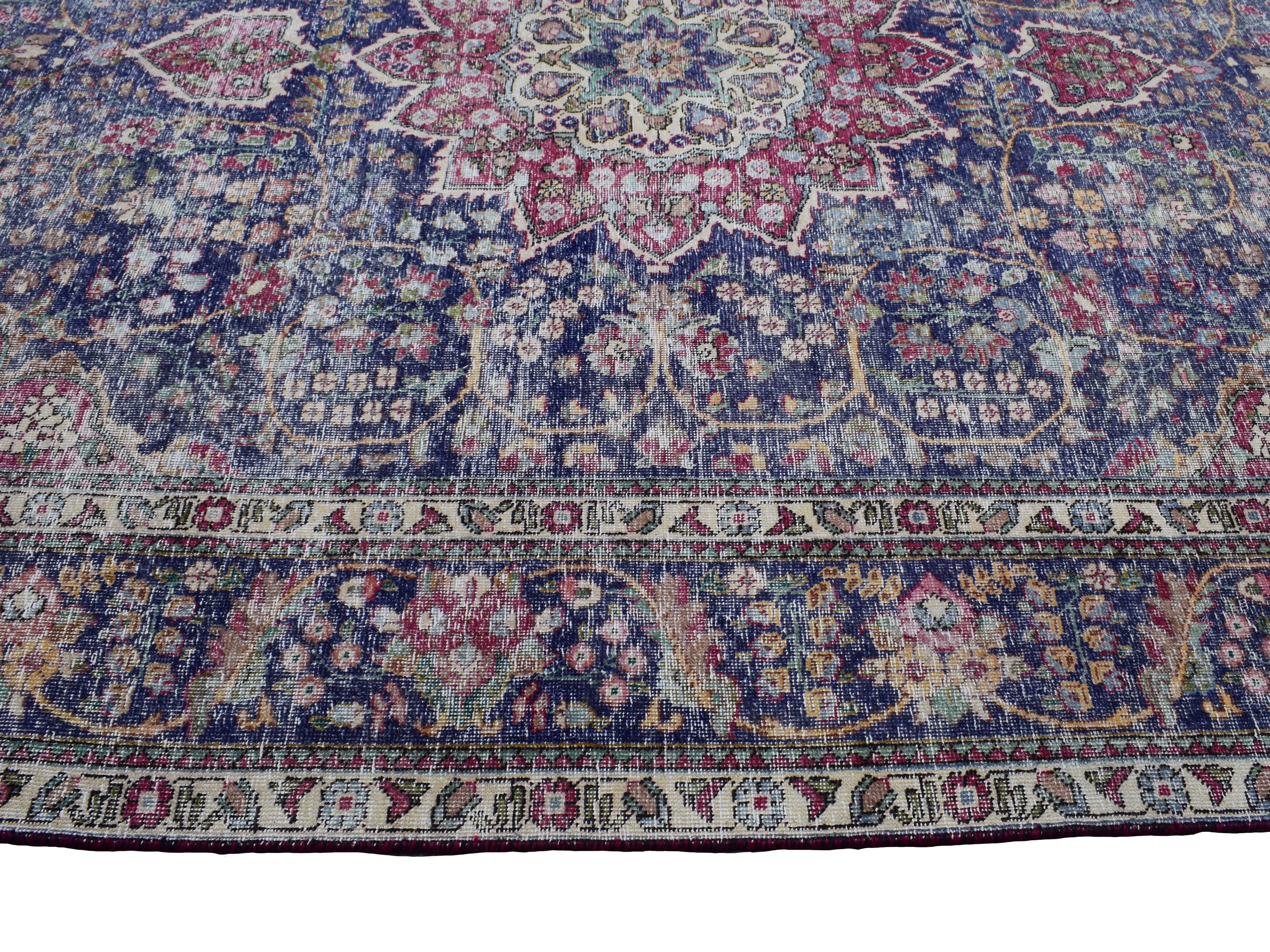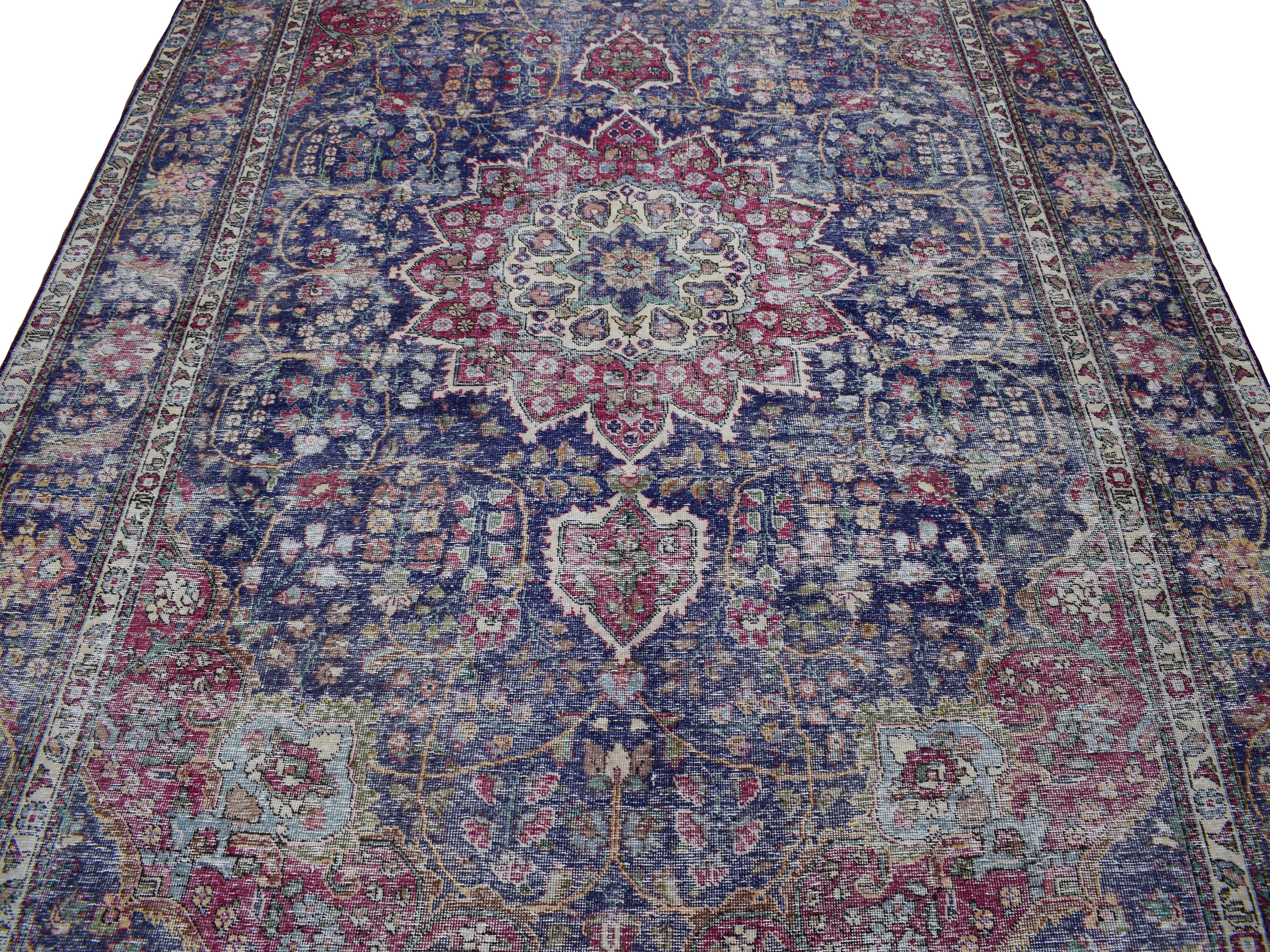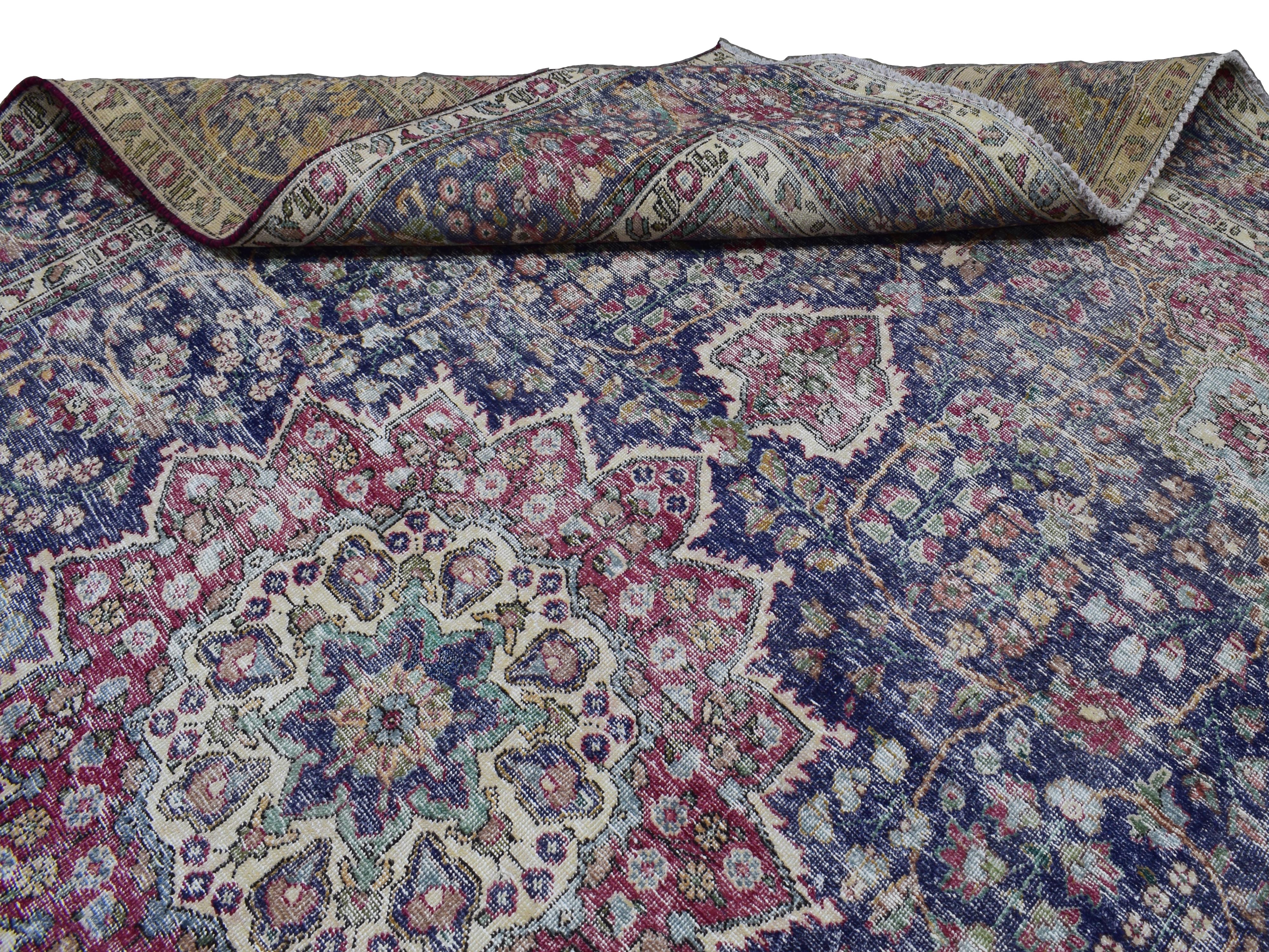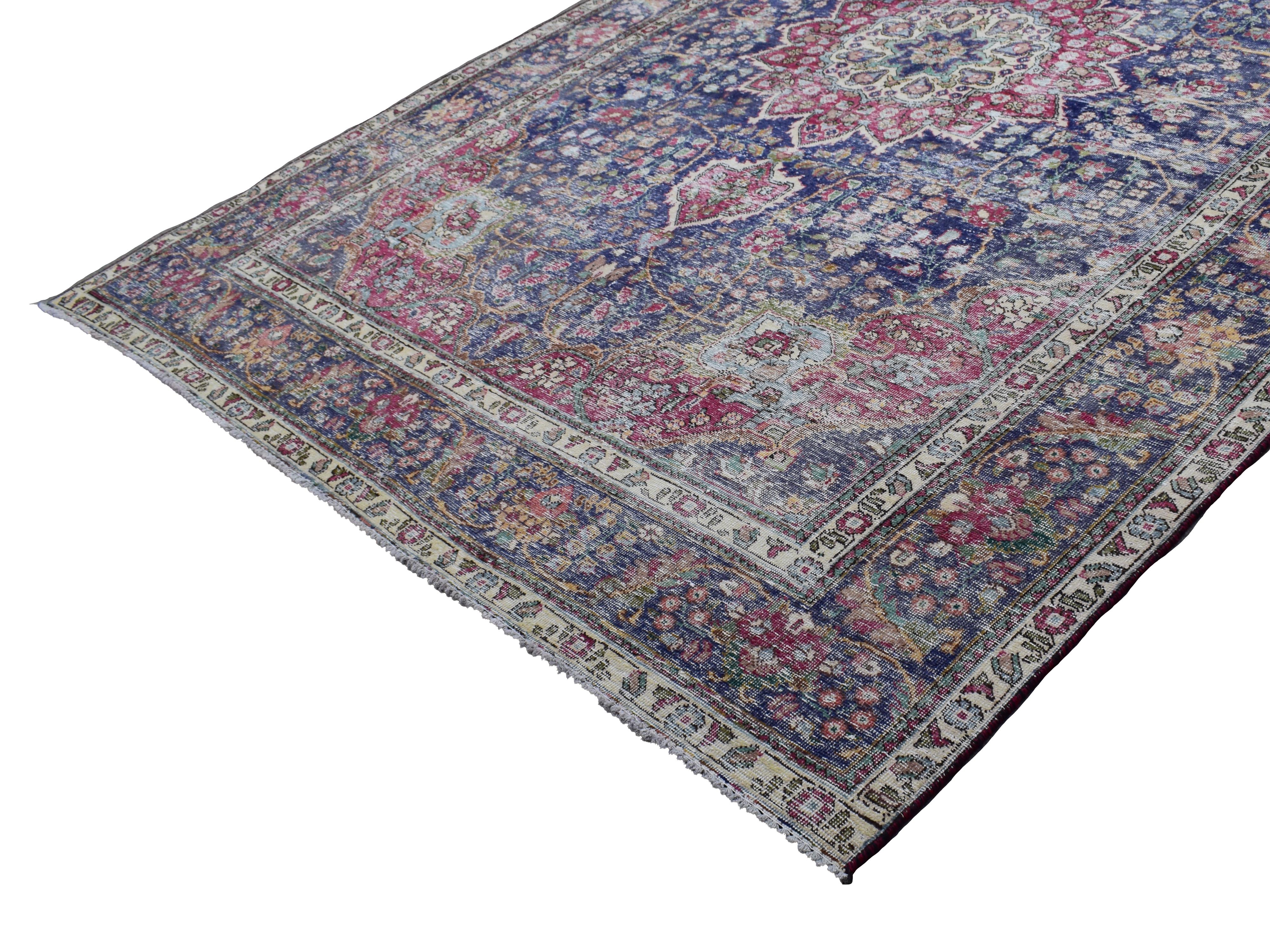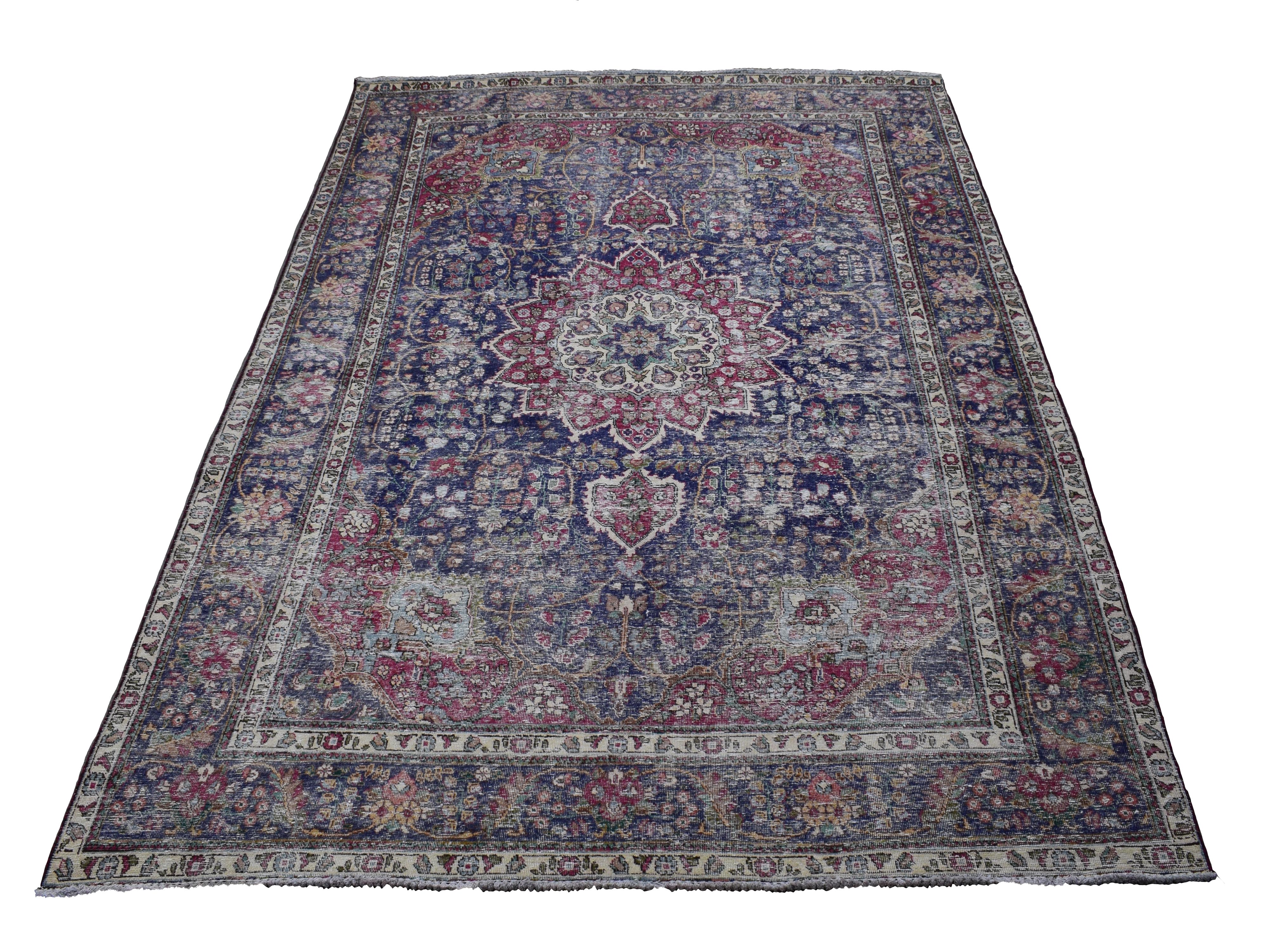 About Distressed Rug: This beautiful rug was hand-woven in 1970's in Tabriz, Iran. Later, this vintage rug has been shaved down to a lower pile to make it a faded rug on purpose. Distressed Rugs represent a trend that has achieved a crossover between fashion and home décor. This new look celebrates rugs that are faded, and worn over time; rugs that nestle into homes as if they’ve always been there. Distressed rugs are shaved rugs so they do not have a soft pile.