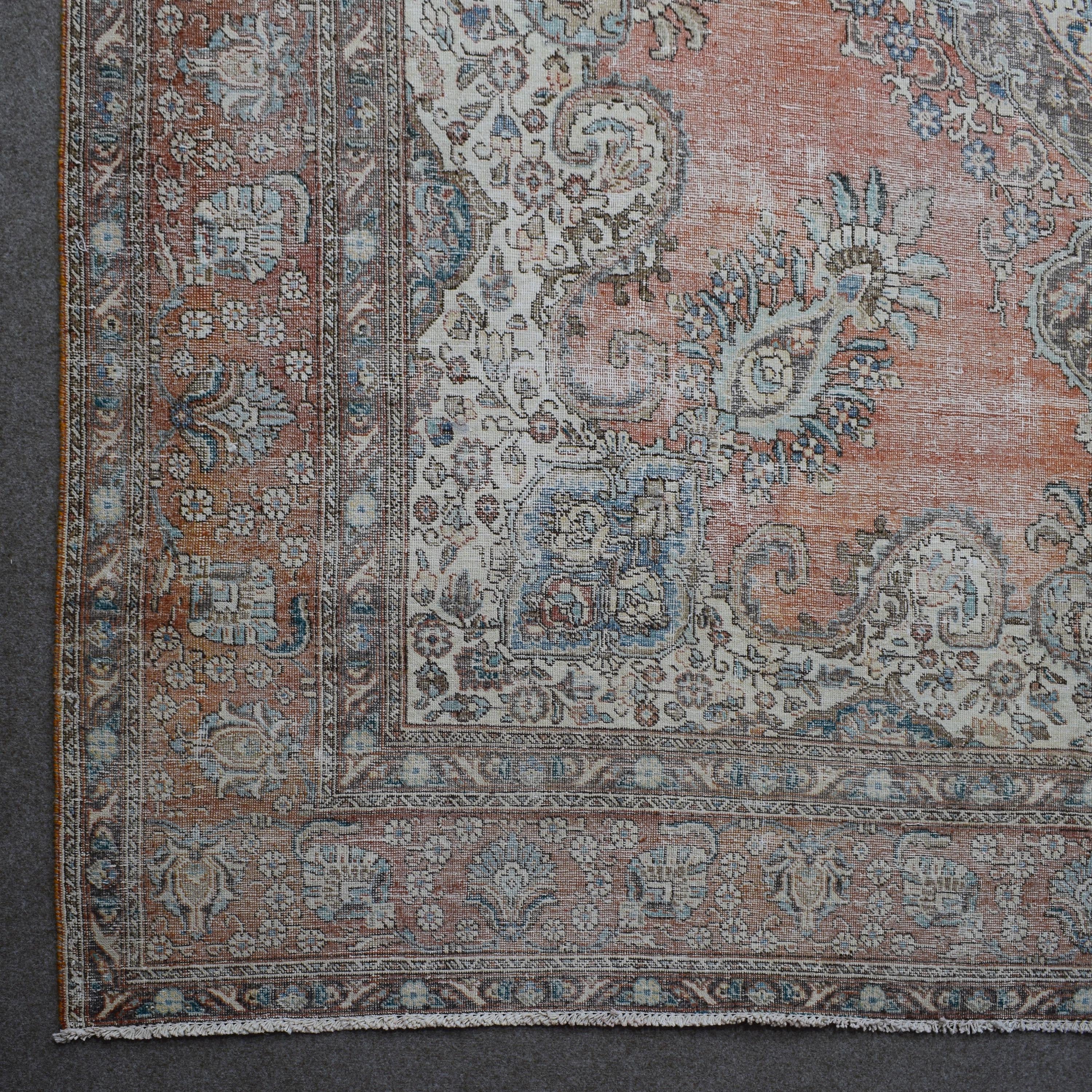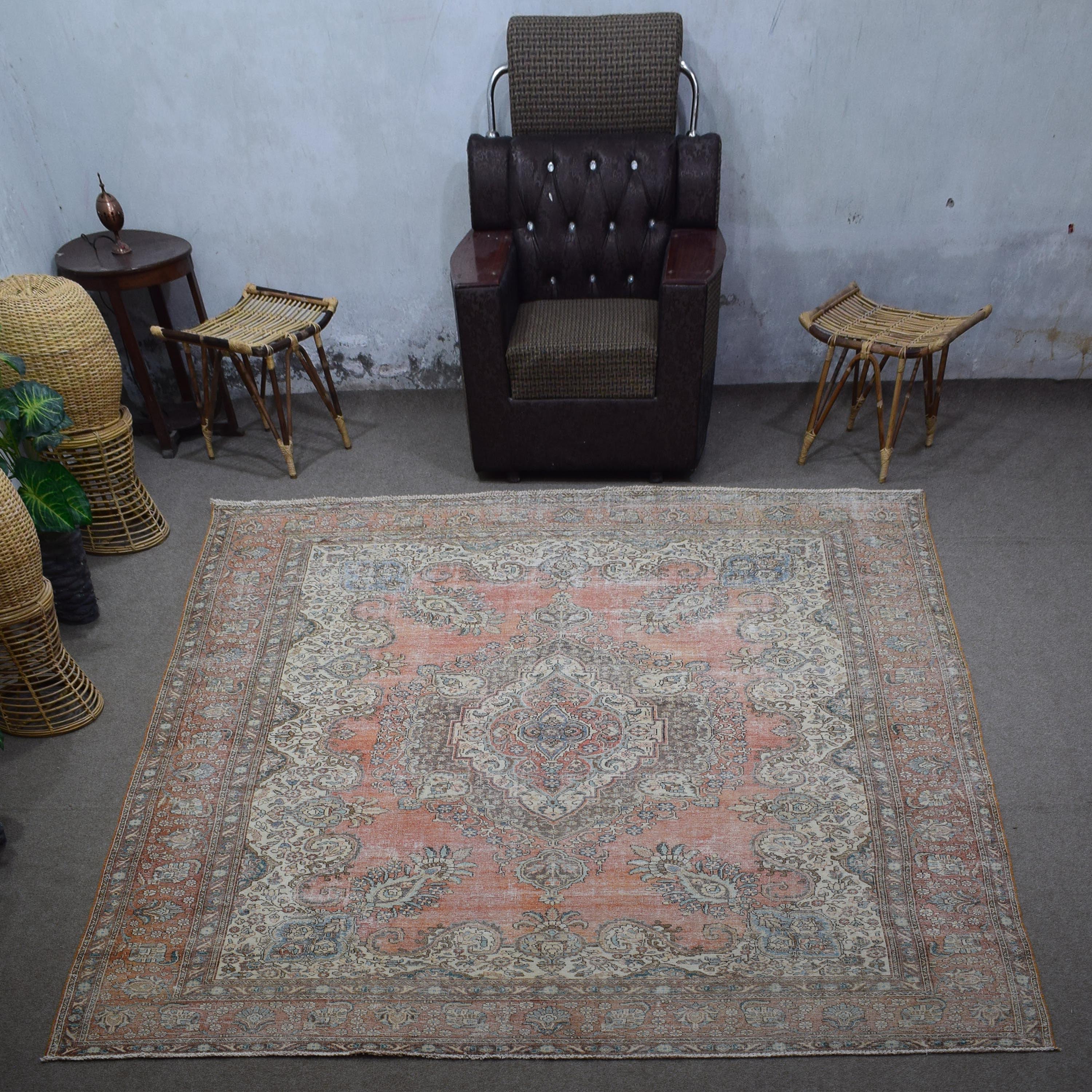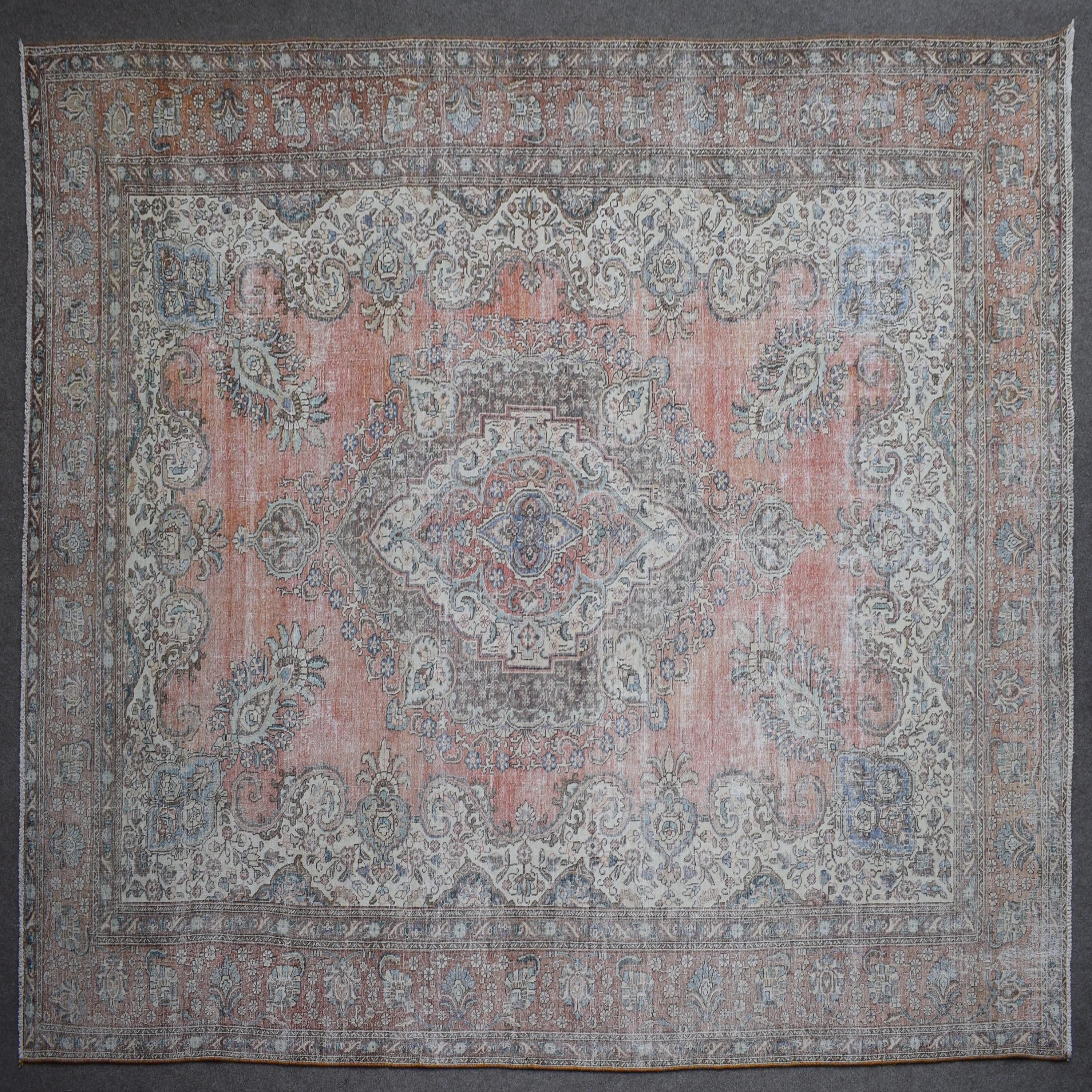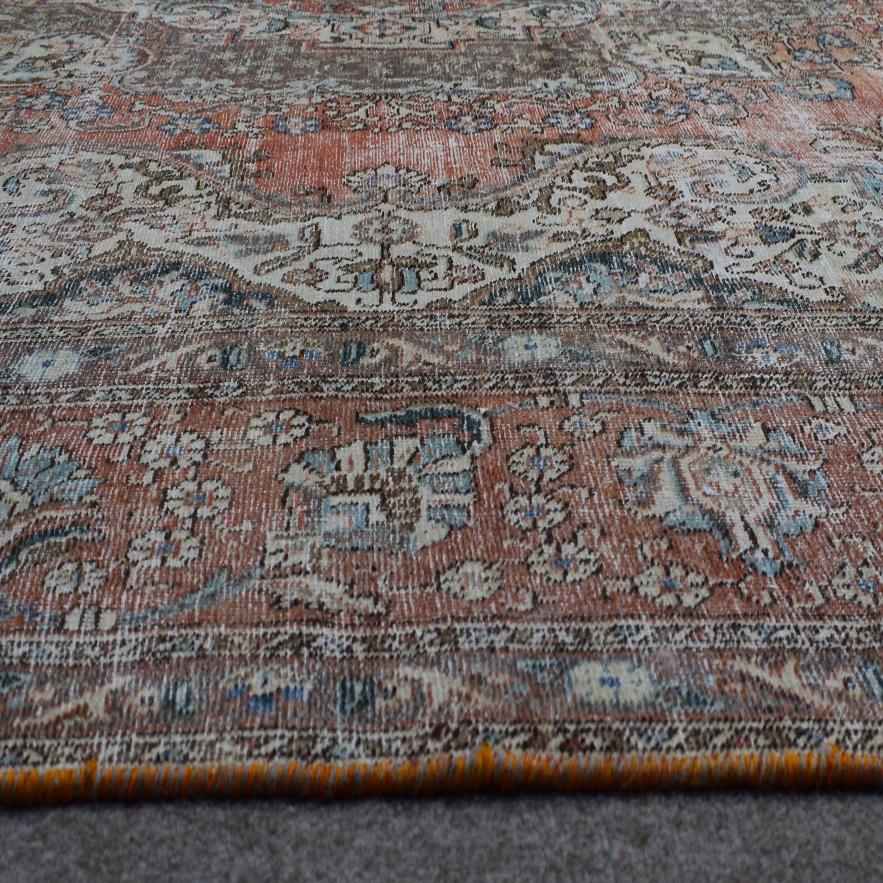 About Distressed Rug: This beautiful rug was hand-woven in 1970's in Tabriz, Iran. Later, this vintage rug has been shaved down to a lower pile to make it a faded rug on purpose. Distressed Rugs represent a trend that has achieved a crossover between fashion and home décor. This new look celebrates rugs that are faded, and worn over time; rugs that nestle into homes as if they’ve always been there. Distressed rugs are shaved rugs so they do not have a soft pile.