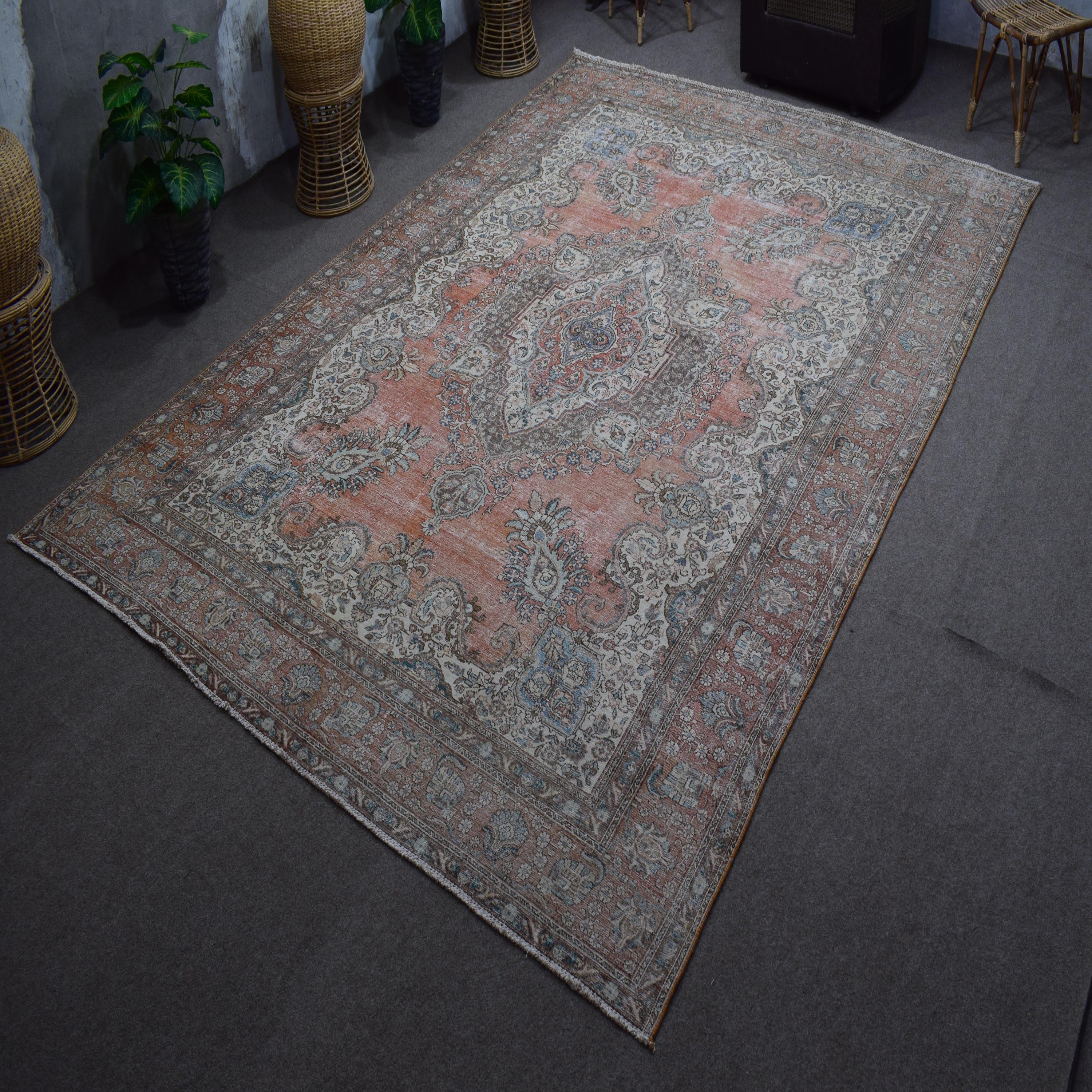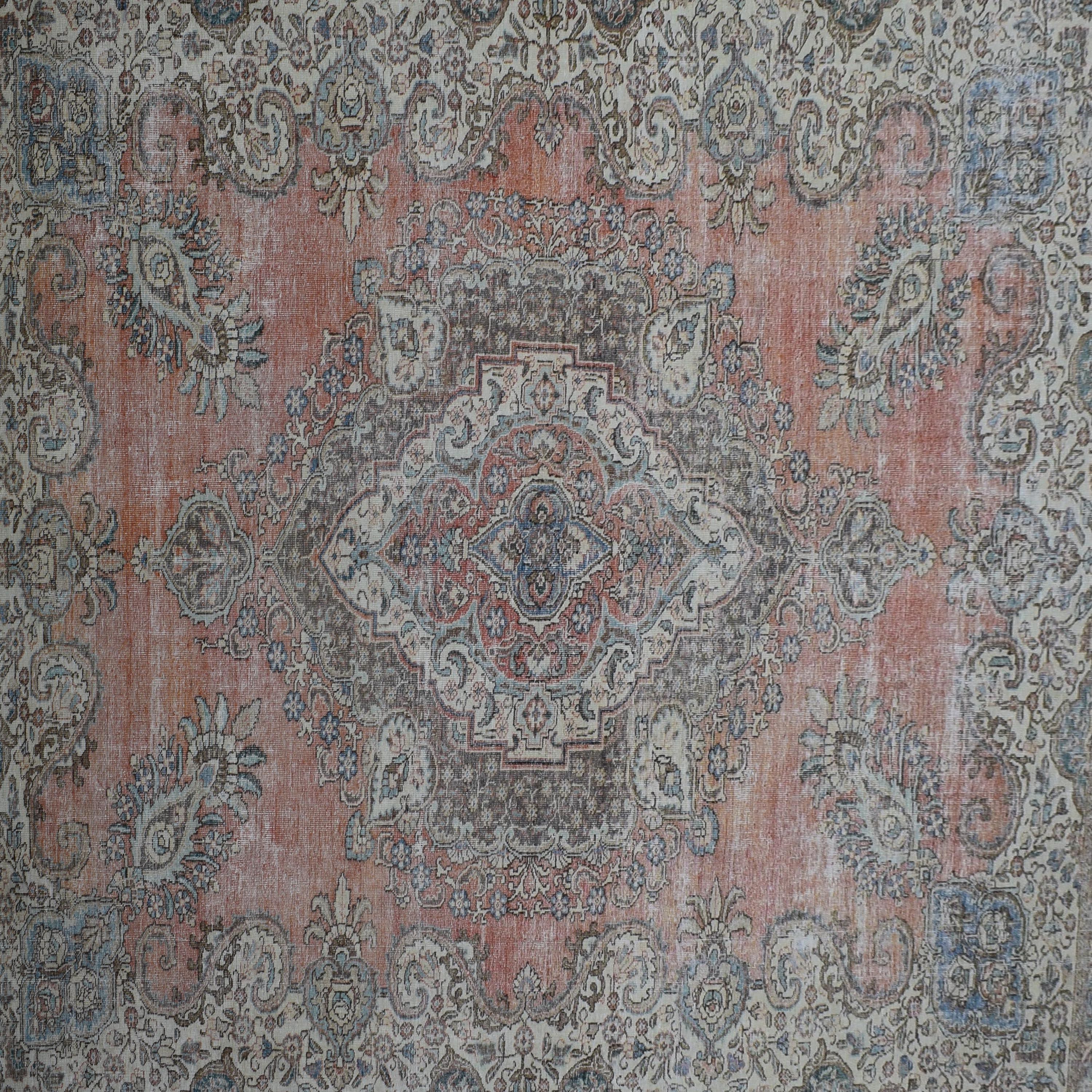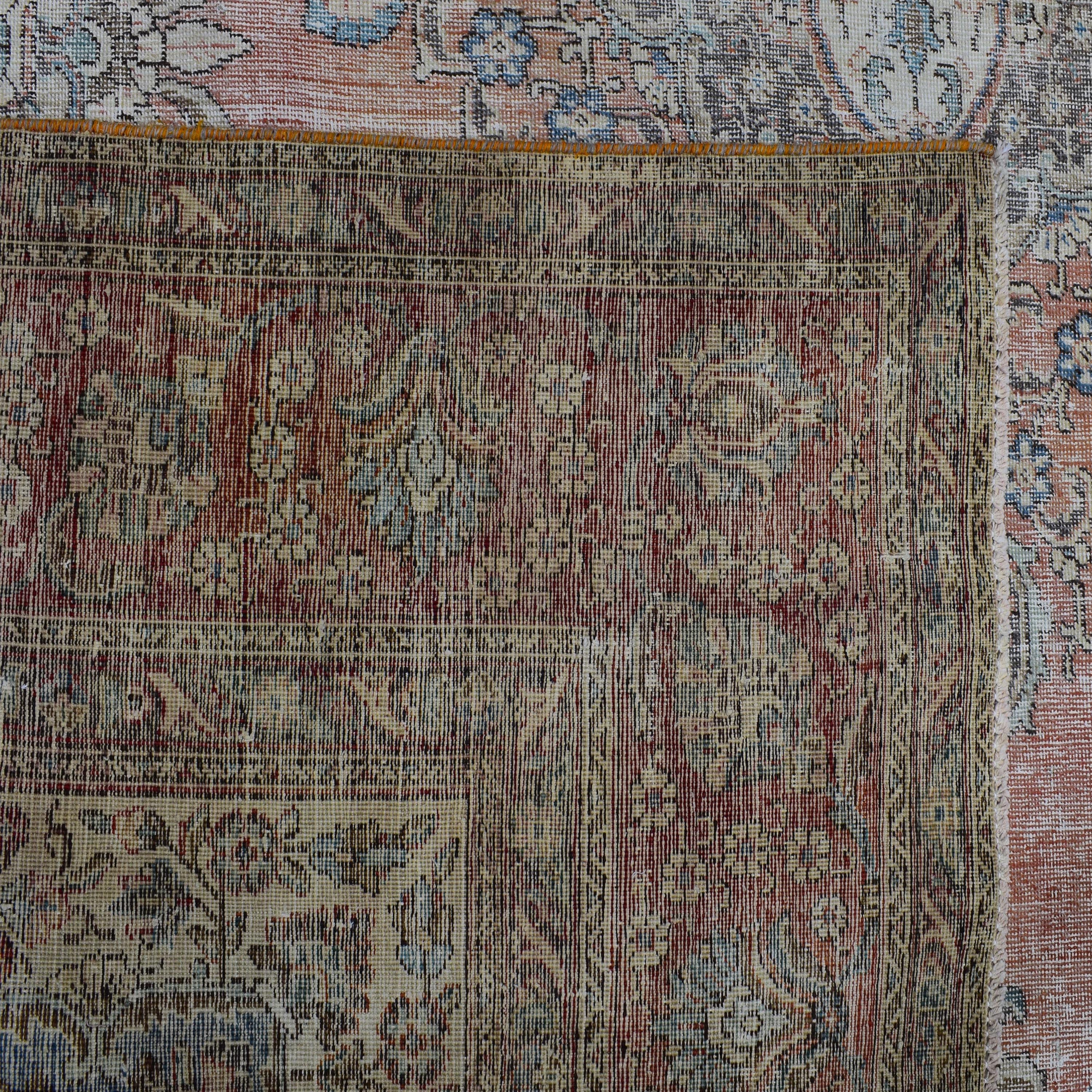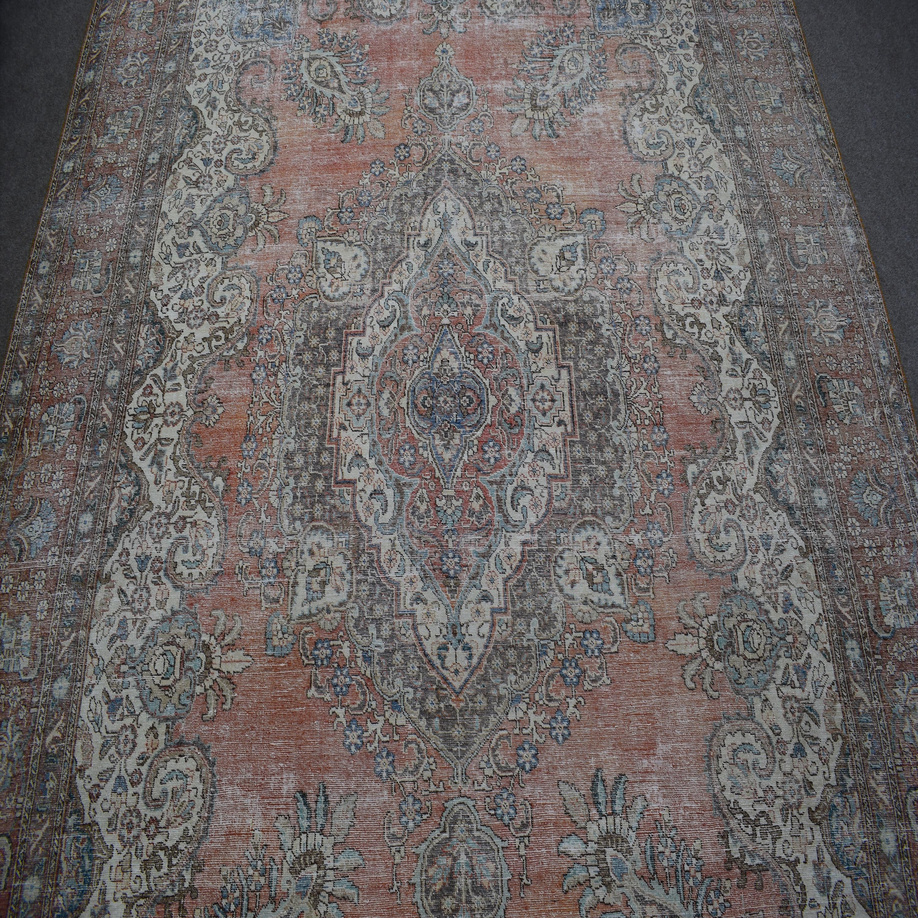 About Distressed Rug: This beautiful rug was hand-woven in 1970's in Tabriz, Iran. Later, this vintage rug has been shaved down to a lower pile to make it a faded rug on purpose. Distressed Rugs represent a trend that has achieved a crossover between fashion and home décor. This new look celebrates rugs that are faded, and worn over time; rugs that nestle into homes as if they’ve always been there. Distressed rugs are shaved rugs so they do not have a soft pile.