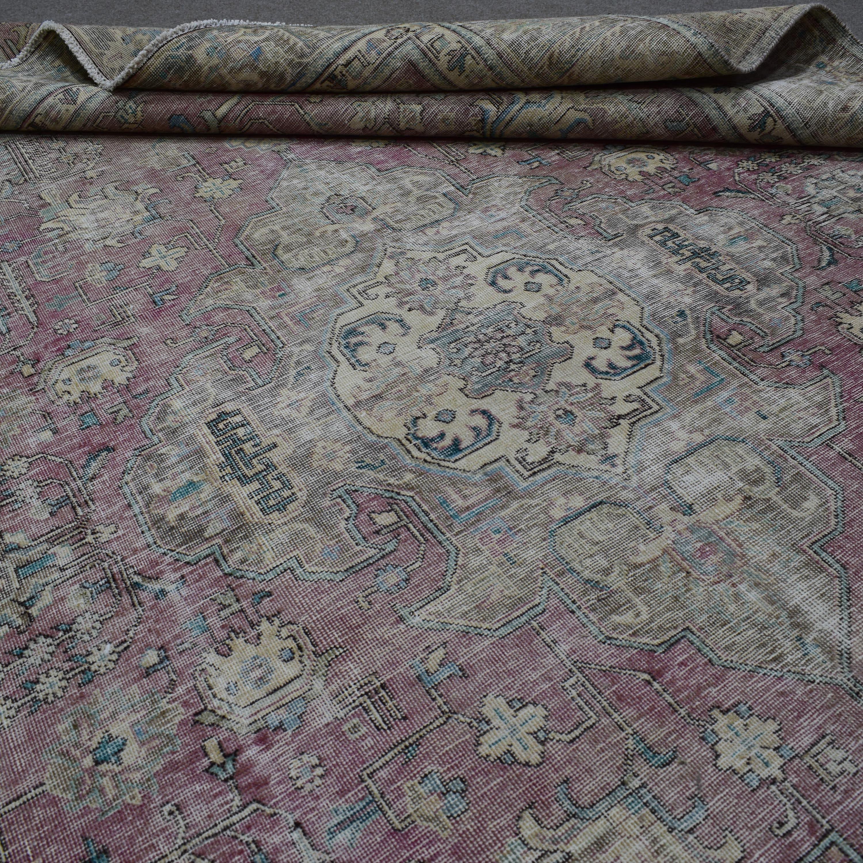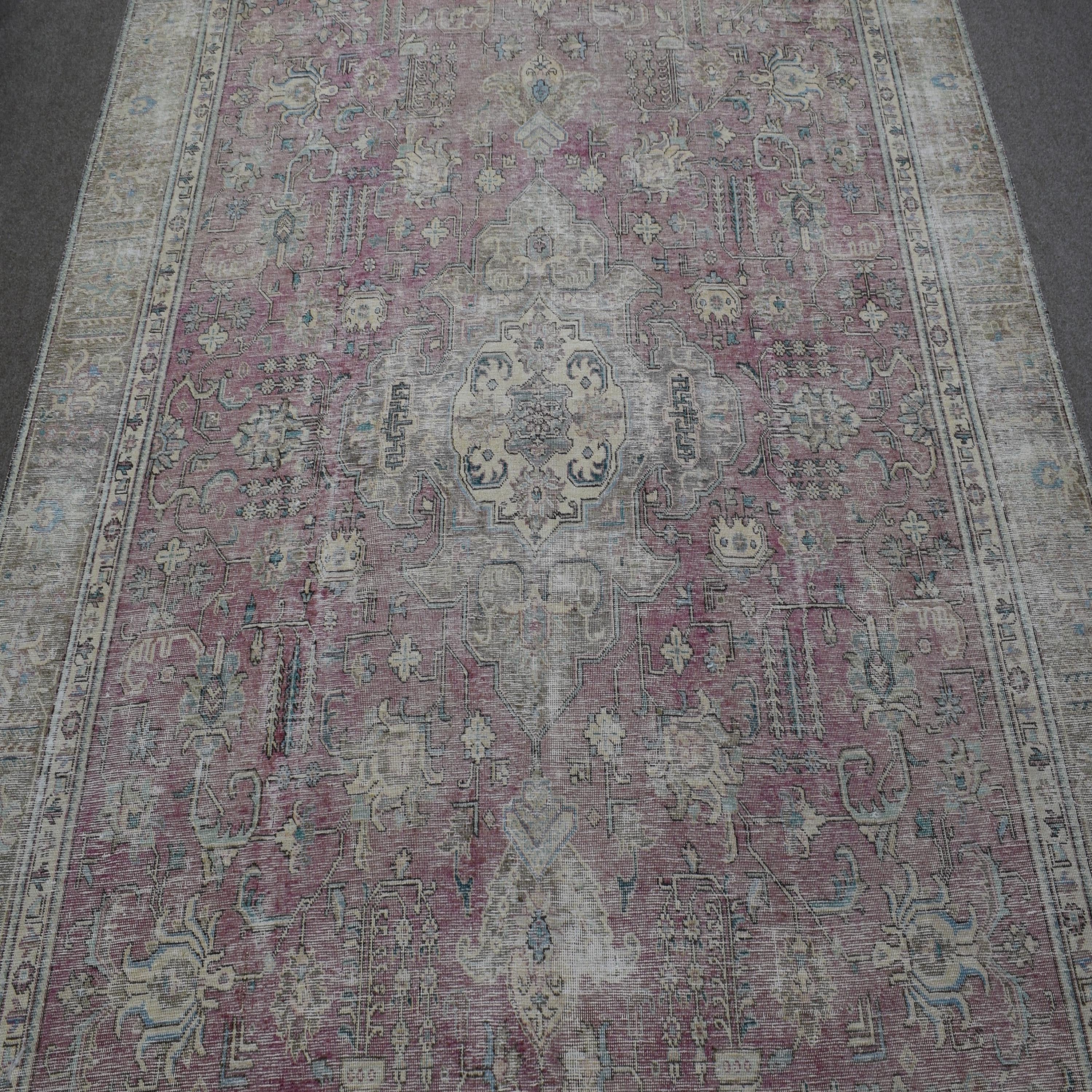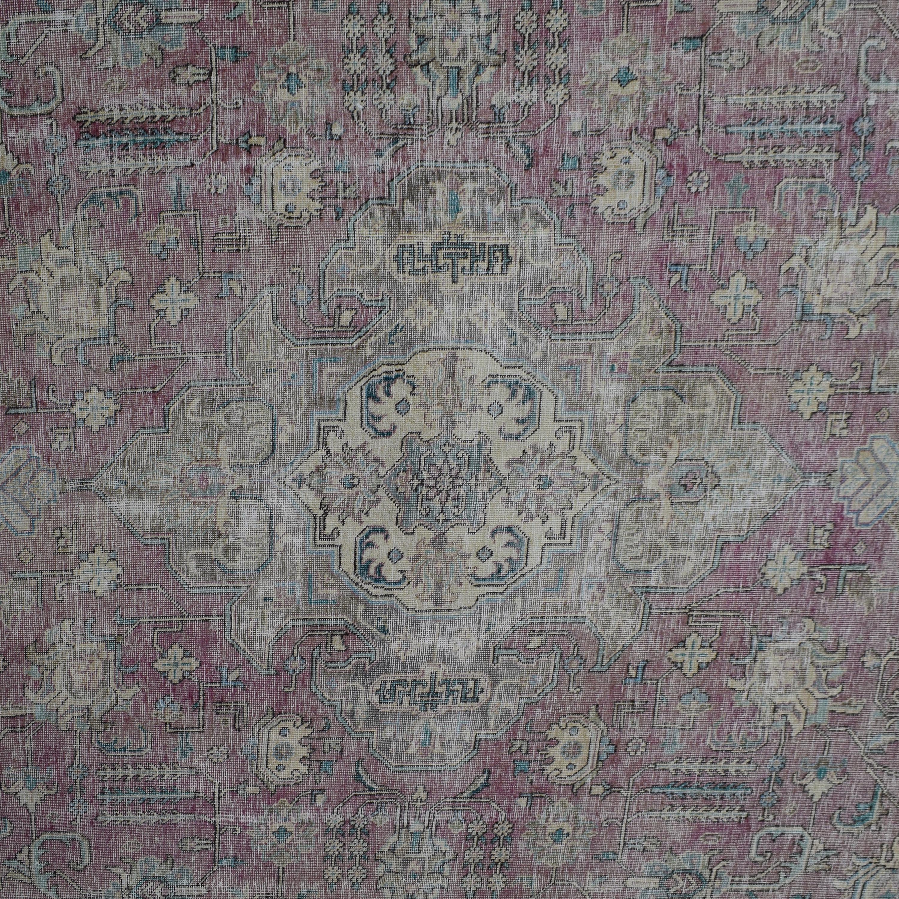 About Distressed Rug: This beautiful rug was hand-woven in 1970's in Tabriz, Iran. Later, this vintage rug has been shaved down to a lower pile to make it a faded rug on purpose. Distressed Rugs represent a trend that has achieved a crossover between fashion and home décor. This new look celebrates rugs that are faded, and worn over time; rugs that nestle into homes as if they’ve always been there. Distressed rugs are shaved rugs so they do not have a soft pile.