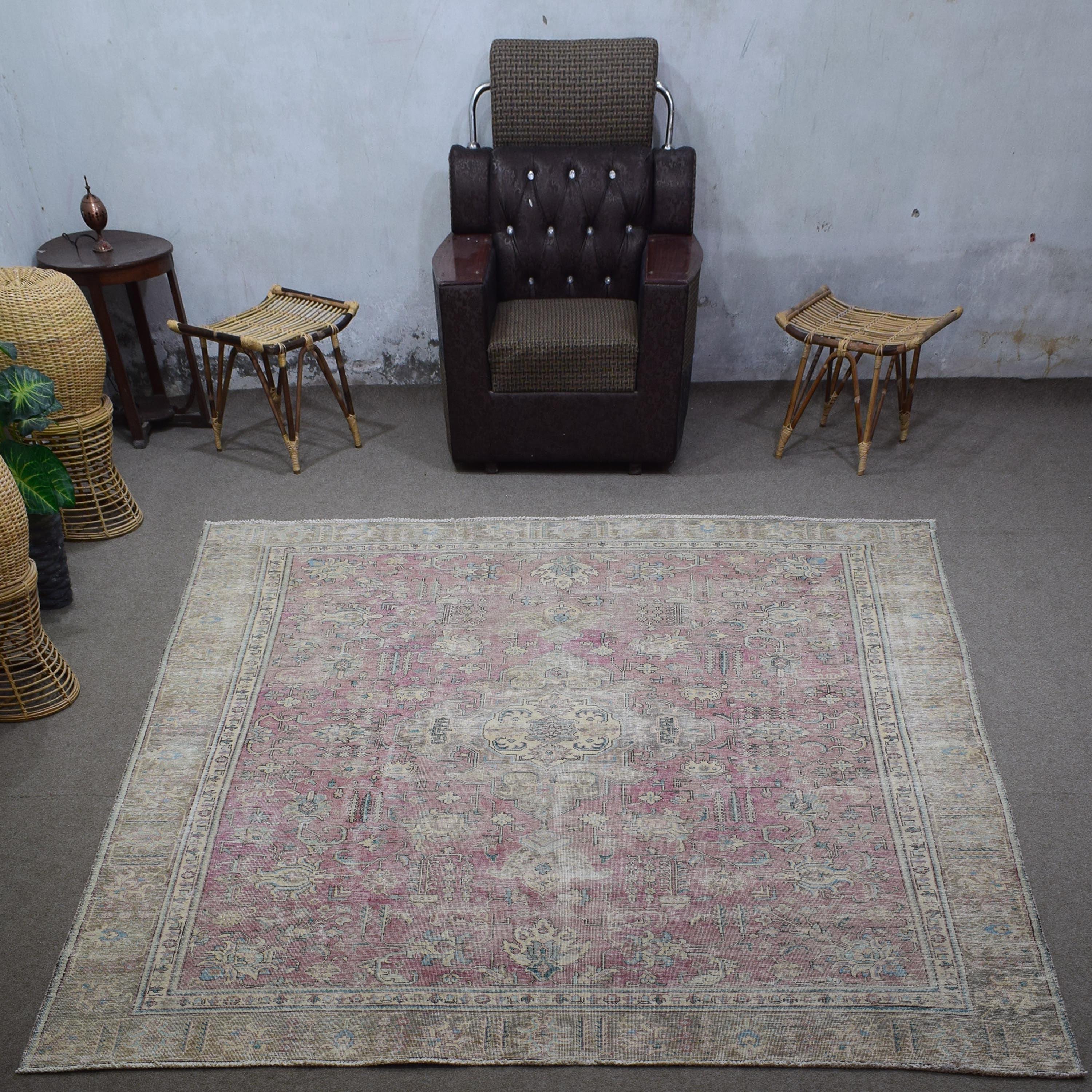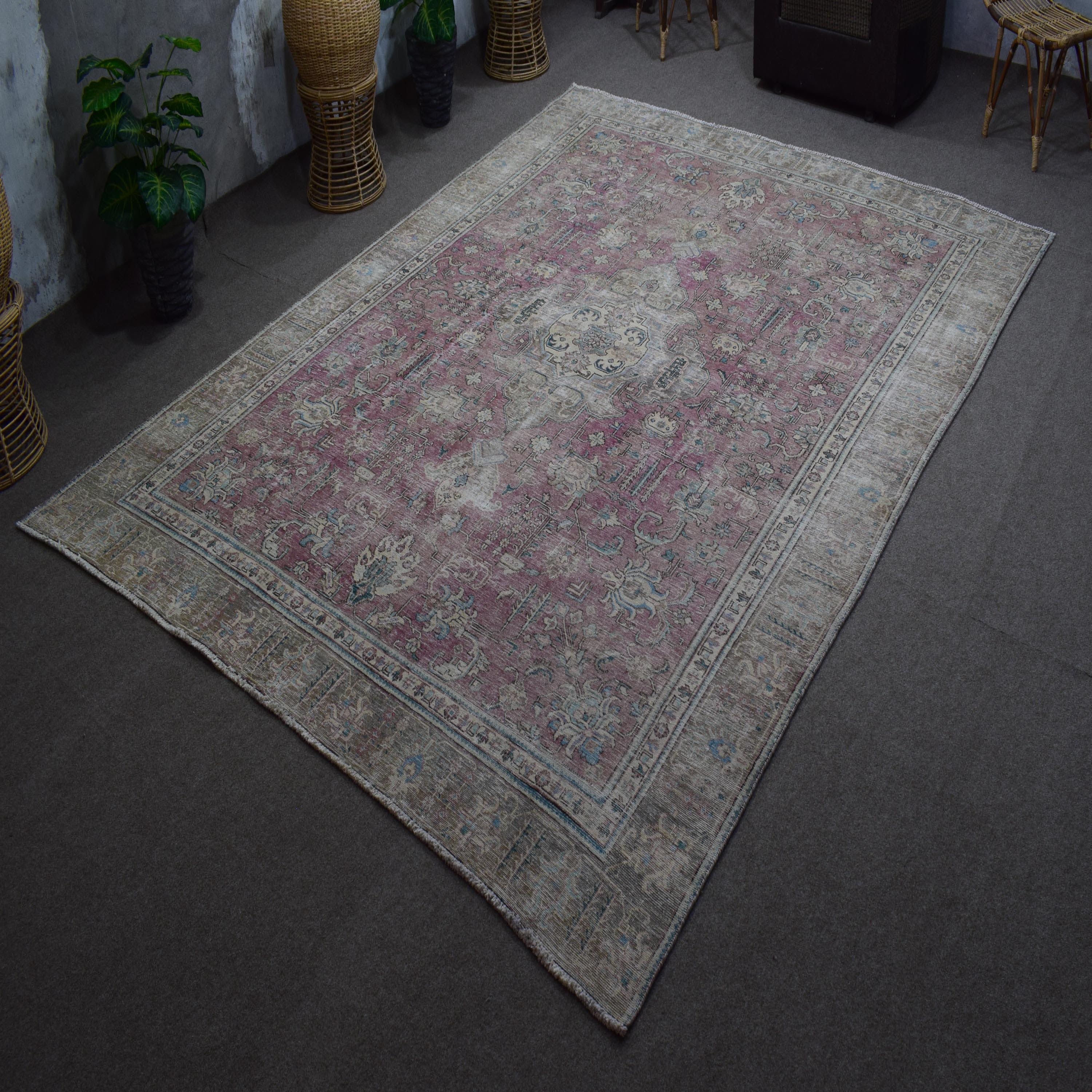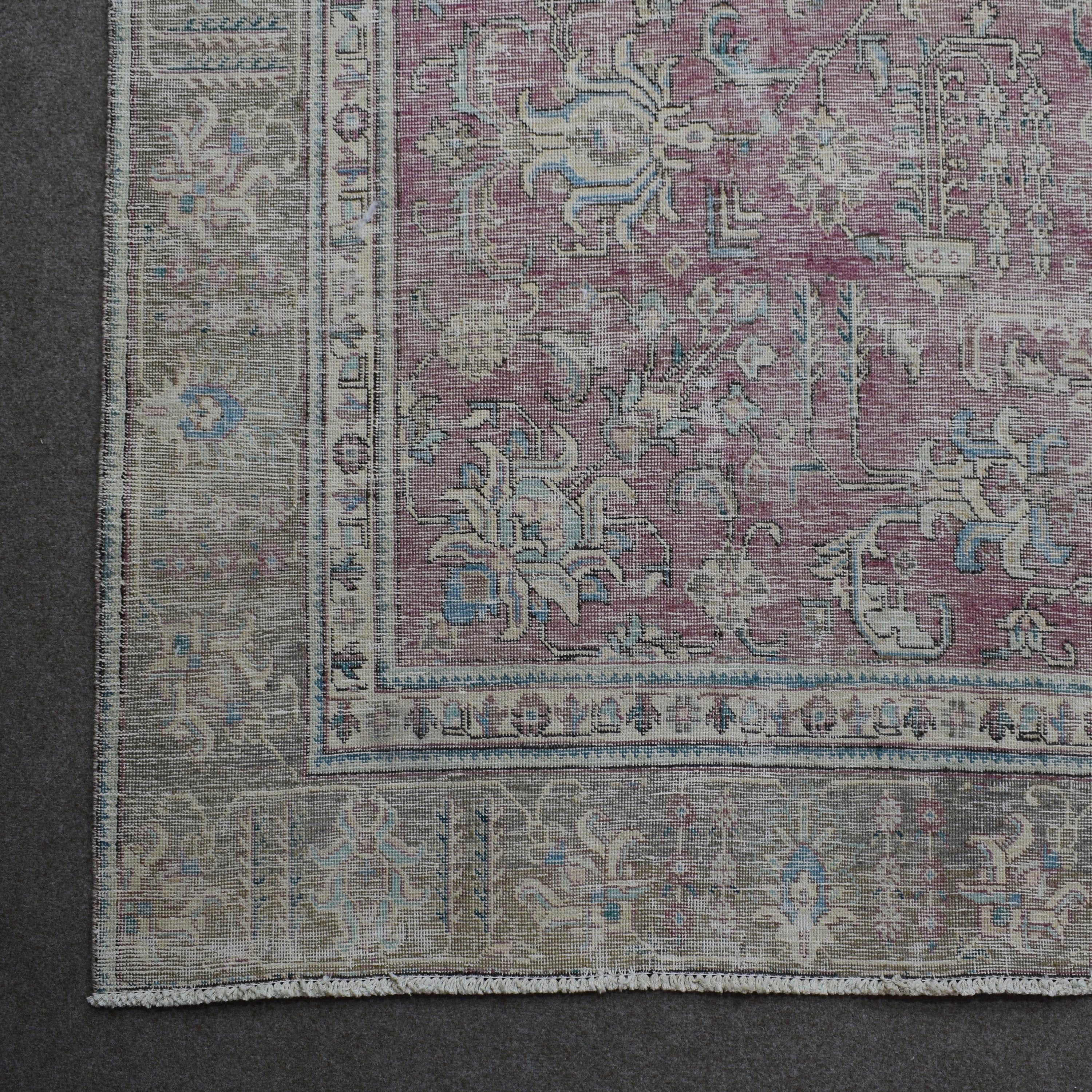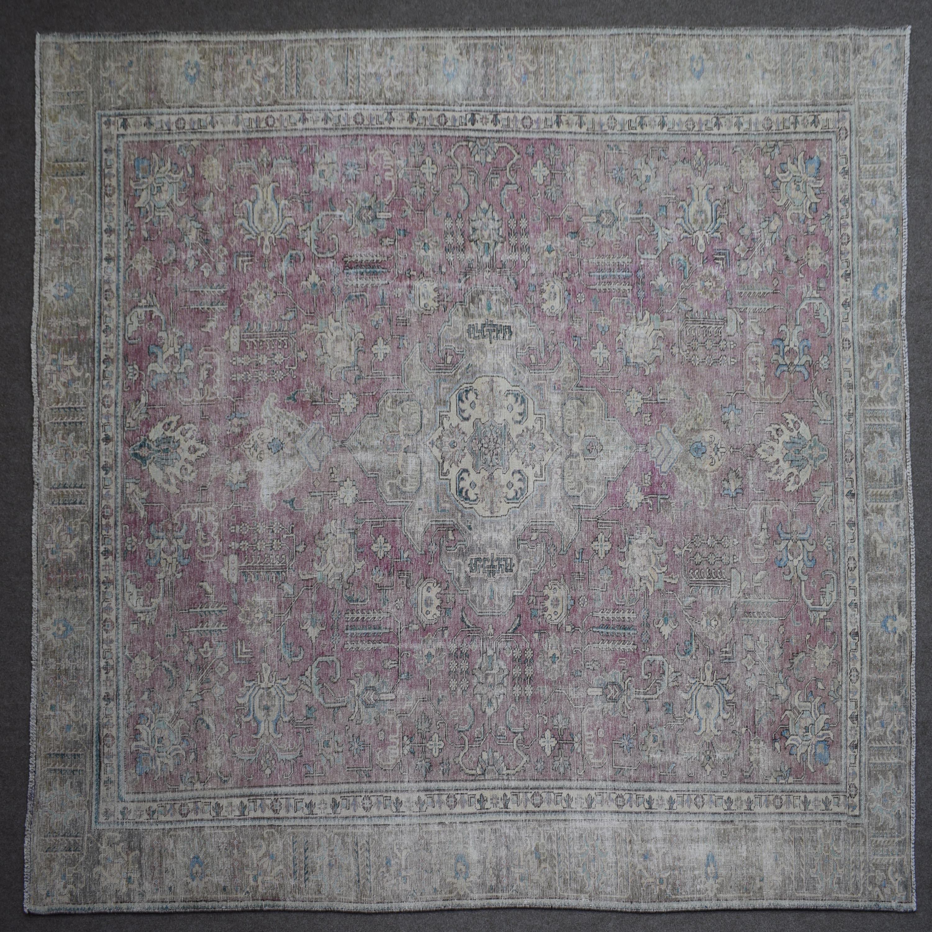 About Distressed Rug: This beautiful rug was hand-woven in 1970's in Tabriz, Iran. Later, this vintage rug has been shaved down to a lower pile to make it a faded rug on purpose. Distressed Rugs represent a trend that has achieved a crossover between fashion and home décor. This new look celebrates rugs that are faded, and worn over time; rugs that nestle into homes as if they’ve always been there. Distressed rugs are shaved rugs so they do not have a soft pile.