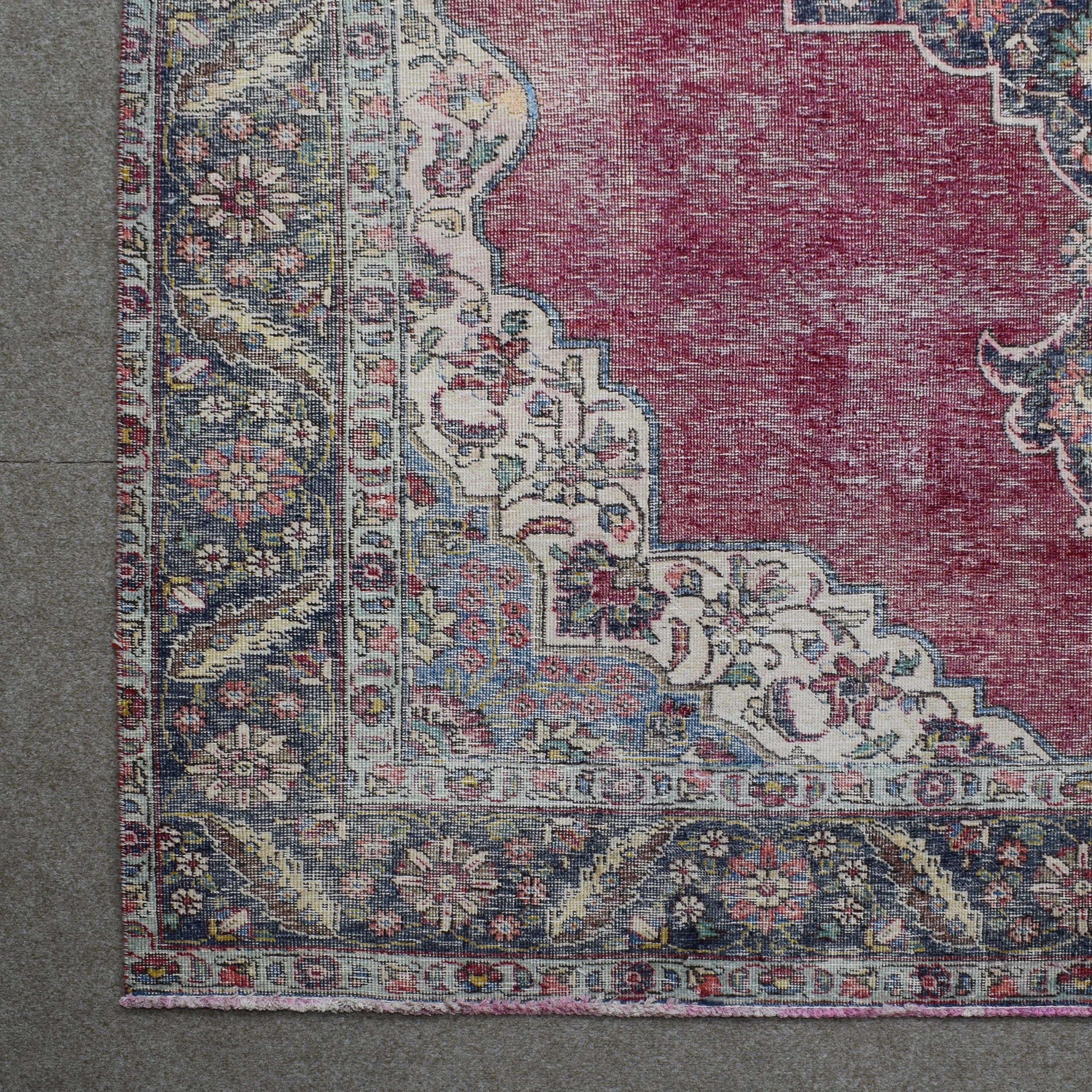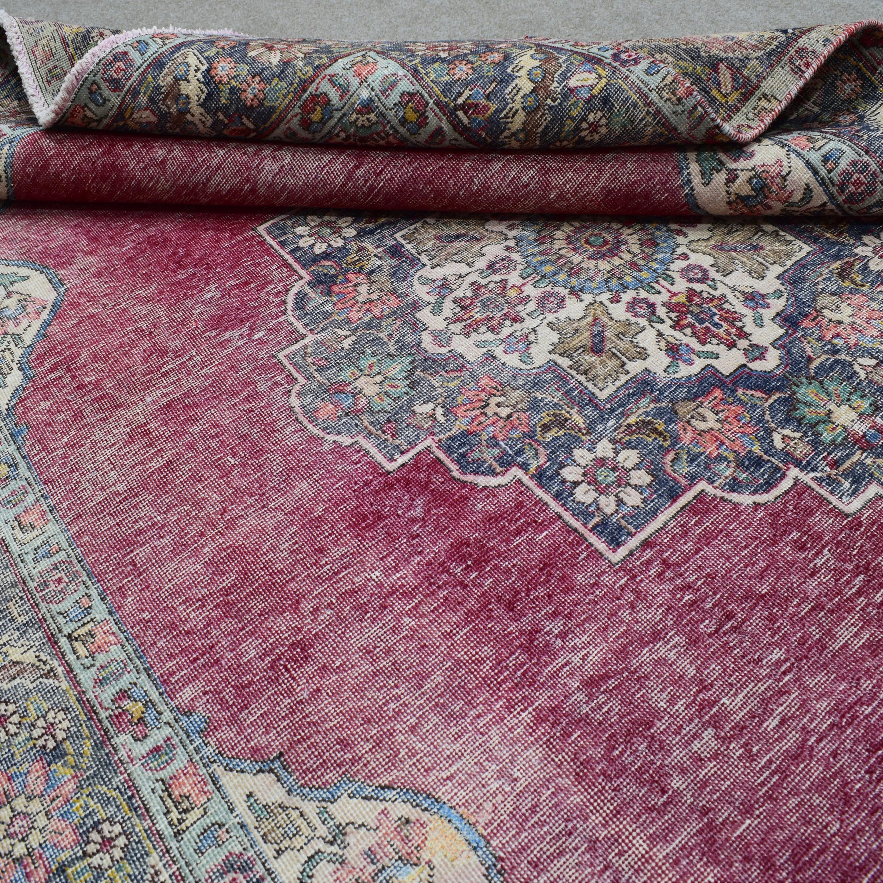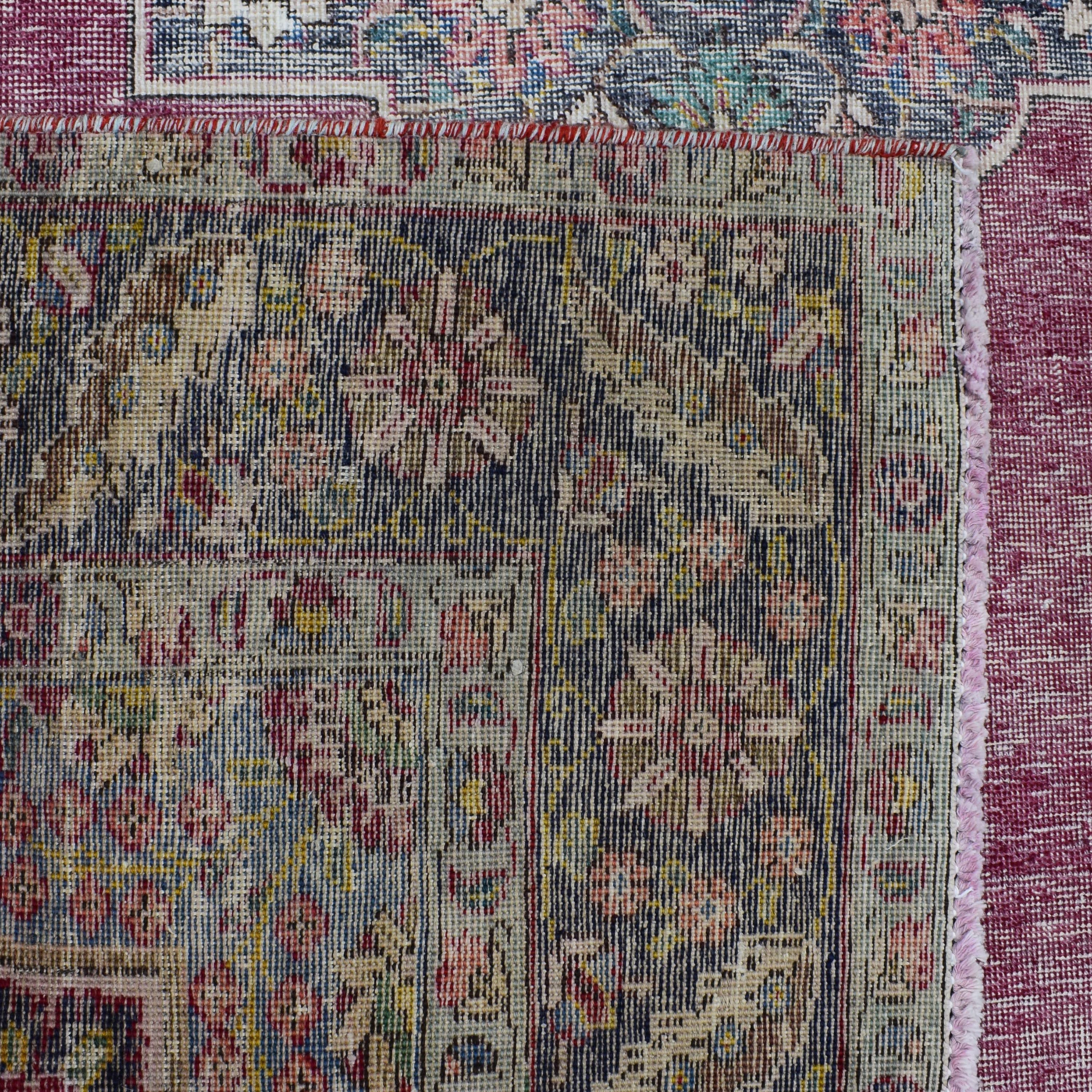 About Distressed Rug: This beautiful rug was hand-woven in 1970's in Tabriz, Iran. Later, this vintage rug has been shaved down to a lower pile to make it a faded rug on purpose. Distressed Rugs represent a trend that has achieved a crossover between fashion and home décor. This new look celebrates rugs that are faded, and worn over time; rugs that nestle into homes as if they’ve always been there. Distressed rugs are shaved rugs so they do not have a soft pile.