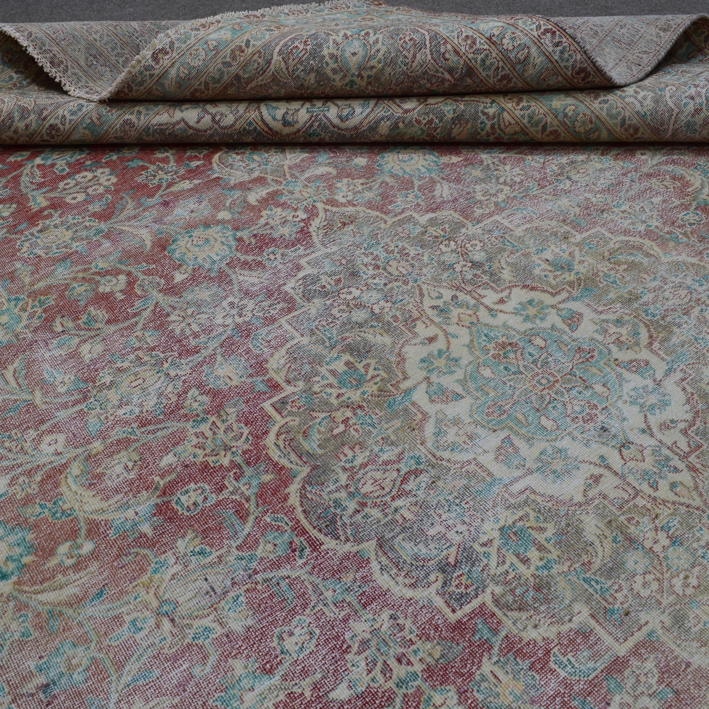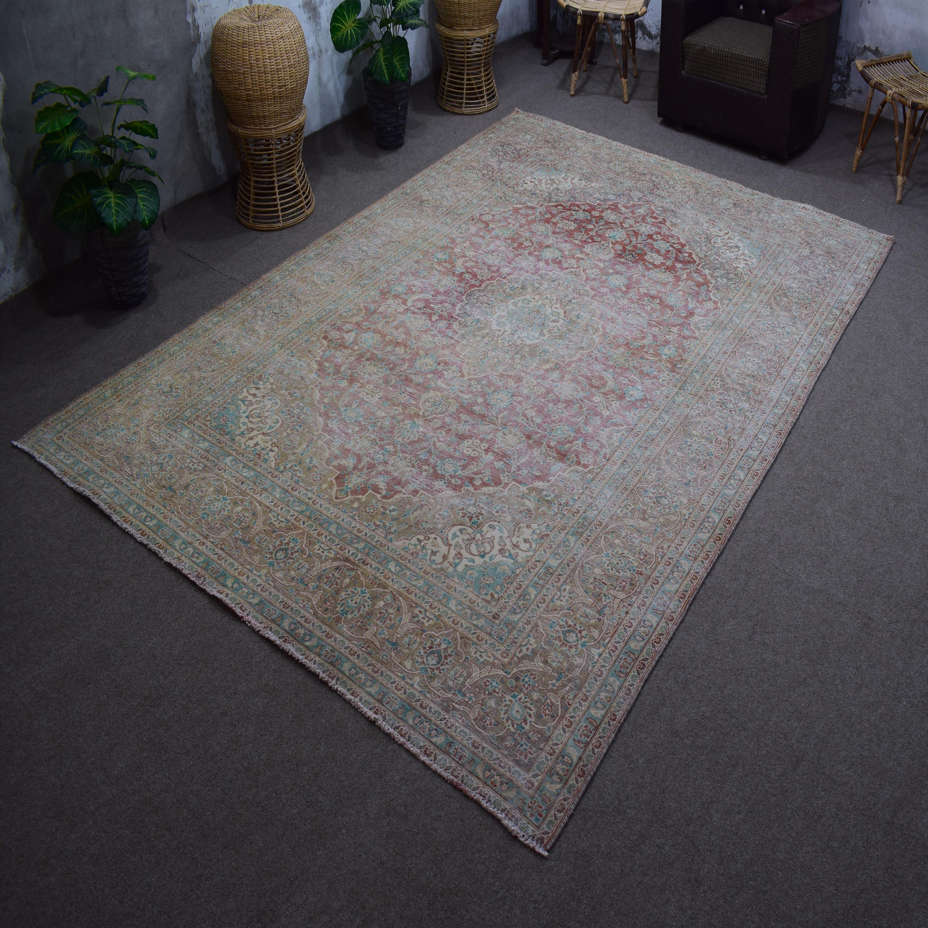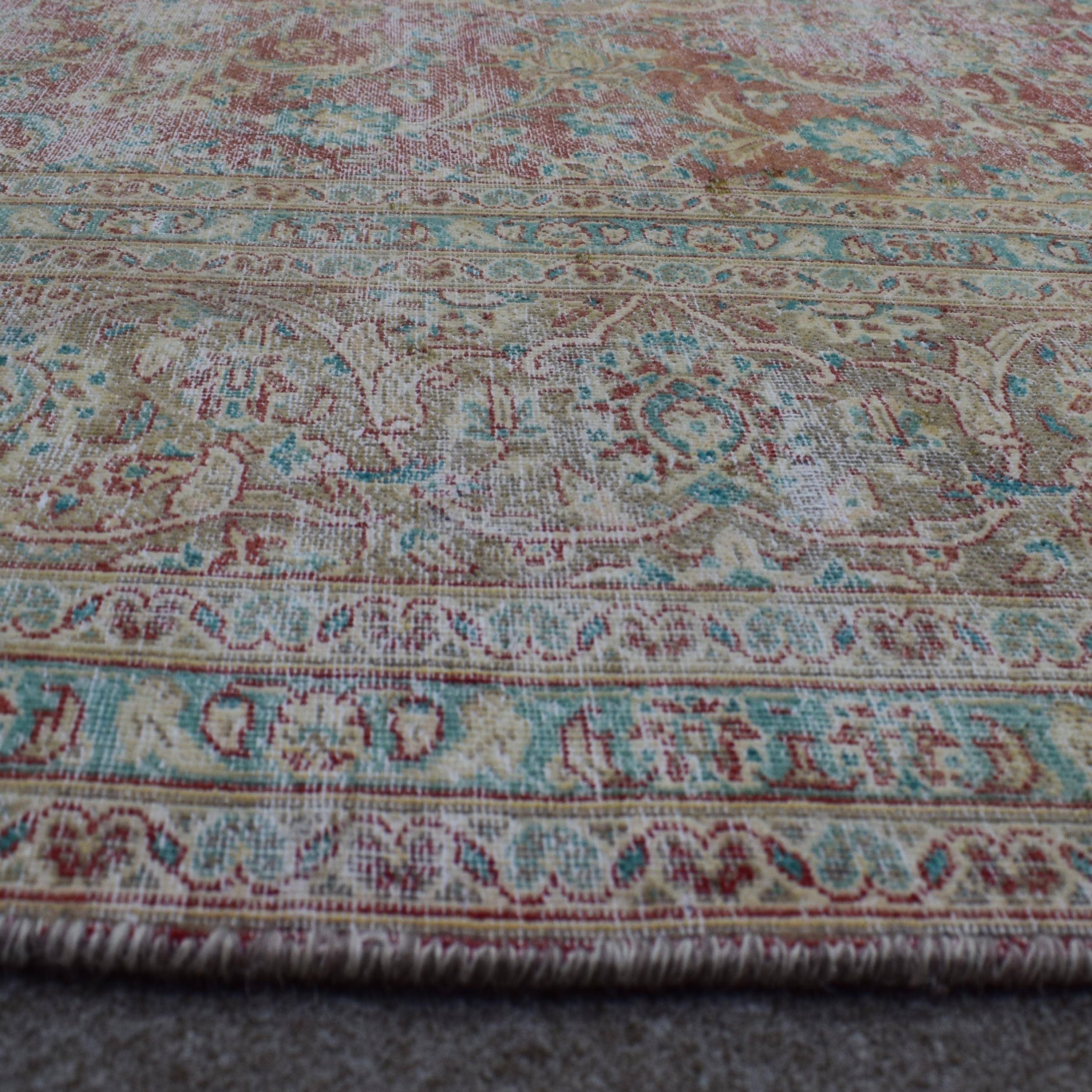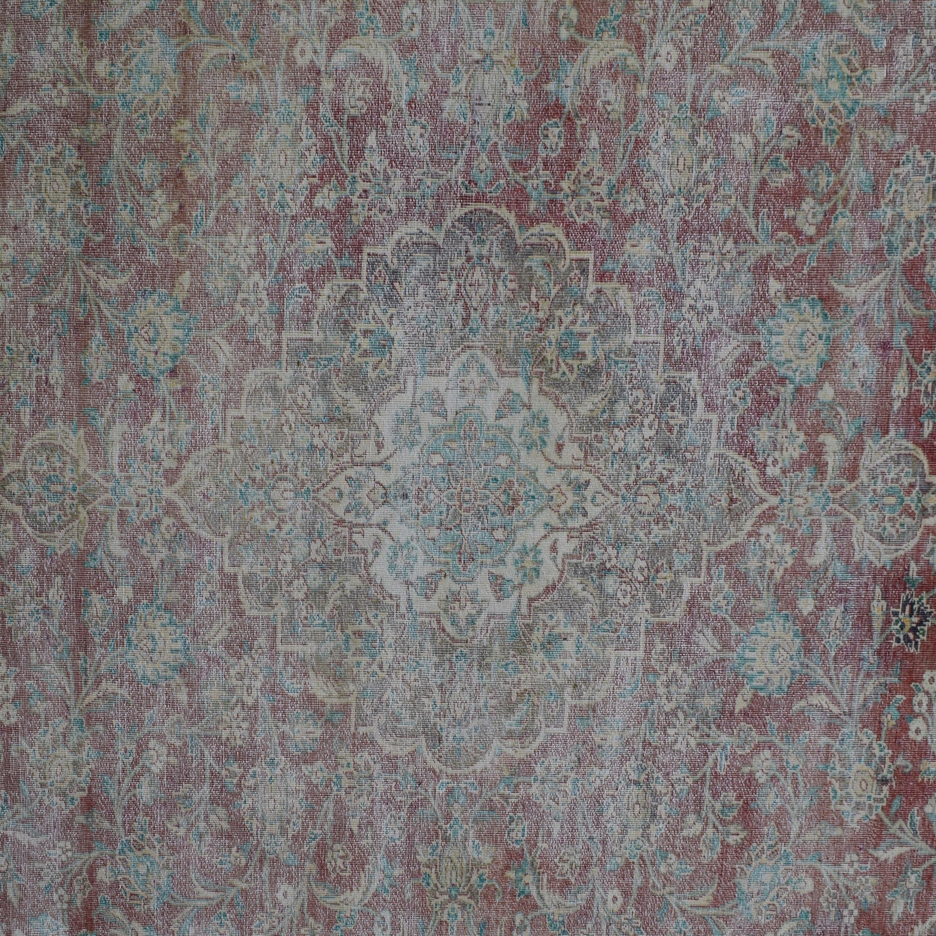 About Distressed Rug: This beautiful rug was hand-woven in 1970's in Tabriz, Iran. Later, this vintage rug has been shaved down to a lower pile to make it a faded rug on purpose. Distressed Rugs represent a trend that has achieved a crossover between fashion and home décor. This new look celebrates rugs that are faded, and worn over time; rugs that nestle into homes as if they’ve always been there. Distressed rugs are shaved rugs so they do not have a soft pile.