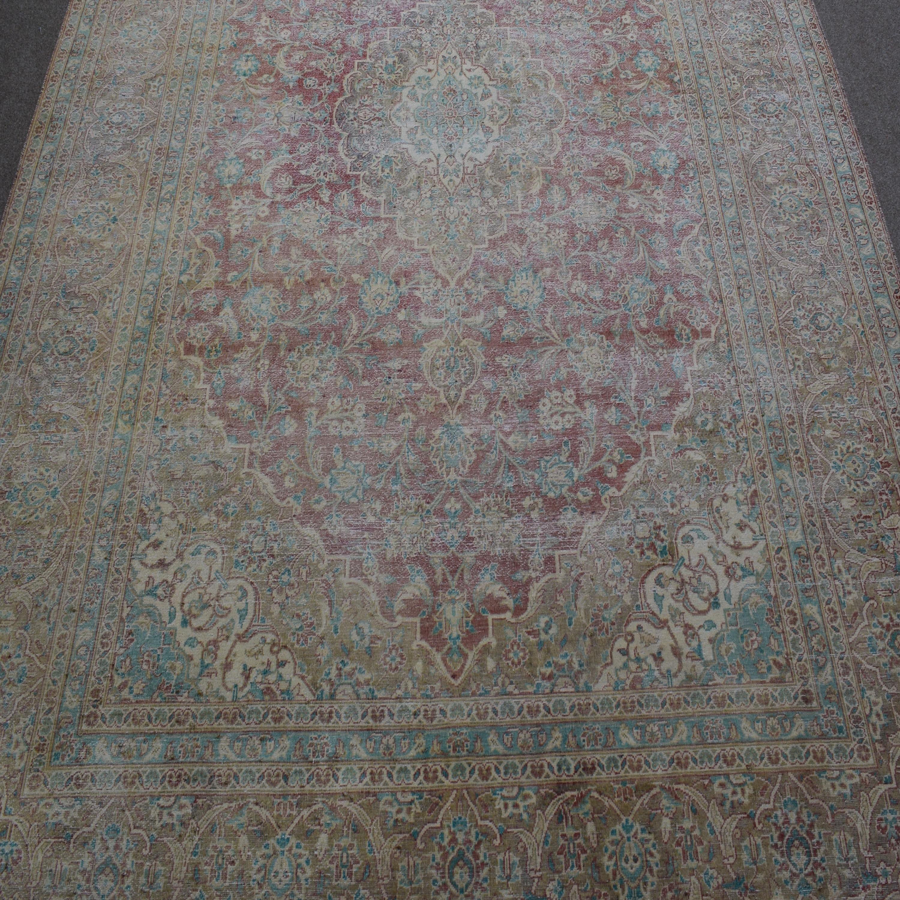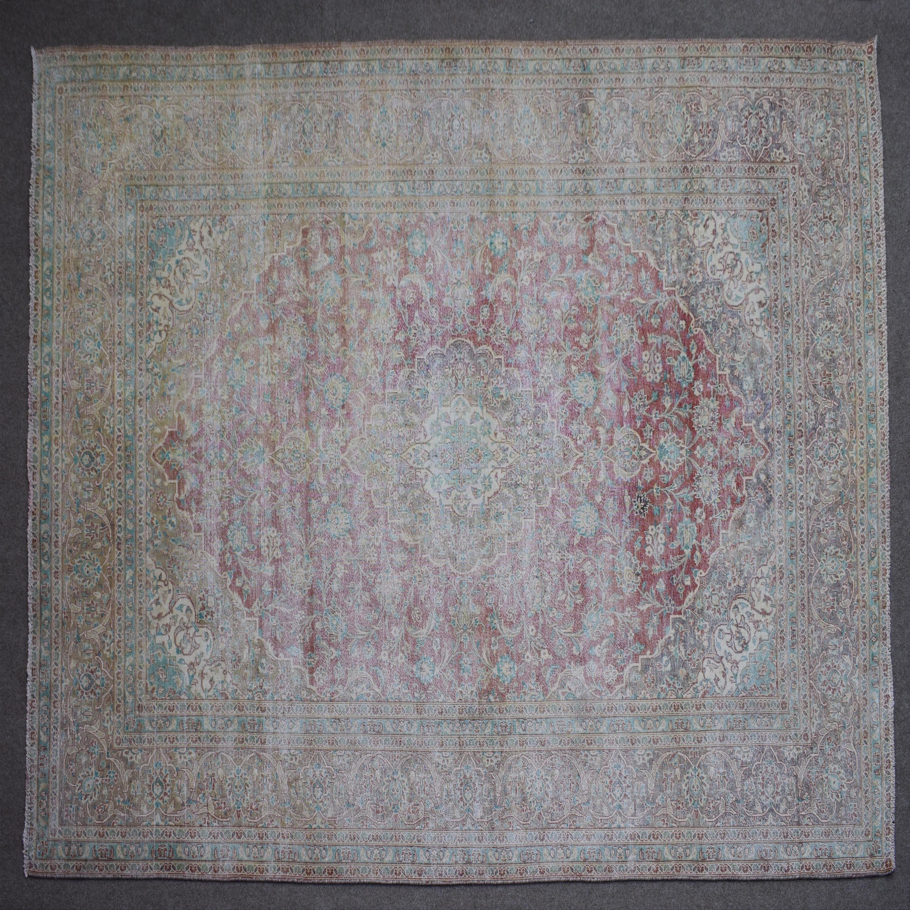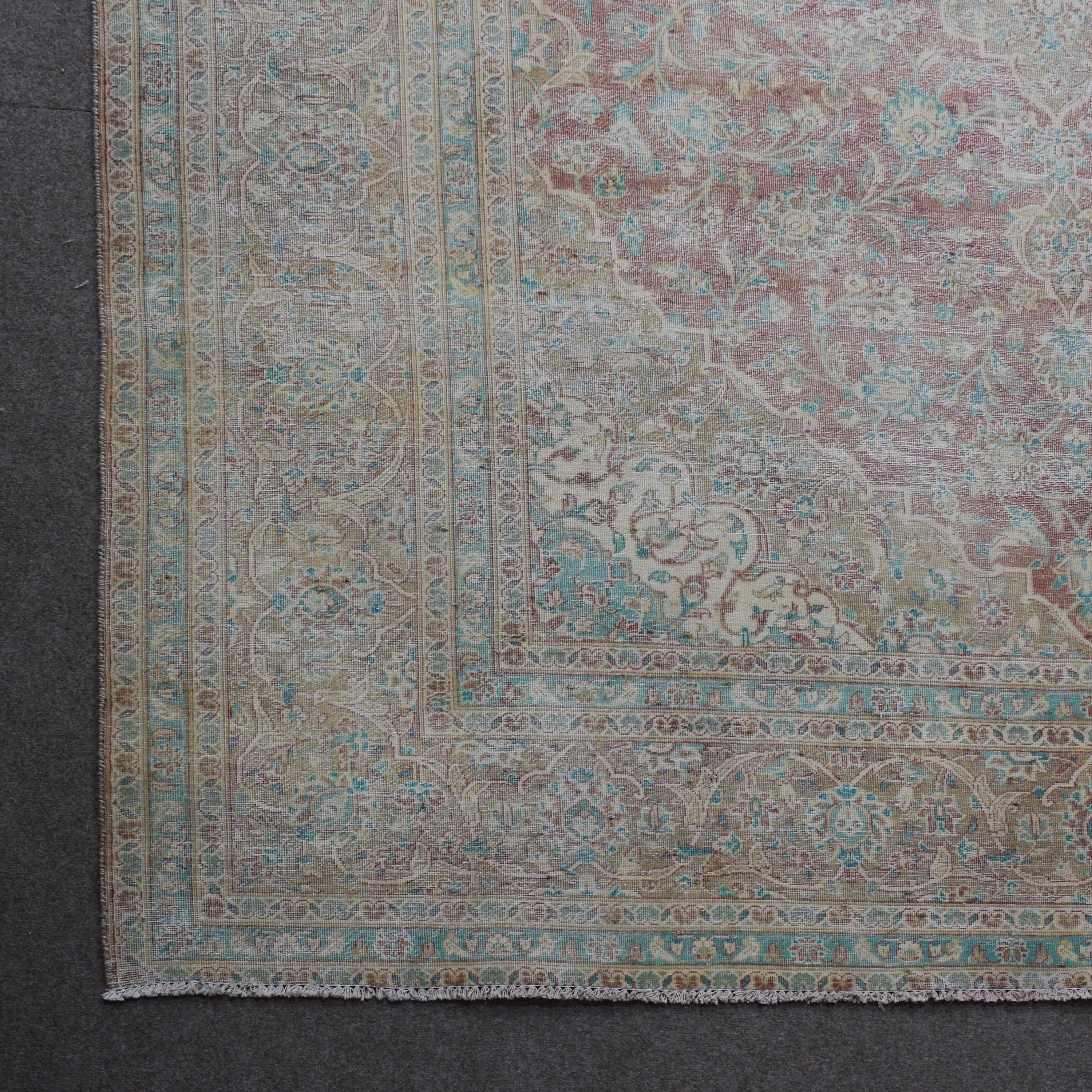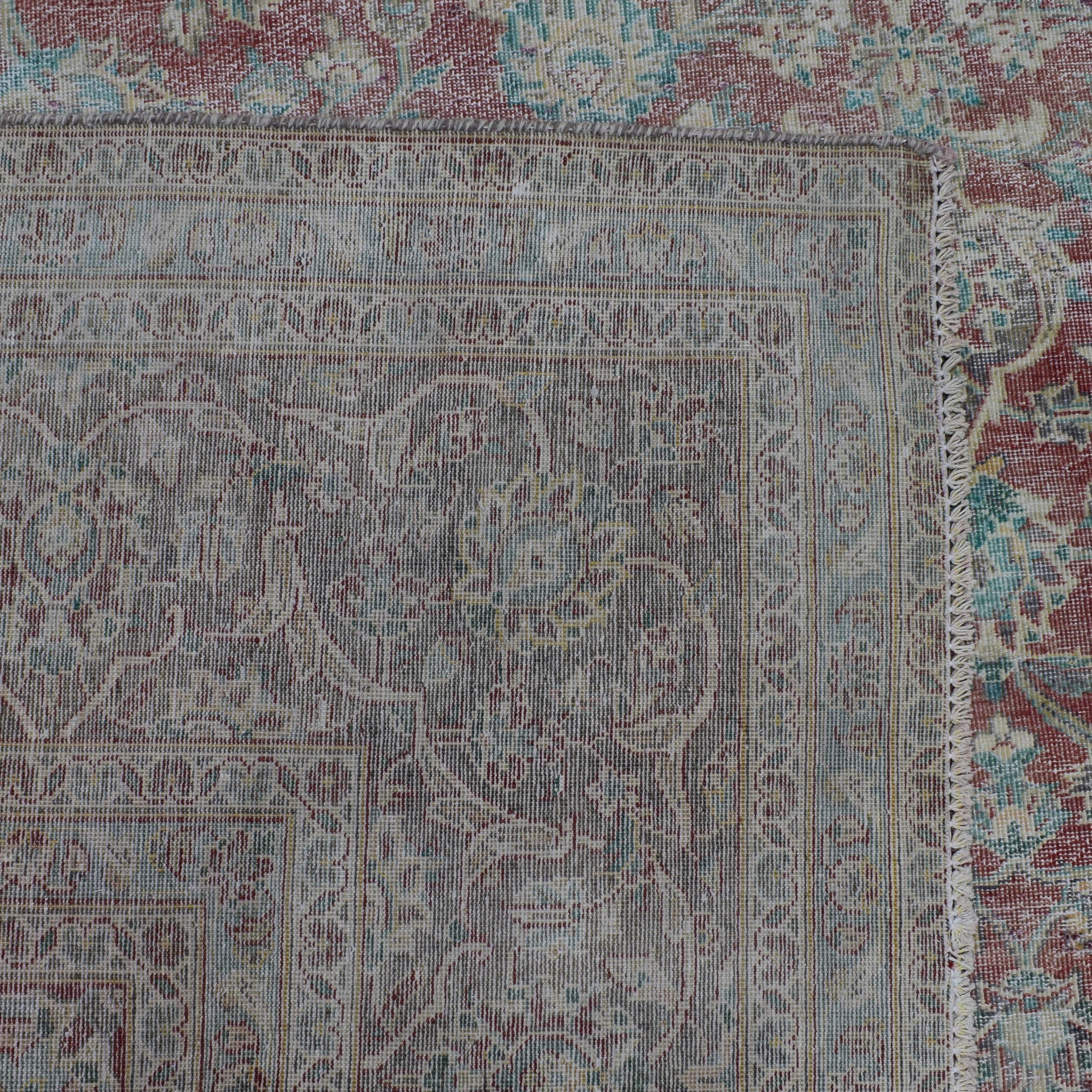 About Distressed Rug: This beautiful rug was hand-woven in 1970's in Tabriz, Iran. Later, this vintage rug has been shaved down to a lower pile to make it a faded rug on purpose. Distressed Rugs represent a trend that has achieved a crossover between fashion and home décor. This new look celebrates rugs that are faded, and worn over time; rugs that nestle into homes as if they’ve always been there. Distressed rugs are shaved rugs so they do not have a soft pile.