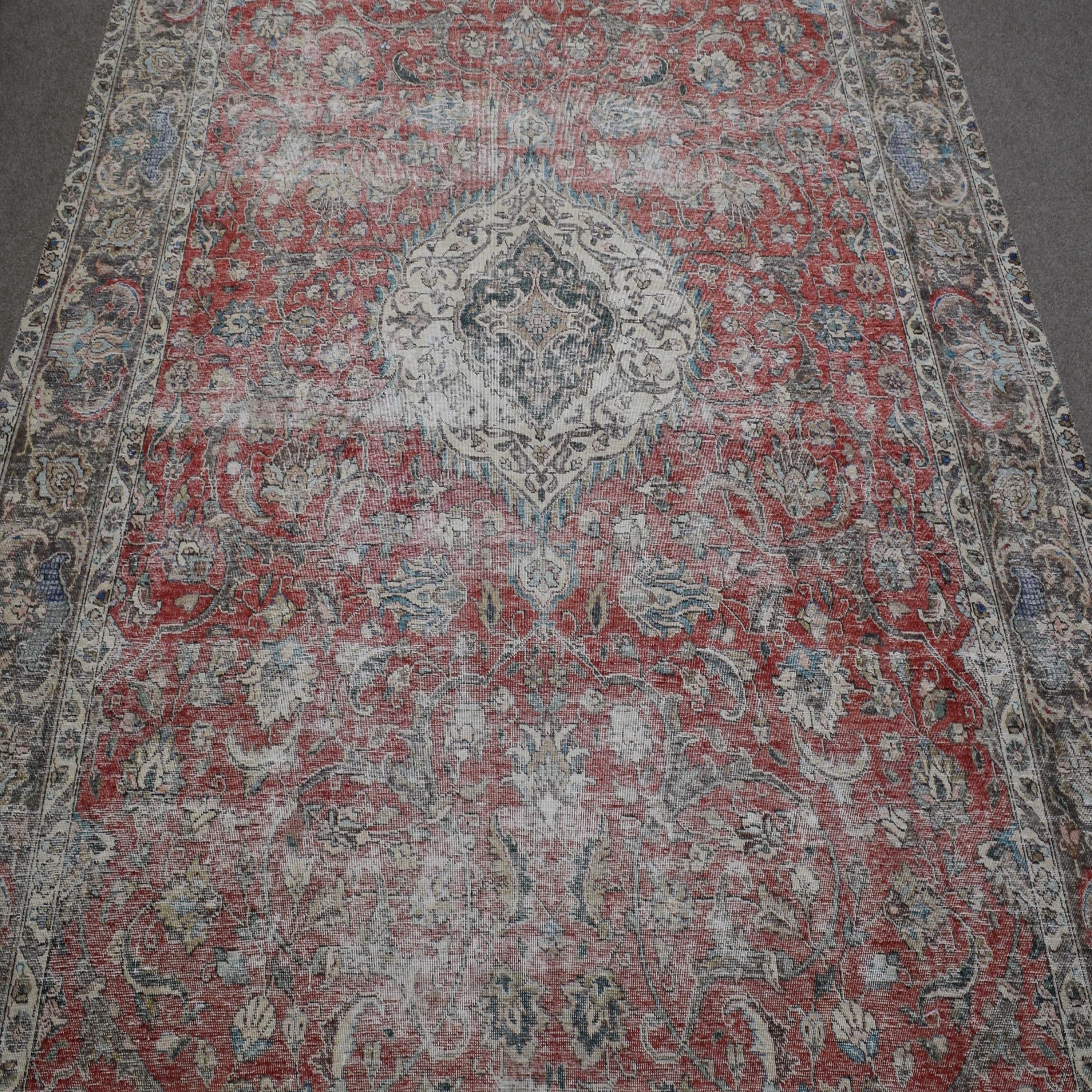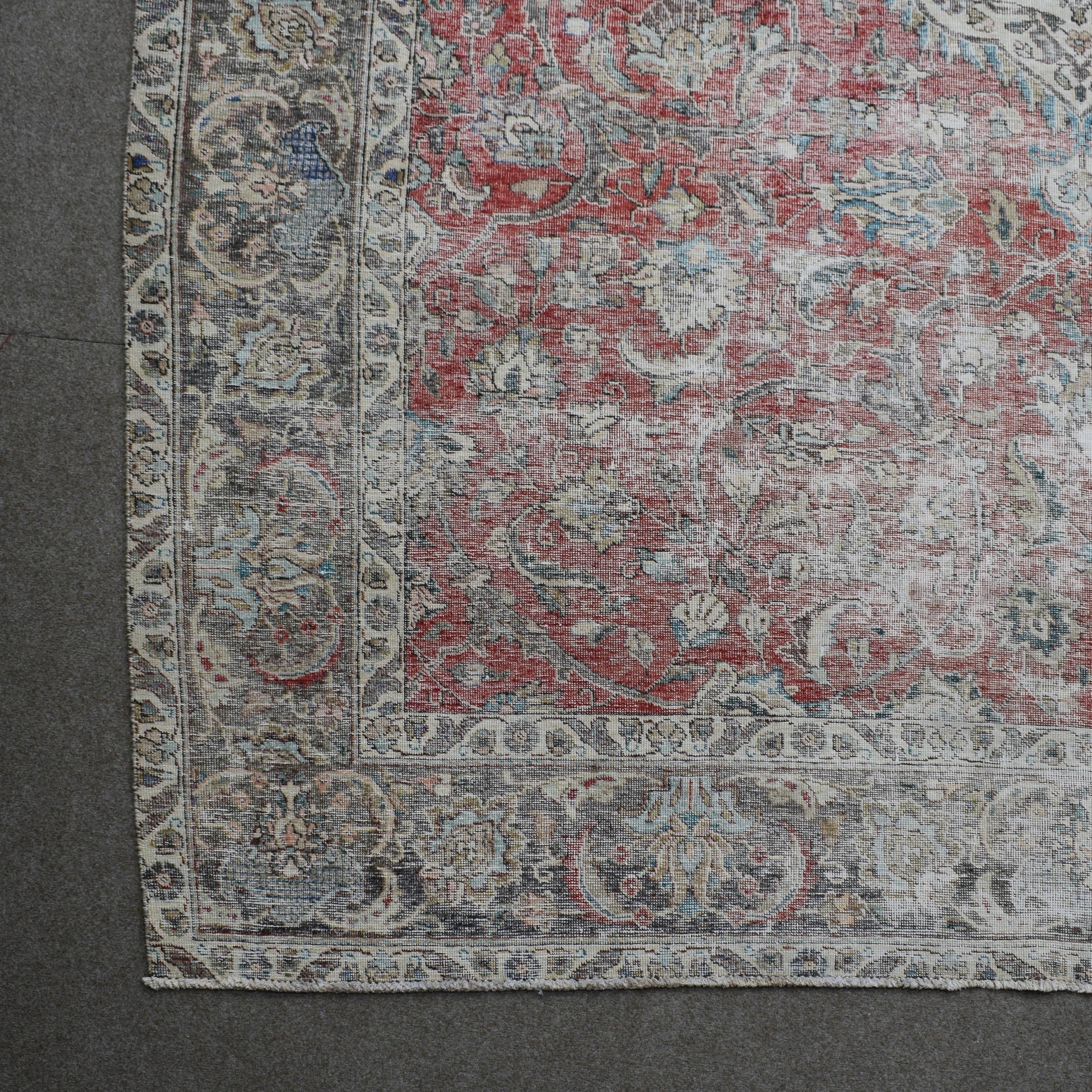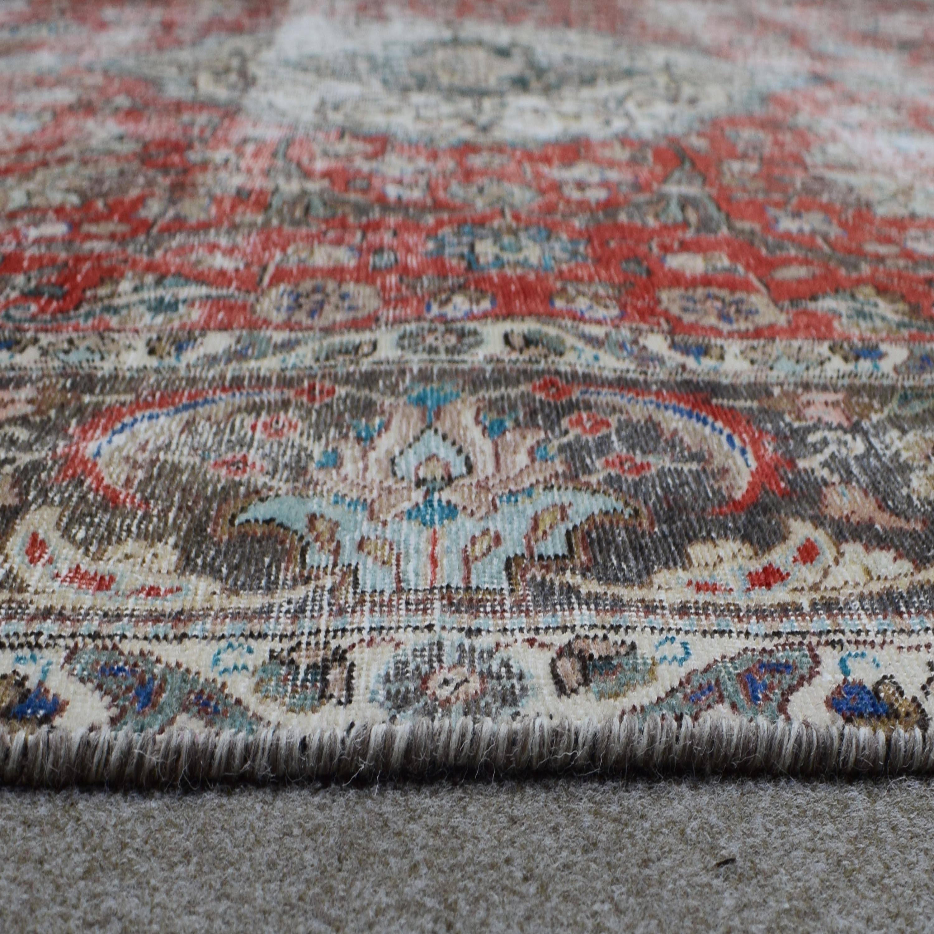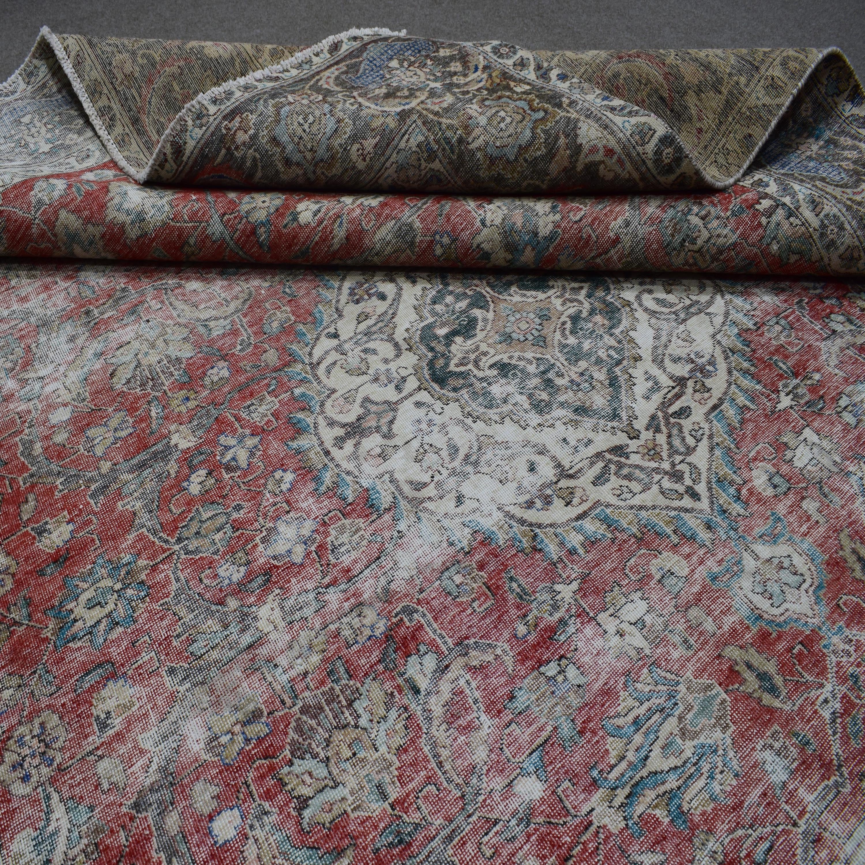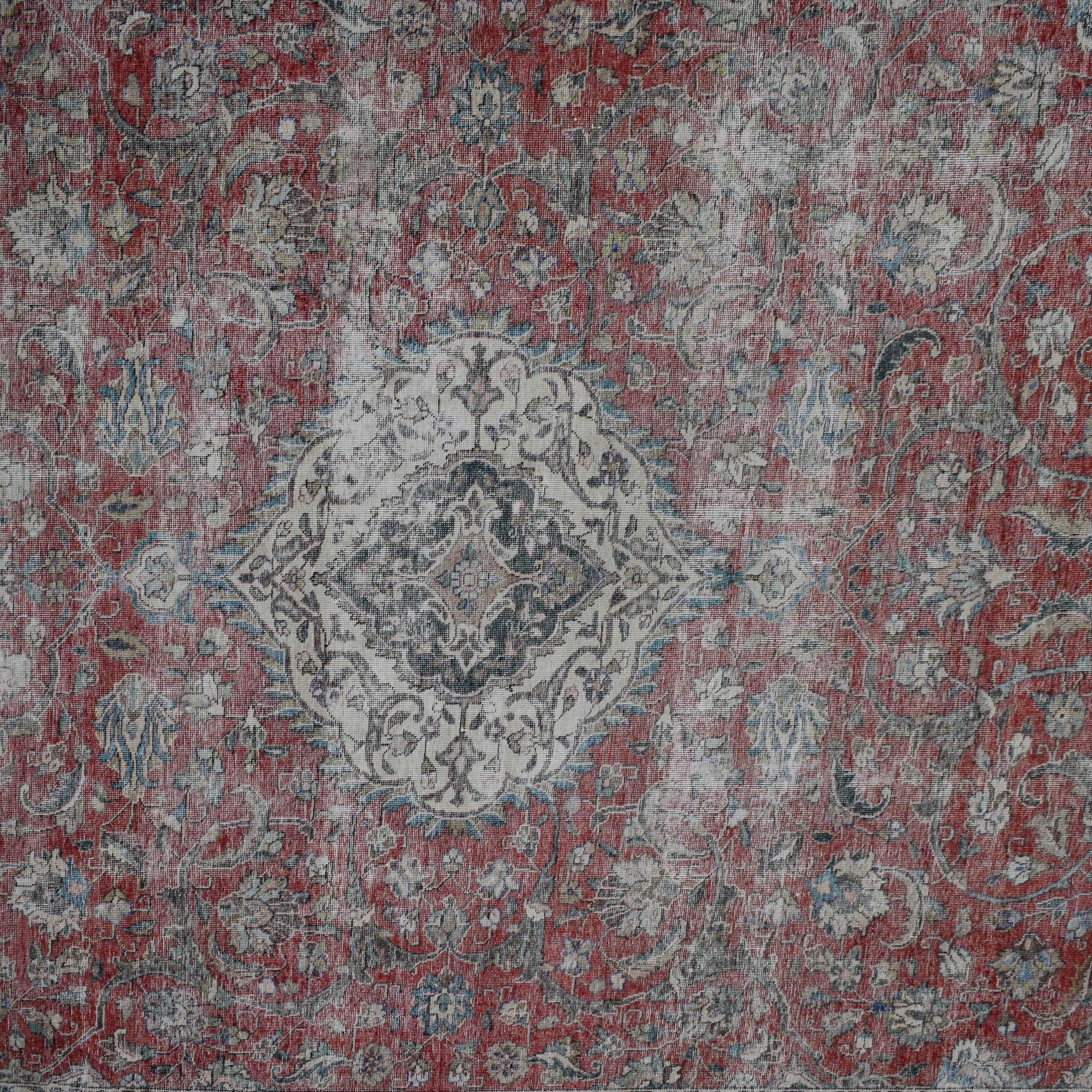 About Distressed Rug: This beautiful rug was hand-woven in 1970's in Tabriz, Iran. Later, this vintage rug has been shaved down to a lower pile to make it a faded rug on purpose. Distressed Rugs represent a trend that has achieved a crossover between fashion and home décor. This new look celebrates rugs that are faded, and worn over time; rugs that nestle into homes as if they’ve always been there. Distressed rugs are shaved rugs so they do not have a soft pile.