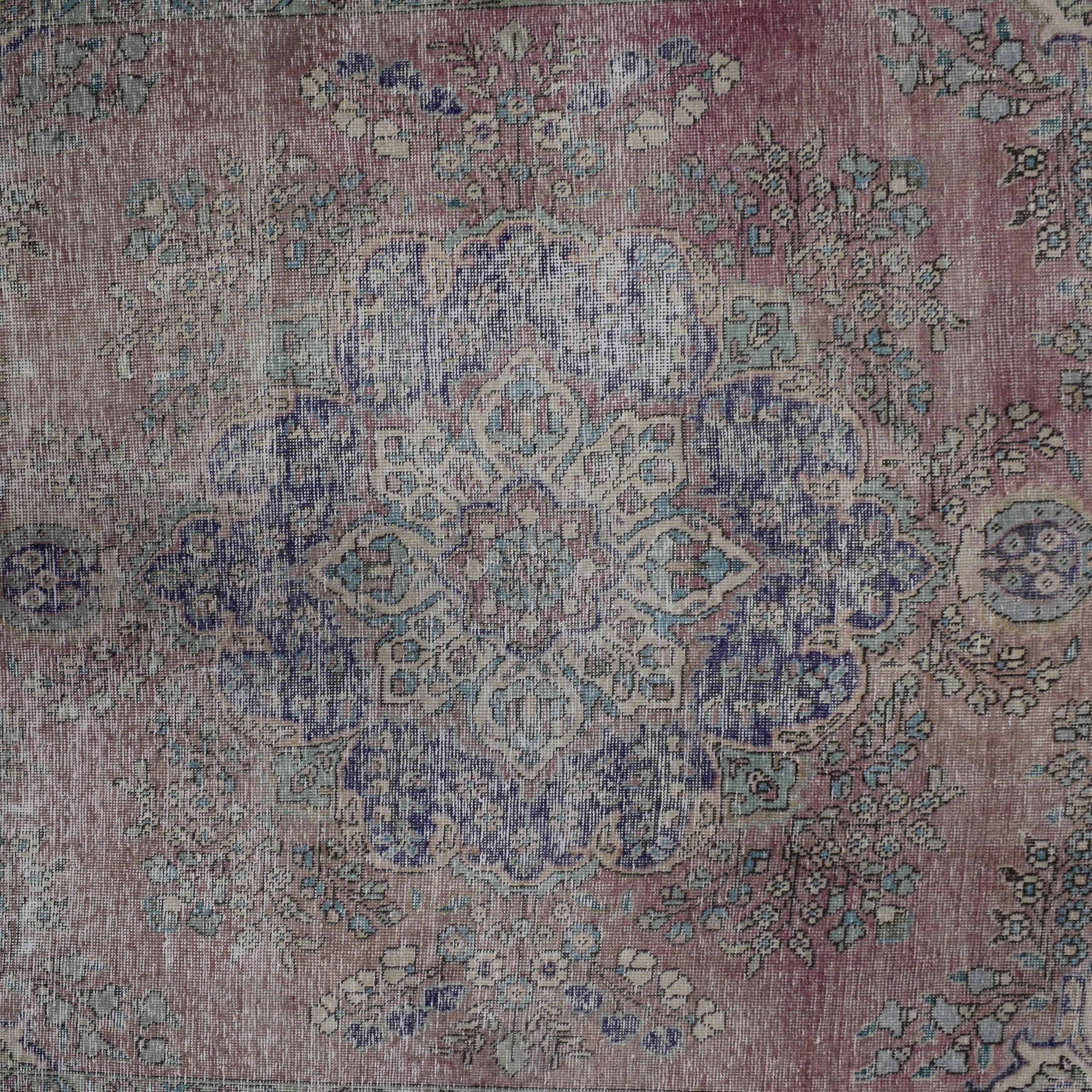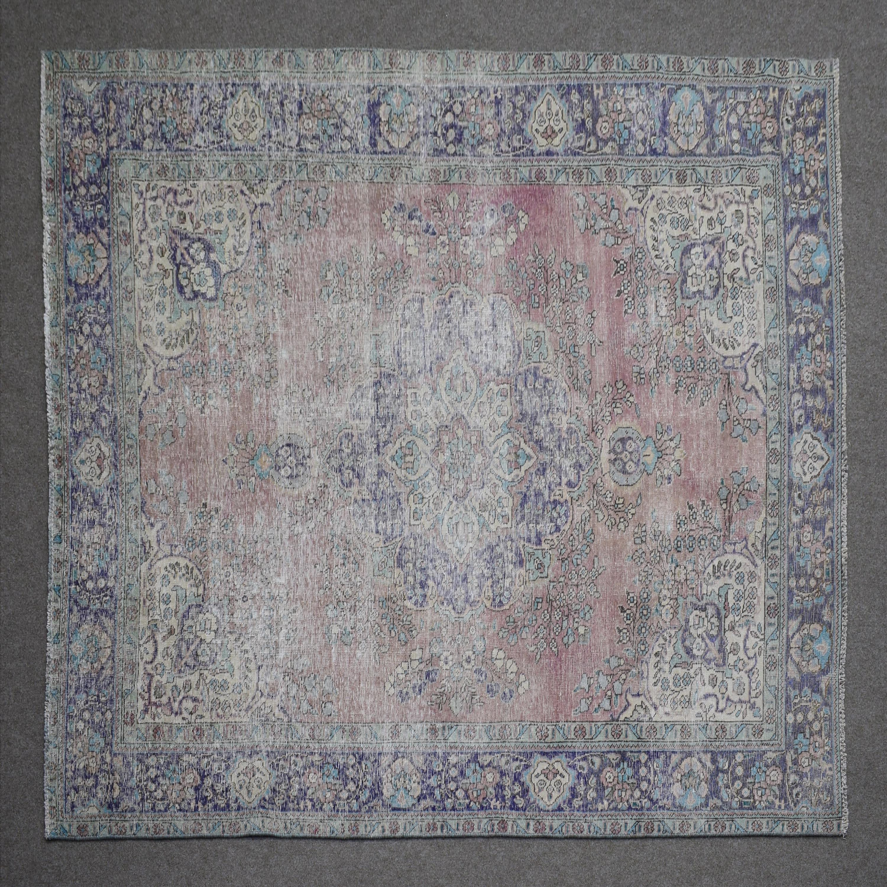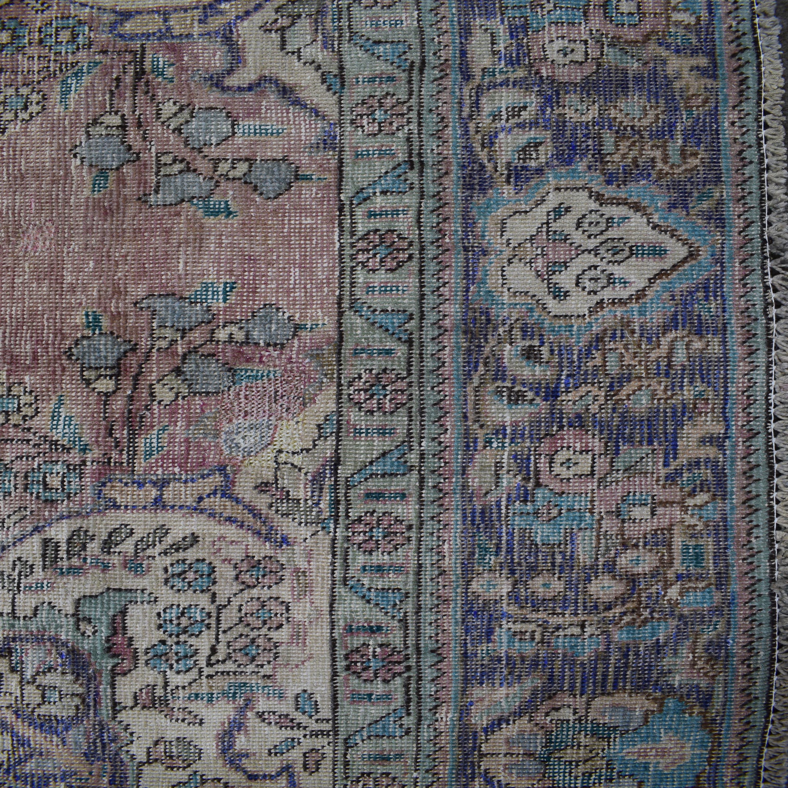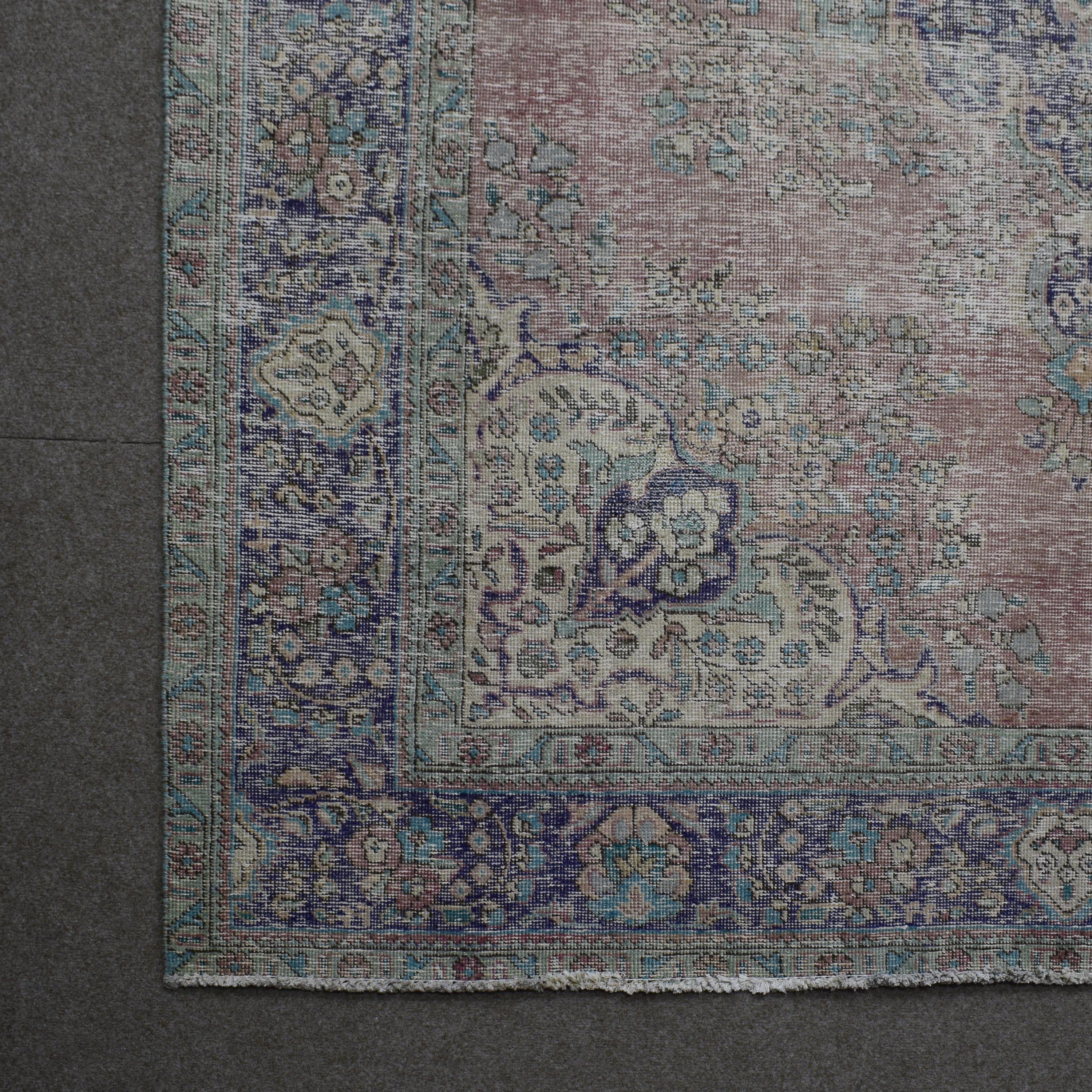 About Distressed Rug: This beautiful rug was hand-woven in 1970's in Tabriz, Iran. Later, this vintage rug has been shaved down to a lower pile to make it a faded rug on purpose. Distressed Rugs represent a trend that has achieved a crossover between fashion and home décor. This new look celebrates rugs that are faded, and worn over time; rugs that nestle into homes as if they’ve always been there. Distressed rugs are shaved rugs so they do not have a soft pile.