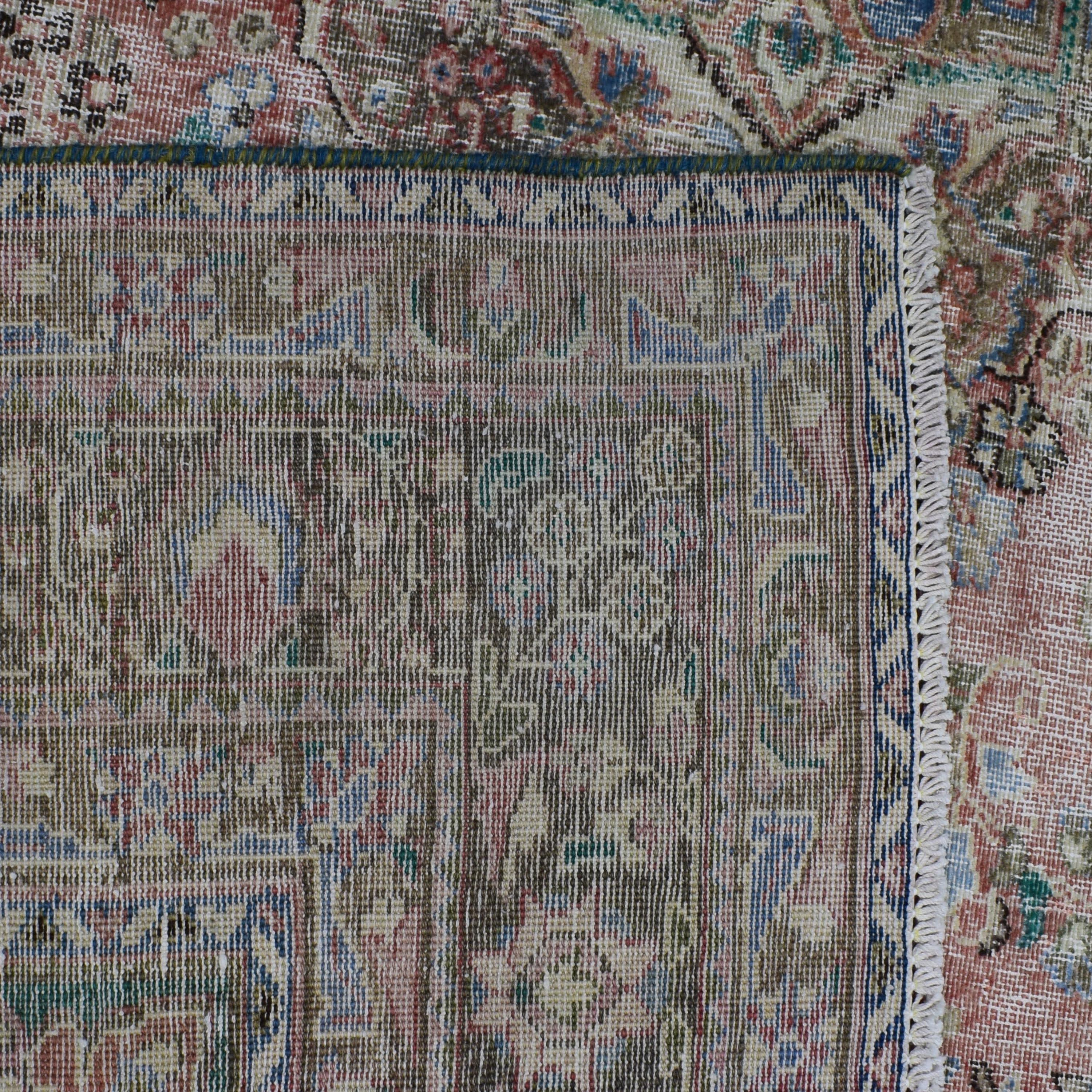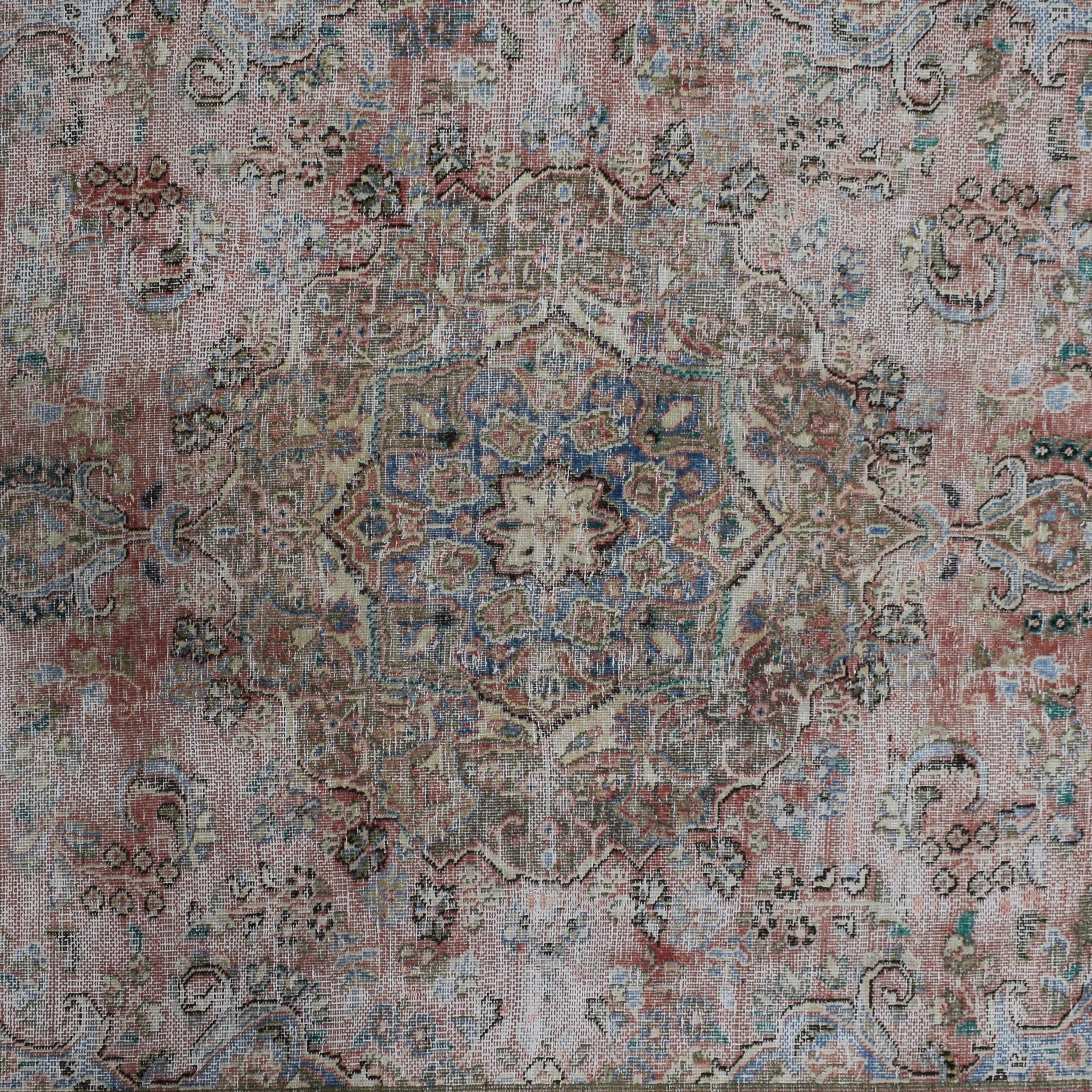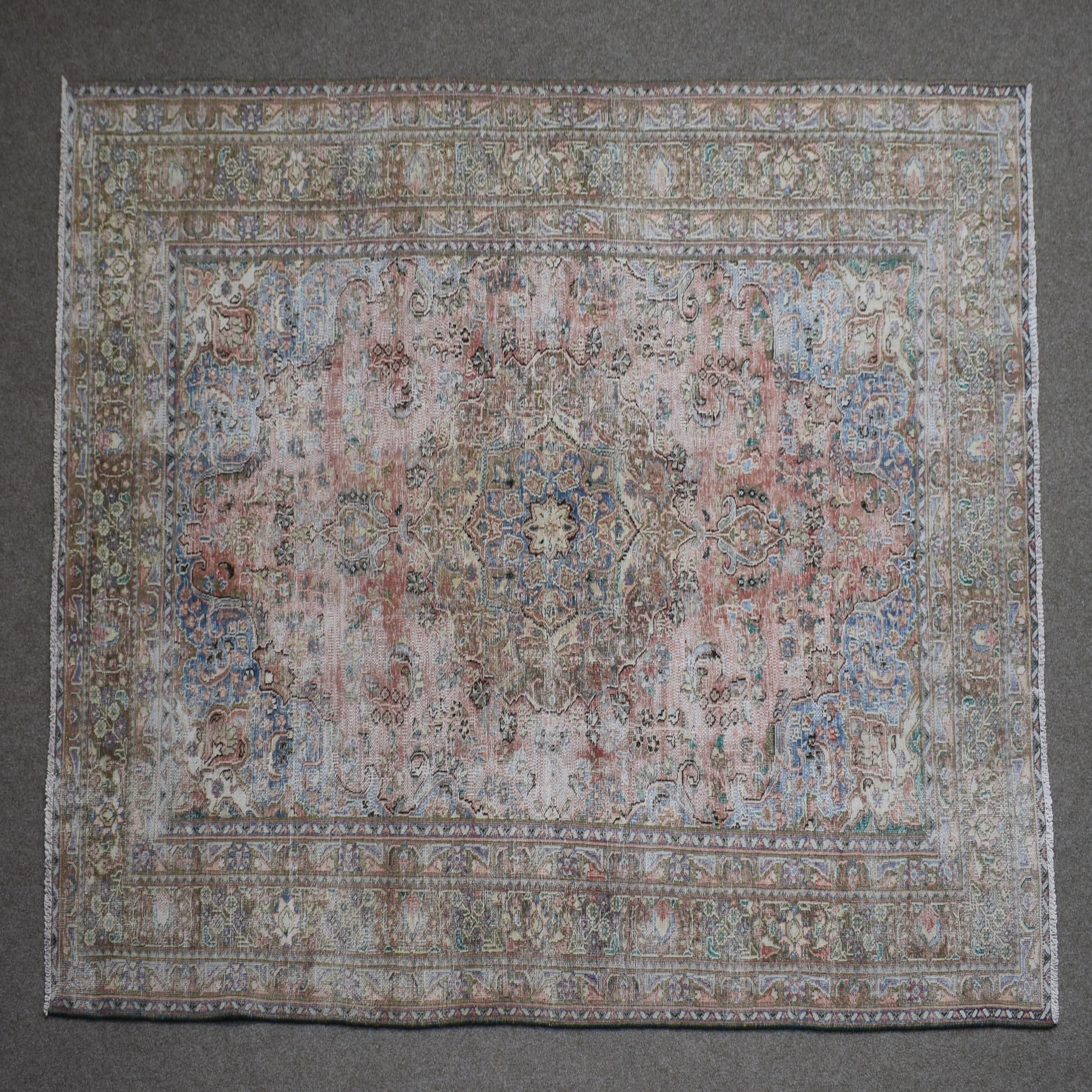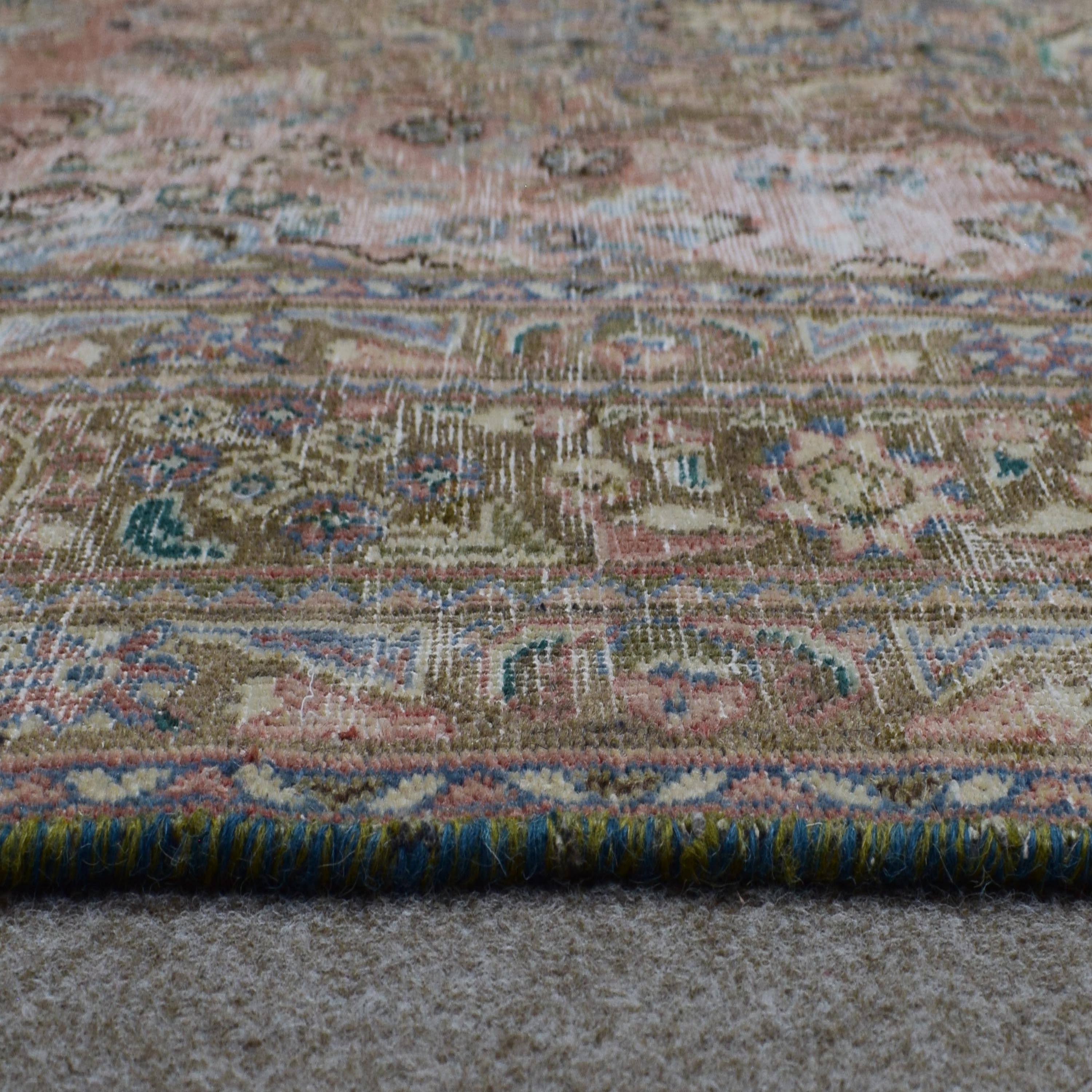 About Distressed Rug: This beautiful rug was hand-woven in 1970's in Tabriz, Iran. Later, this vintage rug has been shaved down to a lower pile to make it a faded rug on purpose. Distressed Rugs represent a trend that has achieved a crossover between fashion and home décor. This new look celebrates rugs that are faded, and worn over time; rugs that nestle into homes as if they’ve always been there. Distressed rugs are shaved rugs so they do not have a soft pile.