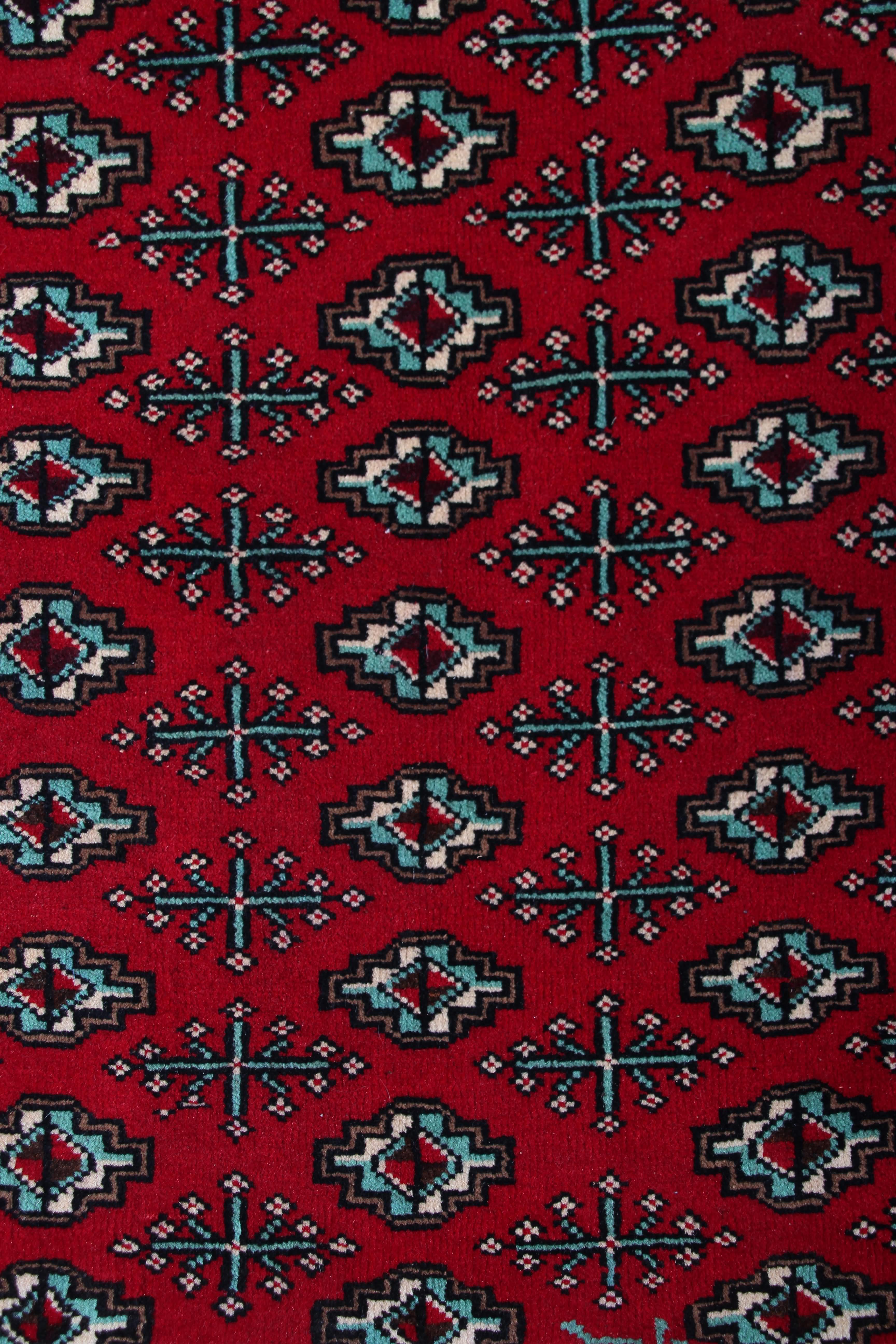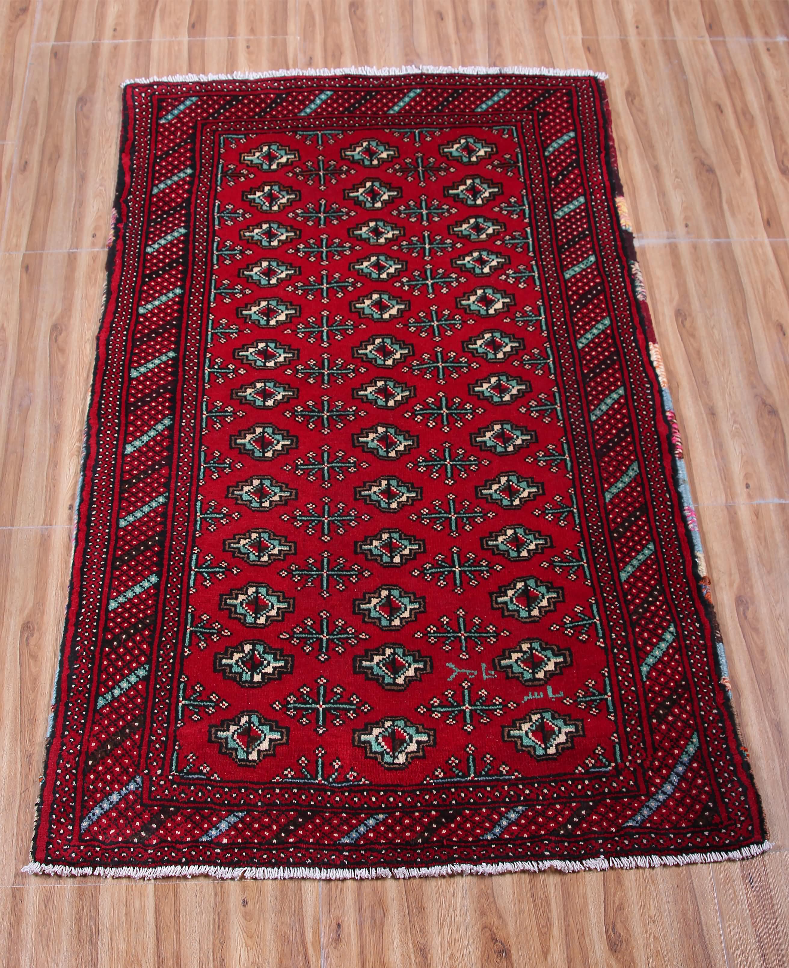 About Persian Turkmen Rug: This beautiful rug was hand knotted by the Turkmen tribes live in the north-east of Iran. Turkmen rug is produced by obtaining materials, wool from the herds and vegetable dyes, using geometrical designs that varied from tribe to tribe. Turkmen rugs are known for the deep rich red/blue color sourced from the madder root, and designs are all-over motifs, often the octagonal "Elephants Foot". The KPSI count normally ranges between 20 and 120.