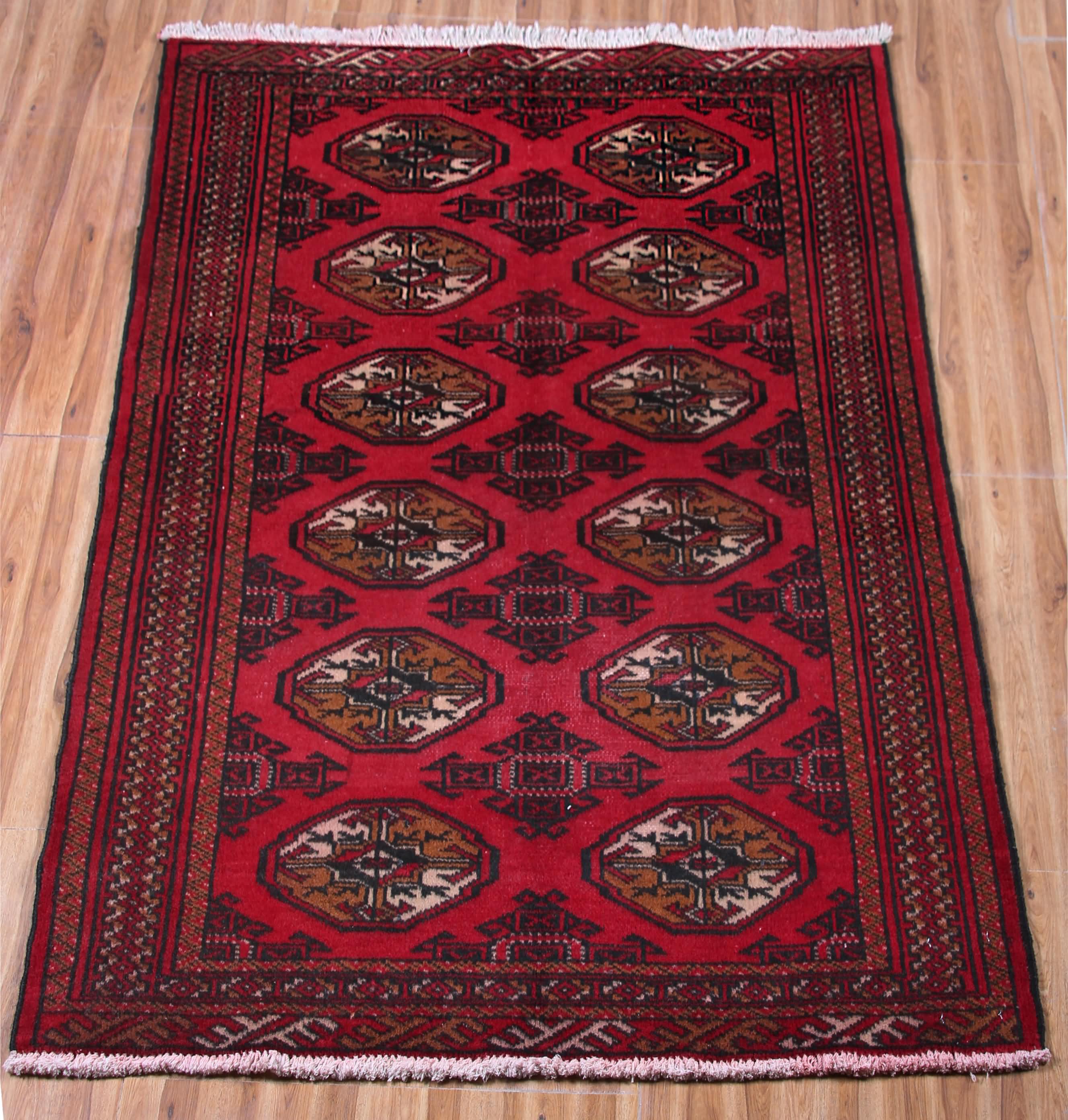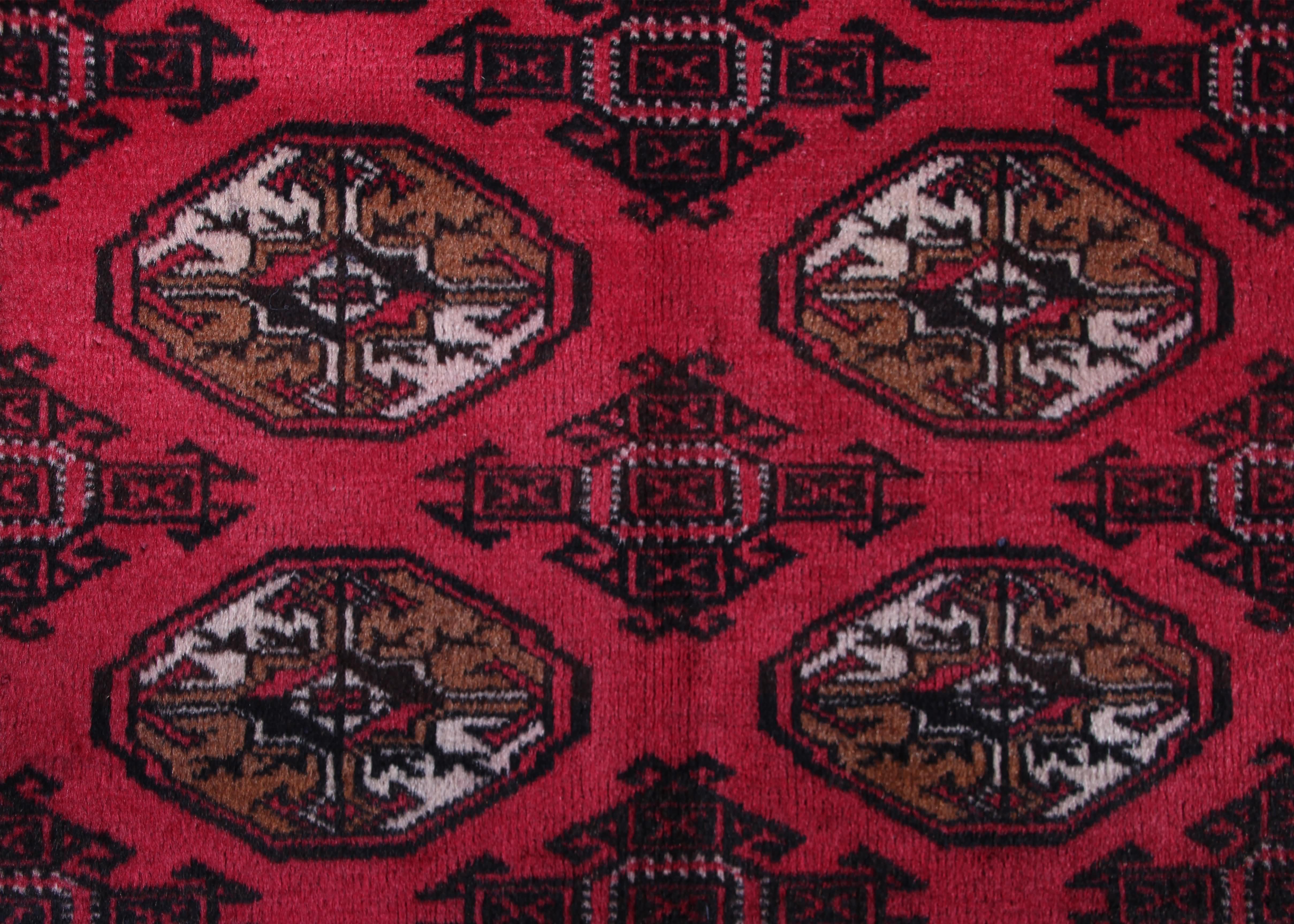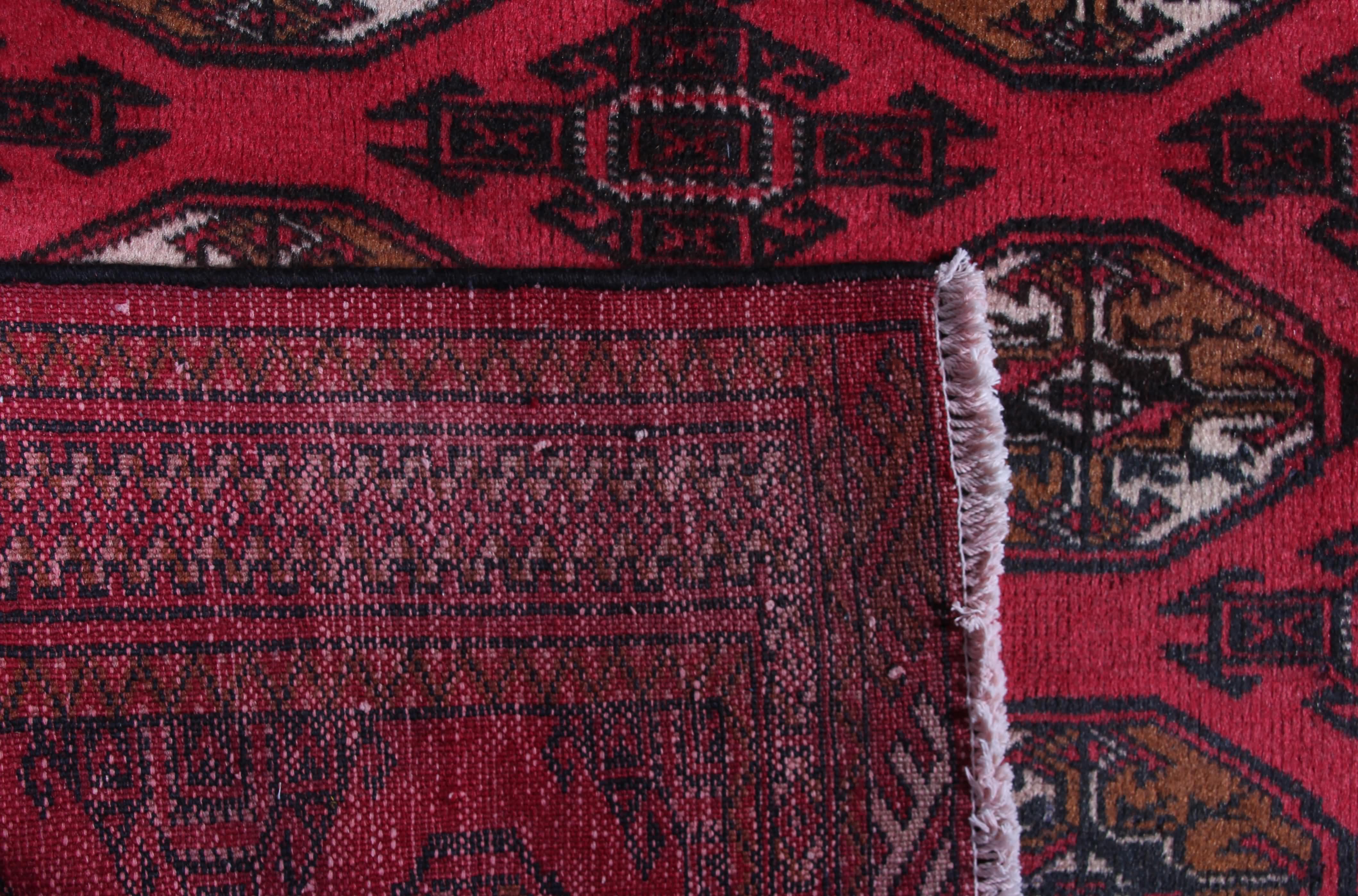 About Persian Turkmen Rug: This beautiful rug was hand knotted by the Turkmen tribes live in the north-east of Iran. Turkmen rug is produced by obtaining materials, wool from the herds and vegetable dyes, using geometrical designs that varied from tribe to tribe. Turkmen rugs are known for the deep rich red/blue color sourced from the madder root, and designs are all-over motifs, often the octagonal "Elephants Foot". The KPSI count normally ranges between 20 and 120.
